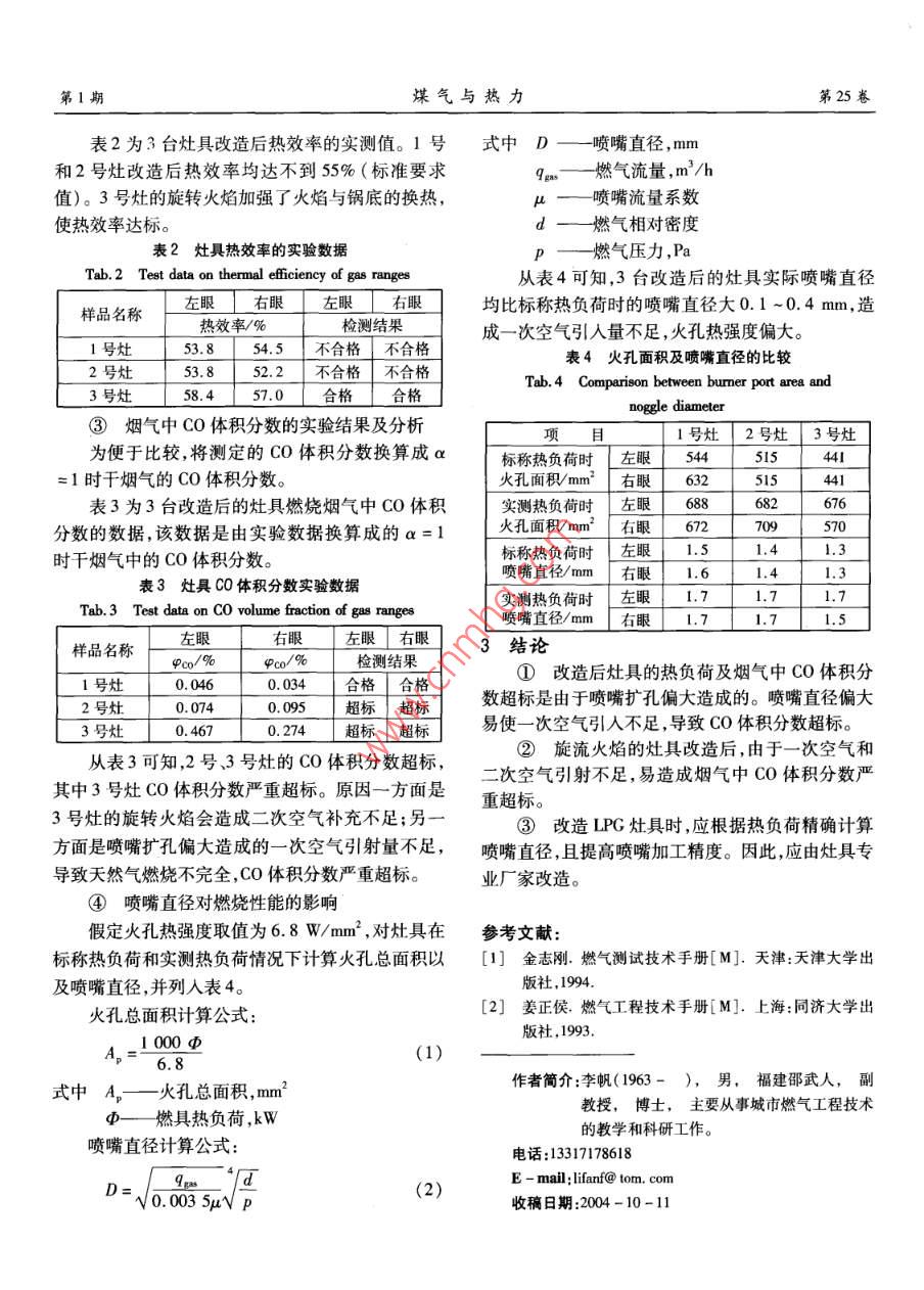 第25卷第1期煤氣與熱力Vol 25 No2005年1月GaS heatIPG灶具改用天然氣的實驗研究李帆,張成毅,管延文!,安翠林2,劉毅2(1.華中科技大學環(huán)境科學與工程學院,湖北武漢430074;2.武漢市燃氣用具檢測站,湖北武漢430010)摘要;對3臺LPG灶具進行天然氣轉換改造,分析了手工擴孔對灶具適應性的影響。手工擴孔易造成熱負荷及CO體積分數(shù)超標等問題,灶具改造應由專業(yè)廠家進行。關鍵詞:IPG灶具;天然氣轉換;燃具適應性;燃具改造中圖分類號:TU996文獻標識碼:B文章編號:1000-4416(2005)01-0029-02Experimental Study on LPG Ranges Converted to Natural GasLI Fan, ZHANG Cheng-yi, GUAN Yan-wen, AN Cui-lin, LIU Yi(1. School of Environment Science& Engineering, Huazhong University of Science& TechnologyWuhan 430074, China; 2. Wuhan Gas Appliance Test Station, Wuhan 430010, China)Abstract: After the reform of 3 LPG ranges by natural gas conversion, the influence of manualreaming on the adaptability of gas range is analyzed. The manual reaming is easy to cause problems, suchas over norm of heat load and CO volume fraction. The reform of gas range should be conducted by spe-cialized manufacturersKey words: LPG range; natural gas conversion; adaptability of gas appliance; reform of gaspalance目前一些城市正在進行天然氣轉換工作,除了進行測試研究。為了便于比較,將測定的CO體積對輸配系統(tǒng)進行改造外,還要改造可以繼續(xù)使用的分數(shù)換算成空氣系數(shù)a=1時干煙氣的CO體積分LPG灶具。由于灶具品牌多,為加快轉換進度,簡化數(shù)2。采用美國 MAESTERA000型煙氣成分分析轉換程序并降低轉換成本,一般對灶具噴嘴手工擴儀,可以分析檢測CO、CO2、O2等成分???、試燒,若火焰穩(wěn)定性良好則為合格。這種改造方2實驗結果及分析式是否會影響灶具的適應性,這是在轉換中需要研①灶具熱負荷的實驗結果及分析究的問題。從表1可知,改造后灶具實測熱負荷基本上超標1實驗方法及實驗儀器20%以上,均不合格。原因可能是噴嘴擴孔偏大。選用3臺舊的LPG臺式雙眼灶作為實驗灶具,表1灶具熱負荷的實驗數(shù)據(jù)分別為1號2號、3號灶。對3臺LPG灶具的噴嘴Tab. 1 Test data on heat load of gas ranges進行手工擴孔后,試燒結果其火焰穩(wěn)定性良好。與樣品左眼右眼左眼右眼左眼右眼左眼右眼改造前比較,其火焰特性用肉眼觀察沒有任何不同。名稱標稱熱負荷實測熱負荷/kw偏差/%|檢測結果試驗用的燃氣是純甲烷,甲烷體積分數(shù)≥99.9%。1號灶3704.304684.5726.486.28超標合格根據(jù)燃氣灶具國家標準規(guī)定的方法和步驟,[2號灶3:503504.6414.823.571400標超標對3臺實驗灶具的質量標準進行檢測實驗,主要對3號灶3.00046038833038標超標」其熱負荷、熱效率以及燃燒煙氣中的CO體積分數(shù)②灶具熱效率的實驗結果及分析第1期煤氣與熱第25卷表2為3臺灶具改造后熱效率的實測值。1號式中D—噴嘴直徑,mm和2號灶改造后熱效率均達不到55%(標準要求燃氣流量,m3/h值)。3號灶的旋轉火焰加強了火焰與鍋底的換熱,使熱效率達標。qμdp噴嘴流量系數(shù)燃氣相對密度表2灶具熱效率的實驗數(shù)據(jù)燃氣壓力,PaTab. 2 Test data on thermal efficiency of gas ranges從表4可知,3臺改造后的灶具實際噴嘴直徑「如左眼「右眼」左眼右眼均比標稱熱負荷時的噴嘴直徑大0.1-0.4mm造熱效率/%檢測結果成一次空氣引入量不足,火孔熱強度偏大。1號灶53.854.5不合格不合格2號灶53852.2不合格不合格表4火孔面積及噴嘴直徑的比較3號灶58457.0合格合格Tab 4 Comparison between burmer port area andnoggle diameter③煙氣中CO體積分數(shù)的實驗結果及分析項目1號灶2號灶」3號灶為便于比較,將測定的CO體積分數(shù)換算成a標稱熱負荷時左眼5445l5=1時干煙氣的CO體積分數(shù)。火孔面積/mm23「右眼632515表3為3臺改造后的灶具燃燒煙氣中CO體積實測熱負荷時左眼688676分數(shù)的數(shù)據(jù),該數(shù)據(jù)是由實驗數(shù)據(jù)換算成的a=1火孔面積mm2右眼672時干煙氣中的CO體積分數(shù)。標稱熱負荷時左眼」1.5噴嘴直徑/mm「右眼1表3灶具00體積分數(shù)實驗數(shù)據(jù)實測熱負荷時左眼1.7l.7Tab 3 Test data on CO volume fraction of gas ranges噴嘴直徑/mm「右眼171.715左眼右眼樣品名稱3結論檢測結果1號灶0.0460.034合格合格①改造后灶具的熱負荷及煙氣中CO體積分2號灶0.070.095超標「超標數(shù)超標是由于噴嘴擴孔偏大造成的。噴嘴直徑偏大3灶045024超標超標」易使一次空氣引人不足,導致C體積分數(shù)超標。②旋流火焰的灶具改造后,由于一次空氣和從表3可知2號、3號灶的CO體積分數(shù)超標,二次空氣引射不足,易造成煙氣中CO體積分數(shù)嚴其中3號灶CO體積分數(shù)嚴重超標。原因一方面是重超標。3號灶的旋轉火焰會造成二次空氣補充不足;另一③改造LPG灶具時,應根據(jù)熱負荷精確計算方面是噴嘴擴孔偏大造成的一次空氣引射量不足,噴嘴直徑,且提高噴嘴加工精度。因此,應由灶具專導致天然氣燃燒不完全,CO體積分數(shù)嚴重超標。業(yè)廠家改造。④噴嘴直徑對燃燒性能的影響假定火孔熱強度取值為6.8W/mm2,對灶具在參考文獻標稱熱負荷和實測熱負荷情況下計算火孔總面積以[1]金志剛.燃氣測試技術手冊[M].天津:天津大學出及噴嘴直徑,并列入表4。版社,1994火孔總面積計算公式[2]姜正侯,燃氣工程技術手冊[M].上海:同濟大學出1000Φ版社,1993A=6.8(1)式中A,一火孔總面積,mm作者簡介;李帆(1963-),男,福建邵武人,副教授,博士,主要從事城