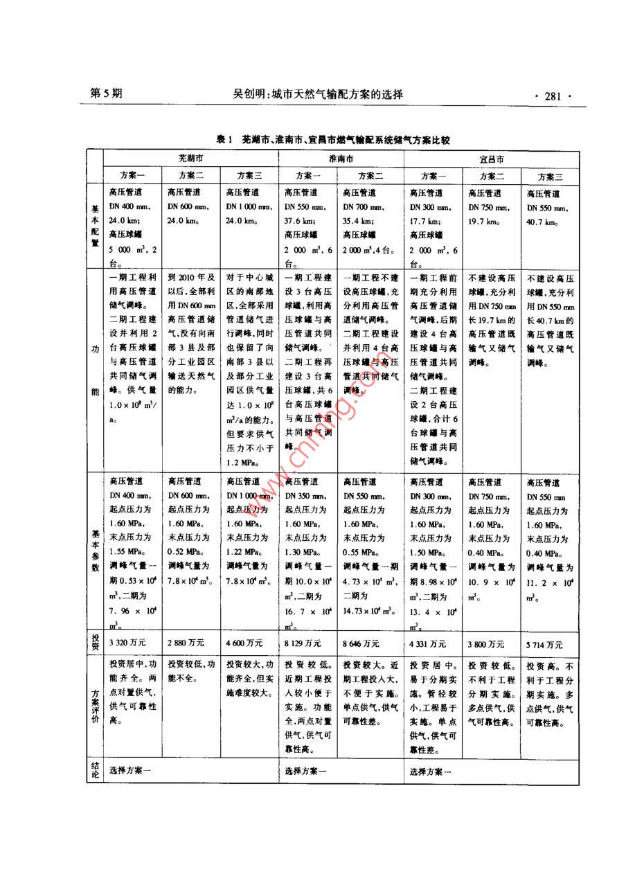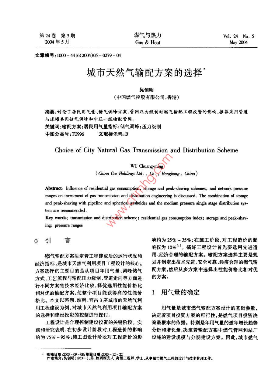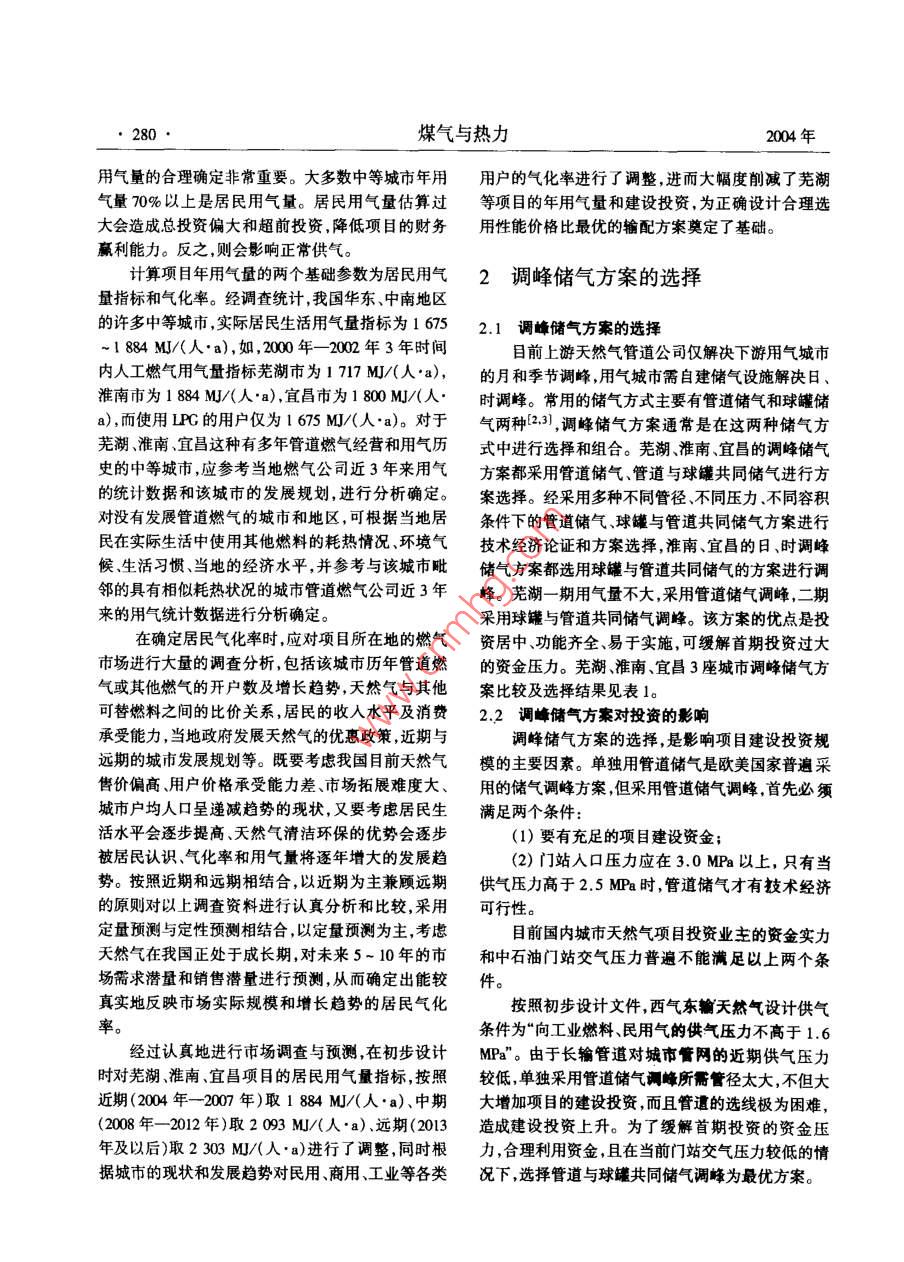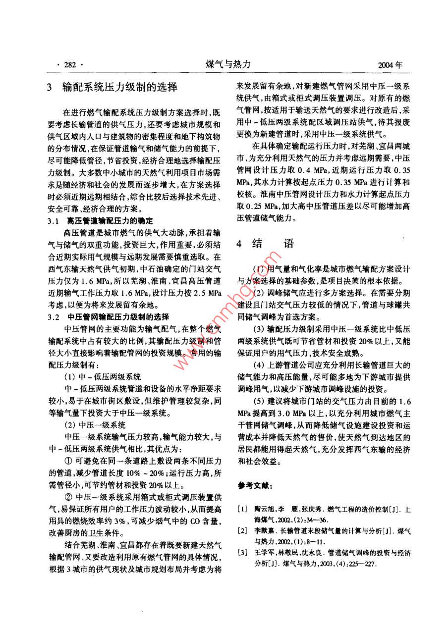 第24卷第5期煤氣與熱力Vol. 24 No. 52004年5月Gas heatMay 2004文章編號:1000-4416(2004)05-0279-04城市天然氣輸配方案的選擇吳創(chuàng)明(中國燃氣控股有限公司,香港)摘要:討論了居民用氣量、儲氣調(diào)峰方案、管網(wǎng)壓力級制對然氣輸配工程投資的影響,推薦采用管道與球罐共同儲氣調(diào)峰和中壓一級輸配管網(wǎng)。關(guān)鍵詞輸配方案;居民用氣量指標;儲氣調(diào)峰;壓力級制中圖分類號:TU9%6文獻標識碼:BChoice of City Natural Gas Transmission and Distribution SchemeWU Chuang-mingChina Gas Holdings Ltd, Co., HonghongAbstract: Influence of residential gas consumption, storage and peak-shaving schemes, and network pressureranges on investment of gas transmission and distribution engineering is discussed. The combination of storageand peak-shaving with pipeline and spherical gasholder and the medium pressure single stage distribution sys-em are recommendedKey words: transmission and distribution scheme; residential gas consumption index; storage and peak-shayIng: pressure rang引言響約為25%~35%;在施工階段,對工程造價的影響僅為10%l。搞好工程設(shè)計首先要選用先進適燃然氣輸配方案決定著工程建成后的運行狀況和用、經(jīng)濟合理的輸配方案。輸配方案選擇主要是規(guī)經(jīng)濟指標,是城市天然氣利用項目工程設(shè)計的核心。劃并制定出技術(shù)先進、安全可靠經(jīng)濟合理的燃氣輸方案選擇的主要目的是從項目年用氣量、調(diào)峰儲氣配方案,然后從多方案中選擇出性能價格比相對優(yōu)方式工藝流程與輸配壓力級制管道走向等方面進的方案行不同方案的技術(shù)經(jīng)濟比較,擇優(yōu)選用性能價格比相對優(yōu)的輸配方案,使整個項目能獲得高的性能價1用氣量的確定格比。本文以蕪湖、淮南宜昌3座城市的天然氣利用工程建設(shè)為例,對城市天然氣利用項目輸配方案用氣量是城市燃氣輸配方案設(shè)計的基礎(chǔ)參數(shù),的選擇和建設(shè)投資的控制進行探討。決定著項目投資方案的可行性,是燃氣項目投資決工程設(shè)計是合理控制建設(shè)投資的關(guān)鍵階段。實策最根本的依據(jù)。特別是年用氣量的遂年增長趨勢踐和研究表明,在初步設(shè)計階段對工程造價的影響分析和增長量決定著輸配方案中燃氣管網(wǎng)和站廠約為75%~%5%;施工圖設(shè)計階段對工程造價的影設(shè)施的建設(shè)規(guī)模與分期建設(shè)方案。因此,城市燃氣局(明(0)男西安人人高級工程師學士,從事城市燃氣工程的設(shè)計與技術(shù)管理工作煤氣與熱力2004年用氣量的合理確定非常重要。大多數(shù)中等城市年用用戶的氣化率進行了調(diào)整進而大幅度削減了蕪湖氣量70%以上是居民用氣量。居民用氣量估算過等項目的年用氣量和建設(shè)投資,為正確設(shè)計合理選大會造成總投資偏大和超前投資降低項目的財務(wù)用性能價格比最優(yōu)的輸配方案奠定了基礎(chǔ)羸利能力。反之,則會影響正常供氣。計算項目年用氣量的兩個基礎(chǔ)參數(shù)為居民用氣2調(diào)峰儲氣方案的選擇量指標和氣化率。經(jīng)調(diào)查統(tǒng)計,我國華東、中南地區(qū)的許多中等城市實際居民生活用氣量指標為16752.1調(diào)峰儲氣方案的選擇1884MJ/(人·a),如,2000年—2002年3年時間目前上游天然氣管道公司僅解決下游用氣城市內(nèi)人工燃氣用氣量指標蕪湖市為1717MJ/(人·a),的月和季節(jié)調(diào)峰用氣城市需自建儲氣設(shè)施解決日、淮南市為18M/(人·a),宜昌市為1800M/(人·時調(diào)峰。常用的儲氣方式主要有管道儲氣和球罐儲a),而使用LBC的用戶僅為1675M/(人·a)。對于氣兩種23,調(diào)峰儲氣方案通常是在這兩種儲氣方蕪湖、準南、宜昌這種有多年管道燃氣經(jīng)營和用氣歷式中進行選擇和組合。蕪湖、淮南、宜昌的調(diào)峰儲氣史的中等城市,應(yīng)參考當?shù)厝細夤窘?年來用氣方案都采用管道儲氣、管道與球罐共同儲氣進行方的統(tǒng)計數(shù)據(jù)和該城市的發(fā)展規(guī)劃,進行分析確定。案選擇。經(jīng)采用多種不同管徑不同壓力不同容積對沒有發(fā)展管道燃氣的城市和地區(qū),可根據(jù)當?shù)鼐訔l件下的管道儲氣、球罐與管道共同儲氣方案進行民在實際生活中使用其他燃料的耗熱情況、環(huán)境氣技術(shù)經(jīng)濟論證和方案選擇淮南、宜昌的日、時調(diào)峰候生活習慣、當?shù)氐慕?jīng)濟水平,并參考與該城市毗儲氣方案都選用球罐與管道共同儲氣的方案進行調(diào)鄰的具有相似耗熱狀況的城市管道燃氣公司近3年峰。蕪湖一期用氣量不大,采用管道儲氣調(diào)峰,二期來的用氣統(tǒng)計數(shù)據(jù)進行分析確定。采用球罐與管道共同儲氣調(diào)峰。該方案的優(yōu)點是投在確定居民氣化率時應(yīng)對項目所在地的燃氣資居中、功能齊全、易于實施,可緩解首期投資過大市場進行大量的調(diào)查分析,包括該城市歷年管道燃的資金壓力。蕪湖、淮南、宜昌3座城市調(diào)峰儲氣方氣或其他燃氣的開戶數(shù)及增長趨勢,天然氣與其他案比較及選擇結(jié)果見表1可替燃料之間的比價關(guān)系居民的收入水平及消費2.2調(diào)嶂儲氣方案對投資的影響承受能力,當?shù)卣l(fā)展天然氣的優(yōu)惠政策,近期與調(diào)峰儲氣方案的選擇,是影響項目建設(shè)投資規(guī)遠期的城市發(fā)展規(guī)劃等。既要考慮我國目前天然氣模