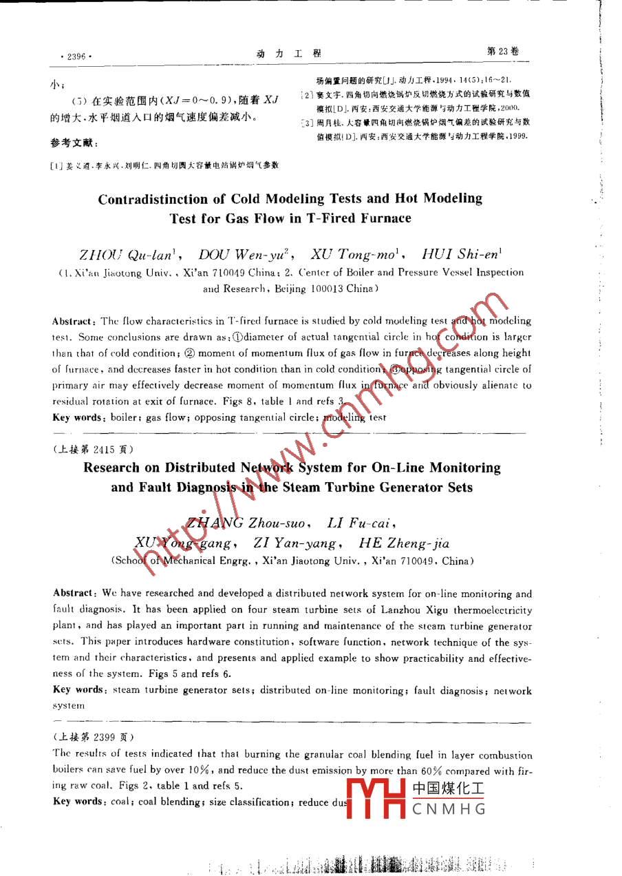 第23卷第3期動(dòng)力工程Vol. 23 Nr.32003年6月POWER ENGINEERINGJun. 2003文章編號(hào): 1000-6761 (2003)03 -2397-03動(dòng)力煤分級(jí)配煤技術(shù).楊國(guó)華(寧波大學(xué),寧波315211)摘要:針對(duì)不同燃煤設(shè)備對(duì)燃料煤粒度組成的要求和現(xiàn)有動(dòng)力配煤的缺陷,提出了動(dòng)力煤分級(jí)配煤技術(shù)。介紹了該技術(shù)的工藝原理、工藝流程及其關(guān)鍵技術(shù)。動(dòng)力煤分級(jí)配煤可生產(chǎn)出粉煤和粒煤兩種配煤產(chǎn)品。試驗(yàn)表明:層燃爐燃用粒謀燃料可節(jié)煤10%以上,煙塵排放減少60%以上。圍2表]拳5關(guān)鍵詞:動(dòng)力煤;配煤;分級(jí);減少煙塵排放;節(jié)能中圖分類號(hào):TK 323文獻(xiàn)標(biāo)識(shí)碼:A需要對(duì)鍋爐作較大改造或研制專用型煤鍋爐。0前言我國(guó)的層燃爐(工業(yè)鍋爐+窯爐)量大面廣、目前,動(dòng)力配煤的質(zhì)量指標(biāo)主要是熱值、揮發(fā)耗煤量約占燃煤總量的1/3以上。這些小型鍋爐份硫份、灰熔融性、水份和焦渣特征,對(duì)燃料煤的不僅熱效率低,也是我國(guó)大氣主要污染源之:。因粒度組成控制不嚴(yán),有的只要求燃料煤粒度上限此,如何優(yōu)化層燃爐的燃料粒度組成,并將其與現(xiàn)≤25mm(或≤40mm或≤50mm),對(duì)燃料煤粒度有動(dòng)力配煤技術(shù)結(jié)合,開發(fā)新的配煤技術(shù),使配制下限基本.上沒(méi)有控制,有的也只是規(guī)定0~30mm出來(lái)的燃料煤的煤質(zhì)包括粒度組成在內(nèi)全方位達(dá)含量≤30%,而在實(shí)際生產(chǎn)中沒(méi)有有效控制.實(shí)際到最佳,對(duì)于提高層燃鍋爐效率、減少大氣污染具上,燃料煤粒度組成對(duì)燃料燃燒狀況有很大影響。有重要意義。這是本文研究動(dòng)力煤分級(jí)配煤技術(shù)粉燃爐和循環(huán)流化床鍋爐由于配備了專用燃料加的出發(fā)點(diǎn)。工設(shè)備,對(duì)燃料煤原始粒度組成要求不高,但層燃1動(dòng)力煤分 級(jí)配煤原理及工藝流程爐一般不配備專用燃料煤加工設(shè)備,因而對(duì)燃料煤的粒度組成要求較高,一般要求最大粒徑小于動(dòng)力煤分級(jí)配煤原理是首先將各原料煤按粒30 ~ 40mm,0~ 6mm顆粒含量不超過(guò)50%~度分級(jí),分成粉煤和粒煤,然后根據(jù)配煤理論:21,60%,實(shí)際上這一小粒級(jí)粉煤含量越小越好,特別將各粉煤按比例混合配制成粉煤配煤燃料,各粒是小于1mm ~ 2mm粉煤最好是沒(méi)有。因?yàn)檫@些煤配制成粒煤配煤燃料。粉煤配煤燃料供給粉煤粉煤將使漏煤碳損失和飛灰碳損失增加,使火床鍋爐或循環(huán)流化床鍋爐;粒煤配煤燃料供給層燃布風(fēng)均勻性變差,導(dǎo)致灰渣含碳量以及煙氣中鍋爐或?qū)尤几G爐。這樣,一-方面可臧少粉煤鍋爐或CO含量增加,同時(shí)還會(huì)使煙塵排放量增加。鍋爐循環(huán)流化床鍋爐的燃料制備費(fèi)用,更重要的是層型煤的產(chǎn)生和發(fā)展正是為了減少燃料煤的粉煤含燃爐燃用粒煤可大大改普燃燒狀況,提高效率,減量,以適應(yīng)層燃爐對(duì)燃料粒度的要求。但從研究開少污染。發(fā)到小范圍的工業(yè)應(yīng)用,近20年來(lái)鍋爐型煤始終動(dòng)力配煤的工藝流程如圖1所示。未能得到大面積的推廣應(yīng)用,原因主要有2個(gè)方動(dòng)力煤分級(jí)配煤工藝流程與現(xiàn)有動(dòng)力配煤T面:一是原煤全部粉碎至3mm以下,加上粘結(jié)劑藝流程"]的區(qū)別在于:增加了對(duì)各原料煤的分級(jí)成型,加工成本高,缺乏市場(chǎng)競(jìng)爭(zhēng)力;二是型煤粒并采取粉煤與粒煤分別配煤,雖然流程復(fù)雜了一度單一、表面光潔,著火性和燃盡性都較散煤差,些,但獲得了粒煤配煤成品和粉煤配煤成品2種產(chǎn)品。與單純配煤或單純型煤或配煤+型煤方案收稿日期2001-12-27作者筒介:楊國(guó)華(1961-).男,博士,教授。主要從事燃料加相比,動(dòng)力煤分級(jí)配煤方案在投資.生產(chǎn)成本、節(jié)工、燃料燃燒與污染控制方面的研究。中國(guó)煤化工很大優(yōu)越性。MHCNMHG●2398●動(dòng)力]程第23器孔越小,篩孔堵塞越嚴(yán)重。為了從根本上解決篩孔原煤分品種收卸驗(yàn)收貯郁堵塞問(wèn)題,作者研究發(fā)明了無(wú)篩網(wǎng)煤炭分級(jí)技術(shù)工篩上物優(yōu)質(zhì)塊煤外創(chuàng)分品種取料錦分.潮濕煤炭振動(dòng)流化床氣力分級(jí)技術(shù)(發(fā)明專劣質(zhì)塊煤破碎利ZL.93 1 11761.5)。 如圖2所示.振動(dòng)流化床氣篩F物力分級(jí)機(jī)組由振動(dòng)流化床(VFB)分級(jí)器、細(xì)粒分分品種分級(jí)離器、旋風(fēng)除塵器、循環(huán)風(fēng)機(jī)、布袋除塵器、引風(fēng)機(jī)及管道等組成。其工作原理是:煤炭連續(xù)地加入振動(dòng)流化床分級(jí)器,在振動(dòng)力和氣力作用下,顆粒上粒煤貯存|粒煤貯存下翻騰,碰撞劇烈,使粘結(jié)在一起的煤團(tuán)快速分化驗(yàn)檢測(cè)散,粘于塊煤表面的粉煤快速脫落,粉煤與粒煤充分分離,其中細(xì)顆粒隨氣流帶出并由細(xì)粒分離器優(yōu)化配方I|計(jì)量給料←1優(yōu)化配方和除塵器收集成為相當(dāng)于篩分機(jī)的篩下產(chǎn)物;粗顆粒從分級(jí)器的人料端沿振動(dòng)的布風(fēng)板快速地移在線檢測(cè)|混合| 混合| 在線檢測(cè)向出料端排出,成為相當(dāng)于篩分機(jī)的篩上產(chǎn)物。振動(dòng)流化床氣力分級(
