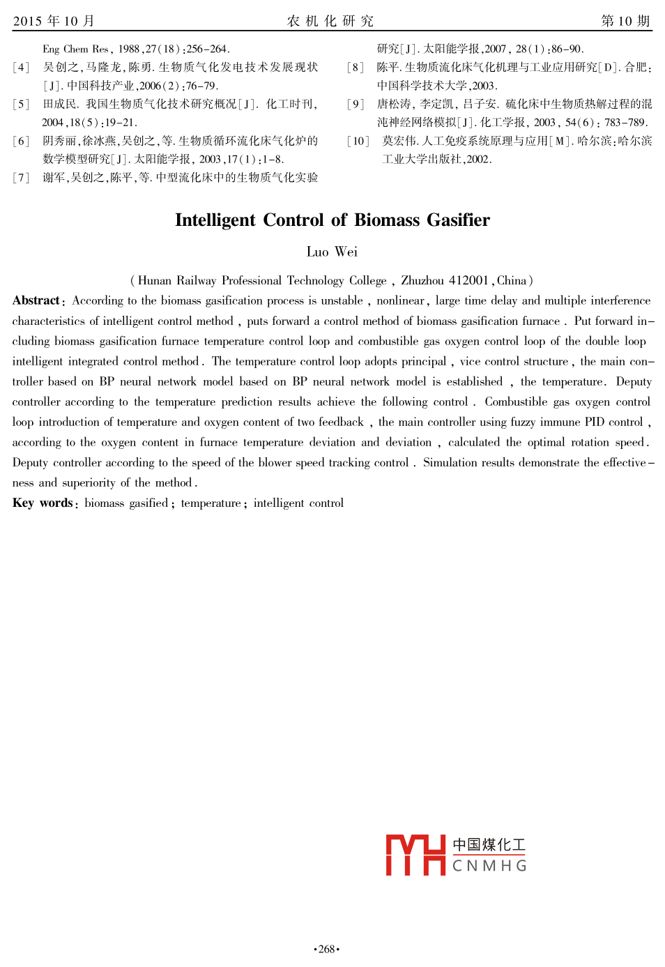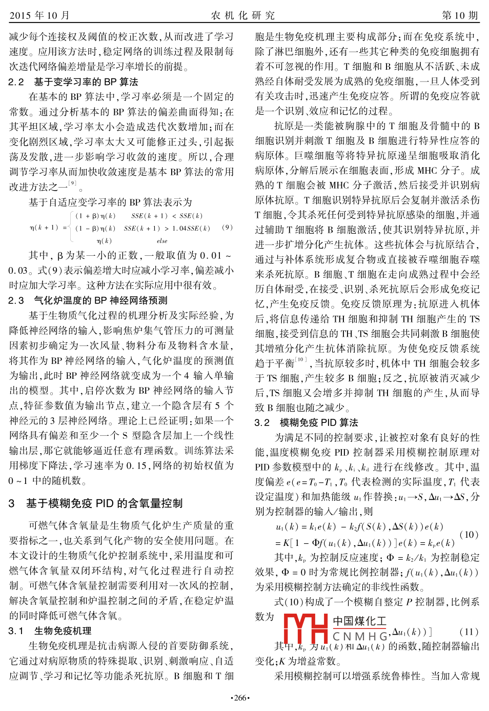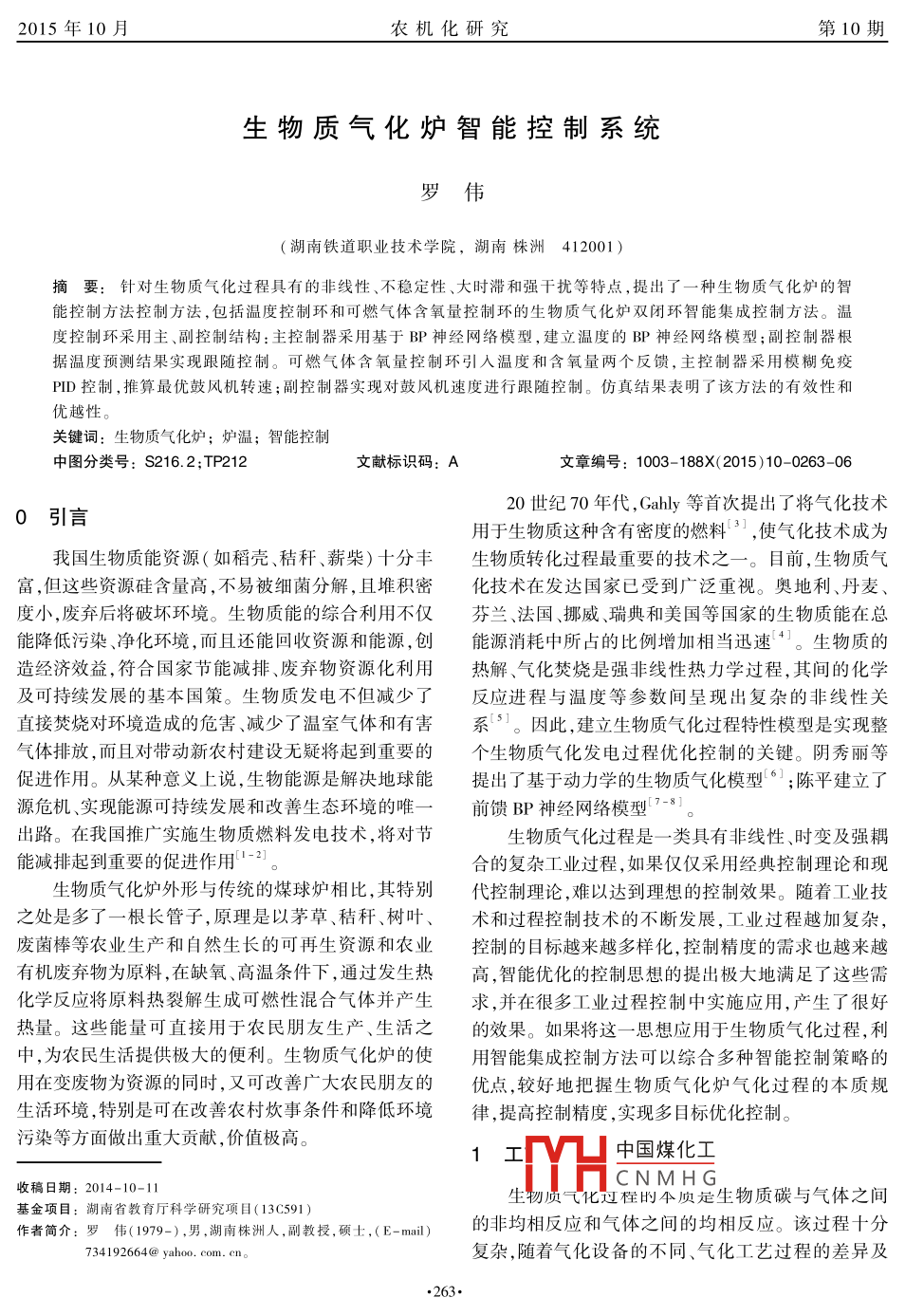 2015年10月農(nóng)機化研究第10期生物質(zhì)氣化爐智能控制系統(tǒng)羅偉(湖南鐵道職業(yè)技術(shù)學(xué)院,湖南株洲412001)摘要:針對生物質(zhì)氣化過程具有的非線性、不穩(wěn)定性、大時滯和強干擾等特點,提出了-.種生物質(zhì)氣化爐的智能控制方法控制方法,包括溫度控制環(huán)和可燃?xì)怏w含氧量控制環(huán)的生物質(zhì)氣化爐雙閉環(huán)智能集成控制方法。溫度控制環(huán)采用主、副控制結(jié)構(gòu):主控制器采用基于BP神經(jīng)網(wǎng)絡(luò)模型,建立溫度的BP神經(jīng)網(wǎng)絡(luò)模型;副控制器根據(jù)溫度預(yù)測結(jié)果實現(xiàn)跟隨控制。可燃?xì)怏w含氧量控制環(huán)引入溫度和含氧量兩個反饋,主控制器采用模糊免疫PID控制,推算最優(yōu)鼓風(fēng)機轉(zhuǎn)速;副控制器實現(xiàn)對鼓風(fēng)機速度進行跟隨控制。仿真結(jié)果表明了該方法的有效性和優(yōu)越性。關(guān)鍵詞:生物質(zhì)氣化爐;爐溫;智能控制中圖分類號: S216. 2;TP212文獻標(biāo)識碼: A文章編號: 1003-188X(2015)10- 0263 -0620世紀(jì)70年代,Gahly等首次提出了將氣化技術(shù)0引言用于生物質(zhì)這種含有密度的燃料531 ,使氣化技術(shù)成為我國生物質(zhì)能資源(如稻殼、秸稈、薪柴)十分豐生物質(zhì)轉(zhuǎn)化過程最重要的技術(shù)之- -。目前,生物質(zhì)氣富,但這些資源硅含量高,不易被細(xì)菌分解,且堆積密化技術(shù)在發(fā)達國家已受到廣泛重視。奧地利、丹麥、度小,廢棄后將破壞環(huán)境。生物質(zhì)能的綜合利用不僅芬蘭、法國、挪威、瑞典和美國等國家的生物質(zhì)能在總能降低污染、凈化環(huán)境,而且還能回收資源和能源,創(chuàng)能源消耗中所占的比例增加相當(dāng)迅速。生物質(zhì)的造經(jīng)濟效益,符合國家節(jié)能減排、廢棄物資源化利用熱解、氣化焚燒是強非線性熱力學(xué)過程,其間的化學(xué)及可持續(xù)發(fā)展的基本國策。生物質(zhì)發(fā)電不但減少了反應(yīng)進程與溫度等參數(shù)間呈現(xiàn)出復(fù)雜的非線性關(guān)直接焚燒對環(huán)境造成的危害、減少了溫室氣體和有害系‘”。因此,建立生物質(zhì)氣化過程特性模型是實現(xiàn)整氣體排放,而且對帶動新農(nóng)村建設(shè)無疑將起到重要的個生物質(zhì)氣化發(fā)電過程優(yōu)化控制的關(guān)鍵。陰秀麗等促進作用。從某種意義上說,生物能源是解決地球能提出了基于動力學(xué)的生物質(zhì)氣化模型61 ;陳平建立了源危機、實現(xiàn)能源可持續(xù)發(fā)展和改善生態(tài)環(huán)境的唯一前饋BP神經(jīng)網(wǎng)絡(luò)模型' 7-81出路。在我國推廣實施生物質(zhì)燃料發(fā)電技術(shù),將對節(jié)生物質(zhì)氣化過程是--類具有非線性、時變及強耦能減排起到重要的促進作用1-21。合的復(fù)雜工業(yè)過程,如果僅僅采用經(jīng)典控制理論和現(xiàn)生物質(zhì)氣化爐外形與傳統(tǒng)的煤球爐相比,其特別代控制理論,難以達到理想的控制效果。隨著工業(yè)技之處是多了一根長管子,原理是以茅草、秸稈、樹葉、術(shù)和過程控制技術(shù)的不斷發(fā)展,工業(yè)過程越加復(fù)雜,廢菌棒等農(nóng)業(yè)生產(chǎn)和自然生長的可再生資源和農(nóng)業(yè)控制的目標(biāo)越來越多樣化,控制精度的需求也越來越有機廢棄物為原料,在缺氧、高溫條件下,通過發(fā)生熱高,智能優(yōu)化的控制思想的提出極大地滿足了這些需化學(xué)反應(yīng)將原料熱裂解生成可燃性混合氣體并產(chǎn)生求,并在很多工業(yè)過程控制中實施應(yīng)用,產(chǎn)生了很好熱量。這些能量可直接用于農(nóng)民朋友生產(chǎn)、生活之的效果。如果將這一思想應(yīng)用于生物質(zhì)氣化過程,利中,為農(nóng)民生活提供極大的便利。生物質(zhì)氣化爐的使用智能集成控制方法可以綜合多種智能控制策略的用在變廢物為資源的同時,又可改善廣大農(nóng)民朋友的優(yōu)點,較好地把握生物質(zhì)氣化爐氣化過程的本質(zhì)規(guī)生活環(huán)境,特別是可在改善農(nóng)村炊事條件和降低環(huán)境律,提高控制精度,實現(xiàn)多目標(biāo)優(yōu)化控制。污染等方面做出重大貢獻,價值極高。中國煤化工收稿日期: 2014-10-11:CHCNMHG生物質(zhì)氣化過程的個庾足生物質(zhì)碳與氣體之間基金項目:湖南省教育廳科學(xué)研究項目(13C591)作者簡介:羅偉(1979-),男,湖南株洲人,副教授 ,碩士,(E-mai)的非均相反應(yīng)和氣體之間的均相反應(yīng)。該過程十分734 192664@ yahoo. com. cn。復(fù)雜,隨著氣化設(shè)備的不同、氣化工藝過程的差異及●263.2015年10月農(nóng)機化研究第10期反應(yīng)條件(如氣化反應(yīng)劑的種類、氣化反應(yīng)溫度、反應(yīng)同時設(shè)置在喉管區(qū)的鼓風(fēng)機,負(fù)責(zé)向氧化層輸人-~次時間、有無催化劑的添加、氣化原料種類、原料的含水風(fēng),為氣化過程提供充分的氧氣,實現(xiàn)對生物質(zhì)物料率等)的不同,其反應(yīng)過程也大不相同;但-般會經(jīng)歷的充分氧化;最后經(jīng)過還原反應(yīng)區(qū),生成可燃?xì)怏w。干燥、熱解、氧化、還原4個過程。在上述反應(yīng)過程物料和空氣在爐內(nèi)由上至下、隨著溫度的變化按照干中,只有氧化反應(yīng)是放熱反應(yīng),釋放出的熱量為生物燥、熱解、氧化、還原4個
