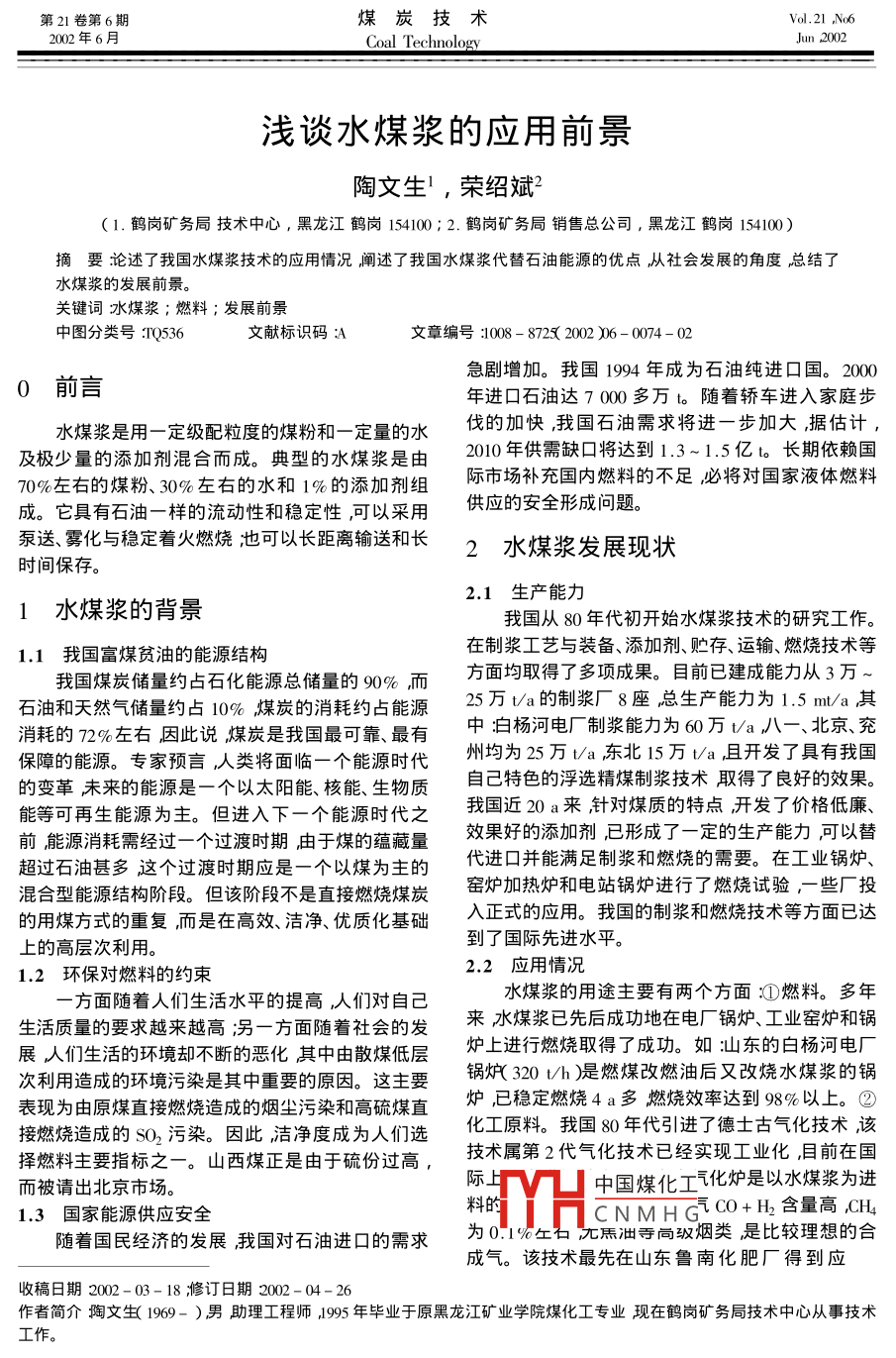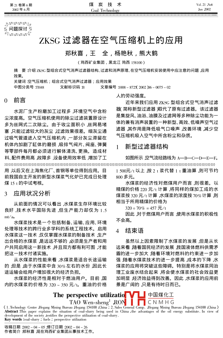 第21卷第6期煤炭技術(shù)Vol 21 No62002年6月Coal Technology淺談水煤漿的應(yīng)用前景陶文生!,榮紹斌21.鶴崗礦務(wù)局技術(shù)中心,黑龍江鶴崗154100;2.鶴崗礦務(wù)局銷售總公司,黑龍江鶴崗154100摘要淪述了我國水煤漿技術(shù)的應(yīng)用情況闡述了我國水煤漿代替石油能源的優(yōu)點(diǎn)從社會(huì)發(fā)展的角度總結(jié)了水煤漿的發(fā)展前景關(guān)鍵詞冰煤漿;燃料;發(fā)展前景中圖分類號(hào):TQ536文獻(xiàn)標(biāo)識(shí)碼:A文章編號(hào)1008-872(2002)6-0074-02急劇增加。我國1994年成為石油純進(jìn)口國。20000前言年進(jìn)口石油達(dá)7000多萬t。隨著轎車進(jìn)入家庭步水煤漿是用一定級(jí)配粒度的煤粉和一定量的水伐的加快,我國石油需求將進(jìn)一步加大據(jù)估計(jì),及極少量的添加劑混合而成。典型的水煤漿是由2010年供需缺囗將達(dá)到1.3-1.5億長期依賴國70%左右的煤粉、30%左右的水和1%的添加劑組際市場補(bǔ)充國內(nèi)燃料的不足必將對(duì)國家液體燃料成。它具有石油一樣的流動(dòng)性和穩(wěn)定性可以采用供應(yīng)的安全形成問題泵送、霧化與穩(wěn)定著火燃燒池可以長距離輸送和長2水煤漿發(fā)展現(xiàn)狀時(shí)間保存。2.1生產(chǎn)能力1水煤漿的背景我國從80年代初開始水煤漿技術(shù)的研究工作。1.1我國富煤貧油的能源結(jié)構(gòu)在制漿工藝與裝備、添加劑、貯存、運(yùn)輸、燃燒技術(shù)等我國煤炭儲(chǔ)量約占石化能源總儲(chǔ)量的90%而方面均取得了多項(xiàng)成果。目前已建成能力從3萬石油和天然氣儲(chǔ)量約占10%煤炭的消耗約占能源25萬va的制漿廠8座總生產(chǎn)能力為1.5ma其消耗的7%左右因此說煤炭是我國最可靠、最有中楊河電廠制漿能力為60萬t/a八-、北京、兗保障的能源。專家預(yù)言人類將面臨一個(gè)能源時(shí)代州均為25萬Ua東北15萬a且開發(fā)了具有我國的變革未來的能源是一個(gè)以太陽能、核能、生物質(zhì)自己特色的浮選精煤制漿技術(shù)取得了良好的效果能等可再生能源為主。但進(jìn)入下一個(gè)能源時(shí)代之我國近20a來針對(duì)煤質(zhì)的特點(diǎn)開發(fā)了價(jià)格低廉、前能源消耗需經(jīng)過一個(gè)過渡時(shí)期由于煤的蘊(yùn)藏量效果好的添加劑已形成了一定的生產(chǎn)能力可以替超過石油甚多這個(gè)過渡時(shí)期應(yīng)是一個(gè)以煤為主的代進(jìn)口并能滿足制漿和燃燒的需要。在工業(yè)鍋爐、混合型能源結(jié)構(gòu)階段。但該階段不是直接燃燒煤發(fā)窯爐加熱爐和電站鍋爐進(jìn)行了燃燒試驗(yàn),些廠投的用煤方式的重復(fù)而是在高效潔凈、優(yōu)質(zhì)化基礎(chǔ)入正式的應(yīng)用。我國的制漿和燃燒技術(shù)等方面已達(dá)上的高層次利用。到了國際先進(jìn)水平。1.2環(huán)保對(duì)燃料的約束2.2應(yīng)用情況方面隨著人們生活水平的提高人們對(duì)自己水煤漿的用途主要有兩個(gè)方面:燃料。多年生活質(zhì)量的要求越來越高馮另一方面隨著社會(huì)的發(fā)來水煤漿已先后成功地在電廠鍋爐、工業(yè)窯爐和鍋展人們生活的環(huán)境卻不斷的惡化其中由散煤低層爐上進(jìn)行燃燒取得了成功。如山東的白楊河電廠次利用造成的環(huán)境污染是其中重要的原因。這主要鍋好320h是燃煤改燃油后又改燒水煤漿的鍋表現(xiàn)為由原煤直接燃燒造成的煙塵污染和高硫煤直爐已穩(wěn)定燃燒4a多燃燒效率達(dá)到98%以上。②接燃燒造成的SO2污染。因此潔凈度成為人們選化工原料。我國80年代引進(jìn)了德士古氣化技術(shù)該擇燃料主要指標(biāo)之一。山西煤正是由于硫份過高技術(shù)屬第2代氣化技術(shù)已經(jīng)實(shí)現(xiàn)工業(yè)化目前在國而被請(qǐng)出北京市場際上中國煤化工千化爐是以水煤漿為進(jìn)1.3國家能源供應(yīng)安全CNMHGLCO0+H含量高,CH隨著國民經(jīng)濟(jì)的發(fā)展我國對(duì)石油進(jìn)口的需求為01%無出寺簡級(jí)煙類是比較理想的合成氣。該技術(shù)最先在山東魯南化肥廠得到應(yīng)收稿日期2002-03-18修訂日期2002-04-26作者簡介陶文生1969-)男助理工程師,1995年畢業(yè)于原黑龍江礦業(yè)學(xué)院煤化工專業(yè)現(xiàn)在鶴崗礦務(wù)局技術(shù)中心從事技術(shù)工作。第21卷第6期煤炭技術(shù)Vol 21 No62002年6月Coal Technology問題探討soosZKSG過濾器在空氣壓縮機(jī)上的應(yīng)用鄭秋喜,王全,楊艷秋,熊大鶴雞西礦業(yè)集團(tuán),黑龍江雞西158100)摘要介紹ⅨKSG型組合式空氣消聲過濾器結(jié)構(gòu)、過濾和消聲原理、在空氣壓縮機(jī)安裝使用中應(yīng)注意的問題應(yīng)用效果關(guān)鍵詞空氣壓縮機(jī);組合式空氣消聲過濾器;應(yīng)用效果中圖分類號(hào):TH48文獻(xiàn)標(biāo)識(shí)碼$B文章編號(hào)1008-87252002)6-0075-02人的勞動(dòng)強(qiáng)度0前言近年來我們應(yīng)用ZKSG型組合式空氣消聲過濾水泥廠生產(chǎn)粉磨加工過程多環(huán)境空氣中含粉器簡稱新型過濾器取代了原有過濾器。該過濾器塵濃度高??諝鈮嚎s機(jī)使用的除塵過濾裝置原設(shè)計(jì)是集旋風(fēng)油浴、油膜及過濾網(wǎng)等多種除塵功能為多為絲網(wǎng)式二次除塵。由于收塵面積小絲網(wǎng)易堵體的兼有消聲裝置的一種新型、高效、低噪聲空氣過塞只能過濾較大的灰塵過濾效果很差。細(xì)灰