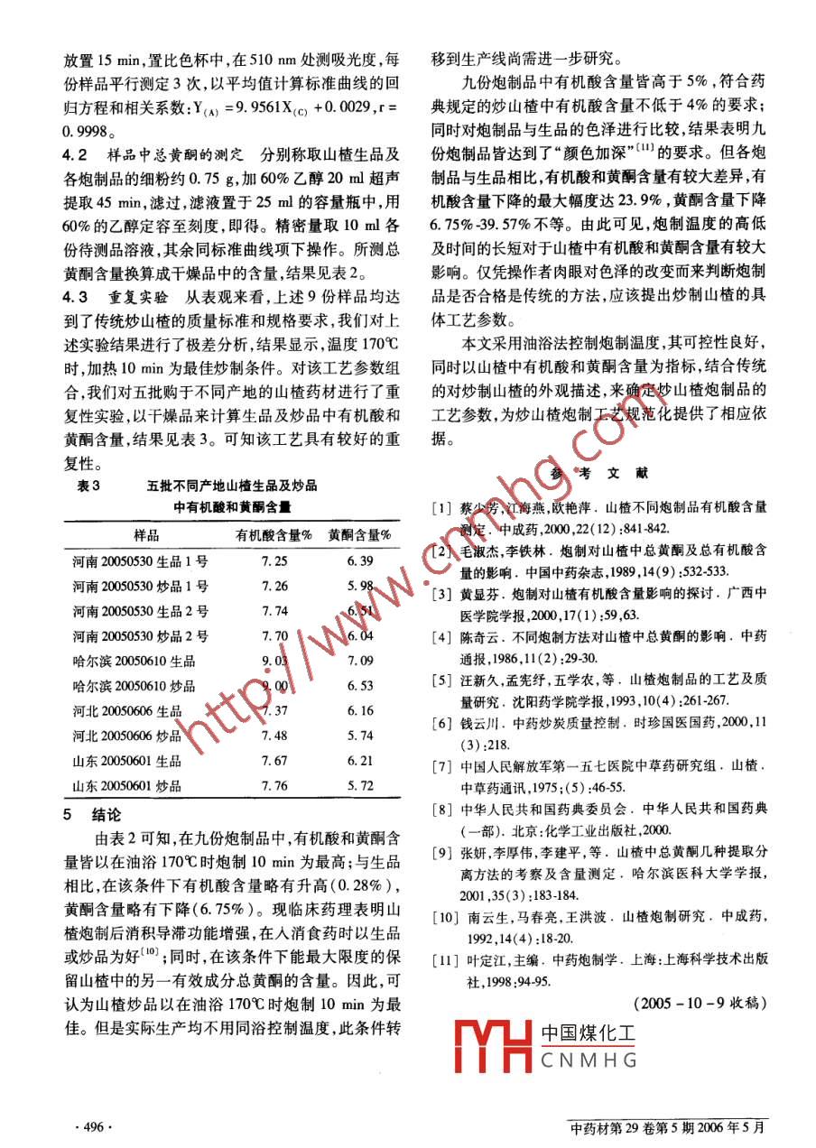 6方差分析表醇溶液,(2)包合物中回收揮發(fā)油無(wú)水乙醇溶液方差來(lái)源平方和自由度均方F比顯著性P(3)包合物無(wú)水乙醇洗滌液。層析結(jié)果表明,(1)和A150.83275.4210.83<0.005(2)在此展開(kāi)條件下,顯示相同顏色的4個(gè)斑點(diǎn)77.935.60<0.05(3)在層析板上沒(méi)有斑點(diǎn)出現(xiàn)。表明包合物確已形5.922成,外部基本無(wú)游離揮發(fā)油。14.8727.441.03討論誤差(E)62.6593.1優(yōu)選細(xì)辛提取揮發(fā)油的最佳工藝,發(fā)現(xiàn)浸泡注:F60(2,9)=426,F40(2,9)=8.02,F10m(2,9)=1011時(shí)間、加水量對(duì)揮發(fā)油提取量無(wú)明顯影響確定最佳22.2揮發(fā)油包合工藝條件優(yōu)選:通過(guò)預(yù)試及參揮發(fā)油提取條件為:浸泡時(shí)間1h,加水量8倍,提取考文獻(xiàn)資料確定揮發(fā)油包合的主要影響因素為揮發(fā)時(shí)間3h油:BCD(m:g)包合時(shí)間包合溫度、BCD:水,對(duì)32細(xì)辛揮發(fā)油包合采用揮發(fā)油與一定比例的B每個(gè)因素確定三個(gè)水平,采用L2(3)正交表,以包環(huán)糊精水直接攪拌包合的方法,阝環(huán)糊精不制成飽合物收得率和揮發(fā)油包合率為評(píng)價(jià)指標(biāo)對(duì)包合工藝和水溶液,相對(duì)飽和水溶液法加水量明顯減少,便于進(jìn)行優(yōu)選權(quán)重分別為03和0.7。因素水平見(jiàn)表工業(yè)化生產(chǎn)。驗(yàn)證表明本工藝重現(xiàn)性好揮發(fā)油包4,正交試驗(yàn)結(jié)果見(jiàn)表5,方差分析結(jié)果表6。合率、包合物收率較高。對(duì)正交實(shí)驗(yàn)結(jié)果進(jìn)行分析可知:揮發(fā)油:β-CD、參考文獻(xiàn)包合時(shí)間對(duì)實(shí)驗(yàn)結(jié)果有非常顯著影響,包合溫度、B-[1]楊大峰,等.五個(gè)不同來(lái)源細(xì)辛揮發(fā)油相色譜質(zhì)譜分CD:水無(wú)顯著影響影響程度為A>B>C>D。最析,中國(guó)中藥雜志,1997,22(7):426428[2]謝偉,等.細(xì)辛揮發(fā)油的化學(xué)與藥理作用,寧夏醫(yī)學(xué)雜佳包合工藝為A2B2C2D1,即揮發(fā)油:BCD(ml:g)比志,1995,17(2):121-124例為:1:6,包合時(shí)間1b,BCD:水比例為:16,包合(3]唐一上,中藥細(xì)辛的藥理研究概況。時(shí)珍國(guó)藥研究,溫度:30℃。取3份揮發(fā)油按最佳包合工藝進(jìn)行驗(yàn)1991,2(3):137-139證結(jié)果揮發(fā)油包合率為843%,包合物收得率為[4]嚴(yán)建業(yè),夏新華.B環(huán)糊精包合荊芥陳皮揮發(fā)油的工85.8%,此工藝穩(wěn)定可行藝研究,中成藥,2003,25(8):61261322.3包合物驗(yàn)證:采用薄層色譜法,層析條件:[5]湯道權(quán),等.豆蔻揮發(fā)油β環(huán)糊精包合工藝研究.中硅膠G板;展開(kāi)劑為石油醚:乙酸乙酯(8:1);顯色藥材,2003,25(10):785787劑為1%香草醛硫酸溶液。樣品:(1)揮發(fā)油無(wú)水乙(2005-10-9收稿)炒山楂的工藝研究肖小春,楊中林‘,李永(中國(guó)藥科大學(xué),江蘇南京20009摘要目的:篩選炒山楂的最佳炮制工藝。方法:運(yùn)用滴定法和比色法,對(duì)生品、不同溫度及時(shí)間的炮制品中有機(jī)酸和黃酮進(jìn)行含量測(cè)定。結(jié)果:炒山楂的最佳條件為170℃炮制10min。結(jié)論:不同溫度及炮時(shí)間下的炒制品中有機(jī)酸、黃酮含量有較大差異。關(guān)鍵詞山楂;炮制;滴定法;比色法中圖分類號(hào):B284.2文獻(xiàn)標(biāo)識(shí)碼:A文章編號(hào):10014454(2006)054049403山楂為常用中藥,具消食健脾,活血行氣之功。 tagus pinnatifida bge.的干燥果實(shí),統(tǒng)稱山楂。臨《中國(guó)藥典》200年版收載的品種為山里紅Cae床上gus pinnatifida Bge.var. major N.E.B.r和山楂Cra-和YH中國(guó)煤化工楂、炒山楂、焦山楂CNMHG作者簡(jiǎn)介:肖小春(1981-),江西省永新縣人,男,在讀碩士,Tel:02585322508。通訊作者:楊中林,Email:YZL950@yahoo,com.cn中藥材第29卷第5期2006年5月現(xiàn)對(duì)于山楂炮制的研究報(bào)道多以山楂中有機(jī)酸1.2儀器油浴控溫鍋(自制)、721分光光度計(jì)含量或(和)黃酮含量為指標(biāo),且各方報(bào)道之間有較(上海第三分析儀器廠)。大出入。有報(bào)道稱山楂炒后有機(jī)酸含量較生品升高2實(shí)驗(yàn)方法8.14%(1,黃酮含量較生品升高5.72%3);然而更2.1原料的預(yù)處理揀去山楂中小片及脫落的果多報(bào)道的是隨著炮制時(shí)溫度的升高及時(shí)間的延長(zhǎng),核,使其大小變?yōu)榫鶆蛴袡C(jī)酸含量23和黃酮含量呈下降趨勢(shì)“。造成上2.2山楂的炮制稱取生山楂樣品9份,每份50述結(jié)論上的差異,可歸納為以下兩點(diǎn):一是傳統(tǒng)炮制g。在已控溫的油浴鍋上按表1條件下進(jìn)行炮制,炮方法對(duì)溫度、時(shí)間控制不嚴(yán)(2或炮制溫度和時(shí)間無(wú)制所得成品粉碎成細(xì)粉。明顯的要求;二是質(zhì)量的判斷標(biāo)準(zhǔn)全憑操作者感表1炮制溫度與時(shí)間因素水平表官直覺(jué),以主觀印象掌握,而對(duì)炮制品中主要成因素分的含量無(wú)明確的限度,從而導(dǎo)致山楂炮制品的質(zhì)水平溫度(℃)時(shí)間(min)量因生熟不均而差異甚大。170山楂中含黃酮及有機(jī)酸兩大類成分,藥理研究表明山楂總黃酮具有降壓、增加冠脈流量、降血脂強(qiáng)心、抗心律不齊等作用;而有機(jī)酸類成分有抑菌、2105助消化等功能。為使山楂的傳統(tǒng)炮制方法更具3有機(jī)酸含量測(cè)定備客觀性與科學(xué)性,本文對(duì)炒山楂的溫度及時(shí)間兩3.1樣品液的制備分別稱取山楂生品及各炮制因素分別設(sh
