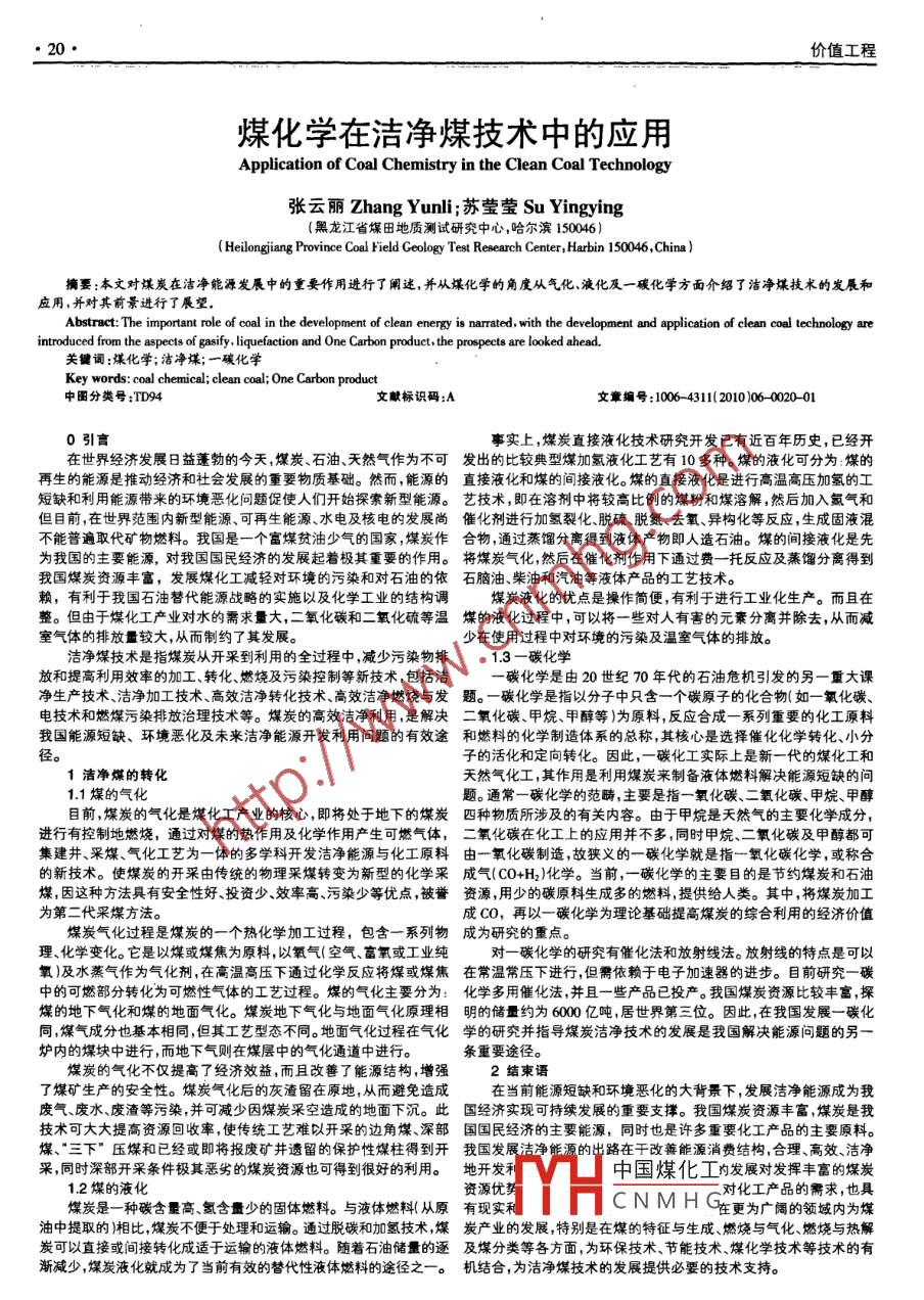 ●20●價值工程煤化學(xué)在潔凈煤技術(shù)中的應(yīng)用Application of Coal Chemistry in the Clean Coal Technology張?jiān)汽怹hang Yunli;蘇瑩瑩Su Yingying(黑龍江省煤田地質(zhì)測試研究中心,哈爾濱150046)( Heilongjiang Province Coal Field Geology Test Research Center, Harbin 150046,China )摘要:本文對煤炭在潔凈能源發(fā)展中的重要作用進(jìn)行了闡述,并從煤化學(xué)的角度從氣化、液化及一碳化學(xué)方面介紹了潔凈煤技術(shù)的發(fā)展和應(yīng)用,并對其前景進(jìn)行了展望。Abstract: The important role of coal in the development of clean energy is narrated, with the development and pplicaion of clean coal technology areintroduced from the aspects of gasify, liquefaction and One Carbon product, the prospects are looked ahead.關(guān)鍵詞:煤化學(xué);潔凈煤;一碳化學(xué)Key words: coal chemical; clean coal; One Carbon product中圈分類號:TD94文獻(xiàn)標(biāo)識碼:A文章編號:1006 4311(2010)06 0020-010引盲事實(shí)上,煤炭直接液化技術(shù)研究開發(fā)已有近百年歷史已經(jīng)開在世界經(jīng)濟(jì)發(fā)展日益蓬勃的今天煤炭、石油、天然氣作為不可發(fā)出的比較 典型煤加氫液化工藝有10多種。煤的液化可分為:煤的再生的能源是推動經(jīng)濟(jì)和社會發(fā)展的重要物質(zhì)基礎(chǔ)。然而,能源的直接液 化和煤的間接液化。煤的直接液化是進(jìn)行高溫高壓加氫的工短缺和利用能源帶來的環(huán)境惡化問題促使人們開始探索新型能源。藝技術(shù),即在溶劑中將較高比例的煤粉和煤溶解,然后加入氦氣和但目前,在世界范圍內(nèi)新型能源、可再生能源、水電及核電的發(fā)展尚催 化劑進(jìn)行加氫裂化、脫硫、脫氮、去氧、異構(gòu)化等反應(yīng),生成固液混不能普遍取代礦物燃料。我國是一個富煤貧油少氣的國家,煤炭作合物 ,通過蒸餾分離得到液體產(chǎn)物即人造石油。煤的間接液化是先為我國的主要能源,對我國國民經(jīng)濟(jì)的發(fā)展起著極其重要的作用。將煤炭氣化,然后在催化劑作用下通過費(fèi)一托反應(yīng)及蒸餾分離得到我國煤炭資源豐富,發(fā)展煤化工減輕對環(huán)境的污染和對石油的依石腦油 、柴油和汽油等液體產(chǎn)品的工藝技術(shù)。賴,有利于我國石油替代能源戰(zhàn)略的實(shí)施以及化學(xué)工業(yè)的結(jié)構(gòu)調(diào)煤炭液化的優(yōu)點(diǎn)是操作簡便,有利于進(jìn)行工業(yè)化生產(chǎn)。而且在整。但由于煤化工產(chǎn)業(yè)對水的需求量大,二氧化碳和二氧化硫等溫煤的液 化過程中,可以將-些對人有害的元素分離并除去,從而減室氣體的排放量較大,從而制約了其發(fā)展。少在使用過程中對環(huán)境的污染及溫室氣體的排放。潔凈煤技術(shù)是指煤炭從開采到利用的全過程中,減少污染物排1.3 -碳化學(xué)放和提高利用效率的加工、轉(zhuǎn)化、燃燒及污染控制等新技術(shù),包括潔-碳化學(xué)是由20世紀(jì)70年代的石油危機(jī)引發(fā)的另-重大課凈生產(chǎn)技術(shù)、潔凈加工技術(shù)、高效潔凈轉(zhuǎn)化技術(shù)、高效潔凈燃燒與發(fā)題。 -碳化學(xué)是指以分子中只含- -個碳原子的化合物如一氧化碳、電技術(shù)和燃煤污染排放治理技術(shù)等。煤炭的高效潔凈利用,是解決二氧化碳、 甲烷、甲醇等)為原料,反應(yīng)合成一系列重 要的化工原料我國能源短缺、環(huán)境惡化及未來潔凈能源開發(fā)利用問題的有效途和燃料的化學(xué) 制造體系的總稱,其核心是選擇催化化學(xué)轉(zhuǎn)化、小分徑子的活化和定向轉(zhuǎn)化。因此, -碳化工實(shí)際上是新-代的煤化工和1潔凈煤的轉(zhuǎn)化天然氣化工,其作用是利用煤炭來制備液體燃料解決能源短缺的問1.1煤的氣化題。通常-碳化學(xué)的范疇,主要是指一氧化碳、二氧化碳、甲烷、甲醇目前,煤炭的氣化是煤化工產(chǎn)業(yè)的核心,即將處于地下的煤炭四種物質(zhì)所涉及的有關(guān)內(nèi)容。 由于甲烷是天然氣的主要化學(xué)成分,進(jìn)行有控制地燃燒,通過對煤的熱作用及化學(xué)作用產(chǎn)生可燃?xì)怏w,二氧化碳在 化工上的應(yīng)用并不多,同時甲烷、二氧化碳及甲醇都可集建井、采煤、氣化工藝為- -體的多學(xué)科開發(fā)潔凈能源與化工原料由一氧化碳制造 ,故狹義的一碳化學(xué)就是指一氧化碳化學(xué),或稱合的新技術(shù)。使煤炭的開采由傳統(tǒng)的物理采煤轉(zhuǎn)變?yōu)樾滦偷幕瘜W(xué)采成氣(CO+H2)化學(xué)。 當(dāng)前,一碳化學(xué)的主要目的是節(jié)約煤炭和石油煤,因這種方法具有安全性好投資少效率高、污染少等優(yōu)點(diǎn),被譽(yù)資源,用少的碳原料生成多的燃料,提供給人類。其中,將煤炭加工為第二代采煤方法。成CO,再以- -碳化學(xué)為理論基礎(chǔ)提高煤炭的綜合利用的經(jīng)濟(jì)價值煤炭氣化過程是煤炭的一-個熱化學(xué)加工過程,包含-系列物成為研究的重點(diǎn)。理、化學(xué)變化。它是以煤或煤焦為原料,以氧氣(空氣、富氧或工業(yè)純對一碳化學(xué) 的研究有催化法和放射線法。放射線的特點(diǎn)是可以氧)及水蒸氣作為氣化劑,在高溫高壓下通過化學(xué)反應(yīng)將煤或煤焦在常溫常壓 下進(jìn)行,但需依賴于電子加速器的進(jìn)步。目前研究一碳中的可燃部分轉(zhuǎn)化為可燃性氣體的工藝過程。煤的氣化主要分