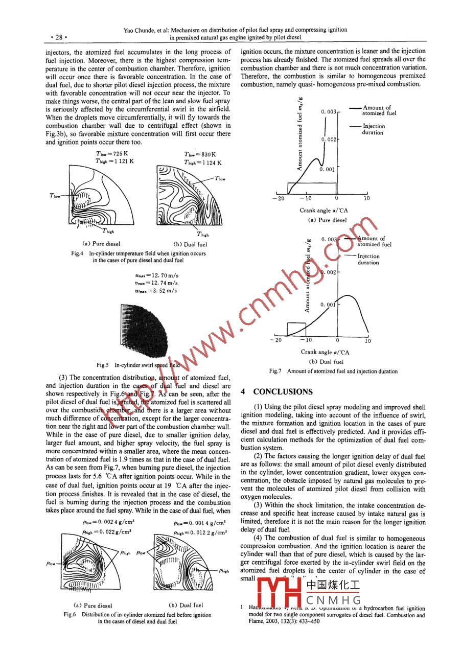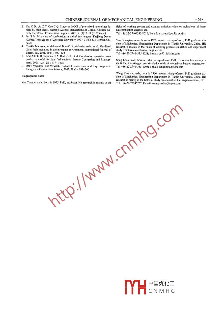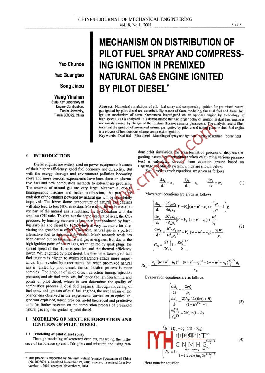 CHINESE JOURNAL OF MECHANICAL ENGINEERINGVol.18, No.l, 2005.25.MECHANISM ON DISTRIBUTION OFPILOT FUEL SPRAY AND COMPRESS-Yao ChundeING IGNITION IN PREMIXEDYao GuangtaoNATURAL GAS ENGINE IGNITEDSong JinouBY PILOT DIESEL*Wang YinshanState Key Laboratory ofEngine Combustion,Abstract: Numerical simulations of pilot fuel spray and compressing ignition for pre-mixed naturalTianjin University,gas ignited by pilot diesel are described. By means of these modeling, the dual fuel and diesel fuelTanjin 30002, Chinaignition mechanism of some phenomena investigated on an optional engine by technology ofhigh-speed CCD is analyzed. It is demonstrated that the longer delay of ignition in dual fuel engine isnot mainly caused by change of the mixture thermodynamics parameters. The analysis results ilus-trate that the ignition of pre-mixed natural gas ignited by pilot diesel taking place in dual fuel engineis a process of homogenous charge compression ignition.Key words: Dual fuel Pilot diesel Modeling of spray and ignition Delay of ignition Spray fielddom orbit simulation, the transformation process of droplets (re-0 INTRODUCTIONgarding natural gas constituent when calculating various parame-Diesel engines are widely used on power equipments becauseters) is calculated directly fom equation groups based onof their higher eficiency, good fuel economy and durability. ButLagrange coordinate system, which are shown below.Fuel droplets track equations are given as followswith the energy shortage and environment pollution becomingmore and more serious, experiments have been done on alterna-tive fuel and new combustion methods to solve these problems.5=m1)dThe reserves of natural gas are very large. Meanwhile, due tohomogeneous mixture and better combustion, the particulateMovement equations are given as followsemission of the engines powered by natural gas will be completelybecompimproved. The lower f; lower fiame temperature of naural gas enginesd業(yè)_ 3CoP.(R_will also lead to less NOx emission. Moreover, the main constitu-出= 4.(v-K{u4+H-n,)+ent part of the natural gas is methane, the hydrocarbon with thesmallest C/H ratio. To give out the same amount of heat, the CO,d業(yè)_ 3CoPeIpproduced by buming methane is less than that produced by burn-di" 4d,P.-K(4+v'-y)+ing gasoline and diesel by 15%, which is very favorable for alle(2)viating the greenhouse efect. Therefore, natural gas is a perfectdw. 3CoPxp-[|(w+w'-w)alternative fucl to substitute for diesel. Much research work hasdr 4d,Abeen carried out on buming natural gas in engines. But due to thehigh ignition point of natural gas, when ignited by spark plugs, thespread speed of the flame is smaller, and the thermal efficiencylower. While ignited by pilot diesel, the thermal efficiiencyof dualfuel engines is higher, to which researchers atach more impor-tance. It is revealed by experiments that when pre-mixed naturalRe, =p.{(u+d'-以) +(D+v-n,j+(w+w-mj}"2d,gas is ignited by pilot diesel, the combustion process is more4%complex. The amount of pilot diesel, injection timing, injectionpressure, and air fuel ratio, etc, influence the ignition timing andEvaporation equations are as fllowspoints of pilot diesel, which in turn determines the quality ofcombustion process in dual fuel engines. Through modeling of2m”fuel spray and ignition of dual fuel engines, the mechanism of thephenomena observed in the experiments carried on an optical en-gine was explained, which provides useful theoretical and predictivehd._ 2(N,1 Le)n(+ B)(3)tools for further research on the combustion proess of premixed, nramirea(1+ B)"ie-1natural gas engines ignited by pilot dicsel.品=2N,1n(1+B). P。D1 MODELING OF MIXTURE FORMATION ANDIGNITION OF PILOT DIESEL[B=(45-_.)(l-Yrs)1.1 Modeling of pilot diesel spray中國(guó)煤化工3Through modeling of scattered droplets, regarding the influ-(4)ence of urbulene spread of droplets and mixture, and using ran-nd using ran-MYHCNMHGU.c1ONt、o(~s=l+ 12.2(e.s.c"""●This projet is spprted by National Natural Science Foundation of China(No.50076031). Received December 19, 2003; reeived in revised fom No-Heat transfer equationvember 1, 2004; accepted November 9, 2004Yao Chunde, et al: Mechanism on distribution of pilot fuel spray and compressing ignition●26.in premixed natural gas engine ignited by pilo dieseldTQ一Active intermittent productsm.Cps =πd、H(T。-7)-Nu+LgH- - -Fuel taking part in chemical reaction__C., dm,/dr5)kg,hk,fk,,fkp,fsk.fk,k,k- -Chemical reaction rateπd ANuconstantsThe heat release from chemical reaction iswhereu,v, wVelocity vectorQ,=k,qV[R*]-Diameters of fuel dropletsHeat loss rate is-Density-Fuel evaporation rateQ=φV(T-Tw) φ=hRe- -Reynolds numberLe一-Lewis numberWhen the temperature of a unit reaches 1 100 K or the tempera-Pr -Prandt numberture acceleration rate is higher than 10' Ksh, it can be regardedSc --Schmidt numberas the occurrence of ignition points.ip--Specitfic heat2 EXPERIMENTAL RESULTST一-TemperatureVu-Nusselt numberThe experiment is carried out on a single-cylinder optical en--Resistance coefficientginTo find the difference of ignition points between the combus-D--Fuel vapor distribution coefficientatof刁-Heat conduction cofficienttion of pre-mixed naturaln of pre-mixed natural gas ignited by pilot diesel and thatpure diesel, studies are crried out on the mixture formation andViscositycombustion in the cases of dual fuel, pure diesel with the same en--Fuel vaporization latent heatthalpy, and pure pilot diesel when the engine speed is 1 00 r .min-,g.-- Gravitational accelerationthe engine is running at full load, and the ijction advance angleis -16 CA(see Table 1 and Fig.1).-Mass concentration proportion of fuelvapor near the surface of the fuel dropletsTable 1 Data of igntion characteristies of dual fuel,Y.一diesel with the same enthalpy and pilot dieselNatural gas Proportion of Ignitionvapor surrounding the fuel dropletsamountpilot dieseltimingNp一-Heat transfer modificatory cofficientm/(g. c