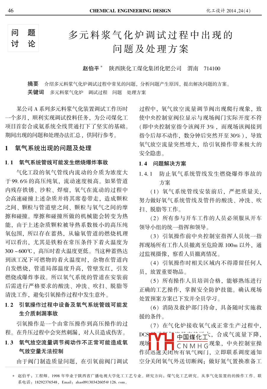 46CHEMICAL ENGINEERING DESIGN化工設(shè)計2014 ,24(4)問題多元料漿氣化爐調(diào)試過程中出現(xiàn)的討論問題及處理方案趙伯平陜西陜化工煤化集團化肥公司渭南714100摘要介紹多元料漿 氣化爐調(diào)試過程中常見的問題,分析問題產(chǎn)生原因,提出解決問題的方案。關(guān)鍵詞多元料漿 氣化爐調(diào)試過程 問題處理方案某公司A系列多元料漿氣化裝置調(diào)試工作歷時過程中,氧氣放空流量調(diào)節(jié)閥出現(xiàn)爬行現(xiàn)象,致-個多月,順利實現(xiàn)調(diào)試投料任務(wù),為公司煤化工使中央控制室閥位顯示與現(xiàn)場閥門實際開度不符項目首套合成氨系統(tǒng)全線貫通打下了堅實的基礎(chǔ)。(即中央控制室指令該閥開3%,而現(xiàn)場該閥接到期間出現(xiàn)的問題和處理辦法匯總,供同行參考。指令后卻不動作,數(shù)分鐘后突然開至30%),導(dǎo)致氧氣放空流量突然增大,給引氧操作帶來極大的1氧氣系統(tǒng)出現(xiàn)的問題及處理安全隱患。1.1氧氣系統(tǒng)管線可 能發(fā)生燃燒爆炸事故1.4問題解決方案氣化工段的氧氣管線內(nèi)流動的介質(zhì)為濃度大1.4.1防止氧氣系統(tǒng)管線發(fā)生燃燒爆炸事故的于99.6%的高壓純氧,流動速度極高。如果管道方案內(nèi)殘存鐵銹、沙粒、焊瘤,氧氣在流動的過程中(1)氧氣系統(tǒng)管線安裝前后,嚴把質(zhì)量關(guān),會高速碰撞上述雜質(zhì)并將其席卷帶走,造成顆粒努力做好氧氣系統(tǒng)管線及管件的酸洗、沖洗、吹之間、顆粒與管道壁之間、顆粒與氧氣之間的摩掃、脫脂等工作。擦和碰撞。摩擦和碰撞所做的機械能會轉(zhuǎn)變?yōu)闊?2)所有參與開車工作的人員必須服從開車能,由于上述雜質(zhì)顆粒被導(dǎo)熱系數(shù)極小的高壓純領(lǐng)導(dǎo) 小組的統(tǒng)- -指揮和領(lǐng)導(dǎo)。氧包圍,所以存在蓄熱,從輸氧管道的燃燒機理(3)引氧操作前中央控制室指揮人員統(tǒng)- ~指可以看出,尤其是鐵粉在常壓條件下著火溫度為揮現(xiàn)場所有工作人員撤離至危險源100m以外,通300 ~ 6009C,高壓時著火溫度更低。當這種蓄熱達過監(jiān)視攝像,察看人員撤離情況。到該工況下可燃物的著火溫度時,雜物在管道內(nèi)(4)引氧操作時相關(guān)區(qū)域內(nèi)不得滯留任何人.自發(fā)燃燒,管道局部溫度升高,管壁發(fā)紅,引發(fā)員,放置重要物品。燃燒或爆炸事故。所以氧氣系統(tǒng)的管道在安裝前(5) 所有操作人員培訓(xùn)合格,能夠熟練進行后需進行嚴格要求的酸洗、沖洗、吹掃、脫脂等正確的工藝操作,掌握安全防護技能。確認現(xiàn)場清洗工作,避免引氧操作過程中發(fā)生意外。處置預(yù)案方案已下發(fā)并全員學習。1.2引氧操作過程中設(shè)備及氧氣系統(tǒng)管線可能發(fā)(6)消防及救護部門待命,具備隨時實施救生介質(zhì)刺漏事故援的條件。引氧操作是-一個由常壓操作到高壓操作的過(7) 在氣化爐接收氧氣或正常生產(chǎn)過程中,程。在升壓過程中會突然刺漏,對人員造成傷害。DC中國煤化工,合成氣流量下降,1.3氧氣放空流量調(diào)節(jié)閥動作不正??赡茉斐裳醅F(xiàn)場HCN M HG現(xiàn)象,中央控制室操氣放空量無法控制作員迅速關(guān)團所有氧氣閥門,立即聯(lián)系調(diào)度通知由于閥門制造質(zhì)量問題,在引氧前閥門調(diào)試空分關(guān)閉氧氣外送切斷閥;做好氮氣置換準備工*趙伯平:工程師。1998年畢業(yè)于陜西省廣播電視大學化工工藝專業(yè)。研究方向:煤氣化工藝研究。從事氣化裝置的的操作工作。聯(lián)系電話: 18292376548, Email: zha09130342605@ 126. com。2014 ,24(4)趙伯平多 元料漿氣化爐調(diào)試過程中出現(xiàn)的問題及處理方案47作。并按相關(guān)規(guī)定處理救護。待火熄滅后,通知備用爐氧氣放空閥。確認備用爐氧氣放空閥打開空分打開氮氣人氧氣系統(tǒng)管線置換閥對氧氣系統(tǒng)后,緩慢打開氧氣流量調(diào)節(jié)閥,手動控制氧氣流管線進行置換處理。待確認現(xiàn)場安全后方可允許量調(diào)節(jié)閥,使總管氧氣放空流量< 500Nm'/h。相關(guān)人員進人現(xiàn)場進行處理。(5) 保持總管小流量低壓力氧氣放空24h后,1.4.2 解決引氧操作過程中設(shè)備及氧氣系統(tǒng)管線關(guān)閉氧氣流量調(diào)節(jié)閥,聯(lián)系調(diào)度關(guān)閉空分工段氧發(fā)生介質(zhì)刺漏事故的方案氣總閥,通過氮氣充壓管線給氧氣管線緩慢充壓(1)引氧操作前用氮氣按照由低壓到高壓逐至5.0MPa后,停送氮氣。步升壓查漏的方法,嚴把質(zhì)量關(guān),做好氧氣系統(tǒng)(6)再聯(lián)系調(diào)度打開空分工段去氣化界區(qū)氧設(shè)備及管道的查漏工作。氣總閥逐步緩慢升壓,由空分進行放空并調(diào)節(jié)壓(2)在引氧操作過程中發(fā)生泄漏事故的處理力,控制升壓速率小于0. 1MPa/min,氧氣總管壓方案:氧氣泄漏時,人員要迅速撤離泄漏污染區(qū)力逐步控制在8.0~8.3MPa。至上風處,并對污染區(qū)進行隔離,切斷周圍火源;(7)升壓同時手動控制氧氣總管放空流量調(diào)在做好個人防護時,準備好消防器材、檢測儀器,節(jié)閥, 緩慢穩(wěn)定地逐步增大氧氣放空量,可逐步將兩人以上到現(xiàn)場查看泄漏情況、擴散程度。建議氧氣放空 量分別加至2000m/n. 4000mn,應(yīng)急處理人員戴自給正壓式呼吸器,避免與可燃.對系統(tǒng)能力進行驗證確認。物或易燃物接觸