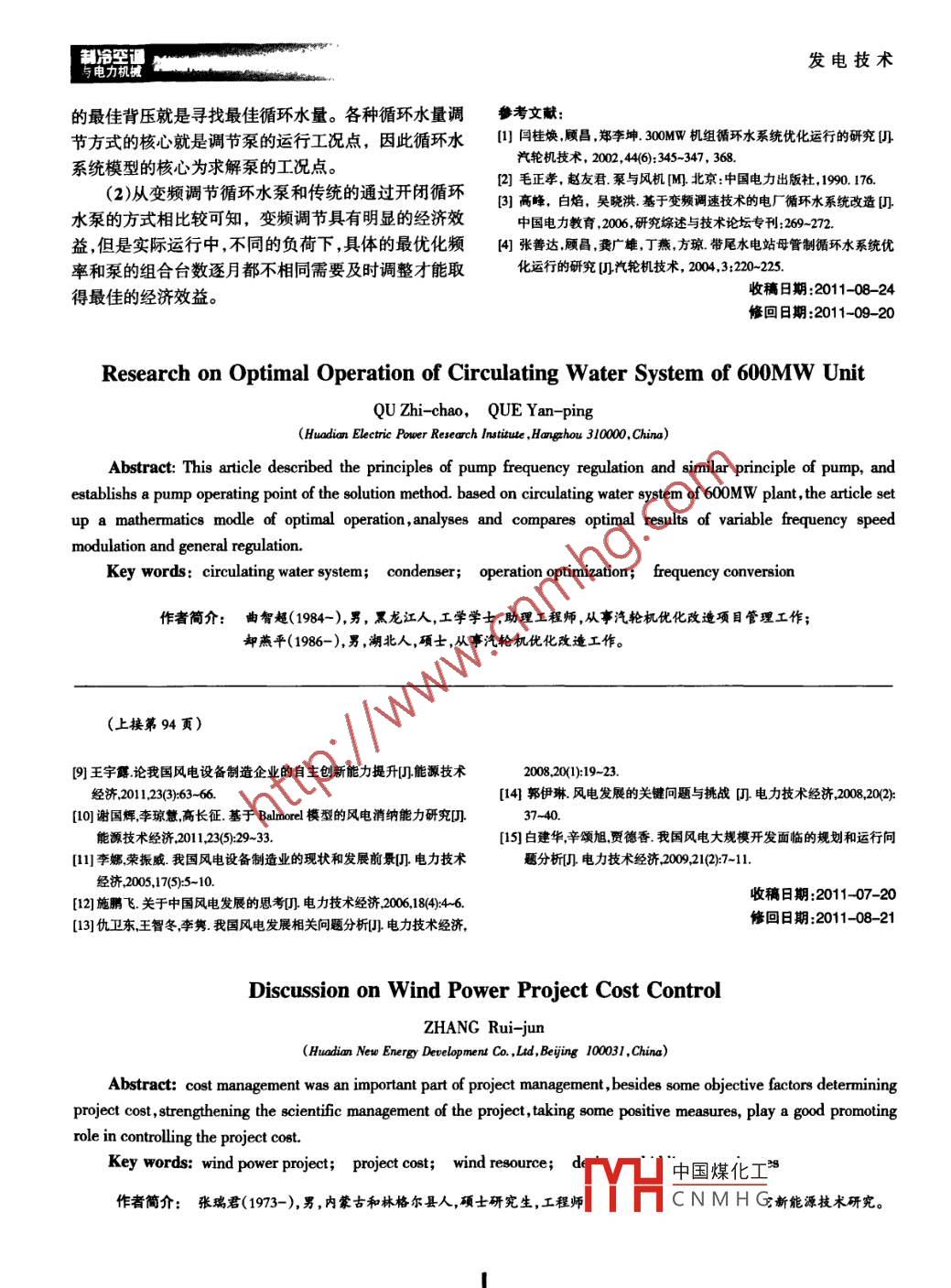 發(fā)電技術司冷空壽電力機械火電廠600MW機組循環(huán)水系統(tǒng)優(yōu)化運行的研究曲智超,卻燕平(華電電力科學研究院,浙江杭州310000)摘要:介紹了變頻調節(jié)的原理和泵的相似原理,建立了泵的工況點的求解方法。并以某電廠600MW機組的循環(huán)水系統(tǒng)為例建立開式循環(huán)水系統(tǒng)最優(yōu)化運行的數(shù)學模型,并分別對各工況下在變頻與非變頻的情況下就行了最優(yōu)化尋解,得到了逐月的在各個工況下的最優(yōu)調節(jié)方式。關鍵詞:循環(huán)水系統(tǒng);凝汽器; 運行優(yōu)化;變頻中圖分類號:TM621.6文獻標識碼: A文章編號:1006 -8449(2011 )05 0089 -040引言火電廠循環(huán)水系統(tǒng)是一個龐大的動力系統(tǒng),其耗f一電源頻率,Hz;電量較大,約占電廠本身發(fā)電量的1.5% -2% ,對循環(huán)p一電動機磁極對數(shù);水系統(tǒng)進行優(yōu)化是降低廠用電量、提高電廠經(jīng)濟效益s-轉差率。.的主要措施。一般而言循環(huán)水量過大,則背壓降低,機由于異步電動機的轉速與電源頻率成正比,所以組出力增加,同時循環(huán)水泵耗功增加;循環(huán)水量過小則當改變電源頻率時,轉速也會隨之改變,這就是變頻調真空惡化、機組出力降低,因此尋找最佳循環(huán)水量對降速。低廠用電量具有重要意義。傳統(tǒng)的節(jié)流調節(jié)方式雖然由于高頻變壓器只需將變頻器串在電源回路之中比較簡單,但是增加了管道的阻力,易使水泵脫離高效而不需要另加輸人輸出設備,故采用高頻變壓器進行區(qū)運行,降低了水泵的效率"。簡單的用開閉循環(huán)水泵變頻。在選擇變頻器時主要注意容量匹配的問題,同時的方式也過于粗糙。隨著變頻技術的發(fā)展,循環(huán)水泵的也要考慮泵的機械特性與變頻器的特性相適應。通過變頻調節(jié)逐漸成為近幾年熱門的研究方式,但是冷卻選擇,所取變頻器變頻范圍為0.2 60Hz。將變頻調速器水溫度,河流水位逐月的周而復始的變化,用電負荷也直接串接在電源的輸人回路中,接法如圖1所示。時常發(fā)生改變,并且在變頻和傳統(tǒng)的控制泵的臺數(shù)相組合的方式下,如何尋找實時最佳頻率和開啟水泵臺l整流變頻輸出數(shù)已成為運行人員的難題。本文詳細給出了建立循環(huán)交流電源電機:水系統(tǒng)的模型并且求解出實時最優(yōu)化運行方式??刂茊卧?變頻調節(jié)的原理改變水泵的轉速可以改變泵的性能曲線,這種調圈1變頻調速的邏輯接線節(jié)方式稱為變頻調節(jié)。由電機學知識可知異步電動機的轉速表達式為:在泵的變中國煤化工速發(fā)生了改變而泵本身沒有:MYHCNMHGq可進行特性曲n=60f(1-s)(1)線的相似變換。當轉速改變時四:式中n-異步電機轉速,r/min;.總14路第2 89| 制冷罕發(fā)電技術與電力機械TrinQ=叢(2)總流量等于各個并聯(lián)管道流量之和,各個并聯(lián)管道流Qz n動阻力相等。為了體現(xiàn)模型的精確度,應充分考慮氣候景;=(品)(3)變化和負荷變化對管路阻力的影響,即江河水溫、水位都是逐月變化的,如某電廠取水口水位、水溫逐月變骨=(出)(4)化,見表1。可見冬夏水位、水溫差異極大,尤其是水位最大相式中Ql,Q2- 轉速改變前、后的流量,m/s; .差達到10m,必須要加以考慮,因此阻力計算必須逐月n,n--改變前、后的轉速,r/min;離散進行。同時凝汽器水阻受負荷、水溫、流速綜合影H,H2 -轉速改變前、后的揚程,m;響了建議采用美國傳熱學會推薦的HEI公式查表擬P,P.-轉速改變前、后的功率,MW。即當同一臺泵改變轉速時,流量與轉速成正比,揚合成函數(shù)。程與轉速的平方成正比,功率與轉速的三次方成正比。3開式循環(huán)水 系統(tǒng)的數(shù)學模型實測的等效曲線和理論上的等效曲線是有差異的,只在高效區(qū)兩者才吻合。因此在選取變頻器時不僅要注在開式循環(huán)水冷卻的熱力發(fā)電廠中,在一定的外意容量匹配的問題,同時也要考慮泵的機械特性與變部條件下,即在蒸汽流量不變、循環(huán)水初溫確定、取水頻器的特性相適應。通過選擇,所取變頻器變頻范圍口水位確定,這樣在整個機組確定的情況下適當?shù)募?0 60Hz。盡管如此,在工程實踐中采用調速的方法,還大循環(huán)水量,會降低凝汽器內的凝結壓力,從而加大汽是大大擴展了葉片泵的高效率工作范圍輪機末級的有效焓降,提高機組的相對內效率,會適當假設原水泵的的揚程與功率特性曲線公式分別為的增大汽輪機的出力,當循環(huán)水量加大到- -定 的程度,H =f(q),P=g(q)那么變頻后的水泵的數(shù)學模型可表會由于背壓過低,而汽輪機末級葉片長度有限而余速示為:損失加大,故相對內效率是降低的,汽輪機出力反而減H=/(p.q1).5(5)少。無論在哪種情況下,增大循環(huán)水量就意昧著需要增加循環(huán)水泵的耗功。在這種矛盾情況下必然存在-一個R=(fq)赫(6)最佳值的水量,即在低壓缸排氣量冷卻水進口溫度一定、水位- -定的情況下,汽輪機功率的增加值與循環(huán)水式中H-變頻后水泵的揚程,m; .泵多消耗的電能的差額最大時的真空稱為機組的最佳P一變頻后水泵的功耗,,MW;真空。傳統(tǒng)的建立在最佳真空上的循環(huán)水系統(tǒng)優(yōu)化運qr一變頻后水泵的流量,m2/s。行的數(shù)學模型為典型的有約束的非線性規(guī)劃模型,具體表達式為": .2循環(huán)水泵工作點的求解(7)首先應該得到泵的揚程特性曲線H =f(q 