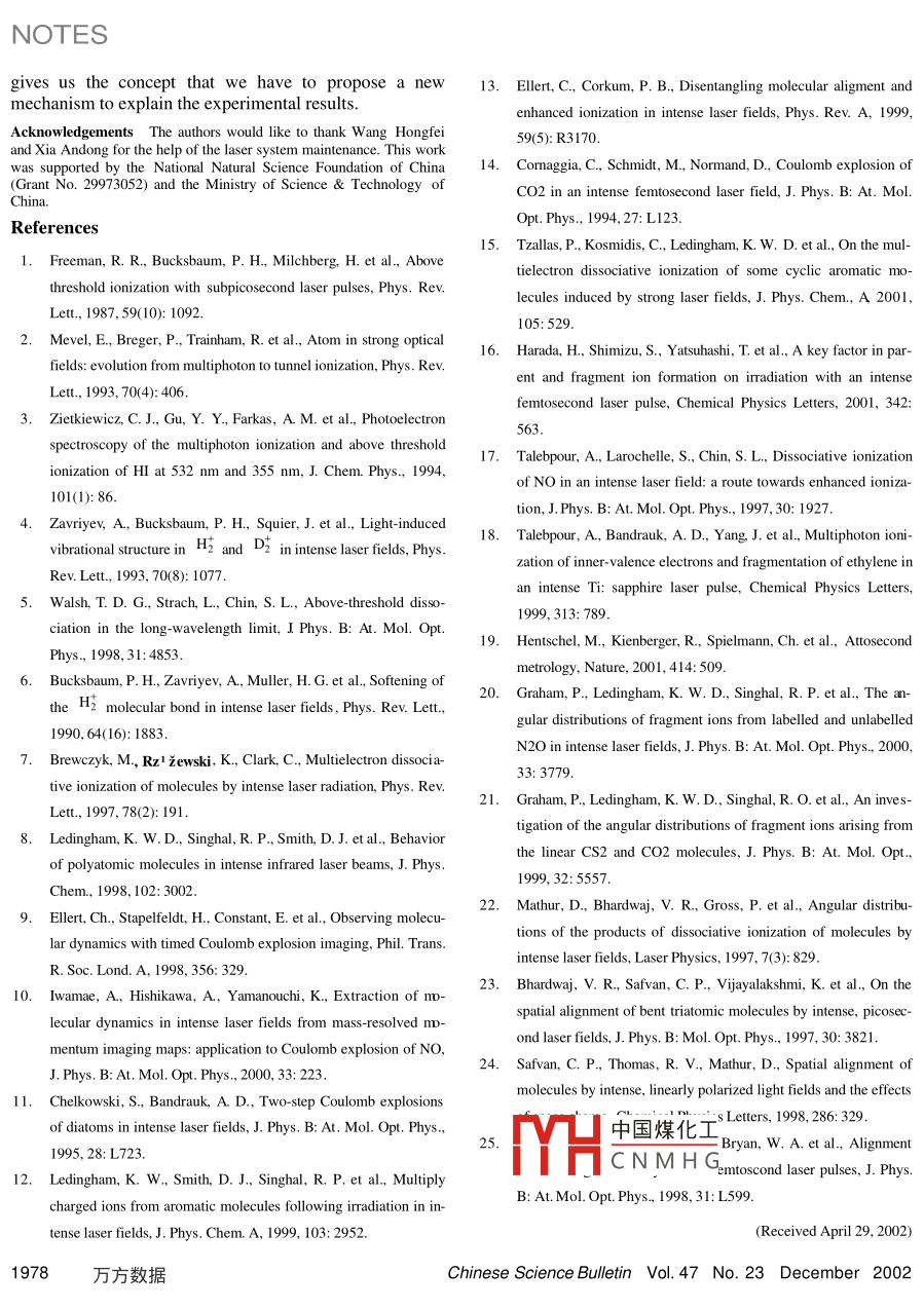 NOTESReferencesPart 1, 1992, 397(1): 337.(Received August 6, 2002)1. Rieger, E, Share, G. H, Forrest, D. J. et al., A 154-day peri-odicity in the occurrence of hard solar flares? Nature, 1984, 312:Dissociation of methanol in623.intense femtosecond laser field2. Bai, T, Sturrock, P. A.. Evidence for a fundamental period of thesun and its relation to the 154 day complex of periodicities, As-TANG Xiaoping, GAO Lirong, WANG Yonglin,trophysical Journal, Part 1, 1993, 409(1): 476.WANG Cao, WANG Sufan & KONG Fan' ao3. Massi, M, Neidhofer, J., Torielli-Ciamponi, G. et al., ActivityInstitute of Chemistry, Chinese Academy of Sciences, Beijing 100080,cycles in UX ARIETIS, Astronomy and Astrophysics, 1998, 332:ChinaCorrespondence should be addressed to Kong Fan' ao (e-mail: kong@ mrdlab.icas.ac.cn)Bogart, R. S., Bai, T. Confirmation of a 152 day peridicity in theoccurrence of solar flares inferred from microwave data, Astro-Abstract Methanol was irradiated by 80 fs laserphysical Journal, Part 2, Letters to the Editor, 1985, 299: L51.intensity range of 1013 一4014 W/cm2. A TOF-mass spectrome-ter was coupled to the laser system and used to detect theIchimoto, K., Kubota, J.. Suzuki, M. et al., Periodic behaviour ofons produced. The parent ions CH,OH+ appeared firstly atsolar flare activity, Nature, 1985, 316: 422.the laser intensity of 1.4 - X013 W/cmr. While the laser inten-6. Bai, T, Sturrock, P. A., The 152-day periodicity of the solar flaresity was gradually increased, the parent ions were dissociatedand the primary ions CH,OH+ were given as verified fromoccurrence rate, Nature, 1987, 327: 601.7. Bai, T, Cliver, E. W.. A 154-day periodicity in the ocurrence ratethe irradiation of deuterated methanol (CH,OD) showing theC - H bond cracking firstly. While the laser intensity was .of proton flares, Astrophysical Jourmal, Part 1, 1990, 363(1): 299.further increased to 2.0 . X013 W/cmr, the C-0 bonds ofGabriel, S., Evans, R., Feynman, J.. Periodicities in the occurrencethe parent ions also broke to give CH. When the laser in-rate of solar proton events, Solar Physics, 1990, 128: 415.tensity was higher, smaller fragment ions like CH+, C, OH+Bouwer, S. D.. Periodicities of solar iradiance and solar activityand O+ also appeared. Among the fragment ions, only H+ ionyield had anisotropic angular distribution dependence on theindices, Part - I, Solar Physics, 1992, 142(2): 365.laser polarization vector in the dissociation of methanol. All10. Ballester, J. L, Oliver, R., Baudin, F, Discovery of the near 158the experimental observations show that the dissociation ofday periodicity in group sunspot numbers during the eighteenthmethanol proceeds through stepwise mechanism but notCoulomb explosion.century, Astrophysical J., 199, 522: L153.11. Lou Yuqing, Rossby-type wave-induced periodicties in flare ac-Keywords: intense laser field, femtosecond laser, dissociation,methanol, TOF-mass spectra.tities and sunspot areas or groups during solar maxima, The As-trophysical Joumal, 2000, 540(2): 1102.The intensity of the coulomb field, which binds the12. Carbonel, M., The near 160 day periodicity in the emergence ofelectrons and nuclei together in molecules, is about 1Cphotospheric magnetic flux, Proceedings of SOLSPA 2001 Euro-V/cm. The electric field of an ultrashort intense laser pulconference: Solar Cycle and Space Weather, Vico Equense 2001,se can be comparable to this magnitude. Such strong laserfield interaction with molecules will result in changing ofESA SP Series, SP-477.he potential energy surface and the configuration of13. Meyer, Y., Wavelets and Operators, Cambridge: Cambridge Uni-molecules. Many new phenomena occur, such as above-versity Press 1992.threshold ionization!- -3, above- threshold dissociation'4, 5),14. Chao, B. F, Naito, L, Wavelet analysis provides a new tool forbond-softening|01_, Coulomb explosion!7 -121. , and align-studying earthi s rotatin, EOS, 1995, 76: 161.mentl3].15. Liao, D. C. Liao, X. H., New evidence for possible impact of so-Some reports on the dissociation of molecules inlar activity on long-term fluctuation of the earth rotation, Chineseintense, femtosecond laser field have already appeared.Science Bulletin, 2001, 4611): 905.Most of them were performed in the very high intensity16. Han Yanben, Han Yonggang, Wavelet analysis of sunspot relativeregion of 10I5- -1016 W/cm2 and the results were explainedin terms of Coulomb explosion. Cornaggia et a1.[14] studiedmumbers, Chinese Science Bulletin, 2002, 47(7): 609.17. Han Yanben, Zhao Juan, Li Zhian, Inter- annual variation of thethe dissnciationnf C0. sinσ 5 >10I5 W/cm2 laser pulse.earth rotation and El Nino, Chinese Science Bull. 2002, 47(2):The中國煤化工C2+(Z=1-4), or+(z-104.=1-YHCNMHG1-2)wereproducedvi18. Sturrock, P. A. Bai, T, Search for evidence of a clock related toCoulomb explosion of CO2 Ledingham et al.!15] havethe solar 154 day complex of periodicities, Astrophysical Journal,studied the dissociation processes of cyclic aromaticmolecules (furan, pyrrole, pyridine and pyrazine) using 75Chinese St亦數(shù)據(jù)/etin Vol. 47 No. 23 December 20021973NOTES .fs, intensity of 4. >106 W/cm? laser pulse. They .conclud-1 Experimental setuped that the Coulomb explosion takes place in multi-The laser system used in this experiment was acharged parent ions with a deformed molecular structure.home-built mode-locked femtosecond Ti: sapphire oscil-All of these reports were conducted at laser intensitylator which was pumped by a diode-pumped, frequency-higher than 105 Wcm7. At this intensity, multichargeddoubled laser (532 nm, Verdi, Coherent). As a seed pulse,ions appear and Coulomb explosion model can be used tothe 800 nm, 50 fs laser pulse from the oscillator wasexplain the results. In the Coulomb explosion, moleculesstretched and then led to a multipass Ti sapphire laserirradiated by intense laser will be multiply ionized to giveamplifier Quantronix, Odin) which was pumped by therise to multicharged molecular ions at very sh