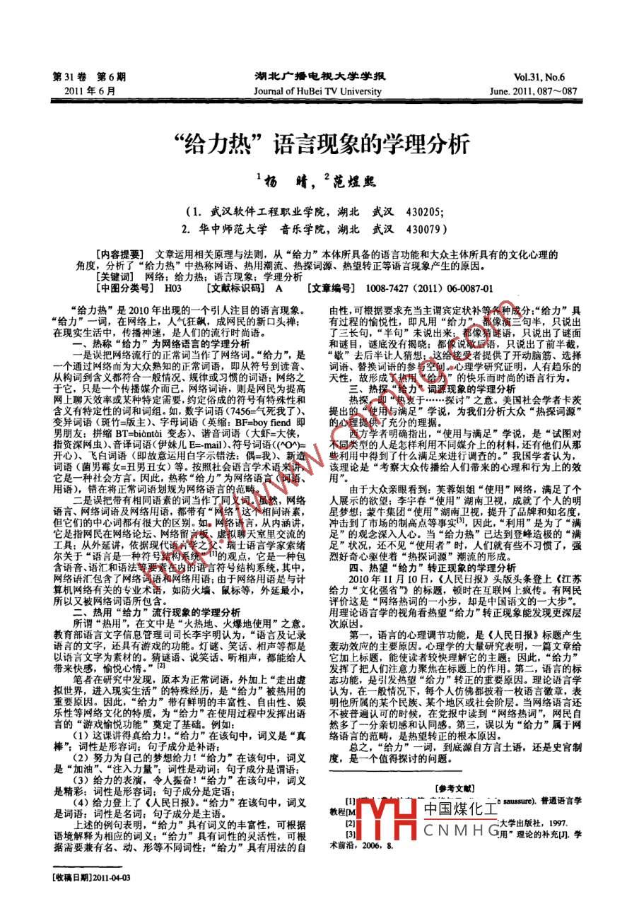 第31卷第6期湖北廣播電視大學(xué)學(xué)報(bào)Vol31, No 62011年6月Joumal of HuBei TV UniversityJune.2011,087~087“給力熱”語(yǔ)言現(xiàn)象的學(xué)理分析楊晴,2范煜熙(1.武漢軟件工程職業(yè)學(xué)院,湖北武漢430205;2.華中師范大學(xué)音樂(lè)學(xué)院,湖北武漢430079)[內(nèi)容提要]文章運(yùn)用相關(guān)原理與法則,從“給力”本體所具備的語(yǔ)言功能和大眾主體所具有的文化心理的角度,分析了“給力熱”中熱稱網(wǎng)語(yǔ)、熱用潮流、熱探詞源、熱望轉(zhuǎn)正等語(yǔ)言現(xiàn)象產(chǎn)生的原因。[關(guān)鍵詞]網(wǎng)絡(luò);給力熱;語(yǔ)言現(xiàn)象;學(xué)理分析[中圖分類(lèi)號(hào)]H03[文獻(xiàn)標(biāo)識(shí)碼]A[文章編號(hào)]10087427(2011)06008701“給力熱”是20年出現(xiàn)的“個(gè)引人注目的語(yǔ)言現(xiàn)象。由性可根據(jù)要求充當(dāng)主謂賓定狀補(bǔ)等各種成分“給力”具在現(xiàn)實(shí)生活中,傳播神速,是人們的流行時(shí)尚語(yǔ)了三長(zhǎng)句,“半句”未說(shuō)出來(lái);都像猜謎語(yǔ),只說(shuō)出了謎面熱稱“給力”為網(wǎng)絡(luò)語(yǔ)言的學(xué)理分析和謎目,謎底沒(méi)有揭曉:都像說(shuō)歇后語(yǔ),只說(shuō)出了前半截,是誤把網(wǎng)絡(luò)流行的正常詞當(dāng)作了網(wǎng)絡(luò)詞?!敖o力”,是“歇”去后半讓人猜想;這給接受者提供了開(kāi)動(dòng)腦筋、選擇通過(guò)網(wǎng)絡(luò)而為大眾熟知的正常詞語(yǔ),即從符號(hào)到讀音詞語(yǔ)、替換詞語(yǔ)的參與空間。心理學(xué)研究證明,人有趨樂(lè)的從構(gòu)詞到含義都符合一般情況、規(guī)律或習(xí)慣的詞語(yǔ);網(wǎng)絡(luò)之天性,故形成了熱用“給力”的快樂(lè)而時(shí)尚的語(yǔ)言行為只是一個(gè)傳播媒介而已。網(wǎng)絡(luò)詞語(yǔ),則是網(wǎng)民為提高三、熱探“給力”詞源現(xiàn)象的學(xué)理分析聊天效率或某種特定需要,約定俗成的符號(hào)有特殊性和熱探,即“熱衷于……探討”之意。美國(guó)社會(huì)學(xué)者卡茨變異詞語(yǔ)(斑竹=版主)、字母詞語(yǔ)(英縮:BF= boy fiend即的心理提供了充分的理?yè)?jù)”學(xué)說(shuō),為我們分析大眾“熱探詞源”男朋友;拼縮BT= biantai變態(tài))、諧音詞語(yǔ)(大蝦=大俠西方學(xué)者明確指出,“使用與滿足”學(xué)說(shuō),是指資深網(wǎng)蟲(chóng))、音譯詞語(yǔ)(伊妹兒E=mail)符號(hào)詞語(yǔ)(~O^)=不同類(lèi)型的人是怎樣利用不同媒介上的材料,還有開(kāi)心)、飛白詞語(yǔ)(即故意運(yùn)用白字示錯(cuò)法:偶=我)、新造些利用中得到了什么滿足來(lái)進(jìn)行調(diào)查的?!蔽覈?guó)詞語(yǔ)(菌男霉女=丑男丑女)等。按照社會(huì)語(yǔ)言學(xué)術(shù)語(yǔ)來(lái)講該理論是“考察大眾傳播給人們帶來(lái)的心理和行為上的效它是一種社會(huì)方言。因此,熱稱“給力”為網(wǎng)絡(luò)語(yǔ)言(詞語(yǔ)用語(yǔ)),錯(cuò)在將正常詞語(yǔ)劃規(guī)為網(wǎng)絡(luò)語(yǔ)言的范疇。由于大眾親眼看到:芙蓉姐姐“使用”網(wǎng)絡(luò),滿足了個(gè)是誤把帶有相同語(yǔ)素的詞當(dāng)作了同義詞網(wǎng)絡(luò)人展示的欲望;李宇春“使用”湖南衛(wèi)視,成就了個(gè)人的明語(yǔ)言網(wǎng)絡(luò)詞語(yǔ)及網(wǎng)絡(luò)用語(yǔ),都帶有“網(wǎng)絡(luò)”這個(gè)相同語(yǔ)素,星夢(mèng)想:蒙作集團(tuán)“使用”湖南衛(wèi)視提升了品牌和知名沖擊到了市場(chǎng)的制高點(diǎn)等事實(shí),因此,“利用”是為了“滿它是指網(wǎng)民在網(wǎng)絡(luò)論壇、網(wǎng)絡(luò)留言板、虛擬聊天室里交流的足”的觀念深入人心。當(dāng)“給力達(dá)到登峰造極的“滿工具:從外延講,依據(jù)現(xiàn)代語(yǔ)言學(xué)之父、瑞士語(yǔ)言學(xué)家索緒足”狀況,還不見(jiàn)“使用者”時(shí),人們就有些不習(xí)慣了,強(qiáng)爾關(guān)于“語(yǔ)言是一種符號(hào)結(jié)構(gòu)系統(tǒng)”田的觀點(diǎn),它是一種包烈好奇心驅(qū)使著“熱探詞源”潮流的形成含語(yǔ)音、語(yǔ)匯和語(yǔ)法等要素在內(nèi)的語(yǔ)言符號(hào)結(jié)構(gòu)系統(tǒng),其中,四、熱望“給力”轉(zhuǎn)正現(xiàn)象的學(xué)理分析網(wǎng)絡(luò)語(yǔ)匯包含了網(wǎng)絡(luò)詞語(yǔ)和網(wǎng)絡(luò)用語(yǔ);由于網(wǎng)絡(luò)用語(yǔ)是與2010年1月10日,《報(bào)》頭版頭條登上《江算機(jī)網(wǎng)絡(luò)有關(guān)的專(zhuān)業(yè)術(shù)語(yǔ),如防火墻、鼠標(biāo)等,外延最小,給力“文化強(qiáng)省”》的標(biāo)題,頓時(shí)在互聯(lián)網(wǎng)上瘋傳。有網(wǎng)評(píng)價(jià)這是“網(wǎng)絡(luò)熱詞的一小步,卻是中國(guó)語(yǔ)文的一大步二、熱用“給力”流行現(xiàn)象的學(xué)理分析用理論語(yǔ)言學(xué)的視角看熱望“給力”轉(zhuǎn)正現(xiàn)象能發(fā)現(xiàn)更深層所謂“熱用”,在文中是“火熱地、火爆地使用”之意。次原因教育部語(yǔ)言文字信息管理司司長(zhǎng)李宇明認(rèn)為,“語(yǔ)言及記錄第一,語(yǔ)言的心理調(diào)節(jié)功能,是《人民日?qǐng)?bào)》標(biāo)題產(chǎn)生語(yǔ)言的文字,還具有游戲的功能。燈謎、笑話、相聲等都是轟動(dòng)效應(yīng)的主要原因。心理學(xué)的大量研究表明,一篇文章給以語(yǔ)言文字為素材的。猜謎語(yǔ)、說(shuō)笑話