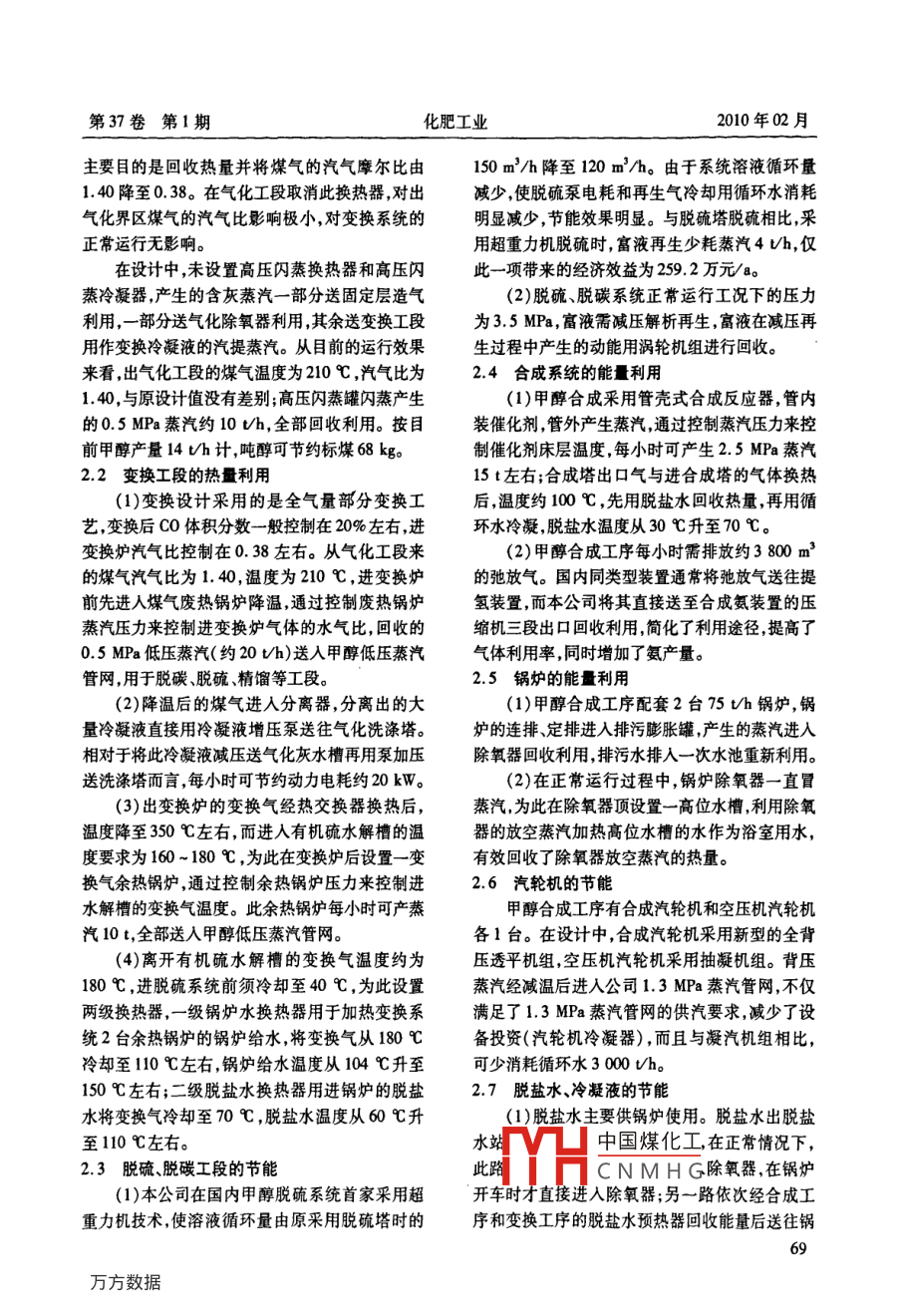 第37卷第1期化肥工業(yè)2010年02月甲醇系統(tǒng)中節(jié)能技術(shù)的應(yīng)用馬宏波,崔文科,師少杰(山西豐喜肥業(yè)<集團(tuán)>股份有限公司臨猗分公司04100)摘要介紹了甲醇系統(tǒng)設(shè)計(jì)與安時(shí)采用的先進(jìn)節(jié)能工藝,對(duì)甲醇生產(chǎn)和建設(shè)中各工序能量利用進(jìn)行了具體分析和鯛逑。實(shí)踐誣明,整套笮置能量利用比較合理,具有良好的經(jīng)濟(jì)效益和顯著的節(jié)能減排效益關(guān)鍵詞甲醇節(jié)能技術(shù)應(yīng)用Use of Energy-Saving Technology in Methanol SystemMa Hongbo, Cui Wenke, Shi ShaojieLinyi Branch of Shanxi Fengxi Fertilizer Industry Ld. 044100)Abstract An advanced energy-saving process is adopted in the design and installation of themethanol system, and a concrete analysis and an explanation are given of energy utilization in each stepof methanol production and construction. Practice demonstrates that energy utilization in the entire unitis rather rational gives good economic benefit and shows remarkable effects in energy saving and dis-Keywords methanol energy-saving technology use0前言2節(jié)能技術(shù)的應(yīng)用山西豐喜肥業(yè)(集團(tuán))股份有限公司臨猗分2.1氣化工段的資源綜合利用公司300ka甲醇工程是山西省燃料甲醇示范裝氣化工段采用本公司與清華大學(xué)、北京達(dá)立置,一期工程于2006年1月23日一次投料成功,科公司聯(lián)合開發(fā)的非熔渣-熔渣分級(jí)氣化技術(shù)。當(dāng)月即實(shí)現(xiàn)達(dá)產(chǎn)達(dá)標(biāo)?,F(xiàn)已穩(wěn)定運(yùn)行3年,為公該技術(shù)屬于煤的清潔利用范疇實(shí)現(xiàn)了對(duì)硫的回司創(chuàng)造了較好的經(jīng)濟(jì)效益。在裝置的設(shè)計(jì)和安裝收再利用;灰渣可以回收做建筑材料實(shí)現(xiàn)了對(duì)資過程中,成功地運(yùn)用了多項(xiàng)節(jié)能技術(shù)取得了顯著源的循環(huán)利用。的效果。非熔渣-熔渣分級(jí)氣化技術(shù)以水煤漿為原1工藝流程料,采用純氧氣化氣化壓力40MPa,氣化灰水經(jīng)兩級(jí)閃蒸沉淀。水煤漿氣化爐和洗滌塔的黑水300kta甲醇工程工藝流程框圖見圖1。經(jīng)高、中壓閃蒸和真空閃蒸濃縮后,再經(jīng)沉淀處理后回用。高閃蒸汽一般設(shè)計(jì)用于加熱高壓灰水然后用循環(huán)水冷凝,不凝氣放空。由于高閃蒸汽冷加劑和高壓灰水均較臟,高閃換熱器經(jīng)常堵塞且難以處理,因此一般設(shè)置2臺(tái)換熱器列管材質(zhì)為雙相MDEA精中群低壓合成問收堿磺鋼中國煤化工圖1300k/a甲醇工程工藝流程框圖什H煤氣廢熱鍋爐的CNMHG本文作者的聯(lián)系電話03594063068第37卷第1期化肥工業(yè)2010年02月主要目的是回收熱量并將煤氣的汽氣摩爾比由150m3h/h降至120m3h。由于系統(tǒng)溶液循環(huán)量1.40降至0.38。在氣化工段取消此換熱器對(duì)出減少使脫硫泵電耗和再生氣冷卻用循環(huán)水消耗氣化界區(qū)煤氣的汽氣比影響極小,對(duì)變換系統(tǒng)的明顯減少,節(jié)能效果明顯。與脫硫塔脫硫相比,采正常運(yùn)行無影響。用超重力機(jī)脫硫時(shí),富液再生少耗蒸汽4Uh,僅在設(shè)計(jì)中,未設(shè)置高壓閃蒸換熱器和高壓閃此一項(xiàng)帶來的經(jīng)濟(jì)效益為2592萬元/a蒸冷凝器,產(chǎn)生的含灰蒸汽一部分送固定層造氣(2)脫硫、脫碳系統(tǒng)正常運(yùn)行工況下的壓力利用,一部分送氣化除氧器利用,其余送變換工段為3.5MPa,富液需減壓解析再生,富液在減壓再用作變換冷凝液的汽提蒸汽。從目前的運(yùn)行效果生過程中產(chǎn)生的動(dòng)能用渦輪機(jī)組進(jìn)行回收。來看,出氣化工段的煤氣溫度為210℃,汽氣比為2.4合成系統(tǒng)的能量利用1.40,與原設(shè)計(jì)值沒有差別;高壓閃蒸罐閃蒸產(chǎn)生(1)甲醇合成采用管殼式合成反應(yīng)器,管內(nèi)的0.5MPa蒸汽約10th,全部回收利用。按目裝催化劑,管外產(chǎn)生蒸汽通過控制蒸汽壓力來控前甲醇產(chǎn)量14th計(jì),噸醇可節(jié)約標(biāo)煤68kg制催化劑床層溫度,每小時(shí)可產(chǎn)生2.5MPa蒸汽2.2變換工段的熱量利用15t左右;合成塔出口氣與進(jìn)合成塔的氣體換熱(1)變換設(shè)計(jì)采用的是全氣量部分變換工后溫度約100℃,先用脫鹽水回收熱量,再用循藝,變換后CO體積分?jǐn)?shù)一般控制在20%左右,進(jìn)環(huán)水冷凝,脫鹽水溫度從30℃升至70℃。變換爐汽氣比控制在038左右。從氣化工段來(2)甲醇合成工序每小時(shí)需排放約3800m3的煤氣汽氣比為1.40,溫度為210℃,進(jìn)變換爐的弛放氣。國內(nèi)同類型裝置通常將弛放氣送往提前先進(jìn)入煤氣廢熱鍋爐降溫,通過控制廢熱鍋爐氫裝置,而本公司將其直接送至合成氨裝置的壓蒸汽壓力來控制進(jìn)變換爐氣體的水氣比,回收的縮機(jī)三段出口回收利用,簡化了利用途徑,提高了0.5MPa低壓蒸汽(約20th)送入甲醇低壓蒸汽氣體利用率,同時(shí)增加了氨產(chǎn)量。管網(wǎng),用于脫碳、脫硫、精餾等工段。2.5鍋爐的能量利用(2)降溫后的煤氣進(jìn)入分離器,分離出的大(1)甲醇合成工序配套2臺(tái)75th鍋爐,鍋量冷凝液直接用冷凝液增壓泵送往氣化洗滌塔。爐的連排、定排進(jìn)入排污膨脹罐,產(chǎn)生的蒸汽進(jìn)入相對(duì)于將此冷凝液減壓送氣化灰水槽再用泵加壓除氧器回收利用,排污水排入一次水池重新利用。送洗滌塔而言,每小時(shí)可節(jié)約動(dòng)力電耗約20kW。(2)在正常