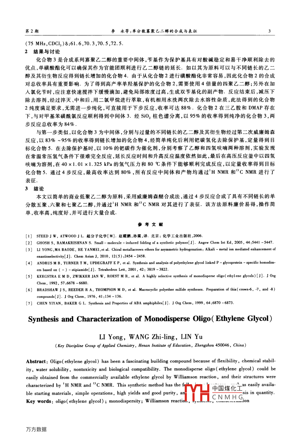 第22卷第2期河南教育學(xué)院學(xué)報(自然科學(xué)版)Vol 22 No. 22013年6月Journal of Henan Institute of Education( Natural Science Edition)Jun.2013doi:10.3969/j.isn.1007-0834.2013.02.001單分散寡聚乙二醇的合成與表征李永,王志玲,林鈺(河南教育學(xué)院應(yīng)用化學(xué)重點學(xué)科組,河南鄭州450046)摘要:寡聚乙二醇由于其獨特的結(jié)構(gòu)靈活性、化學(xué)穩(wěn)定性、水溶性、無毒和生物兼容性,作為合成模塊化合物被廣泛使用·以簡單的商業(yè)低聚乙二醇為原料,采用威廉姆森醚合成法,通過4步反應(yīng)合成了具有不同鏈長的單分散五聚、六聚和七聚乙二醇,并通過'HNMR和"CNMR對其進行了表征.該方法原料廉價易得,操作簡單,收率高純度好,并可進行大量合成關(guān)鍵詞:寡聚乙二醇;單分散性;威廉姆森反應(yīng);合成;表征中圖分類號:0621.3文獻標(biāo)識碼:A文章編號:1007-0834(2013)02-0001-03寡聚乙二醇( oligo( ethylene glycol),OEG)是一類具有重復(fù)亞乙基氧結(jié)構(gòu)單元的聚醚化合物,由于其結(jié)構(gòu)的靈活性、化學(xué)穩(wěn)定性、水溶性、無毒和生物兼容性使得寡聚乙二醇作為合成模塊化合物廣泛地應(yīng)用于冠醚類似物、表面活性劑和新材料的合成中4,其中,五聚、六聚和七聚乙二醇由于其合適的鏈長,是經(jīng)常使用的一類合成原料.然而,盡管五聚、六聚、七聚的乙二醇是商業(yè)上可以買到的,但其銷售公司少、價格昂貴,作為起始原料很難進行大量使用,以七聚乙二醇為例,其每克價格高達人民幣5500元,雖然有文獻報道其合成方法”,但往往使用價格昂貴的試劑或者操作比較繁瑣,因此尋找廉價、簡便、高效和通用的單分散寡聚乙二醇合成方法具有重要的理論意義和實用價值.我們以商業(yè)廉價的簡單聚乙二醇為原料,合成了具有精確分子量的單分散五聚、六聚、七聚乙二醇,并對其進行了表征,該方法簡便高效,并可根據(jù)需要進行大量合成1實驗乙二醇、二乙二醇、三乙二醇、四乙二醇、氯化芐、對甲基苯磺酰氯、4-二甲氨基吡啶、三乙胺和四氫呋喃均為分析純;氫化鈉為70%礦物油分散;鈀碳為10%含量.核磁共振儀為 Brucker-AV-300M;反應(yīng)用TLC跟蹤1.1合成路線合成路線如圖1所示,以易得廉價的乙二醇極其衍生物為主要原料,利用威廉姆森醚合成法,經(jīng)過4步反應(yīng),以較高產(chǎn)率得到單分散的寡聚乙二醇化合物.首先以四乙二醇為原料,在氫化鈉作用下,與氯化芐反TSCL DMAP. NEttwo steps, 84% BnoHO(CH, CH,O). Hn=1, 2.3Pd/CBn(OCH, CH,). OHHO(CHCH,O),H97%~100%5:an=5.bn=6圖1寡聚乙二醇的合Fig. 1 Synthetic route of oligo( ethylene glycol)收稿日期:2013-04-14基金項目:國家自然科學(xué)基金(21202038);河南省教育廳自然科學(xué)研究項目(2010作者簡介:李永(1979-),男,河南沈丘人,河南教育學(xué)院應(yīng)用化學(xué)重點學(xué)科組dyh中國煤化工CNMHG有機合成、不對稱催化.河南教育學(xué)院學(xué)報(自然科學(xué)版)2013年應(yīng)得到單芐基保護的四乙二醇2.化合物2在堿性條件下經(jīng)磺酰化生成單芐基保護的磺酸酯四乙二醇3.以化合物3為中間體,分別與不同鏈長的乙二醇反應(yīng)高產(chǎn)率得到鏈長增加的化合物4,經(jīng)簡單純化后利用鈀碳?xì)浠コWo基,定量得到目標(biāo)產(chǎn)物51.2合成方法1.2.1化合物2的合成在干燥的500mL三口瓶中置入NaH(6.5g,188ml,70%礦物油分散)和無水THF(200mL),然后冰浴下慢慢滴加三縮四乙二醇(36.5g,188mmol).滴加完畢后逐漸加熱到100℃,向反應(yīng)瓶中通過滴液漏斗緩慢加入氯化芐(5.5mL,47mmol).保溫反應(yīng)3小時后,冷卻到室溫,加入甲醇淬滅反應(yīng),減壓除去溶劑后,加入5%的鹽酸溶液30mL和DCM萃取.有機相經(jīng)過無水硫酸鈉干燥、過濾減壓除去溶劑后得到粗產(chǎn)品115g,收率88%,不用進一步純化,直接用于下一步反應(yīng)HNMR(300MHz,CDC1)8:3.47(s,1H),3.55-3.59(m,16H),4.45(s,2H),7.17-7.24(m,5H);"CNMR(75MHz,CDCl3)8:61.3,69.3,70.1,70.4,70.4,72.5,72.9,127.4,127.5,128.2,138.21.2.2化合物3的合成將化合物2(1.0g,38.7mmol),TsCl(8.1g,42.6mmol)和EN3(8.4mL,58.1mml)溶于150mLDCM中,加入催化量的DMAP(0.2g),室溫攪拌過夜,直接加入水洗滌(50mL×2).有機相用無水硫酸鈉干燥、過濾、減壓除去溶劑后得到油狀物,過硅膠柱純化得無色油狀液體16.2g,收率95%,HNMR(300MHz,CDCl2)8:2.38(s,3H),3.51~3.66(m,14H),4.11(t,2H),4.52(s,2H),7.24~7.33(m,7H),7.75(d,2H);"CNMR(75MHz,CDCl3)8:21.6,68.6,69.3,69.4,70.5,70.6,70.7,73.2,127.6,127.7,127.9128.3,129.8,133.0,138.3,144.8.1.2.3化合物4a的合成在干燥的500mL三口瓶中置入NaH(8.6g,0.25m0l,70%礦物油分散)和無水THF(200mL),然后冰浴下慢慢滴加乙二醇(15.5g,0.25mol).滴加完畢后逐漸加熱到100℃,向反應(yīng)瓶中通過滴液漏斗加入含有化合物3(1lg,25mmol)的THF溶液50mL.保溫反應(yīng)3h后,冷卻到室溫,加入甲醇淬滅反應(yīng)。減壓除去溶劑后,加入5%的鹽酸溶液30mL和DCM萃取.有機相經(jīng)過無水硫酸鈉干燥、過濾、減壓除去溶劑后得到粗產(chǎn)品78g,收率95%,HNMR(300MHz,CDCl2)8:2.80(s,br,1H),3.57-3.71(m,20H),4.56(8,2H),725~7.34(m,5H);"CNMR(75MHz,CDCl3)8:61.7,694,70.3,70.6,70.6,70.6,72.5,73.2,127.6,1277,128.3,138.31.2.4化合物4b的合成參照化合物4a的合成HNMR(300MHz,CDCl3)8:2.85(s,br,1H),3.57-3.65(m,24H),4.56(s2H),7.27~734(m,5H);CNMR(75MHz,CDCl3)8:61.6,69.3,70.3,70.6,70.6,72.5,73.2,127.6,127.7,128.3,138.2.1.2.5化合物4c的合成參照化合物4a的合成.HNMR(300MHz,CDC1)8:2.78(s,br,1H),3.58~3.73(m,28H),4.56(s2H),7.26-~7.34(m,5H);"CNMR(75MHz,CDCl3)8:61.7,694,70.3,70