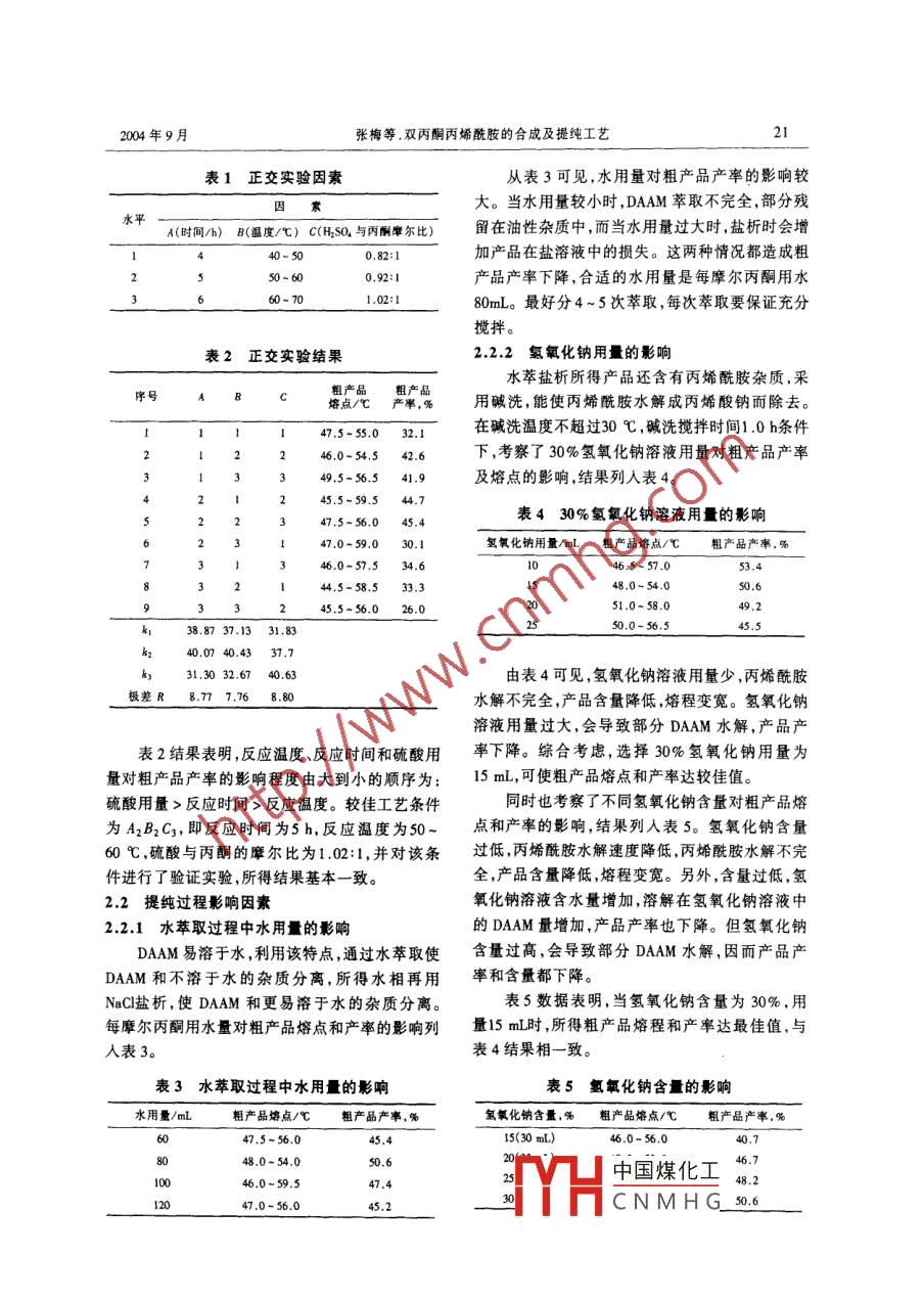 精細石油化工進展ADVANCES IN FINE PETROCHEMICALS第5卷第9期雙丙酮丙烯酰胺的合成及提純工藝張梅唐林生歐強(青島科技大學化工學院,青島266042)摘要對以丙酮和丙烯腈為原料合成雙丙酮丙烯酰胺(DAAM)及提純工藝進行了研究。考察了合成DAAM過程中主要影響因素找出最佳合成條件:丙酮/丙烯腈/硫酸摩爾比為100:0.451.02,反應時間5h,反應溫度50~60℃;產(chǎn)品提純工藝采用水萃取-NaC鹽析-NaOH溶液堿洗冷凍結(jié)晶-乙酸乙酯重結(jié)晶方法,實驗選出最佳提純工藝條件:萃取水用量80mL/m丙酮,30%NaOH溶液用量15mL/mol丙酮,乙酸乙酯用量5mL/g粗產(chǎn)品所得DAM的產(chǎn)率為527%,含量99.58%,熔點54-56℃。此提純方法與減壓蒸餾方法相比,產(chǎn)品在提純過程中不易聚合。關(guān)鍵詞雙丙酮丙烯酰胺合成提純雙丙酮丙烯酰胺(DAAM)是一種新開發(fā)出來1.2DAAM的合成的乙烯基單體,極易與其他乙烯基單體共聚,形成將1.0mol丙酮、0.45mol丙烯腈和少量對苯含有酮羰基的聚合物。酮羰基化學性質(zhì)活潑,可二酚加入裝有回流冷凝管、溫度計、攪拌機和滴液采用多元酰肼作交聯(lián)劑,使聚合物于常溫下產(chǎn)生漏斗的500mL四口燒瓶中,在攪拌下于40℃滴加交聯(lián)。國外不少專利報道,采用DAAM作為交聯(lián)1.02m濃硫酸,約1h滴完;升溫至50~60℃,保單體,多元酰肼(主要為己二酰肼)作為交聯(lián)劑,可溫5~6h;降溫至室溫后,于30℃下緩慢滴加約制備出性能優(yōu)異的室溫自交聯(lián)丙烯酸樹脂水性涂250mL15%的氨水,使物料pH值達75左右;靜料和膠粘劑(12)置,分出有機相,用6000mL水分多次萃取有機隨著感光材料的發(fā)展,DAM在光學材料上相;萃取水相加入氯化鈉至過飽和,鹽析,分出有的應用也日漸廣泛。其均聚物形成的感光材料可機相;用15mL30%NaOH溶液洗滌有機相,于制成清晰影像,并有良好強度及耐溶劑性、耐水性30℃下攪拌1h;靜置,分出有機相,于-10的膠版版面。據(jù)報道,國外對DAM的需求量15℃下結(jié)晶12h,過濾,濾餅于30℃下真空干正日益擴大,其年增速度為5%燥得粗產(chǎn)品;粗產(chǎn)品用約25mL乙酸乙酯重結(jié)晶得DAAM通常以丙烯腈和丙酮(或雙丙酮醇)為最終產(chǎn)品原料制備而成(4。由于該反應是在濃硫酸中進1.3產(chǎn)品分析行,難免發(fā)生多種副反應,產(chǎn)生多種副產(chǎn)物,如丙熔點采用毛細管法測定;紅外光譜采用德國烯酰胺、各種乙烯基單體的聚合物和丙酮的各種 Bruker公司產(chǎn) TENSOR7型紅外光譜儀測定,所縮合物(異丙又丙酮、雙異丙又丙酮等)。這些副用方法為Kr壓片法;產(chǎn)品含量采用溴化法分析。產(chǎn)物給DAAM產(chǎn)品提純造成了很大困難。目前2結(jié)果與討論常用的提純工藝是減壓蒸餾。由于DAM是種聚合活性和沸點(66Pa下約125℃)較高的單2,1合成過程影響因素體,采用減壓蒸餾容易導致聚合。為此,筆者對探索實驗結(jié)果表明,影響DAAM合成的主要DAAM的合成及產(chǎn)品提純工藝進行了研究。因素是反應溫度、反應時間和硫酸用量(與丙酮的摩爾比)。為此,對以上3因素進行了3因素3水1實驗部分平正交實驗。正交實驗設(shè)計及結(jié)果分別見表1和1.1原料表2。實驗所用主要原料有丙酮、丙烯腈、98%硫酸、25%氨水、氫氧化鈉、乙酸乙酯和氯化鈉等,均中國煤化工為分析純試劑。THCNMHO究生,研究方向水2004年9張梅等雙丙酮丙烯酰胺的合成及提純工藝21表1正交實驗因素從表3可見,水用量對粗產(chǎn)品產(chǎn)率的影響較大。當水用量較小時,DAM萃取不完全,部分殘水平A(時間/h)B(溫度/℃)C(H2SO4與丙酮摩爾比留在油性雜質(zhì)中,而當水用量過大時,鹽析時會增加產(chǎn)品在鹽溶液中的損失。這兩種情況都造成粗0.92:1產(chǎn)品產(chǎn)率下降,合適的水用量是每摩爾丙酮用水1.02:180mL。最好分4~5次萃取,每次萃取要保證充分攪拌表2正交實驗結(jié)果2,2.2氫氧化鈉用量的影響水萃鹽析所得產(chǎn)品還含有丙烯酰胺雜質(zhì),采序號ABC熔點℃產(chǎn)率,%用堿洗,能使丙烯酰胺水解成丙烯酸鈉而除去。45-503在堿洗溫度不超過30℃,堿洗攪拌時間1.0h條件212246.0-54.542.6下,考察了30%氫氧化鈉溶液用量對粗產(chǎn)品產(chǎn)率13349,5-56,541.9及熔點的影響,結(jié)果列人表4。21245.5-59表430%氫氧化鈉溶液用量的影響7.0~59.030.1氫氧化鈉用量/mL粗產(chǎn)品熔點/℃粗產(chǎn)品產(chǎn)率,%46.0~57.534.46.5~57.048,0-54.045.5~56.026.02051.0~58.0k138.8737.1331,8345.5k240.07404337.731,3032.6740.63由表4可見,氫氧化鈉溶液用量少,丙烯酰胺極差R8777.768.80水解不完全,產(chǎn)品含量降低,熔程變寬。氫氧化鈉溶液用量過大,會導致部分DAAM水解,產(chǎn)品產(chǎn)表2結(jié)果表明,反應溫度、反應時間和硫酸用率下降。綜合考慮,選擇30%氫氧化鈉用量為量對粗產(chǎn)品產(chǎn)率的影響程度由大到小的順序為:15mL,可使粗產(chǎn)品熔點和產(chǎn)率達較佳值。硫酸用量>反應時間>反應溫度。較佳工藝條件同時也考察了不同氫氧化鈉含量對粗產(chǎn)品熔為A2B2C3,即反應時間為5h,反應溫度為50~點和產(chǎn)率的影響結(jié)果列入表5。氫氧化鈉含量60℃,硫酸與丙酮的摩爾比為1.02:1,并對該條過低,丙烯酰胺水解速度降低,丙烯酰胺水解不完件進行了驗證實驗,所得結(jié)果基本一致。全,產(chǎn)品含量降低,熔程變寬。另外,含量過低,氫22提純過程影響因素氧化鈉溶液含水量增加,溶解在氫氧化鈉溶液中221水萃取過程中水用量的影響的DAM量增