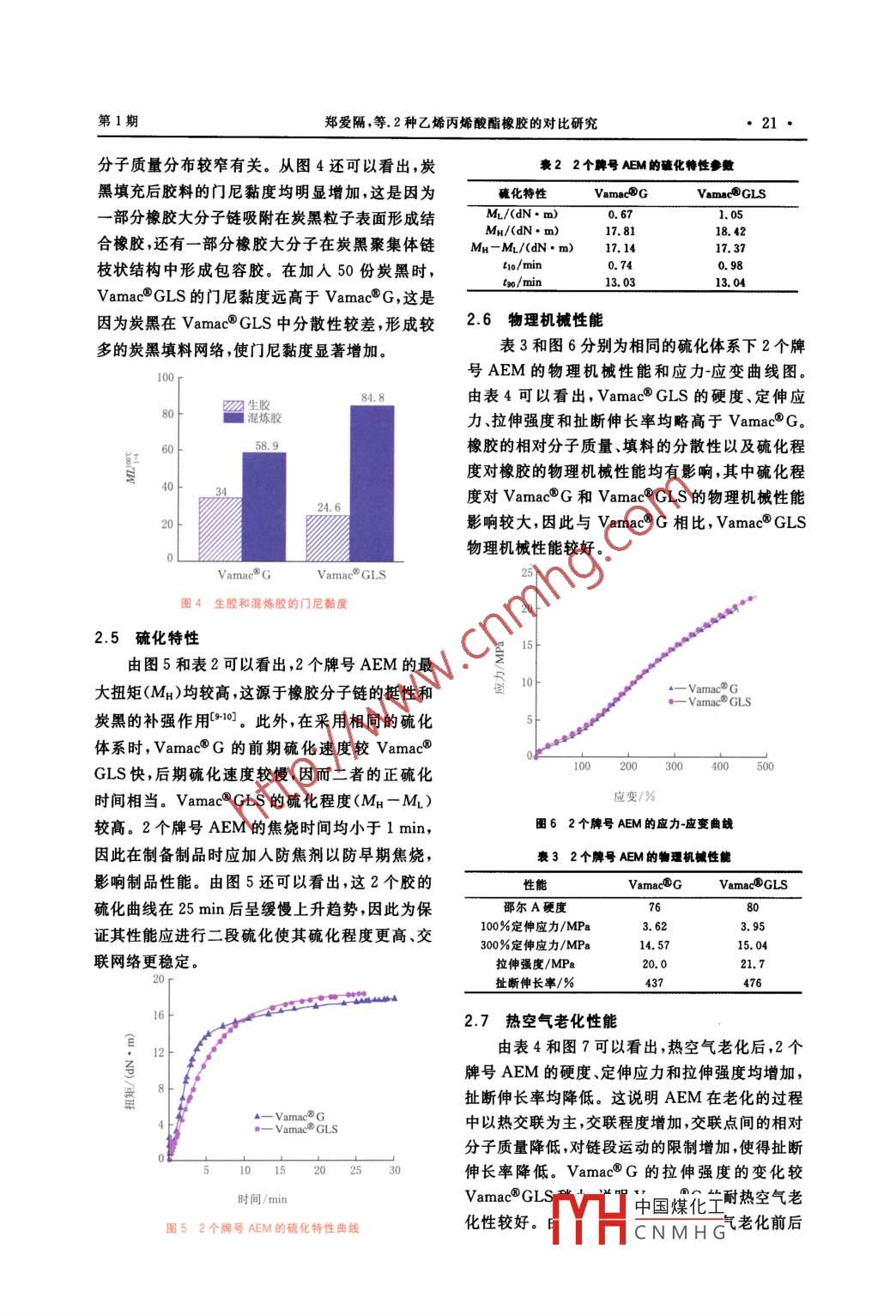 彈性體,2016-02-25,26(1):19~22研究●開發(fā)CHINA ELASTOMERICS2種乙烯丙烯酸酯橡膠的對(duì)比研究*鄭愛隔,趙志鹛,史新妍°"(青島科技大學(xué)橡塑材料與工程教育部重點(diǎn)實(shí)驗(yàn)室,山東青島266042)摘要:選用了 美國杜邦公司生產(chǎn)的2個(gè)牌號(hào)的乙烯丙烯酸酯橡膠Vamac@G和Vamac@GLS,從相對(duì)分子質(zhì)量、玻璃化轉(zhuǎn)變溫度以及物理性能等方面進(jìn)行了對(duì)比研究。結(jié)果表明,與Vamac@G相比,Vamac@GLS的相對(duì)分子質(zhì)量較低,相對(duì)分子質(zhì)量分布較寬,玻璃化轉(zhuǎn)變溫度較低。炭黑填充的Vamac@GLS的Payne效應(yīng)比VamacG明顯,說明炭黑在VamacOGLS中分散較差。VamacGLS 生膠的門尼黏度稍低,但炭黑填充混煉膠的門尼黏度卻遠(yuǎn)高于VamacOG。 采用相同的硫化體系時(shí),VamacGLS的硫化程度高于Vamac@G. VamacDGLS的硬度、定伸應(yīng)力、拉伸強(qiáng)度以及扯斷伸長率均略高于Vamac@G,兩者的耐熱空氣老化性能接近。關(guān)鍵詞:乙烯丙烯酸酯橡膠;相對(duì)分子質(zhì)量;玻璃化轉(zhuǎn)變溫度;物理機(jī)械性能中圖分類號(hào): TQ 33.97文獻(xiàn)標(biāo)識(shí)碼:A文章編號(hào):1005-3174(2016>01-0019-04乙烯丙烯酸酯橡膠(AEM)是由美國杜邦公50;硬脂酸1. 0;RD 2;ZDMC 1;硬脂酸鈉4. 0;1#司最早研發(fā)問世,由乙烯-丙烯酸酯共聚而成,硫化劑(己二氨基甲酸鹽) 1.5。其主鏈為飽和碳鏈,側(cè)鏈為極性酯基。與丙烯酸1.3 試樣制備酯橡膠(ACM)相比,AEM具有好的耐低溫性能將AEM投至哈爾濱哈普電器有限公司生產(chǎn)和耐臭氧攻擊性([23],被廣泛應(yīng)用于汽車發(fā)動(dòng)機(jī)和的RM-200C型轉(zhuǎn)矩流變儀中混煉3~4 min,溫傳動(dòng)系統(tǒng)的各種密封部件和軟管,可使部件有好度為40 C、轉(zhuǎn)子的轉(zhuǎn)速為70 r/min,然后加入硬的綜合性能和可靠性[1。汽車業(yè)制造技術(shù)的發(fā)展脂酸、RD、-半炭黑,再過5 min后加入另外一半推動(dòng)AEM的開發(fā)[5),近年來由于引擎罩下溫度炭黑,轉(zhuǎn)矩-時(shí)間曲線平穩(wěn)后排料。在開煉機(jī)上加不斷提高和新機(jī)油的采用,AEM已被北美和日人硬脂酸鈉、ZDMC和1#硫化劑,薄通4~6次后本的主要廠家用于制造TOC軟管。本文將美國下片,停放1d.將膠料在真空平板硫化機(jī)上硫化杜邦公司生產(chǎn)的VamacDG和VamacOGLS從相對(duì)分子質(zhì)量、玻璃化轉(zhuǎn)變溫度和基本物理性能等制得試片,硫化溫度為180 C。放置1d后進(jìn)行方面進(jìn)行了對(duì)比研究,以期為AEM的選用提供.二段硫化,硫化條件為100 CX5h,停放1d后裁成標(biāo)準(zhǔn)啞鈴型試樣,待用。技術(shù)參考。1.4 性能測(cè)試1實(shí)驗(yàn)部分(1)相對(duì)分子質(zhì)量及其分布:用四氫呋喃溶.1 原料解2mg樣品,采用凝膠滲透色譜法(GPC)測(cè)定橡乙烯丙烯酸酯橡膠Vamac G和Vamac⑧膠的相對(duì)分子質(zhì)量及其分布。GLS:美國杜邦公司;炭黑N330:德固賽公司;硬(2)門尼黏度:采用美國Alpha 公司生產(chǎn)的脂酸、防老劑RD及ZDMC均為市售產(chǎn)品。門尼黏度儀按GB/T 1232. 1-2000測(cè)定混煉膠1.2 實(shí)驗(yàn)配方的門尼黏度。實(shí)驗(yàn)配方(質(zhì)量份)為:AEM100;炭黑N330(3)硫化特性:采用美國Alpha公司生產(chǎn)的.自然科學(xué)基金項(xiàng)目(51273101);山東省高??萍加?jì)劃項(xiàng)目(12'A^1作者青介:鄭要隔(1989-7.安.山東荷澤人,在讀碩士研究生,主要研究方向中國煤化工料的研究。* *通訊聯(lián)系人:史新妍(1968-),女,山東萊西人,副教授,主要從事橡膠阻fYHCNMHG的研究工作。收稿日期:2015-12-09.●20●彈性體第26卷無轉(zhuǎn)子硫化儀按GB/T 16584-1996測(cè)定混煉膠升高。由圖2還可以看出,Vamac@GLS的玻璃的硫化特性。化轉(zhuǎn)變溫度較Vamac@G低。玻璃化轉(zhuǎn)變溫度的(4)硬度:采用上海六菱儀器廠生產(chǎn)的硬度高低反映其耐低溫性的好壞,因此VamacGLS測(cè)試儀按GB/T 531-92測(cè)試試樣的硬度,測(cè)試的耐低溫性優(yōu)于VamacG.溫度為室溫。(5)拉伸性能:采用臺(tái)灣高鐵公司生產(chǎn)的電0. 44-子拉力實(shí)驗(yàn)機(jī)按GB/T 528-1998測(cè)試試樣的拉伸性能。0.40(6)差示掃描量熱分析(DSC):稱量5~10-29.1 - Vamac@G-25.2mg橡膠樣品,剪碎,均勻平鋪在坩堝的底部,進(jìn)0.36- Vamac8 GLS樣進(jìn)行測(cè)試。掃描溫度為- 100~70 C,升溫速0. 32率為10 "C/min,氮?dú)夥諊?0 20(7)混煉膠動(dòng)態(tài)性能:采用美國Alpha公司生產(chǎn)的橡膠加工分析儀RPA2000進(jìn)行應(yīng)變掃圖22個(gè)牌號(hào) AEM的DSC曲線描,測(cè)試條件為:頻率1 Hz、溫度60 C.2.3 混煉膠的動(dòng)態(tài)性能2結(jié)果與討論混煉膠的動(dòng)態(tài)性能測(cè)試條件為:溫度60 C,2.1相對(duì)分子質(zhì)及其分布頻率1 Hz,應(yīng)變范圍0. 28% ~100%。由圖1和表1可以看出,與天然橡膠相比,2將經(jīng)過密煉開煉并且停置2d的填充50份個(gè)牌號(hào)AEM的相對(duì)分子質(zhì)量較高°0],其重均相N330的混煉膠進(jìn)行應(yīng)變掃描測(cè)試。由圖3可以對(duì)分子質(zhì)量高達(dá)200萬。VamacG的相對(duì)分子看出,隨著應(yīng)變的增大,儲(chǔ)能模量(G')呈現(xiàn)典型質(zhì)量比Vamac@GLS高,相對(duì)分子質(zhì)量分布較的非線性下降,這就是Payne效應(yīng)[7-8]。VamacDVamacOGLS窄。GLS的初始G'明顯高于Vamac@G,隨著應(yīng)變?cè)黾覩'的下降幅度(OG')也較大,表明炭黑在填充Vamac@GLS時(shí)形成的填料網(wǎng)絡(luò)程度較高,分散a-Vamac@ G性較