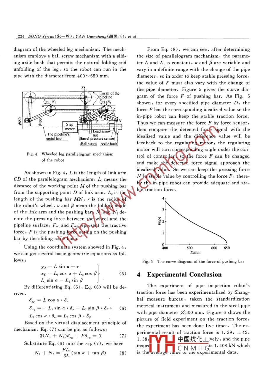 Journal of Shanghai Jiaotong University(Science), Vol E-10. No.3.2005.221-225Article ID:1007-1172(2005)03-0221-05Research on Oil/Gas In-pipe Inspection RobotSONG Yi-ran‘(宋一然), YAN GuO- zheng2(顏國正), XU Xiao-wun2(徐小云)1. Dept. of Electronic and Information Eng, Putian Univ., Putian 351100, China2. School of Electronic, Information and Electrical Eng., Shanghai Jiaotong Univ, Shanghai 200030)Abstract: A new type of in-pipe mobile robot was designed and developed on the basis of wheel in-pipe robot andcrawler in-pipe robot. The three sets of driving wheels circumferentially 120 apart in the cross section, both frontand rear driving wheels are distributed on the same parallelogram mechanism. The driving motor drives the threesets of driving wheels by worm couple, the regulating motor makes the three sets of driving wheels push againstthe pipe inwall with stable and adequate pressing force by the ball screw pair and pressure sensor, so the in-piptrobot can provide adequate and stable traction force. The robot mechanism is simple and small in size and workreliably. It is particularly suitable to the pipe with diameter 400-650 mm.Key words: in-pipe robot parallelogram machanism; pipe inspectionDocument code: AIntroductionsively against the wall of the pipe by springs andinkages. One typical approach is scissor-likeRecently pipe is used widely on the industry, structure with three wheels, one at the joint andagriculture and daily life. Natural gas and oil sup- the others at the end of the two limbsui].Thisply become one of the fundamental public services robot called MOGRER, has already commercialand its impact on the urban infrastructure is get- ized aimed at the application in the gas industry[ang larger. The urban oil/gas pipelines, as they Also, Fujiwara et aLta4l adopted similar approachare buried under the ground, are prone to external es. Kawaguchi et a/s) developed a mobile robotcorrosion usually derived by moisture and chemicalwith magnetic wheels which has special features inagent in soil, which causes material losses of thethe steering. Recently, hirose et al6) presented apipe wall. Also, cracks in the welded region andsummary of their works concerning various inpipethe damages from third parties such as construc-inspection robots developed themselves up to now.ion, electricity, sewage works are considered asone of the major reasons for pipeline failures. InThe robot to be presented in this paper hasthe inspection of urban gas pipelines, there are a three sets of driving wheel circumferentially 120lot of needs for autonomous inspection equipment apart in the cross section, the robot can providethat can run through inside the pipelinesadequate and stable traction force. Its mechanismUp to date, technology allows robots to be is simple and small in size and work reliably. It isbuilt small enough to go through pipelines with particularly suitable to pipe with pipe diameter 400mall diameter about 10 mm. Most of those sys-~650mm.tems have robots with drivve wheels pressed pas- 1 principle and structureof In-pipeReceived date: 2004-12-08RobotFoundation item: High Technology Research and DevelopmentFigure 1 gives the structure sketch of the in863) Programe of China( No2002AA442110): The Cooperative Fund of Pipe中國煤化工ure of pipe inspecYunnan Province and Shanghai JiaotongtionHmposed of lightingNiv. (No. 2001KABAAOOA025)CNMHGer, power supply,wE-mail,yong3090@yahoo.com.cnoptical fibre ringer, embedded computer, special222 NG Yi-ran(宋一然), YAN Guo-zheng(顏國正),etaloptical fibre and so on.the axile bush along the circle with 120 angle.The to-and-fro movement ofscrew nutaxial direction can drive the pushing bar do planemotion through the force sensor and theDriving wheelbush, the plane motion of the pushing barmake the parallelogram mechanism stretch or retrench so as to suit for the pipe with different di-ameter and to ensure the pipe robot wheels puagainst the pipe inwall with adequate pressingforce. The force sensor can indirectly measure thewheelpressing forobotinwall by checking the axial force between theFig 1 Setting drawing of the pipe inspection robotscrew nut and the axile bush, the detected forceLIghting lamp and) Wheeled leg( Specialsignal is compared with the expect value and theCCD cameramechanismoptical fibredifference value will be feedback to the regulatingmotor. Then the regulating motor will turn corre-sponding angle under the control of controller,sothe force F can be changed and make the detectedforce signal approach the idealized value and thepressing force between the robot wheels and thepipe inwall can approach the expect value also. Sothe robot can provide adequate and stable tractiond optical fibre ringer2 Design Main Pointsig. 2 The picture of pipe inspection robot2. 1 Geometric Constraints in PipelinesTypical configurations of pipelines are levelAs showed in Fig. 1, the in-pipe robot con- pipes, vertical pipes, elbows, branches, reducer,sists of two parts, one is for driving the robot, an- and valves. Most in-pipe robots can easily negoti-other is for regulating the parallelogram mecha- ate level pipe runs and can climb and descend pipesnism so the pressing force between the robot wheel with inclinations of 30 or less. Vertical pipe runsand pipe inwall can be adjustable. The moving for- are more difficult to achieve, and few robots todayward and back of the in-pipe robot can be accom- can perform this feat. Those pipeline configuraplished by the following processes the driving mo- tions gives geometric limitations and a robot shouldtor drives the worm which connects with the motor be designed to satisfy the limitations to traverseby holding screw, then the worm drives the three through pipelines successfully. among these, theworm wheels circumferentially 120 apart in the curvature of pipeline is the most important inforcross section. At last, the worm wheels drive the mation because the robot is caught when it is toorobot wheel throug