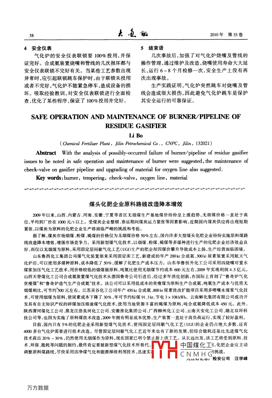 2010年2月大龜肥Feb. 2010第33卷第1期Large Scale Nitrogenous Fertilizer IndustryVol.33 No.1渣油氣化爐燒嘴及管線的安全操作與維護(hù).李波(中國石油吉林石化公司化肥廠,吉林, 132021)摘要通過對渣油氣化爐燒嘴及管線容易出現(xiàn)的故障進(jìn)行分析,提出燒嘴安全操作維護(hù)應(yīng)注意的事項,對氣化爐管線逆止閥維護(hù)及氧氣管線材質(zhì)升級提出建議。關(guān)鍵詞燒嘴回火逆止閥氧氣管線材質(zhì)1概述合成氨裝置自2003年投產(chǎn)以來,因為各種原渣油氣化爐有雙流道燒嘴和三流道燒嘴,目.因氣化爐燒嘴及其管線發(fā)生過爆管及過熱等事故前國內(nèi)渣油制氨廠“大部分采用雙流道燒嘴。中國3起,統(tǒng)計見表1。石油吉林石化公司化肥廠合成氨裝置渣油氣化爐氧氣汽一置采用德士古技術(shù),燒嘴為三流道燒嘴。三流道燒嘴主要特點是:①負(fù)荷適應(yīng)范圍大,為50% ~140%,由于內(nèi)噴頭、外噴頭端部齊平,能適應(yīng)負(fù)荷的變動而無須調(diào)節(jié)噴嘴的空間,操作方便;②三流氧飽鄭床二--冷卻水道燒嘴出口流從中心管依次為氧氣- -蒸汽、渣油一蒸汽 氧氣-蒸汽,物流在燒嘴出口湍流形成旋渦相互剪切交叉,再靠氧一蒸汽與油一蒸汽的速度差,使3種物流充分混合并使渣油均勻霧化。燒嘴結(jié)構(gòu)如圖1。.圖1燒嘴結(jié)構(gòu)示意表13次事故的情況統(tǒng)計時間.事故結(jié)果事故原因2003-06-091氣化爐中心氧管線爆管1*氣化爐中心氧流量調(diào)節(jié)閥失電關(guān)閉,但中心氧蒸汽吹掃切斷閥未打開.爐內(nèi)煤氣回火,中心氧管受熱變形,強(qiáng)度降低,爆管2003-12-312*氣化爐蒸汽管線爆管|"氣化爐高壓蒸汽外界原因中斷,氣化爐蒸汽流量低低聯(lián)鎖不好用.氣化爐未停車,爐內(nèi)煤氣回火,造成氣化爐蒸汽管線過熱爆管200606-032*氣化爐燒嘴燒損,氧管線變形儀表PIC系統(tǒng)斷電,DCS通訊中斷,氣化爐燒嘴冷卻水出入口閥關(guān)閉,造成燒嘴燒損,氧管線過熱變形為保證氣化爐正常生產(chǎn),針對發(fā)生的3起事另一側(cè)的現(xiàn)象,其原因除爐磚損壞導(dǎo)致外,就是燒故并吸取兄弟單位生產(chǎn)經(jīng)驗教訓(xùn),總結(jié)分析了渣嘴 各流道不同心造成火焰向-側(cè)偏流所致。三流油氣化爐燒嘴及其管線容易出現(xiàn)的故障,提出了道燒嘴的外噴頭與中噴頭環(huán)縫間隙為6.58mm土安全操作維護(hù)上應(yīng)注意的事項。0.33mm,中噴頭與內(nèi)噴頭環(huán)縫間隙為10.48mm士2氣化爐燒嘴花”20102-01。中國煤化工林省吉林市人,工程定期對氣化爐燒嘴進(jìn)行維修,燒嘴生產(chǎn)出現(xiàn)師.1994|YHC N M H G任中國石油吉林石異常時要及時進(jìn)行調(diào)節(jié)?;净蕪S合成氨車間設(shè)備主任。聯(lián)系電話: 043263972282;氣化爐運行中會出現(xiàn)爐壁--側(cè)溫度明顯高于E-mail: jh_ Lbol @ petrochina. com. cn。第1期李波. 渣油氣化爐燒嘴及管線的安全操作與維護(hù);70.05mm,各環(huán)縫間隙公差要求非常嚴(yán)格,如超差成管線或燒嘴過熱爆管,這與氧氣、渣油、蒸汽則會造成氧氣向一側(cè)偏流,使得該側(cè)爐壁溫度偏三物料人爐管線逆止閥不嚴(yán)密有很大關(guān)系。氣化高,對氣化爐安全運行不利,同時也會造成燒嘴損爐突然跳車,如果物料入爐逆止閥不嚴(yán)密,會造壞。調(diào)整各流道環(huán)縫間隙的方法,首先要檢查各成爐內(nèi)1200~ 1350C的煤氣回火反竄到人爐管線流道管線直線度是否合格,如果彎曲則需要校直,內(nèi),導(dǎo)致管線過熱,嚴(yán)重時管線或燒嘴爆炸著否則不能保證各流道同心。其次是調(diào)整各流道連火。為避免此類事故發(fā)生,每次停爐檢修時都要接法蘭間隙,通過調(diào)節(jié)緊固螺栓預(yù)緊力來保證各對三物料的逆止閥進(jìn)行拆檢、試壓,保證其嚴(yán)密流道噴頭同心。性。另外,靠近氣化爐的最后一道氧氣逆止閥材氣化爐投料后爐壁上部出現(xiàn)超溫現(xiàn)象,是因質(zhì)最好選用耐高溫的Inconel 600合金,這樣可以投料后操作壓力變化,燒嘴火焰不穩(wěn)定,造成黑區(qū)防止因逆止閥高溫變形造成閥門不嚴(yán)密。和剛性火焰長度變化,氣化爐燒嘴火焰黑區(qū)短,火人氣化爐氧氣管線材質(zhì)及壁厚等級要升級。焰靠近上部燃燒,使氣化爐上部磚縫膨脹,氣體竄如果氣化爐氧氣管線壁厚偏薄,管線則易變形、氣,造成爐壁過熱。解決辦法是穩(wěn)定壓力,控制好破裂。人氣化爐中心氧氣管線直徑為38. 1 mm,燒嘴氧油比,同時可以適當(dāng)增加氧氣的蒸汽配比,壁厚設(shè)計為3.68mm;人氣化爐主氧氣管線直徑降低爐內(nèi)反應(yīng)溫度。如果氣化爐持續(xù)高溫得不到為76.2mm,壁厚設(shè)計為5.49 mm。氣化爐跳車,改善,就會造成燒嘴噴頭燒損,出現(xiàn)端部圓周上1氣化爐內(nèi)氣體反竄到氧氣管線中,在高溫氣體作~ 2mm深度的鋸齒形缺損,嚴(yán)重時深度可達(dá)5~用下,氧管線出現(xiàn)變形甚至破裂著火。2006年10mm,造成氧、渣油混合不均勻形成近路燃燒,加裝置大修時,對氣化爐中心氧管線及主氧管線進(jìn)重氣化爐爐壁超溫,此時應(yīng)停車對燒嘴進(jìn)行檢修。行了更換,管線壁厚分別提到7.14mm 和氣化爐正常生產(chǎn)時,如果出現(xiàn)燒嘴冷卻水溫11.13mm。另外,氣化爐氧氣管線材質(zhì)選擇不度、壓力突然變大,流量突然減小,以致氣化爐跳當(dāng),管線也很容易出現(xiàn)裂紋。合成氨裝置氣化