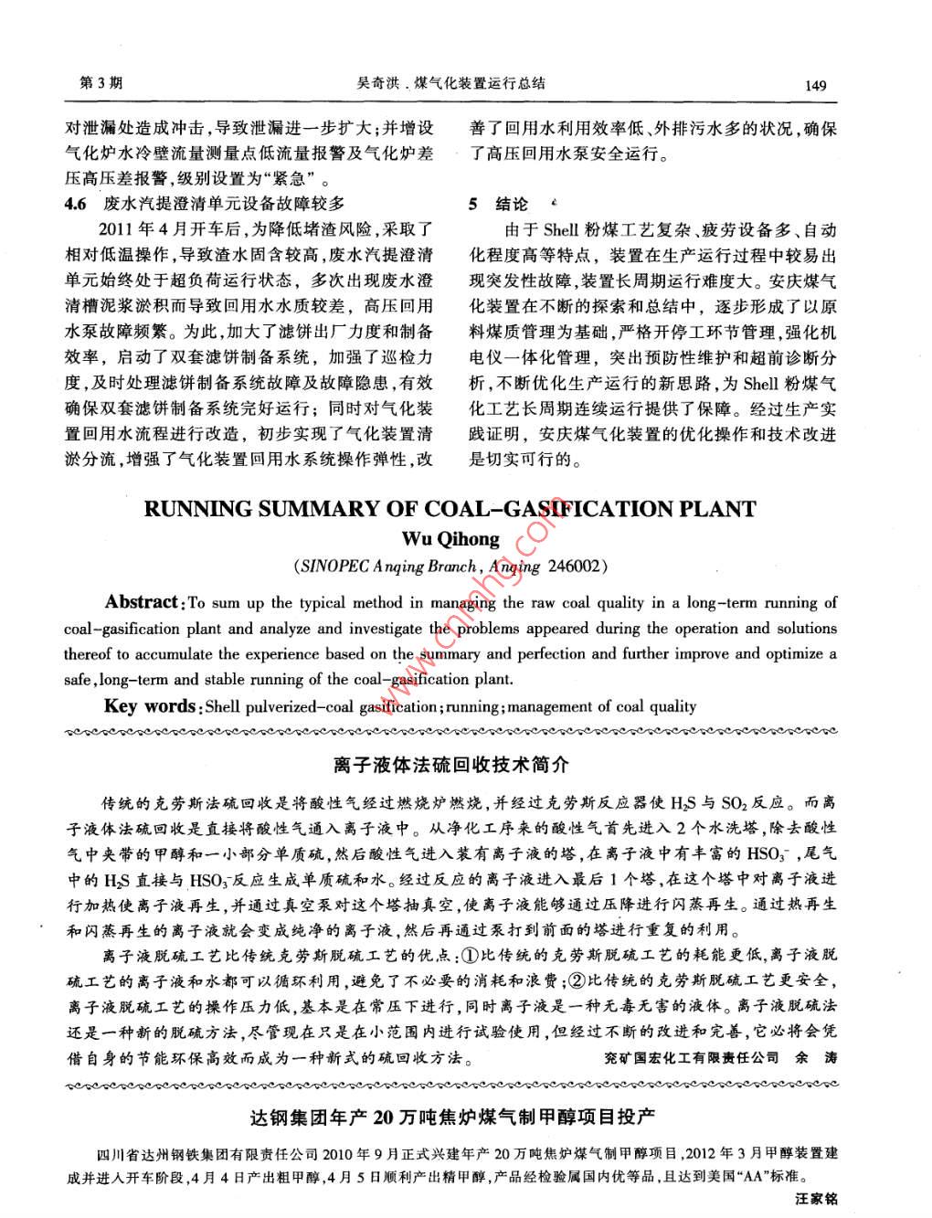 2012年6月大氛限Jun.2012 .第35卷第3期Large Scale Nitrogenous Fertilizer IndustryVol.35 No.3煤氣化裝置運行總結(jié)吳奇洪(中國石化安慶分公司,安徽安慶246002)摘要:總結(jié)煤氣化裝置長周期運行中原料煤的煤質(zhì)管理等典型做法,分析和探討運行過程中出現(xiàn)的問題及解決揩施,力求在總結(jié)、完善的基礎(chǔ)上積累經(jīng)驗,進--步改進和優(yōu)化煤氣化裝置的安穩(wěn)長運行。關(guān)鍵詞:Shell粉煤氣化運行煤質(zhì)管理中國石化安慶分公司煤氣化裝置(以下簡稱壓及輸送、煤氣化及合成氣冷卻、除渣、干法除灰、“安慶煤氣化裝置")自2006年11月18日一次投濕法洗滌、廢水汽提及澄清、配套公用工程等單元產(chǎn)成功以來,在近5a的時間里不斷學(xué)習(xí)探索、借且成。鑒和總結(jié),通過加強原料煤質(zhì)量及裝置運行管理,關(guān)鍵設(shè)備Shell 氣化爐為水冷壁型式,內(nèi)壁布強化機電儀管操一體化管理和操作優(yōu)化,開展針有水冷卻管,副產(chǎn)部分蒸汽。操作時壁內(nèi)形成一層對性的技術(shù)攻關(guān),實現(xiàn)了煤氣化裝置的安穩(wěn)長運渣,用“以渣抗渣”方式保護襯里不受侵蝕。Shell煤行。2011年裝置自4月6日21:23投料恢復(fù)生產(chǎn)氣化裝置能力大,氣化壓力為3.5~4.0MPa,單爐日至9月6日0:57裝置計劃停車,實現(xiàn)A級連續(xù)運處理煤量達2000t,設(shè)計有效合成氣(以CO+H2行153d,刷新了由荷蘭NUON工廠2006 年創(chuàng)造計)142000m2/h。的137.2d殼牌煤氣化裝置連續(xù)運行最長記錄,創(chuàng)1.3煤種 使用情況造了當(dāng)期單爐煤氣化裝置運行最好紀(jì)錄。安慶煤氣化裝置設(shè)計煤種為皖北劉二礦煤,設(shè)計耗煤量為2000t/d.煤氣化裝置經(jīng)過近5a時1安慶煤氣化裝 置概況間的運行實踐證明,人爐煤質(zhì)穩(wěn)定是Shell煤氣化1.1 “油改煤”工程概況裝置長周期運行的關(guān)鍵。由于目前使用的單一煤中國石化安慶分公司化肥廠在經(jīng)歷原料“油種尚不能滿足煤氣化裝置的穩(wěn)定運行需要,則根改煤”改造前,采用20世紀(jì)70年代從法國赫爾蒂據(jù)煤種特性進行了合理的混配,以保證人爐煤的公司引進的托普索工藝,至90年代末期,雖經(jīng)多質(zhì)量要求。安慶煤氣化裝置自2006年投料運行次改造,但以輕油為原料路線的合成氨工藝已逐以來使用煤種及配煤的情況見表1。漸成為了企業(yè)發(fā)展的瓶頸。因此,啟動了中國石化從實際運行情況看,自2010年安慶煤氣化裝安慶分公司化肥原料結(jié)構(gòu)調(diào)整及煉油化工資源優(yōu)置開始使用低硫煤與高硫煤1:1人工配煤后,氣化化項目(簡稱“油改煤”工程)?!坝透拿?工程包括爐人爐煤質(zhì)趨于穩(wěn)定,氣化爐堵渣情況明顯減少。日處理煤炭能力2000t的Shell煤氣化裝置、凈化其中2010 年煤氣化裝置實現(xiàn)B類連續(xù)運行110裝置及當(dāng)時國內(nèi)最大的國產(chǎn)化空分裝置等3套核d,2011年實現(xiàn)A類連續(xù)運行153d。心裝置。1.4 總體運行情況1.2氣化工藝技術(shù)簡介安慶煤氣化裝置自2006年投料成功以來,通安慶煤氣化裝置采用的是Shell粉煤加壓氣收稿日期:2012-01-10;收到修改稿日期:2012-03-28。化技術(shù)(簡稱SCGP),屬加壓氣流床氣化,是以干作者簡介:吳奇洪,女,1977年7月出生,工程師,1999年華東煤粉為原料、純氧為氣化劑,進料采用氮氣加壓輸冶金學(xué)院化I系化工工藝專業(yè)畢業(yè),現(xiàn)就職于中國石化安慶分公司送、液態(tài)排渣的工藝,主要由磨煤及干燥、粉煤加化肥部。聯(lián)系電話:0556-5381991 :E- -mial: wuqh.aqsh@sinopec.com.1462012年第35卷過不斷摸索和優(yōu)化,裝置整體運行狀況有了較大改善,連續(xù)運行水平逐步提高,運行情況見表2。表1安慶煤氣化裝置原料煤及煤種 使用情況時間采購原料煤種氣化爐人爐原料煤種配煤方式2006低硫煤: 皖北劉二礦煤皖北劉二礦煤無2007 低硫煤 :皖北劉二礦煤,皖北百善煤皖北劉二礦煤,皖北百善煤2008低硫煤:皖北劉二礦煤 ,皖北百善煤;皖北劉二礦煤,皖北百善煤,云南鎮(zhèn)雄煤,皖北劉二礦煤與云南鎮(zhèn)雄煤1:1,人工配煤商硫煤:云南鎮(zhèn)雄煤,四川龍泉煤皖北百善煤與四川龍泉煤1:1,云南鎮(zhèn)雄煤、四川龍泉煤、皖北劉二礦煤122009低硫煤 :皖北劉二礦煤,皖北百善煤;皖北劉二礦煤與云南鎮(zhèn)雄煤 1:1,皖北劉二礦煤與云南鎮(zhèn)雄煤2:1 ,皖北劉二機械配煤高硫煤:云南鎮(zhèn)雄煤礦煤,皖北百善煤與云南鎮(zhèn)雄煤1:1,云南鎮(zhèn)雄煤、四川龍泉煤、皖北劉二礦煤1:12010 低硫煤:皖北劉二礦煤,皖北劉一礦皖北劉二礦煤與云南玉安鎮(zhèn)雄煤1:1,皖北劉一礦煤與云南玉安鎮(zhèn)雄煤1:1,人工配煤煤;高硫煤:云南玉安鎮(zhèn)雄煤,云南日皖北劉一礦 煤與云南日源鎮(zhèn)雄煤1:1源鎮(zhèn)雄煤2011 低硫煤 :皖北劉一礦煤;高硫煤:云南皖北劉一礦煤與云南玉安鎮(zhèn)雄煤 1:1,皖北劉- -礦煤與云南日源鎮(zhèn)雄1:煤人工配煤玉安鎮(zhèn)雄煤,云南日源鎮(zhèn)雄煤表2安慶煤氣化裝運行情況較大。A類最長連續(xù)B類最長連續(xù)年運轉(zhuǎn)率,%氧負荷率,%表32010- -2011 年安慶煤氣化裝置停車原因統(tǒng)計運行時間/d_運行時間/d停車停車年度停車200686性質(zhì)次數(shù)停車原因次數(shù)20074(48.92010 工藝4氣化爐堵渣3次;激冷氣壓縮機12進口壓差高1次2008537967.126620098261.02>設(shè)備 2激冷氣壓縮機三通磨穿;空分膨脹機旁