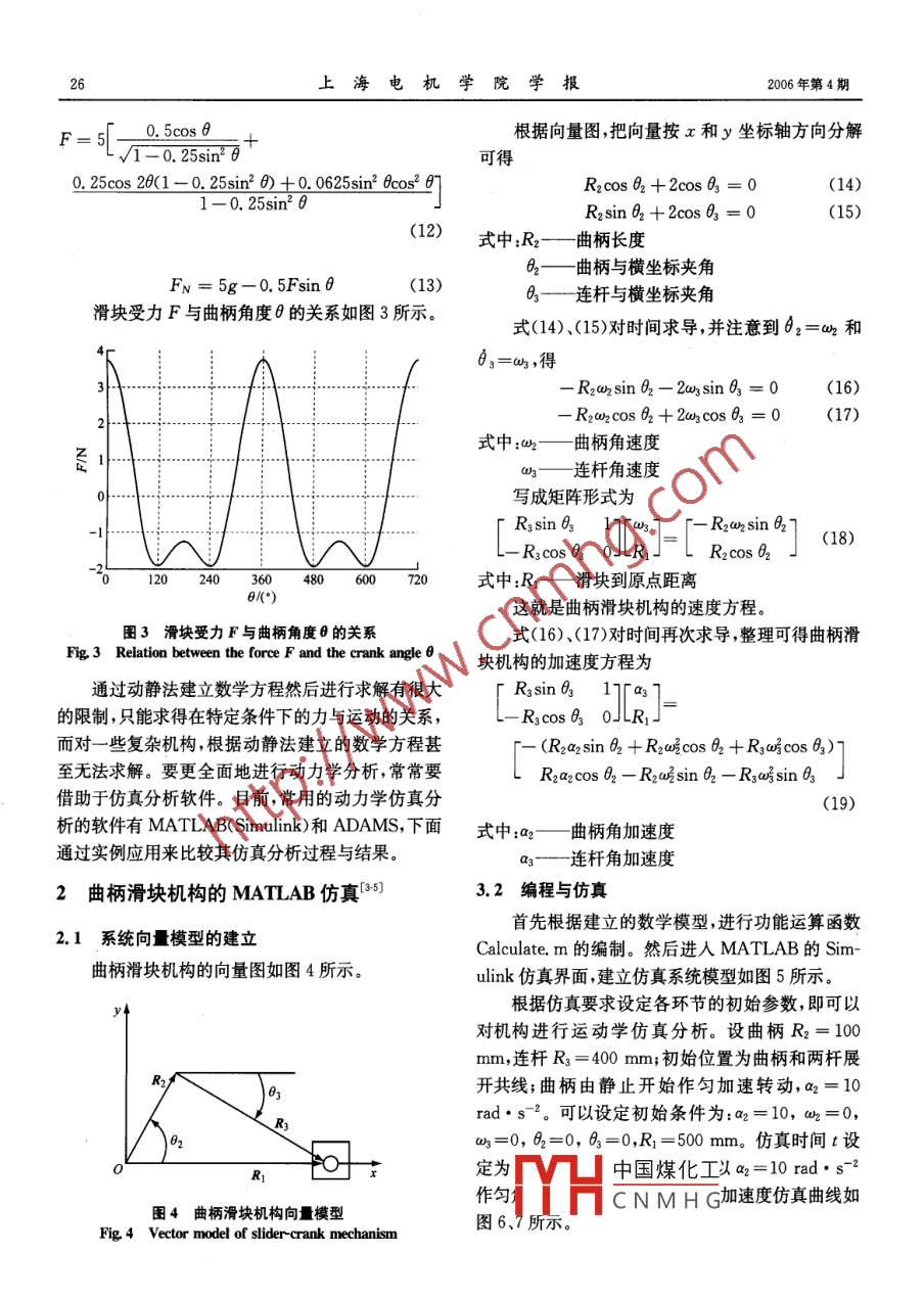 第9卷第4期上海電機(jī)學(xué)院學(xué)報(bào)VoL 9 No. 42006年8月URNAL OF SHANGHAI DIANJI UNIVERSITY文章編號1671-2730(2006)04002405曲柄滑塊機(jī)構(gòu)動(dòng)力學(xué)研究劉俊上海電機(jī)學(xué)院機(jī)械學(xué)院,上海,200245)摘要介紹了機(jī)械動(dòng)力學(xué)理論基礎(chǔ)與研究方法,用動(dòng)靜法進(jìn)行了曲柄滑塊機(jī)構(gòu)的動(dòng)力學(xué)求解。建立了曲柄滑塊機(jī)構(gòu)的數(shù)學(xué)模型,以矩陣實(shí)驗(yàn)室( Matrix Laboratory, MATLAB)(仿真鏈接 Simulink)機(jī)械系統(tǒng)自動(dòng)動(dòng)力學(xué)分析( Automatic Dynamic Analysis of Mechanical Systems, ADAMS)為研究平臺,進(jìn)行了仿真比較,探索了機(jī)構(gòu)的動(dòng)力分析和彈性動(dòng)力分析方法。關(guān)鍵詞曲柄滑塊機(jī)構(gòu);動(dòng)力學(xué);仿真;矩陣實(shí)驗(yàn)室;機(jī)械系統(tǒng)自動(dòng)動(dòng)力學(xué)分析中圖分類號TH113文獻(xiàn)標(biāo)識碼AA Study of the Dynamic of Slider-crank MechanismLiu jr(School of Mechanical Engineering, Shanghai Dianji University, Shanghai, 200245)Abstract The basic theory of mechanical dynamics and its method of studying are introduced.Then kineto-static analysis is used to get the numerical resolution of the slider-crank mechanism. Af-ter building the vector model of the slider-crank mechanism, simulation comparison is carried outbased on MATLAB(Simulink) and ADAMS, and the method of dynamic analysis and elasto-dynamicanalysis are probed into.Key words slider-crank mechanism; dynamics; simulation; MATLAB; automatic dynamic analsis of mechanical systems為適應(yīng)現(xiàn)代機(jī)械的高速化、輕量化、精密化和自受有理想約束的質(zhì)點(diǎn)系在運(yùn)動(dòng)過程中,其上所動(dòng)化,機(jī)械動(dòng)力學(xué)在過去二三十年間得到了迅速的受的主動(dòng)力和慣性力在質(zhì)點(diǎn)系的任何虛位移上所作發(fā)展。在機(jī)械動(dòng)力學(xué)發(fā)展過程中,先后形成4種的虛功之和為零這就是動(dòng)力學(xué)普遍方程式。即分析方法,即靜力分析、動(dòng)態(tài)靜力分析(動(dòng)靜法)、動(dòng)力分析和彈性動(dòng)力分析。這些分析方法有著不同的(F)·8r;=0(1)基本假定,代表著不同時(shí)期所達(dá)到的分析水平式中:F—作用于質(zhì)點(diǎn)的主動(dòng)力牛頓運(yùn)動(dòng)第二定律是研究動(dòng)力學(xué)的基礎(chǔ),拉格慣性力朗日方程是分析力學(xué)的核心內(nèi)容。中國煤化工CNMHG收稿日期:200603-17作者簡介:劉俊(1971-),女,副教授,專業(yè)方向:機(jī)械設(shè)計(jì)及理論。2006年第4期劉俊:曲柄滑塊機(jī)構(gòu)動(dòng)力學(xué)研究拉格朗日方程是動(dòng)力學(xué)普遍方程在廣義坐標(biāo)下如圖1所示,設(shè)OA=R=0.5m,AB=L的表現(xiàn)形式1m,O=at,a=1m·s-2,滑塊的質(zhì)量m=5kg,忽aTQ(=1,2,…,k)(2)略摩擦和桿AB的質(zhì)量,試求作用于滑塊B上的力隨θ的變化規(guī)律。選滑塊B為研究對象,其受力圖如圖2所示根據(jù)動(dòng)靜法原理滑塊平衡方程為式中:m;質(zhì)點(diǎn)質(zhì)量Fi+F+FN+mg =0(5)v—質(zhì)點(diǎn)速度式中:FT—質(zhì)點(diǎn)系的動(dòng)能q廣義坐標(biāo)Q—?jiǎng)菽芮瑝K機(jī)構(gòu)(見圖1)是機(jī)械系統(tǒng)常見典型機(jī)構(gòu)。對曲柄滑塊機(jī)構(gòu)進(jìn)行動(dòng)力學(xué)研究,可以揭示曲柄滑塊機(jī)構(gòu)連桿、滑塊的運(yùn)動(dòng)規(guī)律,也為其他機(jī)構(gòu)的動(dòng)力學(xué)設(shè)計(jì)、研究提供參考方法。本文以MATLAB、 Simulink、 ADAMS為研究平臺,分析了機(jī)械圖2滑塊受力圖Fig 2 Forces applied to the slider動(dòng)力學(xué)的理論基礎(chǔ),建立了曲柄滑塊機(jī)構(gòu)數(shù)學(xué)模型,進(jìn)行了數(shù)學(xué)求解與 MATLAB與 ADAMS仿真。選取直角坐標(biāo)系Oxy(見圖1),將式(5)分別在x,y軸上投影,可得muI =-Fcosmy=Fsin Frx=Rcos0+√D2-Rsin26(7)R2 usin Acosθ(8)r=- cos 8圖1曲柄滑塊機(jī)構(gòu)示意圖Fig 1 Sketch of slider-crank mechanismR2a cos 20(L2-R2sin?0)+R'o? Bcos2 81曲柄滑塊機(jī)構(gòu)的動(dòng)靜法求解2將式(9)代人式(5),并利用幾何關(guān)系:動(dòng)靜法是求解非自由質(zhì)點(diǎn)和質(zhì)點(diǎn)系統(tǒng)動(dòng)力學(xué)問RRsin e題的普遍方法,動(dòng)靜法以達(dá)朗貝爾原理為基礎(chǔ),假想sin g, sin pp在質(zhì)點(diǎn)或質(zhì)點(diǎn)系統(tǒng)上施加慣性力,然后應(yīng)用靜力學(xué)與靜力學(xué)寫平衡方程的方法,求解動(dòng)力學(xué)問題。達(dá)朗貝爾原理:質(zhì)點(diǎn)系運(yùn)動(dòng)的每一瞬時(shí),作用于系內(nèi)每可求得個(gè)質(zhì)點(diǎn)上的主動(dòng)力約束力和質(zhì)點(diǎn)的慣性力構(gòu)成一F=md「-Ro°cs0+L2-R sin20平衡力系。設(shè)質(zhì)點(diǎn)系由n個(gè)質(zhì)點(diǎn)組成,其中質(zhì)量為m2的質(zhì)點(diǎn)在主動(dòng)力F和約束力FN的作用下運(yùn)動(dòng)R2a cos 20(L2-R' sin20)+Ra sin2Bcos'sin2 8則有(10)F1+FN+F=0(i=1,2,…,n)(4)中國煤化工sin6(11)式中:F——主動(dòng)力FN——約束力將HCNMHFk—慣性力1m·s-2,m=5kg代入,得上海電機(jī)學(xué)院學(xué)報(bào)2006年第4期F5cos 8根據(jù)向量圖,把向量按x和y坐標(biāo)軸方向分解0.25sin26可得0.25c0s26(1-0.25sin26)+0.0625sn2bos26R2 cos 82+2cos 83=0(14)0.25sin2R2 sin 82+2cos B3=0(15)(12)式中R2曲柄長度62—曲柄與橫坐標(biāo)夾角FN=5g-0. 5Fsin 83連桿與橫坐標(biāo)夾角滑塊受力F與曲柄角度6的關(guān)系如圖3所示。式(14)、(15)對時(shí)間求