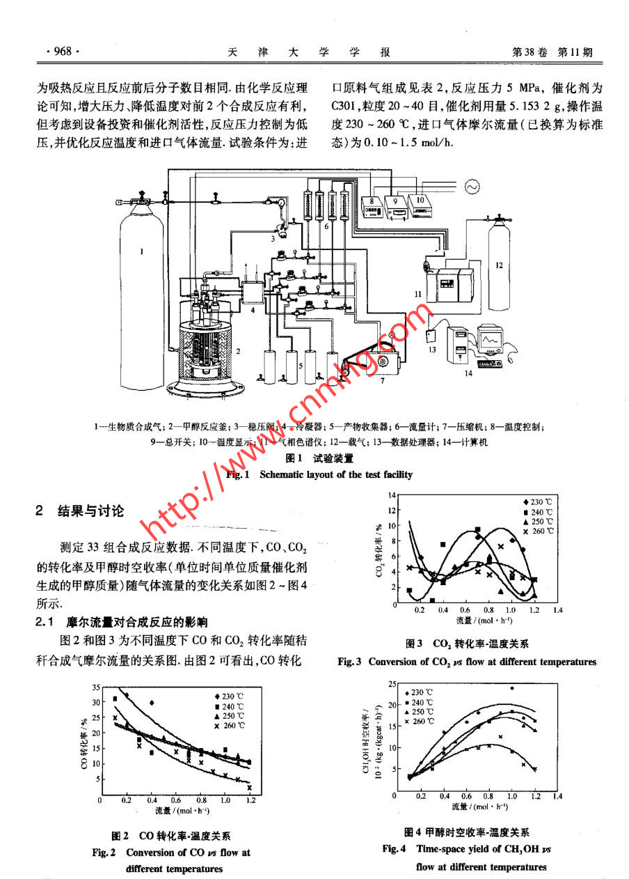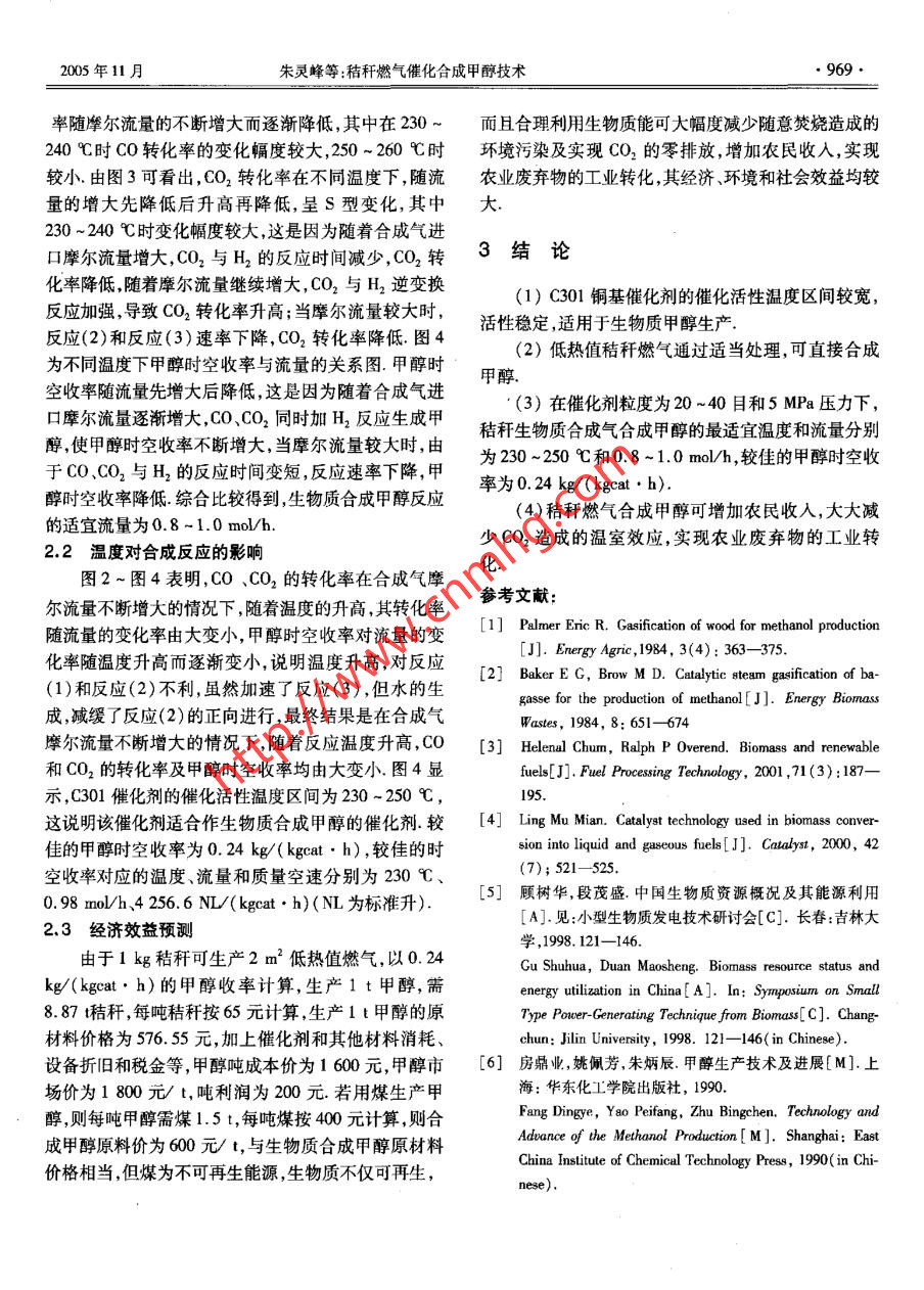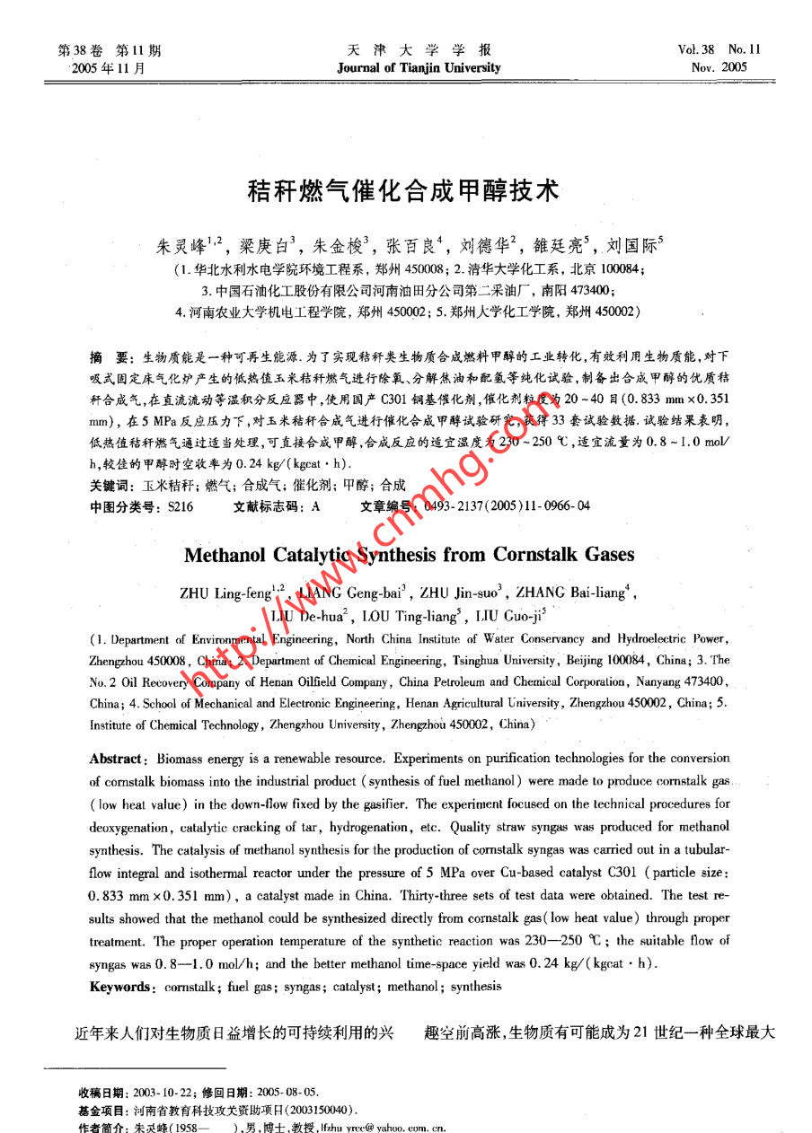 第38卷第11期天津大學(xué)學(xué)報(bào)Vol. 38 No. 112005年11月Journal of Tianjin UniversityNov. 2005秸稈燃?xì)獯呋铣杉状技夹g(shù)朱靈峰'2,梁庚白’,朱金梭”,張百良,劉德華”,雒廷亮’,劉國(guó)際(1.華北水利水電學(xué)院環(huán)境工程系,鄭州450008; 2.清華大學(xué)化工系,北京100084;3.中國(guó)石油化工股份有限公司河南油田分公司第二采油廠,南陽(yáng)473400;4.河南農(nóng)業(yè)大學(xué)機(jī)電工程學(xué)院,鄭州450002; s.鄭州大學(xué)化工學(xué)院,鄭州450002)摘要:生物質(zhì)能是一種可再生能源.為了實(shí)現(xiàn)秸稈類生物質(zhì)合成燃料甲醇的工業(yè)轉(zhuǎn)化,有效利用生物質(zhì)能,對(duì)下吸式固定床氣化爐產(chǎn)生的低熱值玉米秸稈燃?xì)膺M(jìn)行除氧、分解焦油和配氫等純化試驗(yàn),制備出合成甲醇的優(yōu)質(zhì)秸稈合成氣,在直流流動(dòng)等溫積分反應(yīng)器中,使用國(guó)產(chǎn)C301銅基催化劑,催化劑粒度為20 -40目(0. 833 mm x0. 351mm),在5 MPa反應(yīng)壓力下,對(duì)玉米秸稈合成氣進(jìn)行催化合成甲醇試驗(yàn)研究,獲得33套試驗(yàn)數(shù)據(jù).試驗(yàn)結(jié)果表明,低熱值秸稈燃?xì)馔ㄟ^(guò)適當(dāng)處理,可直接合咸甲醇,合成反應(yīng)的適宜溫度為230 ~250心,適宜流量為0.8-1. 0 mol/h,較佳的甲醇時(shí)空收率為0. 24 kg/(kgcat●h).關(guān)鍵詞:玉米秸稈;燃?xì)?合成氣;催化劑;甲醇;合成中圖分類號(hào): S216文獻(xiàn)標(biāo)志碼: A文章編號(hào): 0493- 2137(2005)11- 0966- 04Methanol Catalytic Synthesis from Cornstalk GasesZHU Ling-feng'2, LIANG Geng-bai' , ZHU Jin-suo ,ZHANG Bai-liang,LIU De-hua2 , L0U Ting liang' , IJU Cuo-ji'(1. Department of Environmental Engineering, North China Institute of Water Conservancy and Hydroelectric Power,Zhenghou 450008 , China; 2. Department of Chemical Engneering, Tsinghua University, Beijing 10084, China; 3. TheNo.2 Oil Recovery Company of Henan Oilfeld Company , China Petroleum and Chenical Corporalion, Nanyang 473400,China; 4. School of Mechanical and Electronic Engineering, Henan Agricultural University , Zhengzhou 450002 , China; 5. .Institute of Chemical Technology , Zhengzhou Univensity , Zhengz.hou 450002 , China)Abstract: Biomass energy is a renewable resource. Experiments on purification technologies for the conversionof cornstalk biomass into the industrial product ( synthesis of fuel methanol ) were made to produce cormnstalk gas .( low heat value) in the down-flow fixed by the gasifier. The experinent focused on the technical procedures fordeoxygenation, catalytie cracking of tar, hydrogenation, etc. Quality straw syngus was produced for methanolsynthesis. The catalysis of methanol synthesis for the production of cormstalk syngas was carried out in a tubular-flow integral and isothermal reactor under the pressure of 5 MPa over Cu-based catalyst C301 ( particle size:0. 833 mmx0.351 mm), a catalyst made in China. Thirty-three sets of test data were obtained. The test re-sults showed that the methanol could be synthesized directly from cornstalk gas( low heat value ) through propertreatment. The proper operation temperature of the synthetic reaction was 230- -250 C; the suitable flow ofsyngas was 0. 8-1.0 mol/h; and the better methanol time -space yield was 0.24 kg/(kgcat . h).Keywords: cornstalk; fuel gas; syngas; catalyst ; methanol ; synthesis近年來(lái)人們對(duì)生物質(zhì)日益增長(zhǎng)的可持續(xù)利用的興趣空 前高漲,生物質(zhì)有可能成為21世紀(jì)- -種全球最大收稿日期; 2003- 10-22;修回日期: 2005- 08-05.基金項(xiàng)目:河南省敦育科技攻關(guān)資助項(xiàng)日(2003150040).作者簡(jiǎn)介:朱滅峰( 1958-).男,博士,教授,lbhu yrvc@ yuhoo. com. cn.2005年11月朱靈峰等:秸稈燃?xì)獯呋铣杉状技夹g(shù)●967的可再生潔凈能源.為了有效地減少化石燃料造成的我國(guó)處于空白,為此有必要開(kāi)展此項(xiàng)研究工作.環(huán)境污染,減緩世界能源危機(jī),有必要建立大規(guī)模的現(xiàn)代生物能系統(tǒng)工程.秸稈類生物質(zhì)燃?xì)獯呋铣杉状?試驗(yàn)部分研究是現(xiàn)代生物能系統(tǒng)工程之-一.發(fā)達(dá)國(guó)家早在10年前就開(kāi)展技術(shù)攻關(guān)研究1-41 , 現(xiàn)已有生物質(zhì)甲醇廠生1.1 試驗(yàn)樣品產(chǎn)運(yùn)營(yíng).我國(guó)是一個(gè)農(nóng)業(yè)大國(guó),每年生產(chǎn)約6x108 t農(nóng)1.1.1 生物質(zhì)原料氣的制備作物秸稈[5] ,這些生物質(zhì)僅有少部分用于做飯、取暖試驗(yàn)所用原料為河南新鄭市當(dāng)年新收獲的玉米秸或低效率的電力生產(chǎn),大多數(shù)被廢棄或隨意焚燒,造成稈,秸稈粉碎至3 cm左右,經(jīng)XFF-1000型生物質(zhì)氣化嚴(yán)重的資源浪費(fèi)和環(huán)境污染.生物質(zhì)合成甲醇技術(shù)在機(jī)組生產(chǎn)出低熱值生物質(zhì)原料氣,其組成見(jiàn)表1.表1 生物質(zhì)氣分析數(shù)據(jù)Tab.1 Analysis data of biomass gas| 4(CO) | e(CO2)4(H2)φ(CH4)φ(02)中(G2H)| o(CH)| q(C2H2)φ(N2)低熱值/焦油//%/% :(kJ.m3) (mng.m-3)15.80| 12.5012. 601.402.070. 500.100.0355.005 8731.1.2生物質(zhì)合成氣的制備1.3試驗(yàn)催化劑由于原料氣中含有少量使甲醇合成催化劑失活的選用C301國(guó)產(chǎn)銅基催化劑,先將圓柱形催化劑氧氣和焦油,所以試驗(yàn)前必須除去由表1可知,原料研磨成粒度為20~40目的顆粒,烘干,冷卻至室溫,稱氣中H2含量太低,不能滿足合成要求的理論碳?xì)浔?重,再將5其等體積同粒度的石英砂混合均勻在催化因此,在實(shí)驗(yàn)室中先將秸稈原料氣進(jìn)行脫氧、除焦、