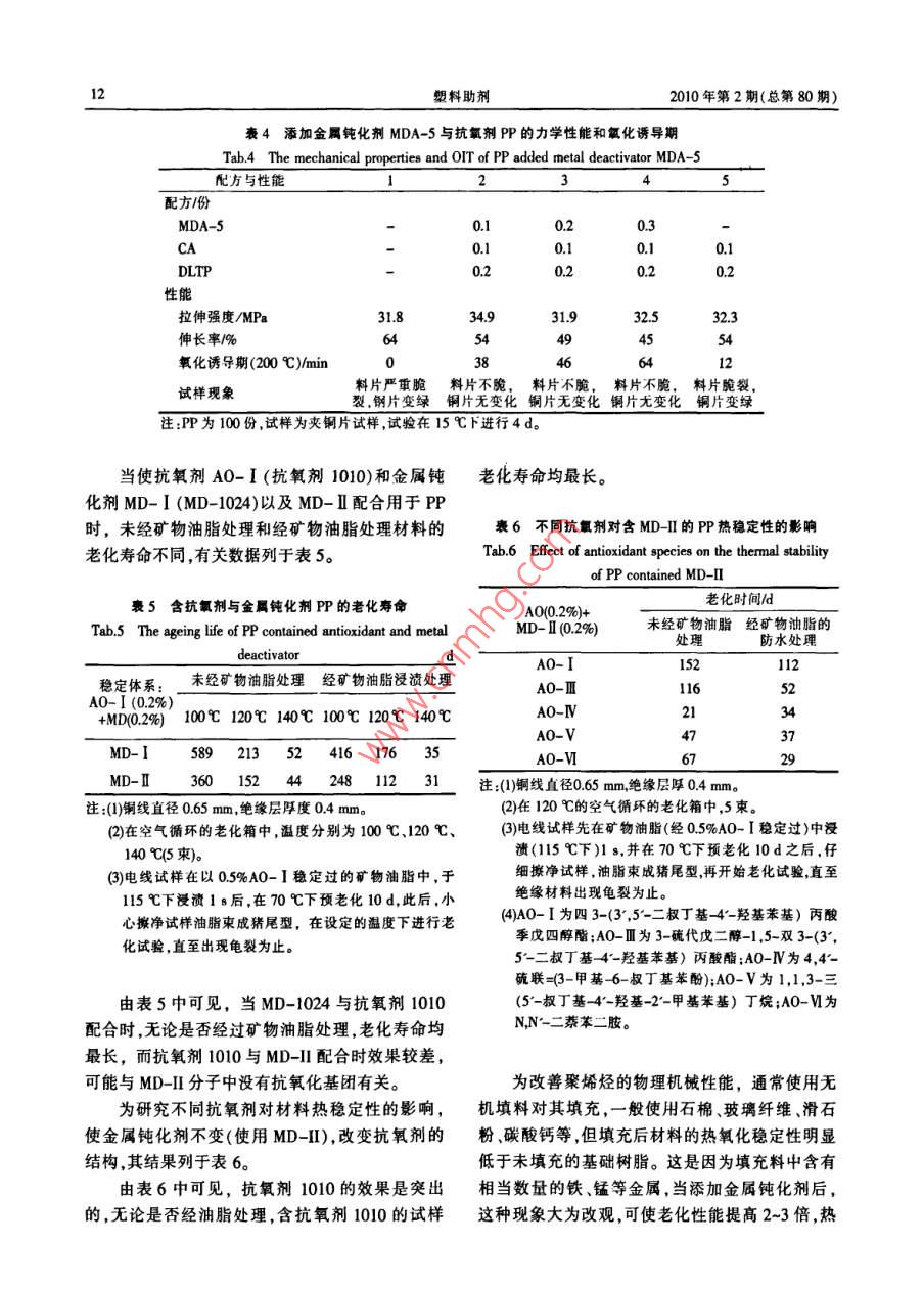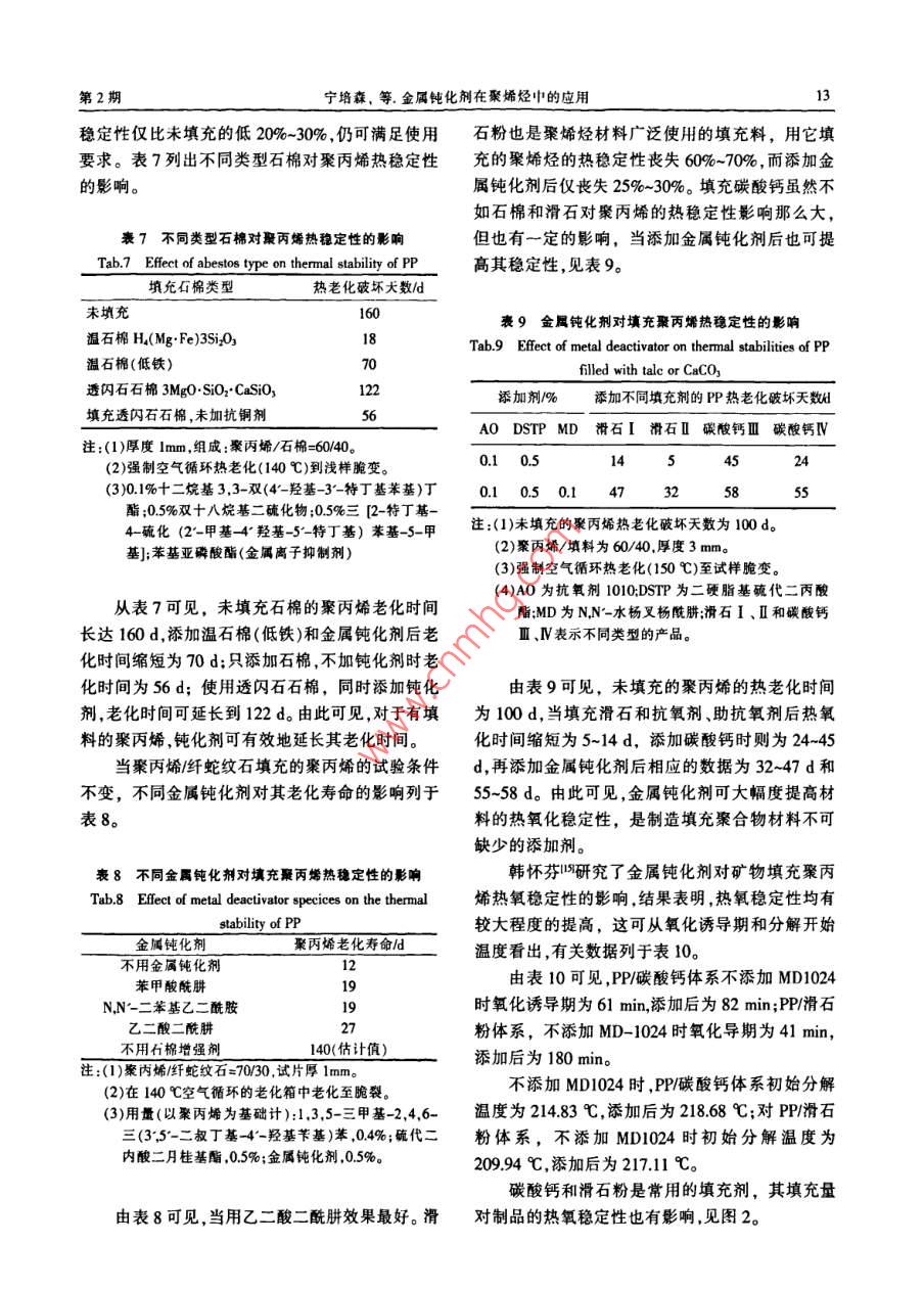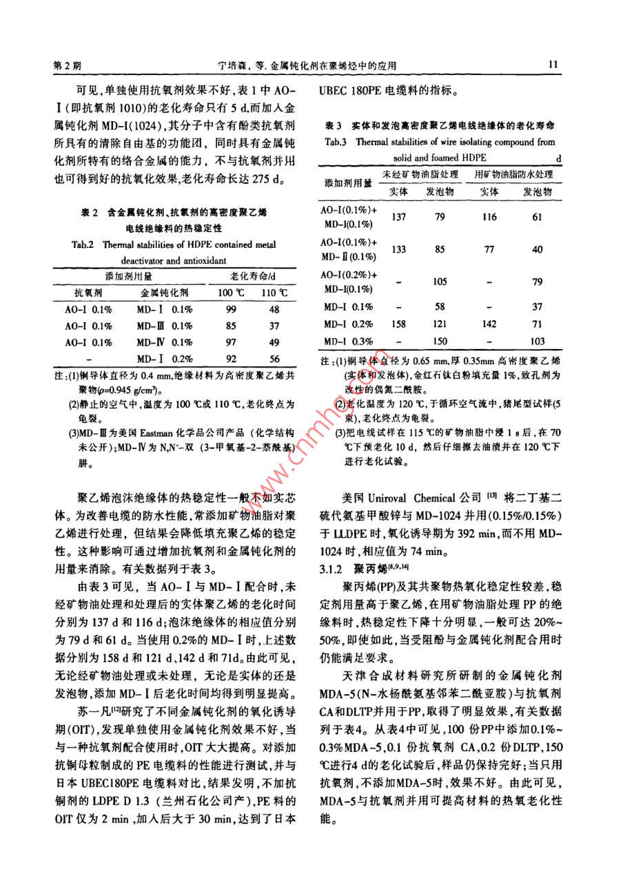 10塑料助劑2010年第2期(總第80期)或同時(shí)存在羥基、羧基、酰胺基等功能團(tuán),具有多.2,6-二叔丁基苯酚、丙烯酸甲酯、草酸二乙酯及乙功能的特點(diǎn),這類化合物能與金屬形成熱穩(wěn)定性醇胺為原料合成NangarzXL-1的工藝。酰胺亞胺高的絡(luò)合物,從而使金屬失去活性。型化合物"是另一類金屬鈍化劑,由酰肼與酸酐反金屬鈍化劑的鈍化效率與其結(jié)構(gòu)(見圖1)有應(yīng)生成,據(jù)稱有較高的金屬鈍化作用,代表化合物-定的關(guān)系,一般來說,取代基為吸電子基團(tuán)時(shí),有N-[3-(3,5-二叔丁基- 4-羥基苯基)丙酰]-2-+鈍化效率低,取代基為供電子基用時(shí),增大了絡(luò)合八烷基丁二酰亞 胺。物的穩(wěn)定性,鈍化效率高。另外,金屬鈍化劑分子3金屬鈍化劑的應(yīng)用中金屬離子的排列狀態(tài)、絡(luò)合物環(huán)的數(shù)目及大小、兩個(gè)螯合基之間橋式連接的長度、烷基取代基的金屬鈍化劑主要用于電纜、電線和鑲有金屬空間位阻等因素也影響其鈍化效率。件的塑料制品中,除了按一般方法測定氧化誘導(dǎo)期外,還必須模擬實(shí)際使用情況進(jìn)行試驗(yàn),通常采義HO,0H用的是銅箔接觸法和銅粉混煉法,用量一般為)H0.05%~0.5%。如果金屬鈍化劑分子中不含消除自H0由基的功能團(tuán),使用時(shí)還要添加抗氧劑1010、CA、! HO300、RD等。3.1在聚烯烴中的應(yīng)用8.9圖1金屬鈍化劑的分 子結(jié)構(gòu)Fig.1I The molecular structure of metal deactivator3.1.1聚乙烯10.11高密度聚乙烯和交聯(lián)乙烯/丙烯共聚物是用作動(dòng)力和通訊電纜的主要絕緣材料,使用形式是泡2金屬鈍化劑的種類和品種1I沫體或?qū)嶓w。將金屬鈍化劑與酚類抗氧劑配合使工業(yè)上已開發(fā)的金屬鈍化劑主要是酰肼類化用,可增強(qiáng)與銅導(dǎo)體直接接觸的聚乙烯的熱氧穩(wěn)合物,包括芳香族酰肼與受阻酚雙取代脂肪酸的定性。酰氯衍生物N,N'-二取代肼類化合物,芳香醛與用烘箱加熱試樣,測定抗氧劑金屬鈍化劑并芳香酰肼反應(yīng)生成的腙類化合物,脂肪族二羧酸用或單獨(dú)使用于中密度聚乙烯和高密度聚乙烯的的酰肼與脂肪酰氯反應(yīng)生成的酰肼化合物。此外,電線絕緣材料的老化壽命,結(jié)果列于表1、表2。.還有三聚氰胺、苯并三唑、8-羥基喹啉、腙和肼基三嗪的酰氯化衍生物,氨基三唑及?;苌?、表1含金屬鈍化劑 抗氧劑的中密度聚乙烯電線絕緣材芐基膦酸的鎳鹽、吡啶硫酸錫化合物、硫聯(lián)雙酚的料的熱穩(wěn)定性Tab.1 Themal sabilitis of MDPEs contained metal亞磷酸酯等,但實(shí)際上應(yīng)用的并不多。目前實(shí)際應(yīng)deactivator and antioxidant用的主要是酰肼類化合物,其代表性品種為添加劑用量老化壽命/dIrganox1024,特點(diǎn)是在較低的溫度下對高密度聚抗氧劑金屬鈍化劑90 C110C _乙烯有良好的鈍化效果。A0-I 0.05%325尹振晏明3,5-二特丁基- 4-羥基-丙酸甲酯MD-I 0.05%112AO-I 0.05%MD-I 0.1%410136(以下簡稱3, 5-二甲酯)與水合肼反應(yīng)制成丙酰MD-I 0.2%52275肼,再與乙酰乙酸乙酯反應(yīng)制成MD-1024。殷偉293芬對MD-1024進(jìn)行了研究,使酰氯與酰肼反應(yīng)注:(1)銅導(dǎo)體直徑為0.5 mm,絕緣料為MDPF (p= 0.927制取日的物。天津合成材料研究所|將酰肼直接與g/em2,,厚為 0.2 mm,填充金紅石型鈦白粉1%),豬尾型酸反應(yīng)合成MD1024,副產(chǎn)物是水,對環(huán)境無污染。(10束)。草酰肼類化合物是一類重要的金屬鈍化劑,(2)老化溫度為90 C或110,老化箱中空氣循環(huán)流通。(3)A0-1為四13-3;5*-二叔丁基- 4-羥基苯基)丙酸]季Naugard XL-1是該類化合物的代表性產(chǎn)品。戊四醇酯;MD-I為N,N-雙(3-(3.5*-二叔丁基-4'-Eastmn Chemical公司的專利5采用酰氯與對羥基羥基苯基)丙?;鵠肼;MD-I為N,N-二苯次甲基乙苯甲醛反應(yīng)合成此類化合物。陶再山研究了以二?;隆O峦?。第2期寧培森,等.金屬鈍化劑在聚烯烴中的應(yīng)用11可見,單獨(dú)使用抗氧劑效果不好,表1中AO-UBEC 180PE電纜料的指標(biāo)。I (即抗氧劑1010)的老化壽命只有5 d,而加入金屬鈍化劑MD-[( 1024),其分子中含有酚類抗氧劑表3實(shí)體和發(fā)泡離密度聚Z烯電線絕緣體的老化壽命所具有的清除自由基的功能團(tuán),同時(shí)具有金屬鈍Tab.3 Thernal stabilities of wire isolating compound from化劑所特有的絡(luò)合金屬的能力,不與抗氧劑并用solid and foamed HDPE未經(jīng)礦物油脂處理用物油脂防水處理也可得到好的抗氧化效果,老化壽命長達(dá)275 d。添加劑用量實(shí)體發(fā)泡物表2含金屬鈍化劑、抗氧劑的高密度聚乙烯A0-(0.1%)+1377911661MD-I(0.1%)電線絕緣料的熱穩(wěn)定性Tab.2 Thermal slabilities of HDPE contained melalA0-1(0.1%)+B57deactivator and antioxidantMD- I (0.1%)老化壽命/dA0-1(0.2%)+105抗氧劑金屬鈍化劑100C110CAO-I 0.1%MD-I 0.1%)94858373MD-I 0.2% 15821MD-IV 0.1%97MD-1 0.3%150MD-I 0.2%9256注:(1)銅導(dǎo)體直徑為0.65 mm,厚0.35mm高密度聚乙烯.注:(1)銅導(dǎo)體直徑為0.4 mm,絕緣材料為高密度聚乙烯共(實(shí)體和發(fā)泡體),金紅石鈦白粉填充量1%,致孔劑為聚物ρ=0.945 g/cm)。改性的偶氮二酰胺。(2)靜止的空氣中,溫度為100 C或110 C,老化終點(diǎn)為(2)老化溫度為120 C,于循環(huán)空氣流中,豬尾型試樣(5龜裂。東),老化終點(diǎn)為龜裂。.(3)MD- I為美國Eastman化學(xué)品公司產(chǎn)品(化學(xué)結(jié)構(gòu)(3)把電線試樣在115 C的礦物油脂中浸1s后,在70未公開);MD-IV為N,N'-雙(3-甲 氧基-2-蔡?