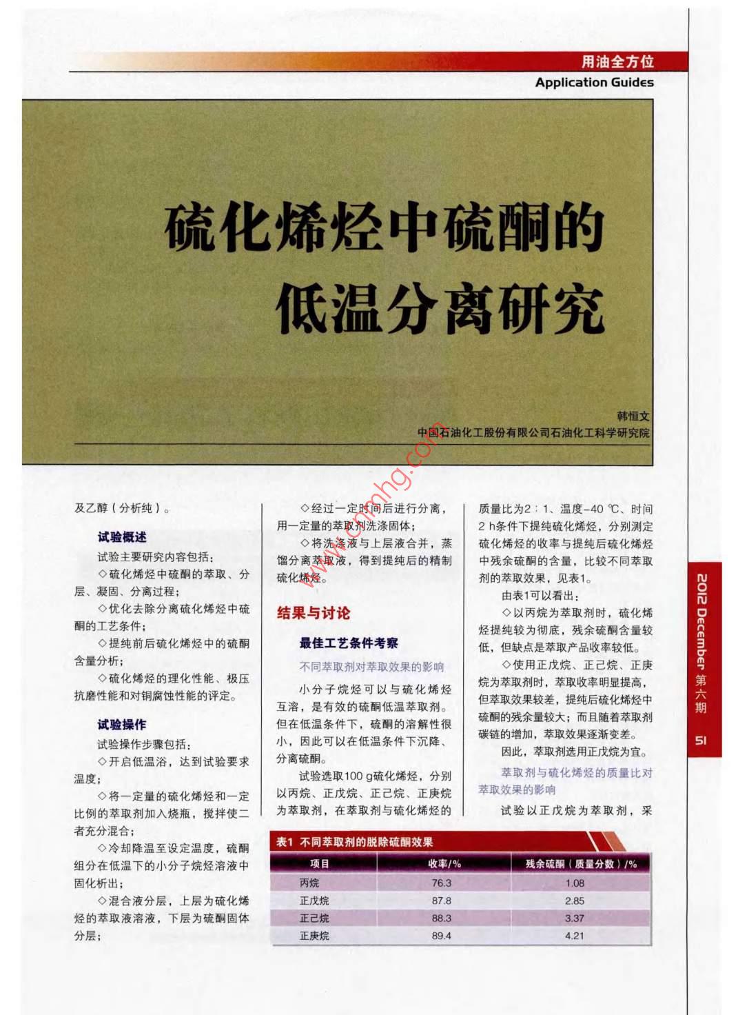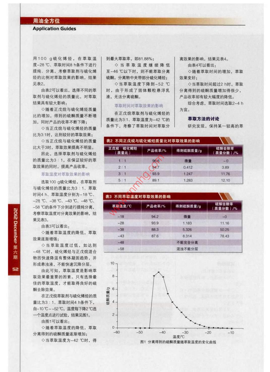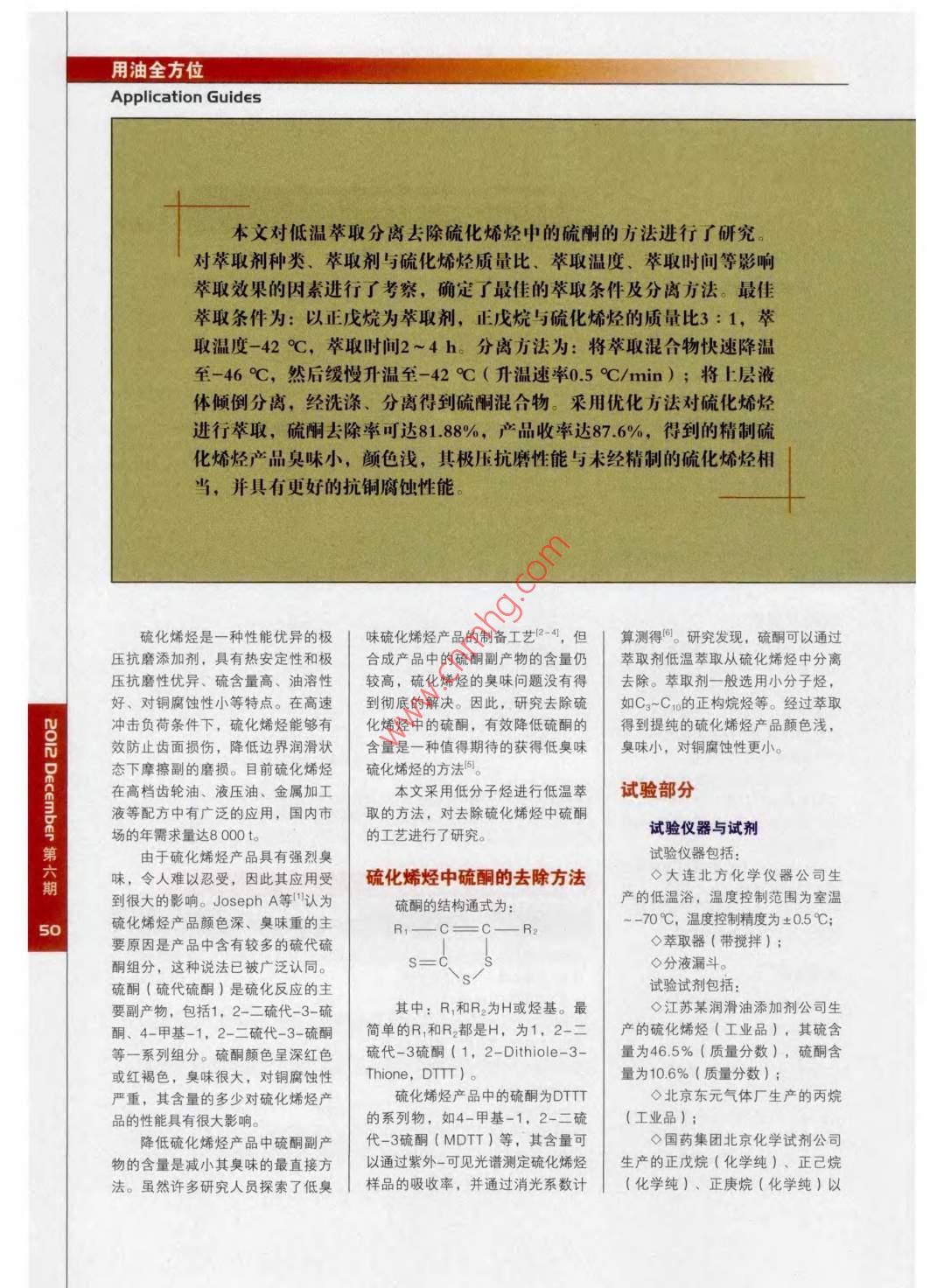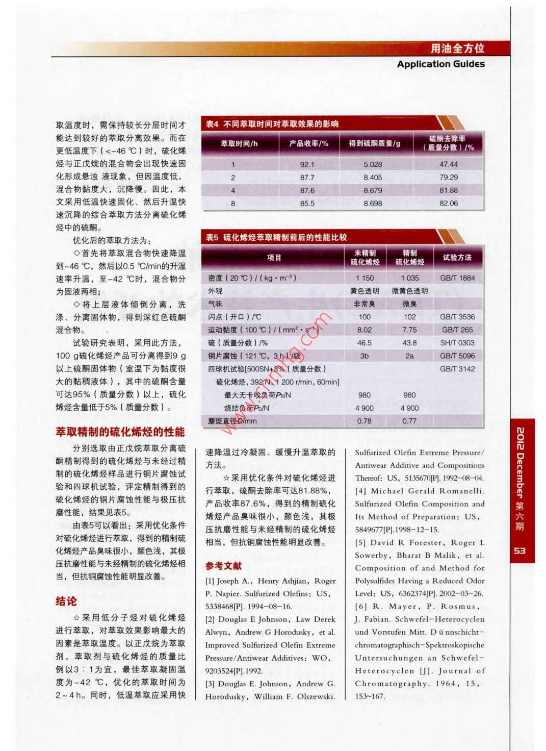 用油全方位Application Guides本文對低溫萃取分離去除硫化烯烴中的硫酮的方法進行了研究對萃取劑種類、萃取劑與硫化烯烴質(zhì)量比、萃取溫度、萃取時間等影響萃取效果的因素進行了考察,確定了最佳的萃取條件及分離方法。最佳萃取條件為:以正戊烷為萃取劑,正戊烷與硫化烯烴的質(zhì)量比3: 1,萃取溫度-42 °C,萃取時間2~4 h。分離方法為:將萃取混合物快速降溫至-46 °C,然后緩慢升溫至-42 9C (升溫速率0.5 °C/min) ;將上層液體傾倒分離,經(jīng)洗滌、分離得到硫酮混合物。采用優(yōu)化方法對硫化烯烴進行萃取,硫酮去除率可達81.88%,產(chǎn)品收率達87.6%,得到的精制硫化烯烴產(chǎn)品臭味小,顏色淺,其極壓抗磨性能與未經(jīng)精制的硫化烯烴相當(dāng),并具有更好的抗銅腐蝕性能硫化烯烴是一種性能優(yōu)異的極味硫化烯烴產(chǎn)品的制備工藝-一4,但|算測得向。 研究發(fā)現(xiàn),硫酮可以通過壓抗磨添加劑,具有熱安定性和極合成產(chǎn)品中的硫酮副產(chǎn)物的含量仍萃取劑低溫萃取從硫化烯烴中分離壓抗磨性優(yōu)異、硫含量高、油溶性較高,硫化烯烴的臭味問題沒有得去除。萃取劑一般選用小分子烴,好、對銅腐蝕性小等特點。在高速到徹底的解決。因此,研究去除硫如C3~Co的正構(gòu)烷烴等。經(jīng)過萃取沖擊負荷條件下,硫化烯烴能夠有化烯烴中的硫酮,有效降低硫酮的得 到提純的硫化烯烴產(chǎn)品顏色淺,效防止齒面損傷,降低邊界潤滑狀含量是一種值得期待的獲得低臭味臭味小,對銅腐蝕性更小。態(tài)下摩擦副的磨損。目前硫化烯烴硫化烯烴的方法問。在高檔齒輪油、液壓油、金屬加工本文采用低分子烴進行低溫萃試驗部分液等配方中有廣泛的應(yīng)用,國內(nèi)市取的方法,對去除硫化烯烴中硫酮試驗儀器與試劑場的年需求量達8000 to的工藝進行了研究。興由于硫化烯烴產(chǎn)品具有強烈臭試驗儀器包括:期味,令人難以忍受,因此其應(yīng)用受硫化烯烴中硫酮的去除方法?大連北方化學(xué)儀器公司生到很大的影響。Joseph A等"認為硫酮的結(jié)構(gòu)通式為:產(chǎn)的低溫浴,溫度控制范圍為室溫50硫化烯烴產(chǎn)品顏色深、臭味重的主R2--70C,溫度控制精度為+0.5C;要原因是產(chǎn)品中含有較多的硫代硫◆>萃取器(帶攪拌) ;酮組分,這種說法已被廣泛認同。S= C<分液漏斗。硫酮(硫代硫酮)是硫化反應(yīng)的主試驗試劑包括:要副產(chǎn)物,包括1,2-二硫代-3-硫其中: R,和R2為H或烴基。最。江蘇某潤滑油添加劑公司生酮、4-甲基-1, 2-二硫代-3-硫酮簡單的R,和R2都是H,為1, 2-二產(chǎn)的硫化烯烴(工業(yè)品),其硫含等一系列組分。硫酮顏色呈深紅色硫代-3硫酮( 1, 2-Dithiole-3-量為46.5% (質(zhì)量分數(shù)),硫酮含或紅褐色,臭味很大,對銅腐蝕性Thione, DTTT)。量為10.6% (質(zhì)量分數(shù)) ;嚴重,其含量的多少對硫化烯烴產(chǎn)硫化烯烴產(chǎn)品中的硫酮為DTTT<>北京東元氣體廠生產(chǎn)的丙烷品的性能具有很大影響。的系列物,如4-甲基-1, 2-二硫(工業(yè)品);降低硫化烯烴產(chǎn)品中硫酮副產(chǎn)代-3硫酮(MDTT)等,其含量可<國藥集團北京化學(xué)試劑公司物的含量是減小其臭味的最直接方以通過紫外-可見光譜測定硫化烯烴生產(chǎn)的正戊烷(化學(xué)純)、正己烷法。雖然許多研究人員探索了低臭樣品的吸收率,并通過消光系數(shù)計(化學(xué)純)、 正庚烷(化學(xué)純)以用油全方位Application Guides硫化烯烴中硫酮的低溫分離研究韓恒文中國石油化工股份有限公司石油化工科學(xué)研究院及乙醇(分析純)。<>經(jīng)過一定時間后進行分離,質(zhì)量比為2: 1、溫度-40 C、時間;用一定量的萃取劑洗滌固體;2 h條件下提純硫化烯烴,分別測定試驗概述<將洗滌液與上層液合并,蒸硫化烯烴的收率與提純后硫化烯烴試驗主要研究內(nèi)容包括:餾分離萃取液,得到提純后的精制中殘余硫酮的含量,比較不同萃取<硫化烯烴中硫酮的萃取、分硫化烯烴。劑的萃取效果,見表1。層、凝固、分離過程;由表1可以看出:<優(yōu)化去除分離硫化烯烴中硫結(jié)果與討論>以丙烷為萃取劑時,硫化烯酮的工藝條件;烴提純較為徹底,殘余硫酮含量較。提純前后硫化烯烴中的硫酮最佳工藝條件考察低,但缺點是萃取產(chǎn)品收率較低。含量分析;不同萃取劑對萃取效果的影響◆使用正戊烷、正已烷、正庚◆硫化烯烴的理化性能、極壓烷為萃取劑時,萃取收率明顯提高,第抗磨性能和對銅腐蝕性能的評定。小分子烷烴可以與硫化烯烴但萃取效果較差,提純后硫化烯烴中六互溶,是有效的硫酮低溫萃取劑。硫酮的殘余量較大;而且隨著萃取劑期試驗操作但在低溫條件下,硫酮的溶解性很碳鏈的增加,萃取效果逐漸變差。試驗操作步驟包括:小,因此可以在低溫條件下沉降、51因此,萃取劑選用正戊烷為宜?!糸_啟低溫浴,達到試驗要求分離硫酮。溫度;試驗選取100 g硫化烯烴,分別萃取劑與硫化烯烴的質(zhì)量比對。將一定量的硫化烯烴和一定以丙烷、正戊烷、正己烷、正庚烷萃取效果的影響比例的萃取劑加入燒瓶,攪拌使二為萃取劑,在萃取劑與硫化烯烴的試驗以正戊烷為萃取劑,采者充分混合:表1不同萃取劑的脫除硫酮效果M<冷卻降溫至設(shè)定溫度,硫酮組分在低溫下的小分子烷烴溶液中項目收率/%殘余硫酮(質(zhì)量分數(shù)) /%固化析出;丙烷◆混合液分層,上層為硫化烯