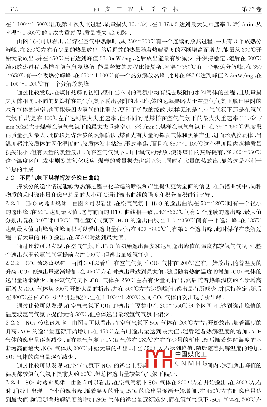 西安工程大學(xué)學(xué)報Journal of Xi'an Poly technic U niversity第27卷第5期(總123期)2013年10月Vol 27. No 5(Sum. No 123)文章編號:1674-649X(2013)05-0616-06熱解氣氛對煤熱解行為的影響李超,鄭長征,王曉紅(1.西安工程大學(xué)環(huán)境與化學(xué)工程學(xué)院陜西西安710048:;西安近代化學(xué)研究所,陜西西安710065)摘要:利用DSC/TG-MS同步熱分析-質(zhì)譜聯(lián)用技術(shù)對新疆哈密煤進行研究,考察了氬氣、空氣為熱解氣氛時,煤樣的熱分解過程,熱解氣相產(chǎn)物HaO,CO,NO,O的逸岀規(guī)律,并從微觀的角度提出了其熱解機理.實驗表明,由于空氣中氧氣的高反應(yīng)活性,使得煤樣熱解氣相產(chǎn)物逸出的溫度區(qū)間縮短,出現(xiàn)逸出峰的溫度提前,同時有大量的熱量放出,但熱解氣相產(chǎn)物HO,CO,NO,SO2的逸出量比氳氣氣氛下少.另外,煤樣灰分中CaO,FeO3的含量很高,這也是影響煤樣熱解氣相產(chǎn)物形成的原因之關(guān)鍵詞:新疆煤;熱解;熱解氣氛;DSC/TG-MS中圖分類號:TQ530文獻標識碼:A我國是煤炭資源大國,煤炭廣泛應(yīng)用于電力、建材、城市供暖、煉焦、化工等行業(yè).同時煤炭也是我國主要的污染源,約有90%的SO2,67%的NO-,82%的酸雨和60%的大氣粉塵都來源于煤的直接燃燒口.因此,提高煤資源轉(zhuǎn)化率和發(fā)展?jié)崈裘杭夹g(shù),便成為當前十分迫切的需求熱解作為煤熱轉(zhuǎn)化利用過程的第一步,同時也是簡單有效的潔凈煤技術(shù)之一影響煤熱解的因素有很多,大致可以分為兩類:一是原料煤性質(zhì),如煤階、煤的粒度、煤的巖相組成和煤中礦物質(zhì)組成及含量等;二是熱解工藝條件,如反應(yīng)氣氛、熱解壓力、加熱速率、停留時間、熱解終溫等目前許多學(xué)者研究不同氣氛對煤熱解行為的影響,多采用在不同的純氣氛或以兩種不同的純氣氛按不同比例制成的混合氣氛下研究不同氣氛對煤的熱解行為的影響,并得到了很多有益的結(jié)論.但是在空氣(N278%,O221%,稀有氣體0.94%,C020.03%、其他氣體0.03%)這樣的混合氣氛下的,特別是本文采用的新疆煤,未見報道.為此,本文應(yīng)用同步熱分析法比較了氬氣和空氣兩種氣氛對煤熱分解行為的影響,并通過質(zhì)譜分析硏究了煤在熱解過程中H2O,CO,NO2,SO2的逸出情況1實驗1.1樣品實驗所用煤樣取自新疆哈密三道口煤礦,其工業(yè)分析、中國煤化工1.2儀器CNMHG(1)同步熱分析儀德國 netzsch公司44C型TG-D向步熱分析儀,溢度氾圍:35~1450℃,分辨收稿日期:2013-07-01通訊作者:鄭長征(1959-),男陜西省橫山縣人,西安工程大學(xué)教授,博士.主要從事煤化工工藝及技術(shù),電化學(xué)及儀器分析和生物活性配合物的研究E-mal: zhchangzhend126com第5期熱解氣氛對煤熱解行為的影響率:0.1g,升溫速率:10℃/min,真空度:10mBar表1實驗用煤樣的工業(yè)分析和元素分析工業(yè)分析元素分析樣品Mad哈密煤7.494.6424.573.283.430.770.3112.21Note: ad, air-dried basis d, dry basis daf dry and ash-free basis; by difference表2煤樣的灰分組成分析樣品SO2Ak2O3Fe2O3TiO2 Cao MgO SO3K20Na0P2O5哈密煤13.2810.5327.410.4132.541.988.770.081.120.7(2)質(zhì)譜儀德國 Netzsch公司QMS403四級杠質(zhì)譜儀質(zhì)量范圍:1~300amu,質(zhì)量分辨率:≤0.5amu,檢測極限:>1×10。,質(zhì)譜連接管溫度:180℃,接口溫度:190℃.氣體原位池溫度:190℃,聯(lián)用傳輸管線溫度:180℃1.3條件熱分析儀坩堝類型:三氧化二鋁池,載氣:高純度氬氣(純度99.999%),25℃室溫下的空氣,吹掃氣流量:50mL/min,保護氣流量:25mL/min,溫度范圍:35~1450℃2結(jié)果與討論2.1對煤熱解行為的影響圖1是煤樣在不同的氣氛下以10℃/min的升溫速率得到的TG,DTG,DSC圖譜1.5求爾鏤上90求020040060080002014000聯(lián)上系了了后02004006008001000120014001600溫度/℃熱解氣氛對煤熱解失重及熱解失重速率的影響2日f千欲Dr(a)tg如圖1(a),(b)所示.可以發(fā)現(xiàn),當煤在空氣中熱解時,在室溫~300℃有一個失重過程,但是失重速率烘·日較小,大約是0.1%/min,在300~550℃有一個失重過程,在463.7℃時達到最大失重速率6.46/min;91.0整個熱解過程質(zhì)量減少70%.而煤樣在氬氣中熱解上時,出現(xiàn)4次失重過程,室溫~350℃出現(xiàn)第1次質(zhì)了R8量損失的過程,質(zhì)量損失1.13%,在93.0℃時達到最大失重速率0.3%6/min;在350~650℃出現(xiàn)第2II中國煤化工CNMH√0120014001600次失重過程,在447.0℃最大失重速率為溫度/℃1.3%/min;在650~1100℃出現(xiàn)第3次失重過程(c)Dsc圖1煤樣在不同氣氛下的TGDT-DSC譜圖但從DTG曲線看,本階段失重速率相對較小(<空氣;氬氣0.1%/min).前3次失重過程,質(zhì)量共損失25.4%618西安工程大學(xué)學(xué)報第27卷在1100~1500℃出現(xiàn)第4次失重過程質(zhì)量損失16.43%,在1378.2達到最大失重速率1.0%/min.從室溫~1500℃的4次失重過程,質(zhì)量損失42.61%由圖1(c)可以看出,當煤在空氣中熱解時,從250~600℃有一個連續(xù)的放熱過程,一共有3個放熱分解峰.在250℃左右有少量的熱量放岀,然后釋放的熱量隨著熱解溫度的不斷増高而増大,能量從300℃開始大量放岀,并在450℃左右達到峰值23.3mW/mg,之后放出能量有所減少,并保持穩(wěn)定,隨后在600℃結(jié)朿放熱過程煤樣在氬氣氣氛熱解,能量釋放的過程比較復(fù)雜,室溫~350℃有一個吸熱分解峰,在350650℃有一個吸熱分解峰,在650~1100℃有一個熱分解放熱峰,此時在982℃達到峰值2.3mW/mg,在1100~1200℃有一個分解放熱峰通過比較發(fā)現(xiàn),在煤樣熱解的初期,煤樣在不同的