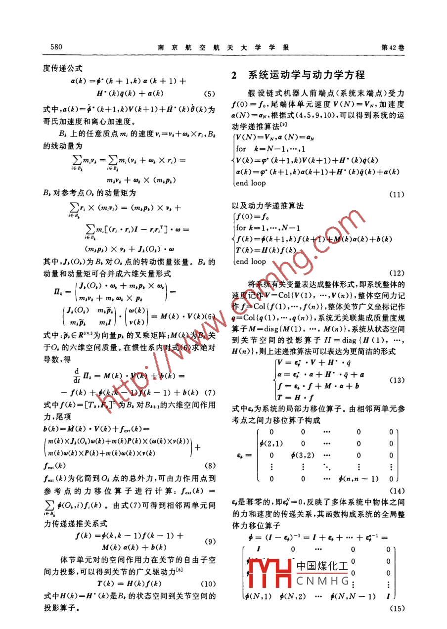 第42卷第5期南京航空航天大學(xué)學(xué)報(bào)Vol 42 No 52010年10月Journal of Nanjing University of Aeronautics AstronauticsOet.2010管道機(jī)器人動(dòng)力學(xué)分析趙大旭陳柏1吳洪濤1桑賢臣1陳筍(1.南京航空航天大學(xué)機(jī)電學(xué)院,南京,210016;2.上海交通大學(xué)醫(yī)學(xué)院附屬新華醫(yī)院,上海兒童醫(yī)學(xué)中心,200092)摘要:在分析了開鏈?zhǔn)酵負(fù)浣Y(jié)構(gòu)的多節(jié)蠕動(dòng)機(jī)器人結(jié)構(gòu)和運(yùn)動(dòng)特點(diǎn)的基礎(chǔ)上,利用空間算子代數(shù)( Spatial opera-tor algebra,SoA)方法,建立了適用于這類機(jī)器人系統(tǒng)的通用動(dòng)力學(xué)模型,為臉證所建立的動(dòng)力學(xué)模型的正確性,將原理樣機(jī)運(yùn)行試驗(yàn)和與動(dòng)力學(xué)仿真分析結(jié)果進(jìn)行了對比。在此基礎(chǔ)上,利用該動(dòng)力學(xué)模型,對樣機(jī)結(jié)構(gòu)的改進(jìn)與優(yōu)化,并對機(jī)器人運(yùn)動(dòng)學(xué)和動(dòng)力學(xué)性能的彩響進(jìn)行了分析和評(píng)怙,為機(jī)器人運(yùn)動(dòng)控制策略的擬定提供了重要的依據(jù)。關(guān)鍵詞:空間算子代數(shù)(SOA);鏈?zhǔn)浇Y(jié)構(gòu);管近機(jī)器人;動(dòng)力學(xué)中圖分類號(hào):TP311.11文獻(xiàn)標(biāo)識(shí)碼:A文章編號(hào):1005-2615(2010)05-0578-ynamics Analysis and Simulation of In-Pipe RobotZhao Dazu, Chen Bai, Wu Hongtao, Sang Xianchen, Chen Sun2(1. College of Mechanical and Electrical Engineering, Nanjing University ofAeronautics Astronautics, Nanjing, 210016, China;(2. Xinhua Hospital, Shanghai Children's Medical Center, Medical School ofShanghai Jiao Tong University, Shanghai, 200092, China)Abstract: After analyzing the structure and movement characteristics of multi-chain peristaltic robot, acommon dynamics model for all the multi-chain robot is established by using the method for spatial operator algebra (SOA). Experimental data of the physical model are compared with the simulation analysisdata to validate the correctness of the dynamics model. In accordance with the dynamics model for themulti-chain robots, the structure of the prototype robot is optimized, and the kinematics and dynamicsperformances of the prototype robot are analyzed and evaluated. All the results can be provided as thesignificant basis for making control plan of the robotKey words: spatial operator algebra (SOA); chain-type structure in- pipe robot dynamics工業(yè)領(lǐng)域、自然界乃至人體管道是進(jìn)行物質(zhì)傳響應(yīng)快的優(yōu)點(diǎn),但另一方面,其承載能力較弱,容易輸?shù)淖钪匾氖侄?。管道形狀?fù)雜、內(nèi)部空間狹窄、內(nèi)受環(huán)境介質(zhì)運(yùn)動(dòng)的影響;相對而言蠕動(dòng)推進(jìn)的機(jī)器部狀況惡劣且不可視,如何對管道內(nèi)狀況進(jìn)行監(jiān)控、人承載能力強(qiáng),在少液或無液管道中也能保持較好檢修成為科學(xué)界關(guān)注的焦點(diǎn)之一,微小型管道機(jī)器人穩(wěn)定性,適用于任務(wù)載荷大、速度要求不高的場合。逐漸成為機(jī)器人研究領(lǐng)域的一個(gè)熱點(diǎn)(12)典型的蠕動(dòng)機(jī)器人,如仿蚯蚓型機(jī)器人3與仿當(dāng)前,微小型管道機(jī)器人最常用的移動(dòng)方式是蛇型機(jī)器人(,由兩個(gè)以上體節(jié)單元兩兩通過關(guān)節(jié)游動(dòng)和蠕動(dòng)。游動(dòng)推進(jìn)方式具有運(yùn)動(dòng)靈活、效率高、連接起來。為增加機(jī)器人對復(fù)雜環(huán)境管道的適應(yīng)能基金項(xiàng)目:國家自然科學(xué)基金(50605033,51075209)資助項(xiàng)目;上海市科委科技發(fā)展基金(08411960700)資助項(xiàng)目;南京航空航天大學(xué)基本科研業(yè)務(wù)費(fèi)專項(xiàng)科研(NS2010119資助項(xiàng)目。中國煤化工收稿日期:2009-12-17;修訂日期:2010-01-23作者簡介:趙大旭,男,博士研究生,1974年9月生;吳洪濤(聯(lián)系CNMHGmeehtwu@edu. cn第5期趙大旭,等:管道機(jī)器人動(dòng)力學(xué)分析579力,該類機(jī)器人常采取增加體節(jié)單元,或者增加關(guān)編號(hào)是由末端向基座方向遞增的,對于N個(gè)剛體節(jié)自由度的方法來實(shí)現(xiàn)的系統(tǒng),末端為1號(hào)剛體,機(jī)座為N+1號(hào)剛體。蠕鏈?zhǔn)饺鋭?dòng)機(jī)器人節(jié)數(shù)越多機(jī)器人控制與仿真動(dòng)機(jī)器人沒有固定在機(jī)座,為此,可以在第N個(gè)剛分析模型將越復(fù)雜。尋求高效的建模方法,保證機(jī)體和慣性系(N+1號(hào)體)之間增加一個(gè)虛鉸j,將器人系統(tǒng)控制的實(shí)時(shí)性要求,顯得十分重要。本文整個(gè)系統(tǒng)轉(zhuǎn)換成有根的鏈?zhǔn)较到y(tǒng)。沿前進(jìn)正方向在引入空間算子代數(shù)( Spatial operator algebra,外伸端是機(jī)器人頭艙單元,定義為1號(hào)剛體,標(biāo)記SOA)理論的基礎(chǔ)上,提出了一種具有一般性的鏈為B1,并規(guī)定頭艙前端點(diǎn)為O點(diǎn),尾部單元為第N式機(jī)器人動(dòng)力學(xué)高效建模方法,消除了具體操作細(xì)號(hào)剛體B,G為B,的重心,B與B+1通過關(guān)節(jié)節(jié)的復(fù)雜性,算法上提高了計(jì)算效率,其計(jì)算量為連接。建立如圖1所示動(dòng)靜坐標(biāo)系,選擇大地上固O(N)量級(jí)。定點(diǎn)E為慣性系(記為Cg)原點(diǎn),以鉸接點(diǎn)O4作為利用該模型,對課題組提出的仿腹足動(dòng)物機(jī)器B,連體坐標(biāo)系(記為C)原點(diǎn),x指向前進(jìn)正方向人動(dòng)力學(xué)性能進(jìn)行了理