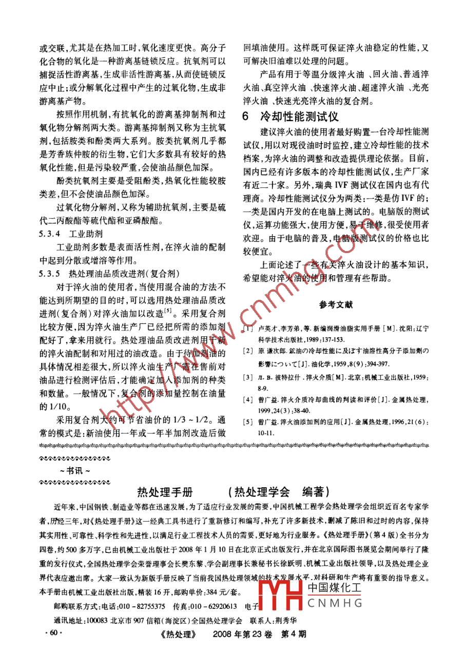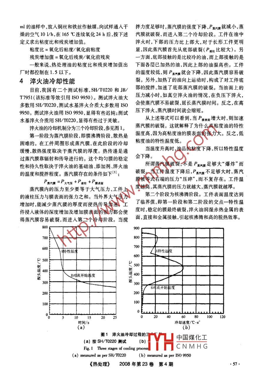 ~冷卻技術(shù)~淬火油的設(shè)計曾廣益(天津市關(guān)石石化產(chǎn)品有限公司,天津300112)摘要: 淬火油的設(shè)計是為淬火油的使用服務(wù),即淬火油的使用決定淬火油的設(shè)計。我國淬火油的設(shè)計依據(jù)是SH 0564《熱處理油》。在具體的使用中,對淬火油提出更進(jìn)一步的要求是合理的。關(guān)鍵詞:淬火油;使用;冷卻性能中圖分類號:TG154.4文獻(xiàn)標(biāo)識碼:A文章編號:1008-1690(2008 )04-0055-006Design of Quenching OilsZENG Guang-yi .(Tianjin Mainstream Petrochemical Products Co. ,Itd. ,Tianjin 300112)Abstract : The design of quenching oils serves their application, that is to say, the design of quenching oils is de-pendent on their application. The quenching oils are designed on the basis of SH0564《Heat treatment oils》 in Chi-na. It is reasonable that higher demands for quenching oils are put forward in practical service.Key Words :quenching oil;use ;cooling characteristics對于淬火油的使用者為什么要研究淬火油的設(shè)合物,隨時都在變化之中,因此對淬火油的現(xiàn)場監(jiān)測計呢?是為了更好地管理和使用淬火油。淬火油在和管理就十分重要。淬火油的技術(shù)指標(biāo)很多,有理使用過程中要發(fā)生各種變化。淬火實踐是一個系統(tǒng)化指標(biāo)冷卻性能指標(biāo)、抗氧化性能指標(biāo)、光亮性能工程,它由許多程序組成,又分為許多細(xì)節(jié),因此可指標(biāo)、飽和蒸汽壓等。在我國,淬火油的設(shè)計依據(jù)是以說沒有細(xì)節(jié)就沒有管理。研究淬火油的設(shè)計就是SH0564《熱處理油》。以此為依據(jù),淬火油的使用.要了解和掌握這些細(xì)節(jié),把這些細(xì)節(jié)的變化控制在者可以根據(jù)自己的實踐將相關(guān)的信息反饋給淬火油最小的范圍內(nèi),以保證產(chǎn)品質(zhì)量的穩(wěn)定。通過淬火的生產(chǎn)者,以便生產(chǎn)者制造出更適合自己使用的淬實踐,我們可以找出重要指標(biāo)允許的最大值和最小火油。值,在淬火油設(shè)計和管理中加以保證。2淬火油理化指標(biāo)的含義"1淬火油 的設(shè)計依據(jù)淬火油的理化指標(biāo),如基礎(chǔ)油的類別(石蠟基、工件的淬火對淬火油的最基本的要求是淬火油環(huán)烷基或中間基) ,運(yùn)動粘度,開口閃點(diǎn),水分等可性能的穩(wěn)定,尤其是淬火油的冷卻性能。影響淬火到石油公司去檢測。油的冷卻性能的因素很多。淬火油使用條件可以說粘度指數(shù):是基礎(chǔ)油化學(xué)組成的函數(shù)。粘度指是最苛刻的。淬火油是一種多組分的高分子有機(jī)化數(shù)可以作 為一種性能的標(biāo)志,作為質(zhì)量控制的尺度。收稿日期:2007-10-10作者簡介:曾廣益(1941-),男,黑龍江阿城人,高級工程師,主要從事淬火介質(zhì)的研究。聯(lián)系電話:022-27531457 13502108605 E-mail: zengguangyi123@ sina. com2001 ,29(4) :38-42.ture and tensile properie of AI-MgSi alys[J]. Seripta Materia[6]韓建德,王常春,閔光輝, 等.鑄造A-Si-Cu合金的組織與性能lia,1997 ,36:1089 -1094.[J].鑄造技術(shù),2002 ,23(4) :245-247.[9]陳曠,關(guān)紹康,胡保健,馬 辦雙級時效工藝對低壓[7] Van. P. Mourik, Mitemejer E J. On peipiaition mpidly ;中國煤化工小輕合金加工技術(shù).eldified auminium-ilion lly[J]. Joumal of Malerials Sei-ence. 1983 ,18(9) :2706-2720.MHCN M H G熱處理工藝的研究[n].[8] Zhen L, KangS B. The ffete of pre-aging on microstrue-鑄造.2006 ,(2):132134.《熱處理》2008年第23卷第4期.55.淬火油的粘度指數(shù)主要反映淬火油的基礎(chǔ)油的類80 C,這樣才能保證淬火過程的安全。-般說來,別。石蠟基油的粘度指數(shù)一般在90以上,優(yōu)質(zhì)環(huán)烷粘度高 則閃點(diǎn)高。高閃點(diǎn)和低閃點(diǎn)的油混合時,閃基油為30~50左右,中間基油在這兩者之間。點(diǎn)向低閃點(diǎn)方向傾斜得多,這一點(diǎn)在使用混合油調(diào)基礎(chǔ)油的揮發(fā)性與油耗粘度穩(wěn)定性、氧化安定制淬 火油時,必需特別加以注意。性都有關(guān)系。石蠟基油比環(huán)烷基油揮發(fā)性小,即粘國外淬火油的發(fā)展趨勢是使用高閃點(diǎn)低粘度的度指數(shù)越高,揮發(fā)性越小?;A(chǔ)油配制淬火油,最高使用溫度應(yīng)比開口閃點(diǎn)至作為淬火油的基礎(chǔ)油應(yīng)該用石蠟基油。我國大少低 40 ~60 C。慶和玉門的油是低硫石蠟基油。水分:熱處理油的基礎(chǔ)油在煉制過程中的含水粘度:淬火油的一個重要指標(biāo),流動物質(zhì)的內(nèi)摩量是很低的,只有幾個到十幾個ppm(百萬分之- -)。擦力的量度叫粘度。粘度值隨溫度的上升而降低,熱處理油中的水,可能來自空氣,油調(diào)制時混人,冷大多數(shù)的潤滑油是根據(jù)粘度來劃分油品牌號的。淬卻器漏水, 儲運(yùn)過程等許多方面。工件有光亮性要火油常用的粘度是運(yùn)動粘度和動力粘度。動力粘度求的淬火油的水分應(yīng)控制在無(-般小于20x表示液體在一定的剪切應(yīng)力下流動時內(nèi)摩擦力的量10-*)。 一般來說,其他淬火油的水分不應(yīng)大于痕跡度。其值為加于流動液體的剪切應(yīng)力和剪切速率之(0. 03% )。比。在我國的法定計量單位制中,以帕.秒(Pa.s)油品中有水,會使油品乳化呈渾濁色,有時會生表示,習(xí)慣上用的厘泊(cP)為非法定單位, lcP=成沉淀層或乳化層。水分在油中能加速有機(jī)酸對金10-3 Pa.s。屬的腐蝕作用,還能造成機(jī)械設(shè)備的銹蝕,容易使油運(yùn)動粘度