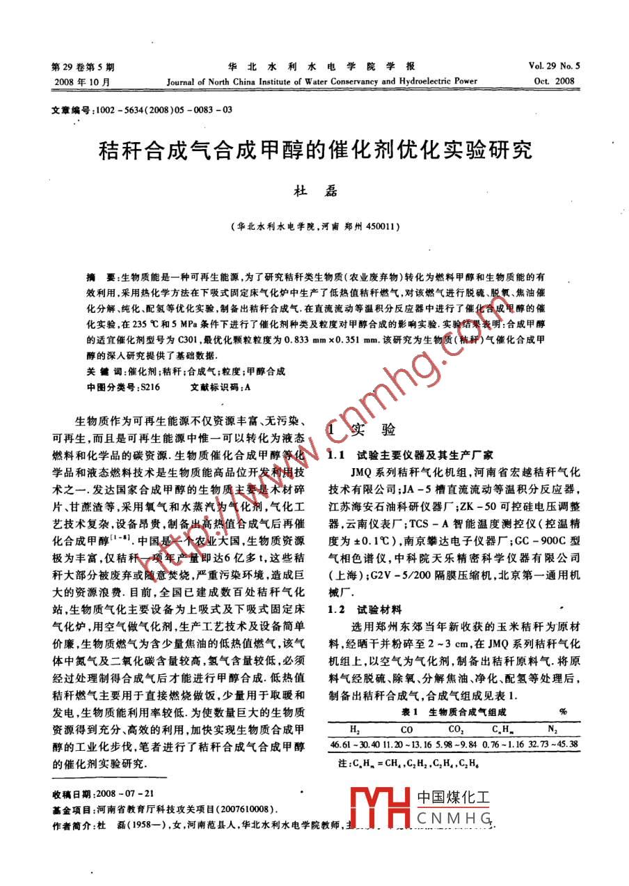 秸稈合成氣合成甲醇的催化劑優(yōu)化實驗研究