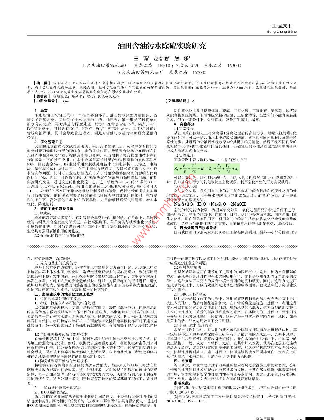 工程技術(shù)Gong Cheng Ji Shu油田含油污水除硫?qū)嶒炑芯客蹊蹿w春艷熊樂1.大慶油田第四采油廠黑龍江省 163000; 2.大慶油田黑龍江省1630003.大慶油田第四采油廠黑龍江省 163000[摘要]以系統(tǒng)有、無孔板破乳元件在每個相同流量下除油率的比較來表征孔板空化破乳效果,并通過比較裝有孔板破乳元件的系統(tǒng)在各孔徑和流量下的除油,確定實驗最佳孔徑和流量。結(jié)果表明:孔板空化破乳法對于乳化液的破壞是有效的,且效果顯著:在孔徑為8mm,流量為3.85m/h時, 系統(tǒng)破乳效果最好,除油.率可達97%,孔徑偏大或偏小及流量偏高或偏低均會影響空化破乳效果。!關(guān)鍵詞]物理破乳;除油率;空化;孔板破乳元件(中圖分類號] U664 .[文獻標識碼] A1導言H采油工藝中一個很重要的環(huán)節(jié)。油田污水經(jīng)處理后回注.活性硫化物主要 是指硫化氫,硫醇、二氧化碗,三氧化碗、碩酸等。這些物避免了環(huán)境污染,又達到了注水保壓的目的。油田采出液一般是經(jīng)過簡單的金屬, 但在一定條件下,會對管線、 設備產(chǎn)生腐性、堵塞。個能且接得出油水分離之后,再對其進行深度處理,污水中經(jīng)常會含有Ca2t、Mg”、 Fe、4實驗部分Fe等陽離子,同時含有Co上、HCO'4.1實驗流程管線腐蝕嚴重,同時會導致管道堵塞,因此對含油污水進行除硫研究是很有某油田采出液經(jīng)過三相分離器!分離處理后的含油污水,經(jīng)曝氣沉淀罐2做必要的催化脫硫工藝曝氣預處理,可以去除含油污水中游離狀態(tài)的油,絮狀物和固體顆粒以及硫等還大量的現(xiàn)場試驗及文獻報道表明,采用污水配注以后,污水中含有的化學 孔板破乳元件8做乳化液空化破乳處理。經(jīng)破乳后的小油滴在聚結(jié)罐9中快速聚組分對聚丙烯酰胺分子的降解有一定的促進作用,導致聚合物溶液在配制和注結(jié)成大油滴實現(xiàn)油水分離。入過程中黏度損失嚴重,控制流度能力變差,從而限制了聚合物驅(qū)油技術(shù)在部4.2實驗原理分油藏條件下的推廣應用。污水中金屬陽離子對聚合物黏度降低的貢獻率達到實驗管路中管徑取D=20mm。根據(jù)伯努力方程60%,目前去除Na+、K+主要采用水脫鹽處理技術(shù)(如電滲析、反滲透、電解P. V法,超過藍相微化膜過能條),存在工程建設投資大,人口水質(zhì)要求高及再生成2+↓+元+H=2++元+hy:以達到40%,因此,可以通過脫出S-來解決聚合物溶波的黏度降低問題。' 前期可以計算出P2,即孔口處的壓力。當B