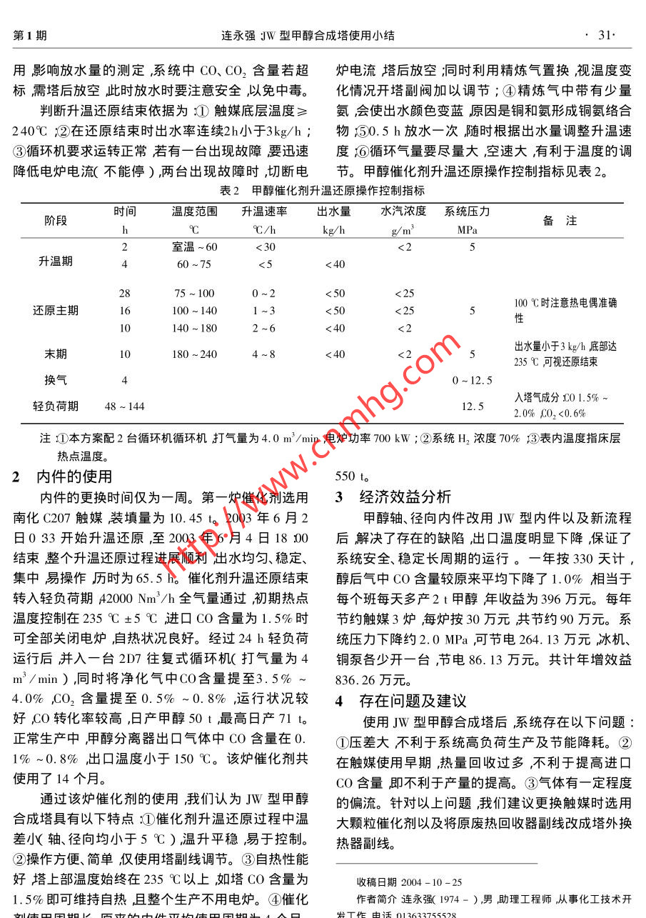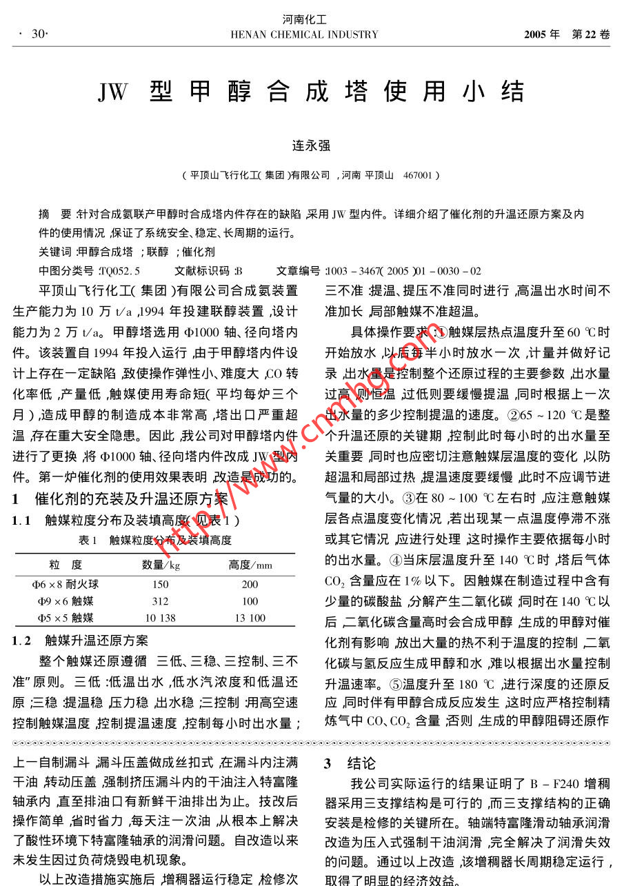 JW型甲醇合成塔使用小結(jié)