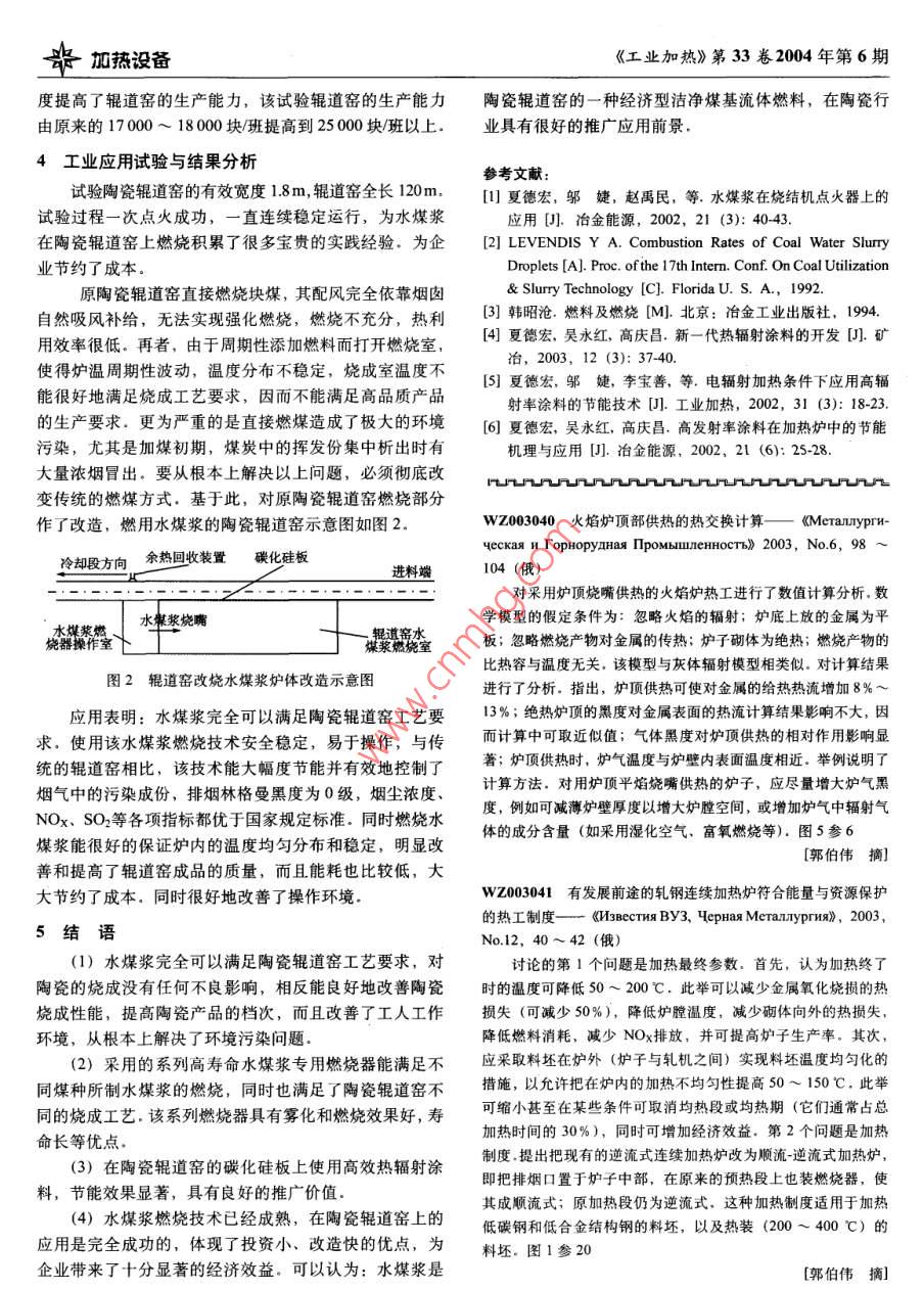 加熱沒備《工業(yè)加熱》第33卷2004年第6期水煤漿成套燃燒技術(shù)在陶瓷輥道窯上的應(yīng)用夏德宏,吳祥宇,張省現(xiàn)1,吳永紅1,趙禹民1,林書成2(1.北京科技大學(xué)熱能工程系,北京100083;2.四川省煤炭工業(yè)局,四川成都610000摘要:通過對(duì)國內(nèi)首次在陶瓷輥道窯上應(yīng)用水煤漿成套技術(shù)的工業(yè)試驗(yàn)介紹,分別就燃燒應(yīng)用系統(tǒng)中的各部分進(jìn)行了詳細(xì)地分析試驗(yàn)結(jié)果表明:陶瓷輥道窯上能很成功地應(yīng)用該水煤漿燃燒技術(shù),配備相應(yīng)輔助技術(shù)后,能大幅度降低能源消耗,改善操作環(huán)境,從根本上解決陶瓷輥道窯的污染問題。該成套技術(shù)的推廣應(yīng)用對(duì)企業(yè)具有很好的經(jīng)濟(jì)效益和環(huán)保效益關(guān)鍵詞:水煤漿;陶瓷輥道窯;燒成中圖分類號(hào):TK5文獻(xiàn)標(biāo)識(shí)碼:A文章編號(hào):1002-1639(2004)06-0033-03The Application of Coal-water Slurry to a Ceramic roller kilnXIA De-hong, wU Xiang-yu, ZHANG Sheng-xian, wU Yong-hong, ZHAO Yu-min, LIN Shu-cheng(1. Dept. of Thermal Engineering, Univ. of Science and Technology Beijing, Beijing 100083, China2. Sichuan Bureau of Coal Industry, Chengdu 610000, China)Abstract: Coal-Water Slurry (CwS) has been put into application in a Ceramic roller Kiln (CrK) for the first time in China. Some keytechniques in this complete technology have been analyzed in this paper. Experimental results have proved that the complete technology ofCWS combustion can reach a sound calcining efficiency and energy saving effect. Especially, they can solve the air pollution of the ceramicroller kiln successfully. The popularization of this technology has a bright prospect both economically and environmentallyKey words: coal-water slurry; ceramic roller kiln; calcine1前言陶瓷輥道窯上進(jìn)行了水煤漿燃燒成套技術(shù)的工業(yè)應(yīng)用試目前,很多陶瓷輥道爐窯仍然采用直接手工燃煤,不驗(yàn),取得了良好的效果僅燃燒效率特低,而且給周邊地區(qū)造成極大的環(huán)境污染.2水煤漿的應(yīng)用特性要從根本上長(zhǎng)期解決陶瓷輥道爐窯的燃料來源及其燃燒為了探索水煤漿在陶瓷輥道窯上的適應(yīng)性,對(duì)四川過程中的污染問題,因?yàn)橘Y源限制和經(jīng)濟(jì)性方面的原因,省九達(dá)集團(tuán)公司生產(chǎn)的水煤漿各項(xiàng)性能進(jìn)行了工業(yè)性檢不可能都寄希望于石油和天然氣.因而陶瓷輥道爐窯的測(cè)。其主要應(yīng)用特性如表1.發(fā)展只能走煤炭清潔利用技術(shù)的路線.水煤漿作為潔凈表1九達(dá)水煤漿的應(yīng)用特性的煤基流體燃料,經(jīng)過世界各國20多年的科技攻關(guān)和各重量粘度上限度分分揮發(fā)分發(fā)熱量灰熔定粒度平均粒種工業(yè)性示范推廣,目前已經(jīng)取得了很多寶貴的經(jīng)驗(yàn).由度(%)(%)(%)(%)MJkg2點(diǎn)C于具有較高的性價(jià)比和卓越的環(huán)境優(yōu)勢(shì),水煤漿作為66±1200<300<45-7<0.5>30,18.84-125060種經(jīng)濟(jì)性的潔凈燃料巳經(jīng)在越來越多的工業(yè)領(lǐng)域如冶金機(jī)械、石油、化工、動(dòng)力、建材等得到了成功應(yīng)用.目注:采用原煤制漿前,北京科技大學(xué)利用自己開發(fā)的“工業(yè)窯爐水煤漿燃3水煤漿在陶瓷輥道窯上應(yīng)用系統(tǒng)技術(shù)燒成套技術(shù)”與四川省九達(dá)(集團(tuán))公司密切合作,在水煤漿在陶瓷輥道窯上的應(yīng)用包括廠區(qū)的儲(chǔ)備和管道輸送、爐前漿質(zhì)調(diào)整、高壽命水煤漿專用燃燒器的研收稿日期:200407-20制與水煤漿的高效和穩(wěn)定燃燒技術(shù)、冷卻段余熱回收及作者簡(jiǎn)介:夏德宏(1963-),男,教授,主要從事清潔能源利用強(qiáng)化水煤漿點(diǎn)火技術(shù)以及應(yīng)用高性能熱輻射材料強(qiáng)化碳等研究化硅板傳熱技術(shù)等5結(jié)語靠,操作簡(jiǎn)單,改變了以往的控制模式Honeywell HO900在燃油熱處理爐上的運(yùn)行證明,該參考文獻(xiàn)多功能控制器具有抗干擾性能好、運(yùn)行速度快,控溫度[1]王常力,羅安集散控制系統(tǒng)的選型與應(yīng)用DM.北京精度高,可與上位計(jì)算機(jī)連接使用,又可單獨(dú)使用,體清華大學(xué)出版社,1996積小,功能強(qiáng)等特點(diǎn),經(jīng)過近一年的運(yùn)行,系統(tǒng)穩(wěn)定可[2]王秉銓工業(yè)爐設(shè)計(jì)手冊(cè)[M]北京:機(jī)械工業(yè)出版社,1990加熱設(shè)備《工業(yè)加熱》第33卷2004年第6期31廠區(qū)儲(chǔ)備與管道輸送了工業(yè)實(shí)驗(yàn)燃燒,也取得了滿意的效果。實(shí)際應(yīng)用表明:水煤漿儲(chǔ)漿池的設(shè)計(jì)主要技術(shù)包括:合理的底部結(jié)該系列燃燒器能良好地滿足陶瓷輥道爐窯燃燒水煤漿的構(gòu)、防沉淀防堵塞措施、最佳幾何尺寸、有效地防掛漿要求措施等水煤漿的燃燒過程主要有:先經(jīng)歷噴槍霧化后,升水煤漿從儲(chǔ)漿池到爐前采用管道輸送,其輸送水煤溫、水份蒸發(fā)、揮發(fā)份析出與著火燃燒、炭粒的燃盡2漿管道系統(tǒng)各參數(shù)應(yīng)根據(jù)水煤漿的流變特性以及管內(nèi)流其中,保證水煤漿在燃燒前迅速揮發(fā)出30%以上的水動(dòng)特性來確定,加入添加劑后,水煤漿具有很強(qiáng)的觸變份,且使得揮發(fā)份快速析出和穩(wěn)定著火——即點(diǎn)火燃燒性,在存放時(shí)粘度很大,可以保證水煤漿的長(zhǎng)期存放而過程——是很關(guān)鍵