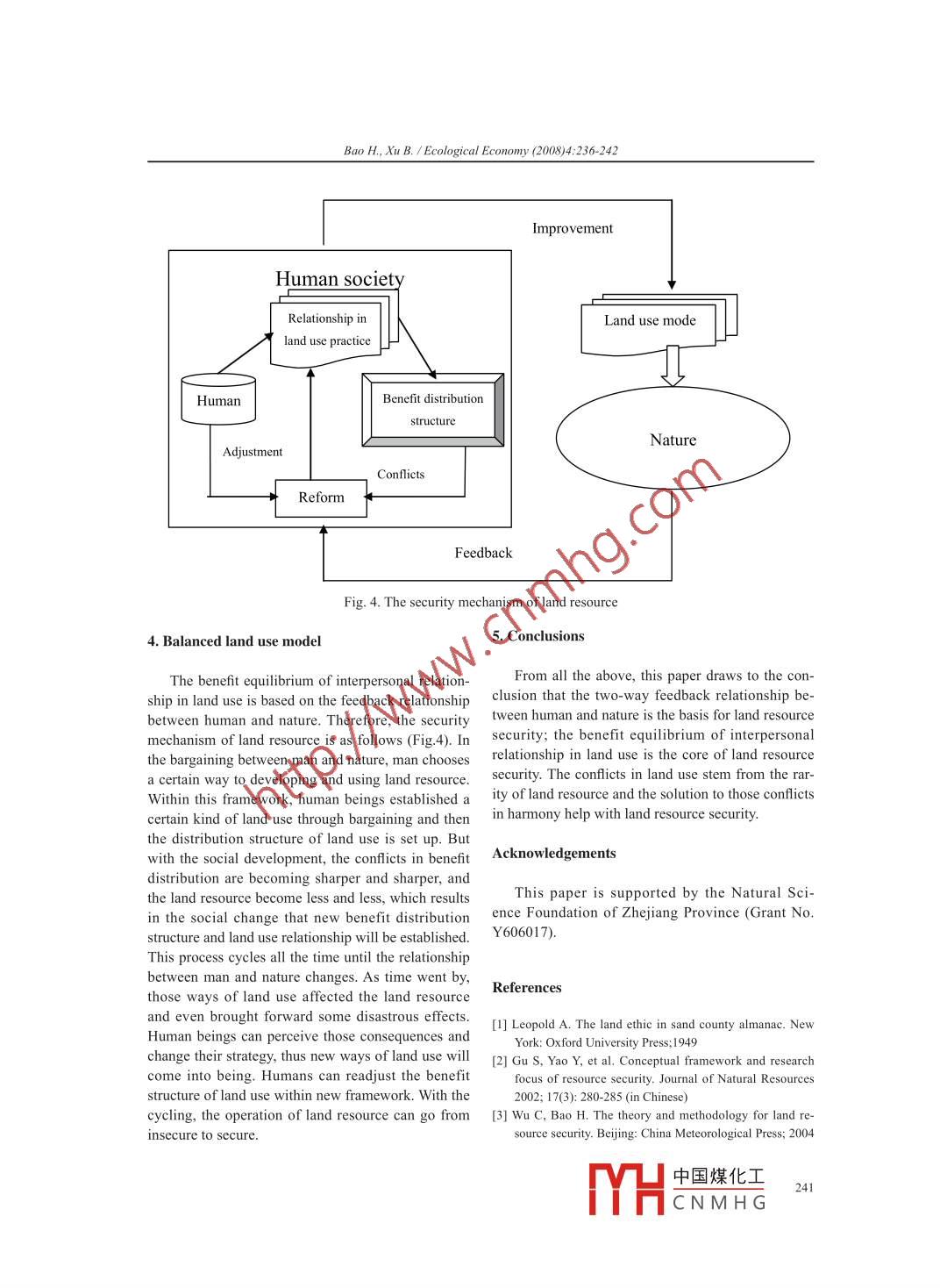 Ecological Economy (2008)4:236-242Empirical StudyAnalysis on mechanism of land resource securityBao Haijun *, Xu BaogenDepartment of Land Management & Agricultural Economics, Zhejiang University of Finance & Economics, Hangzhou 310018, P R.ChinaAbstract: This paper probes into the relationship among individual benefis, benefits of *the country; common benefitsof all humans in land use and land resource securit: The fllowing balanced land use model is proposed: the harmo-nious and interactive relationship between man and nature, two main bodies of land ecological system, constitutesthe mechanism of land resources security. The feedback relationship between man and nature is the basis for the landresources security and the core is the relationship among people established for the benefit equilibrium in land use.The conflicts in land use stem from the rarity of land resource and the solution to those conflicts in harmony helpsland resource security.Keywords: Man and nature; Land use; Land resource; Land resource security1. Introductionespecially the ways of connection and function pro-cess among the different parts. The mechanism ofLand, the mother of everything on the earth, is the land resource security refers to the mutual relationsbasis for humans to evolve and develop. However, and function process of different subjects in land sys-the improper use of land resource has made the eco- tem, including man and nature.logical system gradually become weak and resultedThis paper focuses on this process in order to ex-in many problems in land resource security.plain the mechanism of land resource security.The research on land resource security can betraced back to the concept of“Iand health", put for- 2. The two-way feedback relationship between hu-ward by Aldo Leopold in1949 ". But land resource man and nature: the basis for land resource secu-security, as both a scientific concept and a research rityfield, is a new trend in recent years. Gu Shuzhong.et al defined land resource security as follows: land .2.1 From anthropocentric theory to ecocentric theoryresource security means the ability that a country ora region can get natural resource continuously, sta-Man struggle with the natural environment inbly and economically (2. Wu Cifang et al considered order to live and develop since they came into being.land resource security as an ability that a county or aMankind, having experienced agricultural civilizationregion can obtain land resource continuously and can and industrial civilization, is marching towards eCo-ensure the living things to produce and live healthily logical cilization. During the period of agriculturaland eficiently B.civilization, people hunted and gathered, and theirHowever, most of the present studies focus on productivity level stayed very low. And at that time,the severe situation, the necessity of the study and the natural capacity was big enough to satisfy thethe content of land resource security, etc. Few further demand of mankind and it can recover the man-maderesearches have probed into its operating mechanismdamage by itself. Certainly there are some opposite :and security system. In general, mechanism means examples, such as the decline and disappearance ofthe construction and working principle of machines,“American Maya Civilization" 4. During the periodof industrial civilization, mankind exploited exces-Received July 18, 2007; Accepted Sept. 11, 2007sively from nature by advanced science and technol-* Coresponding author. E-mail adressss bahaijumzufe.edu.cn ogy to satisfy their increased appetency. MeanwhileAuthor: Bao Haijun(1977- ), male, PhD, associate professor,the ecological environment has been destroyed seri-specialized in the research of land use and management.ously: many kinds of living things declined quickly,中國煤化工236MHCNMH G.Bao H., Xu B. / Ecological Economy (2008)4:236-242primeval forests decreased rapidly, soil eroded seri-to live and develop. On the other hand, being usedreasonably and protected carefully by hurfresh water was polluted and acid rain increased. . . the land ecological system evolves to a stable stage.The conficts between man and nature became veryEvery land use mode has its own fttest natural envi-sharp 5. Anthropocentric theory being the dominantronment. Therefore, Man should protect the environ-position in human activities is the main reason for the ment, the animals and plants 14. 5. Land is not merelyglobal land crisis and the uncoordinated development the object for human beings to develop and use. Onbetween man and environment.the contrary, in the process of land use, the land eco-Anthropocentric theory regards human being as logical system and its members are worth our carethe core of the universe and their benefits the most and protection.important 6. As a theory revealing the relationshipThe world is a live system and the whole earth isbetween human and nature, it is really powerful mor- a complicated and large ecological system made upal encouragement to the development of industrial of human beings, other living things and the naturalcivilization in the process of directing human being environment. They influence as well as restrain eachto know and change the world actively. But to someother. Human beings, other living things and the en-degree, considering human as the conqueror, it has vironment are all the main parts of this system. Notalready disregarded the existence and value of the na- only human beings but other living things and theture, which make the development of civilization goenvironment are the valuable subjects, and they alsoagainst man's original intention, that is, human beings have the right to live. As the goal of nature is try-set up barriers and traps for themselves in sustainable ing its best to support a complicated structure whiledevelopment when they are pursuing advancement.man's goal is to get more and more products, they areBeing subjected to the anthropocentric theory, land o