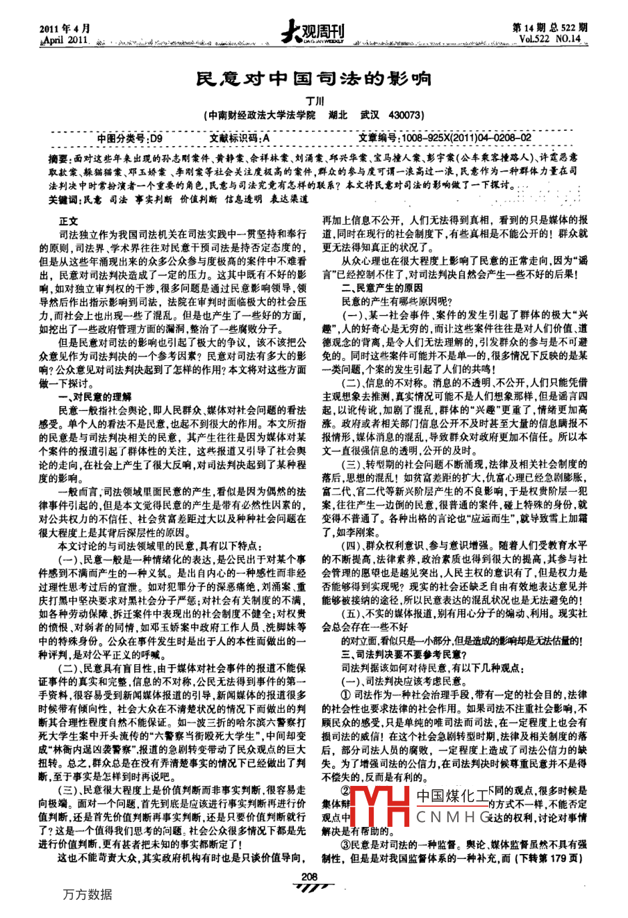 2011年4月觀(guān)周刊第14期總522期:April 2011. in.Axy. wxwisitineVol522 NO 14民復(fù)對(duì)中國(guó)司法的影響丁川中南財(cái)經(jīng)政法大學(xué)法學(xué)院湖北武漢430073)中圖分類(lèi)號(hào):文獻(xiàn)標(biāo)識(shí)碼:A文章編號(hào):100-925X(2011402068-02摘要:面對(duì)這些年來(lái)出現(xiàn)的孫志剛案件、黃靜案、佘祥林橐、劉涌案、耶興華案、寶馬撞人案、彭宇案(公車(chē)乘客撞路人)許霆惡意取款案、躲貓貓案、鄧玉嬌橐、李剛案等社會(huì)關(guān)注度極高的案件,群眾的參與度可謂一浪高過(guò)一浪,民意作為一種群體力量在司判決中時(shí)常扮演者一個(gè)重要的角色,民意與司法究竟有怎樣的聯(lián)系?本文將民意對(duì)司法的影響做了一下探討。關(guān)鍵詞:民耄司法事實(shí)判斷價(jià)值判斷信息透明表達(dá)渠道正文再加上信息不公開(kāi),人們無(wú)法得到真相,看到的只是媒體的報(bào)司法獨(dú)立作為我國(guó)司法機(jī)關(guān)在司法實(shí)踐中一貫堅(jiān)持和奉行道同時(shí)在現(xiàn)行的社會(huì)制度下,有些真相是不能公開(kāi)的!群眾就的原則,司法界學(xué)術(shù)界往往對(duì)民意干預(yù)司法是持否定態(tài)度的,更無(wú)法得知真正的狀況了。但是從這些年涌現(xiàn)出來(lái)的眾多公眾參與度極高的案件中不難看從眾心理也在很大程度上影響了民意的正常走向因?yàn)椤爸{出,民意對(duì)司法判決造成了一定的壓力。這其中既有不好的影言”已經(jīng)控制不住了對(duì)司法判決自然會(huì)產(chǎn)生一些不好的后果!響,如對(duì)獨(dú)立審判權(quán)的干涉很多問(wèn)題是通過(guò)民意影響領(lǐng)導(dǎo),領(lǐng)二民意產(chǎn)生的原因?qū)缓笞鞒鲋甘居绊懙剿痉?法院在審判時(shí)面臨極大的社會(huì)壓民意的產(chǎn)生有哪些原因呢?力,而社會(huì)上也出現(xiàn)一些了混亂。但是也產(chǎn)生了一些好的方面,(一)某一杜會(huì)事件案件的發(fā)生引起了群體的極大“興如挖出了一些政府管理方面的漏洞整治了一些腐敗分子。趣”,人的好奇心是無(wú)窮的,而讓這些案件往往是對(duì)人們價(jià)值、道但是民意對(duì)司法的影響也引起了極大的爭(zhēng)議,該不該把公德觀(guān)念的背離是令人們無(wú)法理解的,引發(fā)群眾的參與是不可避眾意見(jiàn)作為司法判決的一個(gè)參考因素?民意對(duì)司法有多大的影免的。同時(shí)這些案件可能并不是單一的,很多情況下反映的是某響?公眾意見(jiàn)對(duì)司法判決起到了怎樣的作用?本文將對(duì)這些方面一類(lèi)問(wèn)題,個(gè)案的發(fā)生引起了人們的共鳴!做一下探討。(二)、信息的不對(duì)稱(chēng)。消息的不透明、不公開(kāi),人們只能憑借對(duì)民意的理解主觀(guān)想象去推測(cè),真實(shí)情況可能不是人們想象那樣,但是謠言四民意一般指社會(huì)輿論,即人民群眾、媒體對(duì)社會(huì)問(wèn)題的看法起,以訛傳訛,加劇了混亂,群體的“興趣"更重了,情緒更加高感受。單個(gè)人的看法不是民意也起不到很大的作用。本文所指漲。政府或者相關(guān)部門(mén)信息公開(kāi)不及時(shí)甚至大量的信息瞞報(bào)不的民意是與司法判決相關(guān)的民意,其產(chǎn)生往往是因?yàn)槊襟w對(duì)某報(bào)情形媒體消息的混亂,導(dǎo)致群眾對(duì)政府更加不信任。所以本個(gè)案件的報(bào)道引起了群體性的關(guān)注,這些報(bào)道又引導(dǎo)了社會(huì)輿文一直很強(qiáng)信息的透明,公開(kāi)的及時(shí)。論的走向,在社會(huì)上產(chǎn)生了很大反響,對(duì)司法判決起到了某種程(三)轉(zhuǎn)型期的社會(huì)問(wèn)題不斷涌現(xiàn)法律及相關(guān)社會(huì)制度度的影響。落后,思想的混亂!如貧富差距的擴(kuò)大,仇富心理已經(jīng)急劇膨脹般而言,司法領(lǐng)域里面民意的產(chǎn)生,看似是因?yàn)榕既坏姆ǜ欢⒐俣刃屡d階層產(chǎn)生的不良影響,于是權(quán)貴階層一犯律事件引起的但是本文覺(jué)得民意的產(chǎn)生是帶有必然性因素的,案往往產(chǎn)生一邊倒的民意很普通的案件,碰上特殊的身份就對(duì)公共權(quán)力的不信任、社會(huì)貧富差距過(guò)大以及種種社會(huì)問(wèn)題在變得不普通了。各種出格的言論也應(yīng)運(yùn)而生”就導(dǎo)致雪上加霜很大程度上是其背后深層性的原因了,如李剛案本文討論的與司法領(lǐng)域里的民意具有以下特點(diǎn)(四)、群眾權(quán)利意識(shí)參與意識(shí)增強(qiáng)。隨著人們受教育水平(一)、民意一般是一種情緒化的表達(dá),是公民出于對(duì)某個(gè)事的不斷提高法律素養(yǎng)政治素質(zhì)也得到很大的提高,其參與社件感到不滿(mǎn)而產(chǎn)生的一種義氛。是出自?xún)?nèi)心的一種感性而非經(jīng)會(huì)管理的愿望也是越見(jiàn)突出,人民主權(quán)的意識(shí)有了,但是權(quán)力是過(guò)理性思考過(guò)后的宣泄。如對(duì)犯罪分子的深?lèi)和唇^,劉涌案、重否能夠得到實(shí)現(xiàn)呢?現(xiàn)實(shí)的社會(huì)還缺乏自由有效地表達(dá)意見(jiàn)并慶打黑中堅(jiān)決要求對(duì)黑社會(huì)分子嚴(yán)懲;對(duì)社會(huì)有關(guān)制度的不滿(mǎn),能夠被接納的途徑所以民意表達(dá)的混亂狀況也是無(wú)法避免的!如各種勞動(dòng)保障拆遷案件中表現(xiàn)出的社會(huì)