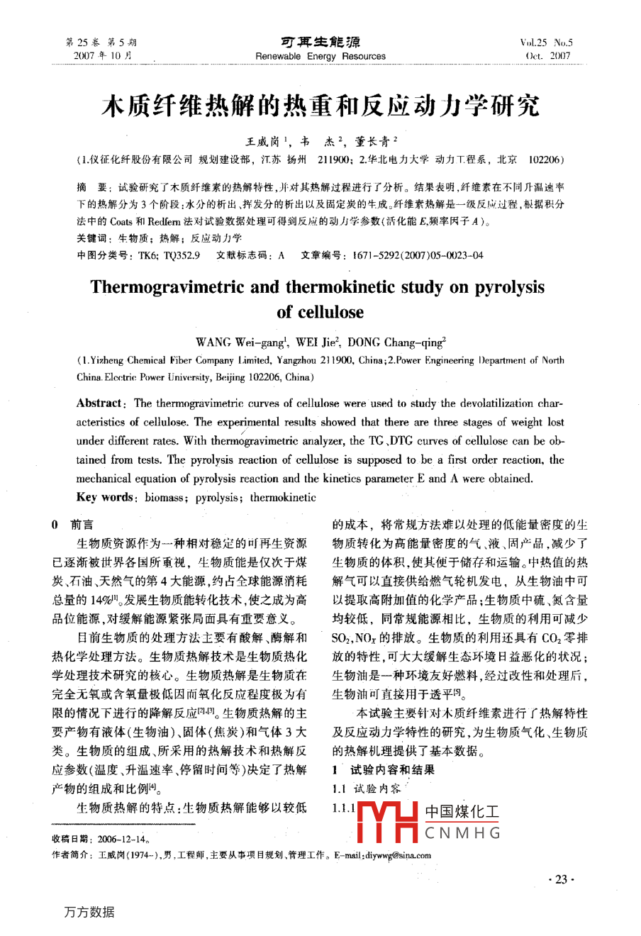 木質(zhì)纖維熱解的熱重和反應(yīng)動(dòng)力學(xué)研究