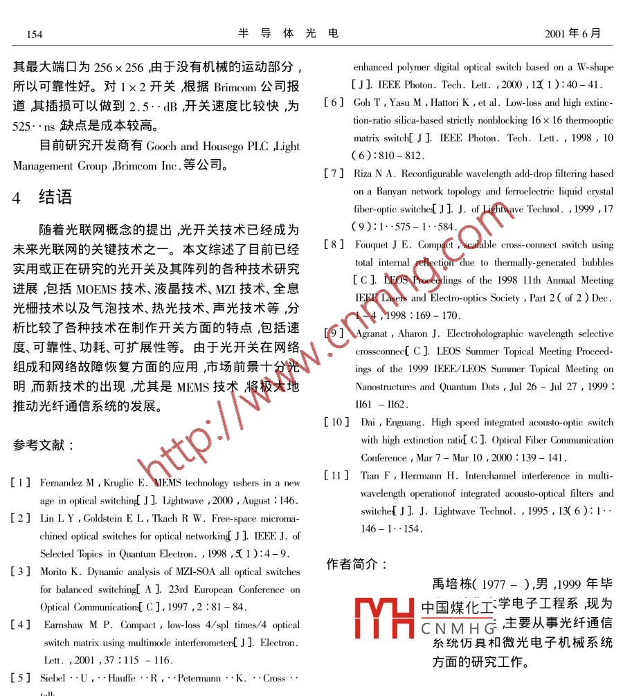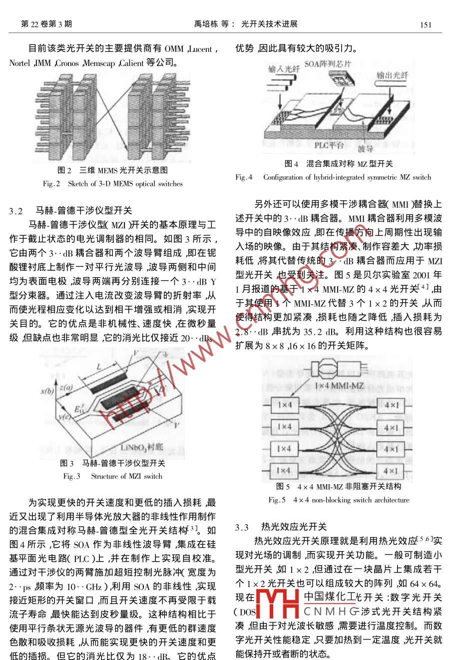2001年6月Jme200年文章編號(hào):1001- 5868( 2001 )03 - 0149 - 06光開關(guān)技術(shù)進(jìn)展禹培棟,王國忠,陳明華,謝世鐘(清華大學(xué)電子工程系北京10084 )摘要:隨著密集波分復(fù)用技術(shù)的應(yīng)用以及光聯(lián)網(wǎng)的提出光開關(guān)技術(shù)已經(jīng)成為未來光聯(lián)網(wǎng)的關(guān)鍵技術(shù)之-。光開關(guān)廣泛應(yīng)用于交叉連接設(shè)備、保護(hù)倒換、分插復(fù)用器等各種設(shè)備中。綜述了目前已經(jīng)實(shí)用或正在研究的光開關(guān)及陣列的各種制作技術(shù)包括微光電子機(jī)械技術(shù)、液晶技術(shù)、全息光柵技術(shù)以及氣泡技術(shù)、熱光技術(shù)及聲光技術(shù)等詳細(xì)分析了各種技術(shù)相應(yīng)的發(fā)展?fàn)顩r、技術(shù)特點(diǎn)和應(yīng)用范圍并分析了其發(fā)展的趨勢。關(guān)鍵詞:光開關(guān);光聯(lián)網(wǎng);密集波分復(fù)用;微光電子機(jī)械系統(tǒng)中圖分類號(hào): TN25 ;TN929.11文獻(xiàn)標(biāo)識(shí)碼: ARecent Progress in Optical SwitchingYU Pei-dong , WANG Guo-zhong , CHEN Ming-hua , XIE Shi-zhong( Dept. of Electronic Engineering , Tsinghua University , Beijing 100084 , China )Abstract : With the application of dense wavelength division multiplexing and the advance in opticaltransport network , optical switching has become one of the key techniques for the future. Optical switches canbe applied in optical cross connects and optical add/ drop multiplexing , etc. In this paper ,many kinds ofmanufacture technologies are presented ,including micro-opto-electro- mechanical- system,liquid crystals , holo-grams, liquid gratings , bubbles , and acousto-optics. Different applications and recent progress of variousswitching technologies are discussed.Key words : optical switching ; optical transport network ; DWDM ; MOEMS1引言2光開關(guān)應(yīng)用范圍介紹隨著光纖通信技術(shù)的發(fā)展和密集波分復(fù)用光開關(guān)是全光交換中的關(guān)鍵器件,可實(shí)現(xiàn)在全(DWDM)系統(tǒng)的應(yīng)用,光聯(lián)網(wǎng)(OTN)已經(jīng)成為網(wǎng)絡(luò):光層的路由選擇、波長選擇、光交叉連接以及自愈保發(fā)展的趨勢,光開關(guān)技術(shù)已經(jīng)成為未來光聯(lián)網(wǎng)的關(guān)護(hù)等功能。目前光開關(guān)主要應(yīng)用包括1-4]:鍵技術(shù)之一。光聯(lián)網(wǎng)的實(shí)現(xiàn)主要依賴于光開關(guān)、光( 1 )光交叉連接( 0XC) 0XC由光開關(guān)矩陣組濾波器、新一代放大器、密集波分復(fù)用技術(shù)等器件和成主要實(shí)現(xiàn)動(dòng)態(tài)光路徑管理、光網(wǎng)絡(luò)的故障保護(hù)、技術(shù)的進(jìn)展。其中DWDM技術(shù)的發(fā)展是推動(dòng)光纖靈活增加新業(yè)務(wù)等。光交叉連接對開關(guān)的要求主要通信網(wǎng)絡(luò)發(fā)展的重要因素而光聯(lián)網(wǎng)的提出將使設(shè)有低中國煤化工以及無阻塞運(yùn)作。目備制造商、電信運(yùn)營商都面臨巨大的機(jī)遇與挑戰(zhàn)。前微CNMHG術(shù)已經(jīng)在光交換應(yīng)用中進(jìn)入了現(xiàn)場實(shí)驗(yàn)階段1]由于其對波長、數(shù)據(jù)速率和信號(hào)格式都透明在不遠(yuǎn)的將來有希望實(shí)現(xiàn)光層收稿日期2000- 10-31.基金項(xiàng)目國家863計(jì)劃光電子主題項(xiàng)目( 863- 307- 15-3).上的交換;(2)用光開關(guān)實(shí)現(xiàn)網(wǎng)絡(luò)的自動(dòng)保護(hù)倒換。當(dāng)光150半導(dǎo)體光電2001年6月纖斷裂或傳輸發(fā)生故障時(shí)就可以通過光開關(guān)改變mso這種二維技術(shù)受光程損耗的限制最大可以實(shí)業(yè)務(wù)的傳輸路徑實(shí)現(xiàn)對業(yè)務(wù)的保護(hù)。通常這種保現(xiàn)32x32端口不過可以將多個(gè)子系統(tǒng)連接起來形護(hù)倒換只需1 x2端口的光開關(guān)就可以實(shí)現(xiàn);成更大的交叉矩陣。(3)用1x N光開關(guān)實(shí)現(xiàn)網(wǎng)絡(luò)監(jiān)控。在遠(yuǎn)端光一般MEMS光開關(guān)的開關(guān)時(shí)間都在毫秒量級(jí),纖測試點(diǎn)通過1x N光開關(guān)把多根光纖接到-個(gè)光在與其他技術(shù)比較中處于劣勢。另外,由于MEMS時(shí)域反射儀( OTDR )上通過光開關(guān)倒換實(shí)現(xiàn)對所有光開關(guān)是利用微鏡的機(jī)械轉(zhuǎn)動(dòng)來實(shí)現(xiàn)開關(guān)功能的,光纖的監(jiān)測。另外,利用光開關(guān)也可以在光纖線路所以任何機(jī)械摩擦、磨損以及外部振動(dòng)都可能使它中插入網(wǎng)絡(luò)分析儀實(shí)現(xiàn)網(wǎng)絡(luò)在線分析;的可靠性降低。驅(qū)動(dòng)結(jié)構(gòu)方面,目前靜電和磁感應(yīng)(4)光纖通信器件測試。光器件、光纜以及子逐漸成為MEMS光開關(guān)的主要選擇。靜電驅(qū)動(dòng)能力系統(tǒng)產(chǎn)品在測試過程中,可以使用光開關(guān)同時(shí)測試.較低而磁感應(yīng)驅(qū)動(dòng)還需要解決系統(tǒng)的屏蔽、封裝以多個(gè)器件,從而簡化測試提高效率;及可靠性問題。因此靜電驅(qū)動(dòng)方案目前仍是首選,(5)光上下路復(fù)用( OADM)。 光上下路復(fù)用器而且已經(jīng)有很多靜電驅(qū)動(dòng)的開關(guān)產(chǎn)品投入市場。主要應(yīng)用于環(huán)形的城域網(wǎng)中,實(shí)現(xiàn)單個(gè)波長和多個(gè)波長從光路上自由上下。用光開關(guān)實(shí)現(xiàn)的OADM可以通過軟件控制動(dòng)態(tài)上下任意波長,這樣將增加網(wǎn