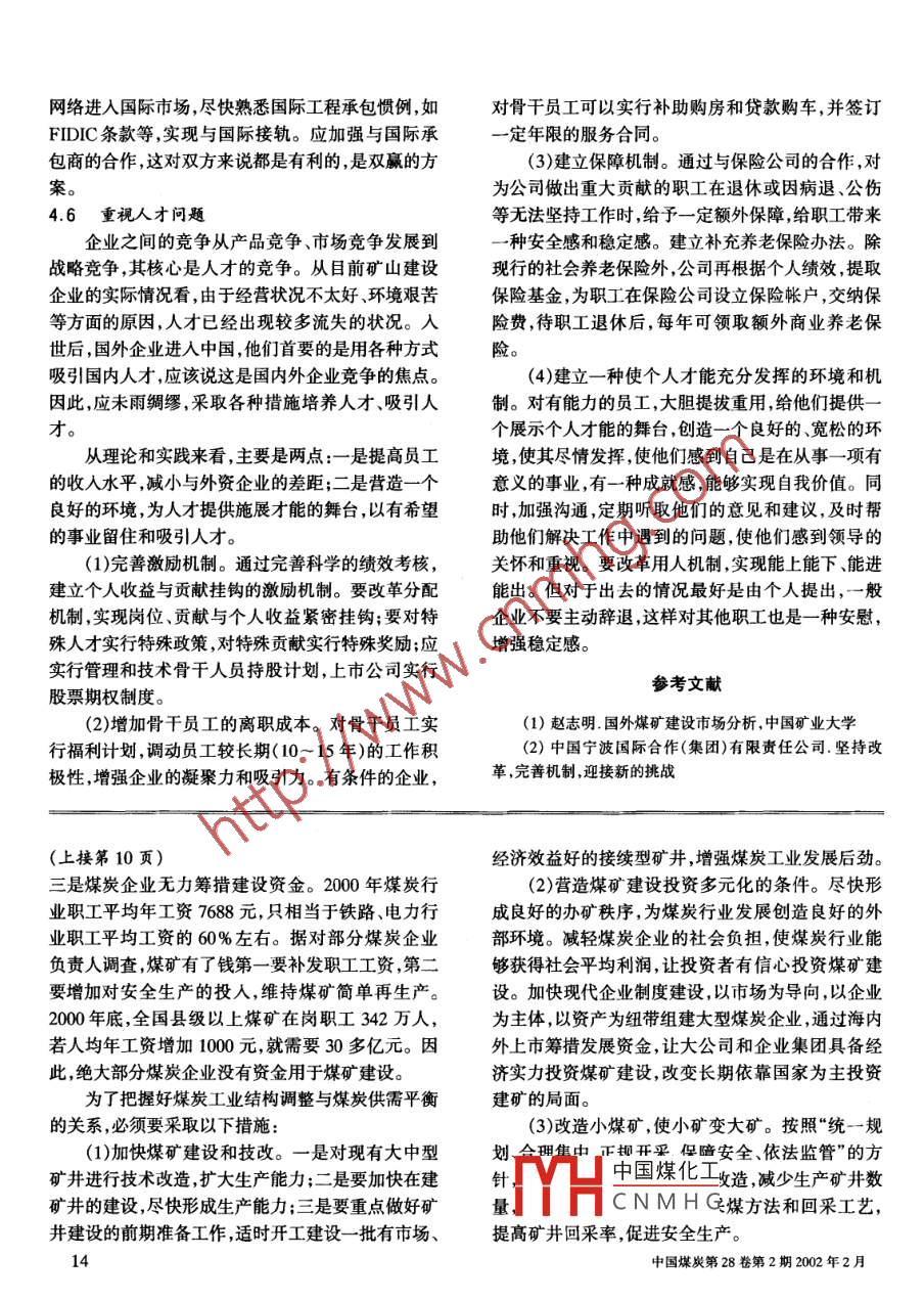 ★經濟廣場★把握好煤炭工業(yè)結構調整與煤炭供需平衡的關系吳吟嚴天科(國家經貿委行業(yè)規(guī)劃司,北京市宣武區(qū), 100053) .摘要認為2001年煤炭經濟運行向好的原因是煤炭需求量增加,供給量相對減少。根據(jù)“十五”期間國民經濟發(fā)展對煤炭的需求情況,提出必須重視未來煤炭供需平衡的問題。要加快煤礦建設和技改力度;要營造煤礦建設投資多元化的條件;要對依法開辦的小煤礦進行技術改造。關鍵詞結構調整供需平衡煤炭工業(yè)產后,可緩解局部地區(qū)供需緊張的矛盾。12001 年煤炭經濟運行向好的原因分析2001年以來,隨著煤炭工業(yè)結構調整力度加2必須重視未來煤炭供需平衡問題大,煤炭生產平穩(wěn)、銷售量增加、價格總體回升、庫存“十五”期間,煤炭工業(yè)既要保證國民經濟發(fā)展對下降、被拖欠的煤款減少,煤炭經濟運行向好的方面煤炭的需要,又要大力優(yōu)化生產結構,實現(xiàn)安全生產發(fā)展。同時,煤炭市場供需趨于平衡,局部地區(qū)出現(xiàn)和促進產業(yè)升級。據(jù)預測,“十五”期間國內煤炭需求了煤炭供應偏緊的現(xiàn)象。量年均增加2000萬t。同時,經濟與社會發(fā)展,又迫煤炭經濟運行向好的方面發(fā)展的重要原因, - .切要求淘汰浪費、破壞煤炭資源的小煤礦,關閉和限是煤炭需求量增加,二是供給量相對減少。從需求制高硫煤煤礦生產,再加上資源枯竭煤礦報廢,考慮方面看,2001年,國內生產總值增長7.3%,主要耗到這些減產因素,必須重視未來煤炭供需平衡問題。煤產品,如火電、鋼鐵、水泥等較.上年增長9%左右;我國的煤炭工業(yè)不能建立在小煤礦的基礎上,煤炭出口8590萬t,較2001年增加2706萬t,同比,必須要有一大批現(xiàn)代化礦井支撐。而目前的現(xiàn)狀:增長了46%。從供給方面看,2001年國家加大了關一是現(xiàn)有大中型煤礦生產能力不足。2000 年底,我閉非法及布局不合理小煤礦的工作力度,4月份國國年生產能力3萬t以上的國有礦井有2200個,核務院實行了關于特別重大事故行政責任追究制度,6定年生產能力不足8億t。由于近年來煤炭行業(yè)經月份國務院辦公廳下發(fā)了關于關閉所有國有煤礦礦濟困難,大部分煤礦的生產基礎薄弱,表現(xiàn)在設備老辦小井和鄉(xiāng)鎮(zhèn)煤礦停產整頓的通知,9月份在鄭州化,采掘接續(xù)緊張、后續(xù)能力不足。在局部地區(qū)煤炭又召開了關閉整頓小煤礦和煤礦安全生產工作現(xiàn)場供給偏緊、價格恢復性增長的情況下,一些國有大礦會議。這一-系列的舉措,使全國鄉(xiāng)鎮(zhèn)煤礦產量大幅超能力開采,對安全生產構成嚴重威脅。二是大中下降。尤其是華東、中南一些地區(qū)鄉(xiāng)鎮(zhèn)煤礦產量的型煤礦建設滯后。改革開放以來,我國煤炭產量增下降,對長期依靠當?shù)剜l(xiāng)鎮(zhèn)煤礦供煤的用戶,特別是長主要依靠鄉(xiāng)鎮(zhèn)煤礦產量的增加。近10年來,大中用煤大戶電廠來說,出現(xiàn)了用煤緊張,加之鐵路調運型煤礦建設規(guī)模逐步減少,“八五”期間煤礦開工建煤炭難以彌補這一新增缺口,更加劇了這些地區(qū)煤設規(guī)模為10895萬t,“九五”期間僅為3370萬t。由炭供需的矛盾。事實上,2001年下半年“三西”地區(qū)于煤礦建設周期長,隨著“十五”期間結構調整加快,的一些大礦煤由于受外運條件的制約,仍然運不出中國煤化工及時適度安排大中型去。目前,鄉(xiāng)鎮(zhèn)煤礦生產潛力仍有4億t以上,隨著煤碼MYHC N M H GH將會逐步顯現(xiàn)出來。煤礦停產整頓驗收工作逐步進展,鄉(xiāng)鎮(zhèn)煤礦恢復生(下轉第14頁)10中國煤炭第28卷第2期2002年2月.網絡進人國際市場,盡快熟悉國際工程承包慣例,如對骨千員工可以實行補助購房和貸款購車,并簽訂FIDIC條款等,實現(xiàn)與國際接軌。應加強與國際承一定年限的服務合同。包商的合作,這對雙方來說都是有利的,是雙贏的方(3)建立保障機制。通過與保險公司的合作,對案。為公司做出重大貢獻的職工在退休或因病退、公傷4.6重視人才 問題等無法堅持工作時,給予- -定額外保障,給職工帶來企業(yè)之間的競爭從產品競爭、市場競爭發(fā)展到-種安全感和穩(wěn)定感。建立補充養(yǎng)老保險辦法。除戰(zhàn)略競爭,其核心是人才的競爭。從目前礦山建設現(xiàn)行的社會養(yǎng)老保險外,公司再根據(jù)個人績效,提取企業(yè)的實際情況看,由于經營狀況不太好、環(huán)境艱苦保險基金,為職工在保險公司設立保險帳戶,交納保等方面的原因,人才已經出現(xiàn)較多流失的狀況。人險費,待職工退休后,每年可領取額外商業(yè)養(yǎng)老保世后,國外企業(yè)進入中國,他們首要的是用各種方式驗。吸引國內人才,應該說這是國內外企業(yè)競爭的焦點。(4)建立一種使個人才能充分發(fā)揮的環(huán)境和機因此,應未雨綢繆,采取各種措施培養(yǎng)人才、吸引人制。對有能力的員工,大膽提拔重用,給他們提供一才。個展示個人才能的舞臺,創(chuàng)造-一個良好的、寬松的環(huán)從理論和實踐來看,主要是兩點:-是提高員工境,使其盡情發(fā)揮,使他們感到自己是在從事- -項有的收入水平,減小與外資企業(yè)的差距;二是營造-一個意義的事業(yè),有一種成就感,能夠實現(xiàn)自我價值。同良好的環(huán)境,為人才提供施展才能的舞臺,以有希望時,加強溝通,定期聽取他們