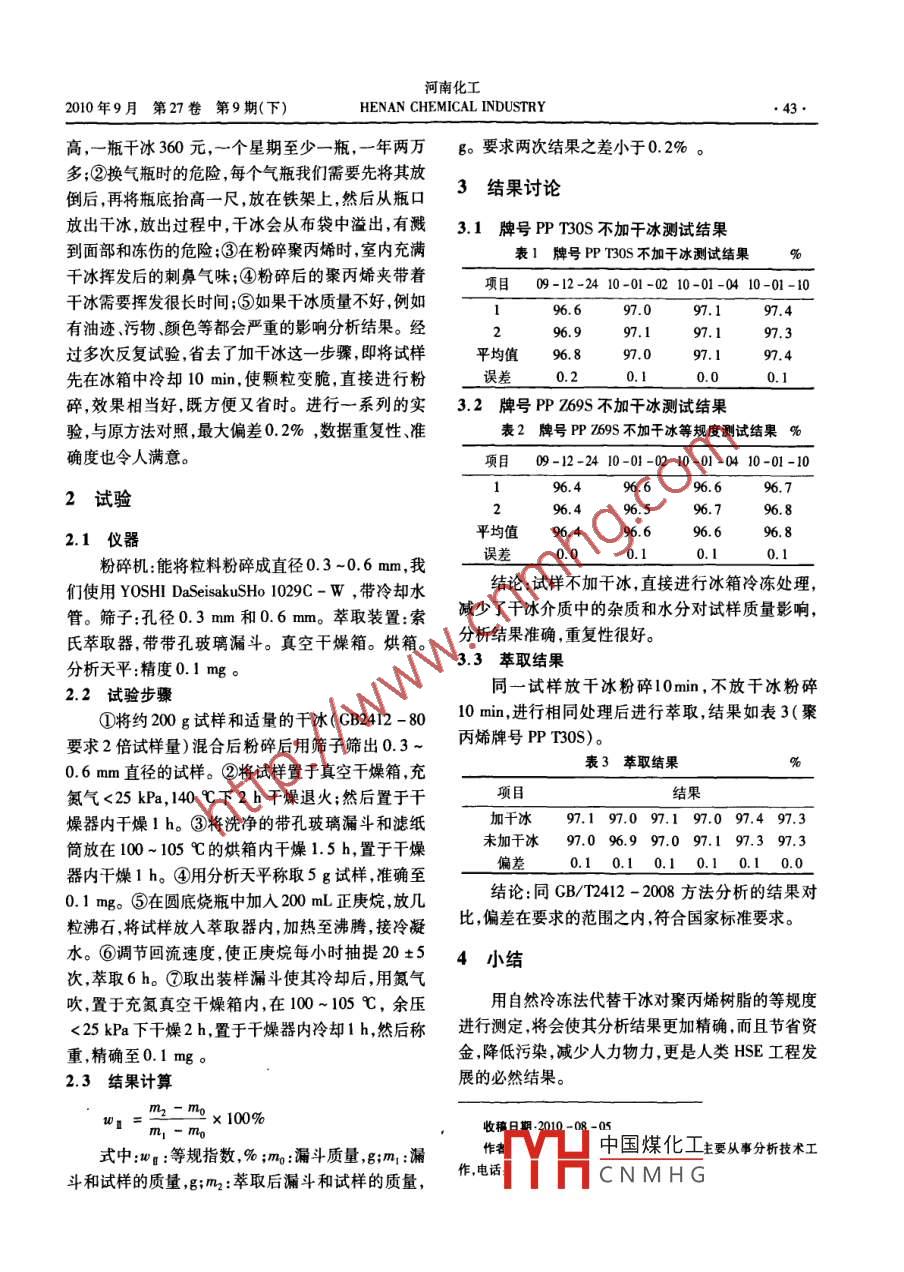 河南化工HENAN CHEMICAL INDUSTRY2010年9月第27卷第9期(下)聚丙烯等規(guī)度測定方法的改進丁敏(中國石油大連石化公司質(zhì)量環(huán)保檢測中心,遼寧大連116031)【摘要】介紹了用自然冷凍法代替干冰對聚丙烯樹脂的等規(guī)度測定方法使聚丙烯等規(guī)度分析結(jié)果更加準(zhǔn)確,并節(jié)省資金,降低分析成本,減少了空氣污染,更避免了人員更換氣瓶放干冰時的危險?!娟P(guān)鍵詞】聚兩烯;等規(guī)度;干冰【中圖分類號】0655【文獻標(biāo)識碼】B【文章編號】1003-3467(2010)18-0042-021引言行粉碎然后放入干燥箱內(nèi)進行干燥、退火,取出后恒溫稱重經(jīng)正庚烷萃取,最后計算出不溶于沸騰正聚丙烯等規(guī)度的測定目前采用B/T2412-庚烷的聚丙烯的質(zhì)量占試樣質(zhì)量的百分?jǐn)?shù)200方法分析,將聚內(nèi)烯與一定量的干冰混合后進對于干冰的使用一直存在幾個問題。①費用較器器222器護》8》護加示加加決加決222上,王水濃度達到6%以上對結(jié)果影響較大,隨著鹽酸的酸度的不斷增加,吸光度減小。硝酸濃度達到10%以上才出現(xiàn)吸光度減少的趨勢。而王水對測定影響實際上也是鹽酸的影響。因此在樣品處理過程中選用王水作溶劑時,濃度應(yīng)該控制在6%以內(nèi)。2.3共存離子的影響測定10mg/L鋰,相對偏差小于±5%時,以下濃度/mg·L離子(以mg/L計):A13”、Si(1.45×103)、Sn2、P、W、K、Ca2+、Na、Mg2、Fe2'、Cd2‘、M3、1.標(biāo)準(zhǔn)工作曲線2.標(biāo)準(zhǔn)加入曲線N2'、Ba2、Sb3、Cu2、Pb2、Co2、Zn2,Mn2圖1鋰標(biāo)準(zhǔn)工作曲線與標(biāo)準(zhǔn)加入曲線C(250)不影響催化劑中鋰的測定。2.4標(biāo)準(zhǔn)工作曲線與檢出限基體干擾,可用標(biāo)準(zhǔn)曲線法直接進行樣品分析。移取鋰標(biāo)準(zhǔn)儲備液0、0.3、0.6、…、2.1mL子2.6精密度、加標(biāo)回收試驗100mL量瓶中,加水稀釋至所需的刻度,配成含鋰稱取三種催化劑試樣各5份,按試驗方法進行03.06.0、…21.0mg/L的標(biāo)準(zhǔn)系列工作溶液,測理和測定。其相對標(biāo)準(zhǔn)偏差小于3.6%,見表1。表1精密度試驗其鋰離子的吸光度,繪制工作曲線,在0…12mg/L測量值試樣號平均值相對標(biāo)準(zhǔn)差范圍內(nèi),標(biāo)準(zhǔn)曲線呈直線。2.5標(biāo)準(zhǔn)工作曲線法與標(biāo)準(zhǔn)加入法比較0.580.560.600.580.9用鋰標(biāo)準(zhǔn)儲備液配制0、3.0、6.0、9.0、12.00.0.630.560.60mg/L鋰標(biāo)準(zhǔn)系列工作溶液,測其吸光度繪制標(biāo)準(zhǔn)曲0.530.5500.530.7然后在待測樣品溶液中加入鋰標(biāo)準(zhǔn)液配制成中國煤化工隹確度。移取已處0、3.06.09.0mg/L標(biāo)準(zhǔn)系列工作溶液,見圖1。理好CNMHGL鋰標(biāo)準(zhǔn)液?;貥?biāo)準(zhǔn)工作曲線和標(biāo)準(zhǔn)加入曲線平行說明試樣中無收率U2.6%之間。河南化工2010年9月第27卷第9期(下)HENAN CHEMICAL INDUSTRY高,一瓶干冰360元,一個星期至少一瓶,一年兩萬g。要求兩次結(jié)果之差小于0.2%多;②換氣瓶時的危險,每個氣瓶我們需要先將其放倒后再將瓶底抬高一尺,放在鐵架上,然后從瓶口3結(jié)果討論放出干冰放出過程中干冰會從布袋中溢出,有濺3.1牌號PPT30S不加干冰測試結(jié)果到面部和凍傷的危險;③在粉碎聚丙烯時,室內(nèi)充滿表1牌號PPT30S不加干冰測試結(jié)果干冰揮發(fā)后的刺鼻氣味;④粉碎后的聚丙烯夾帶著項目09-12-2410-01-0210-01-0410-01-10干冰需要揮發(fā)很長時間;⑤如果干冰質(zhì)量不好,例如97.097.1974有油跡、污物顏色等都會嚴(yán)重的影響分析結(jié)果。經(jīng)96.997.1過多次反復(fù)試驗省去了加干冰這一步驟,即將試樣平均值96897.4先在冰箱中冷卻10min,使顆粒變脆,直接進行粉誤差碎,效果相當(dāng)好,既方便又省時。進行一系列的實32牌號PZ69S不加干冰測試結(jié)果驗,與原方法對照,最大偏差0.2%,數(shù)據(jù)重復(fù)性準(zhǔn)表2牌號P69S不加干冰等規(guī)度測試結(jié)果%確度也令人滿意。項目09-12-2410-01-0210-01-0410-01-102試驗96.496.421儀器平均值96.80.1粉碎機:能將粒料粉碎成直徑0.3-0.6mm,我誤差們使用 YOSHI DaSeisaku SHo 1029C-W,帶冷卻水結(jié)論:試樣不加干冰,直接進行冰箱冷凍處理,管。篩子:孔徑0.3mm和0.6mm。萃取裝置:索減少了干冰介質(zhì)中的雜質(zhì)和水分對試樣質(zhì)量影響,氏萃取器,帶帶孔玻璃漏斗。真空干燥箱。烘箱。分析結(jié)果準(zhǔn)確,重復(fù)性很好。分析天平:精度0.1mg。3.3萃取結(jié)果2.2試驗步驟同一試樣放干冰粉碎10min,不放干冰粉碎①將約200g試樣和適量的干冰(GB2412-8010min,進行相同處理后進行萃取,結(jié)果如表3(聚要求2倍試樣量)混合后粉碎后用篩子篩出0.3-丙烯牌號PT30s)。0.6mm直徑的試樣。②將試樣置于真空干燥箱,充表3萃取結(jié)果氮氣<25kPa,140℃下2h干燥退火;然后置于干結(jié)果燥器內(nèi)干燥1h。③將洗凈的帶孔玻璃漏斗和濾紙加干冰9.19.097.197.097.4973筒放在100~105℃的烘箱內(nèi)干燥1.5h,置于干燥未加干冰97.096.997.097.197.3973偏差0.10.10.10.10.10.0器內(nèi)干燥1h。④用分析天平稱取5g試樣,準(zhǔn)確至0.1mg。⑤在圓底燒瓶中加入200mL正庚烷,放幾結(jié)論:同GB/T2412-2008方法分析的結(jié)果對粒沸石,將試樣放入萃取器內(nèi),加熱至沸騰,接冷凝比偏差在要求的范圍之內(nèi)符合國家標(biāo)準(zhǔn)要求水。⑥調(diào)節(jié)回流速度使正庚烷每小時抽提20±54小結(jié)次,萃取6h。⑦取出裝樣漏斗使其冷卻后,