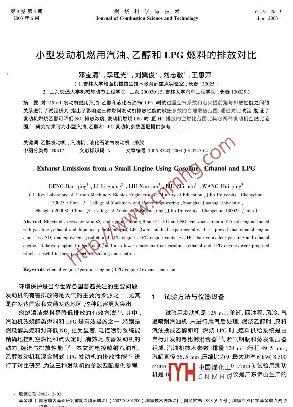小型發(fā)動機燃用汽油、乙醇和LPG燃料的排放對比