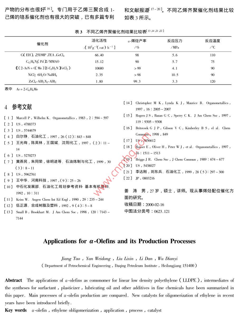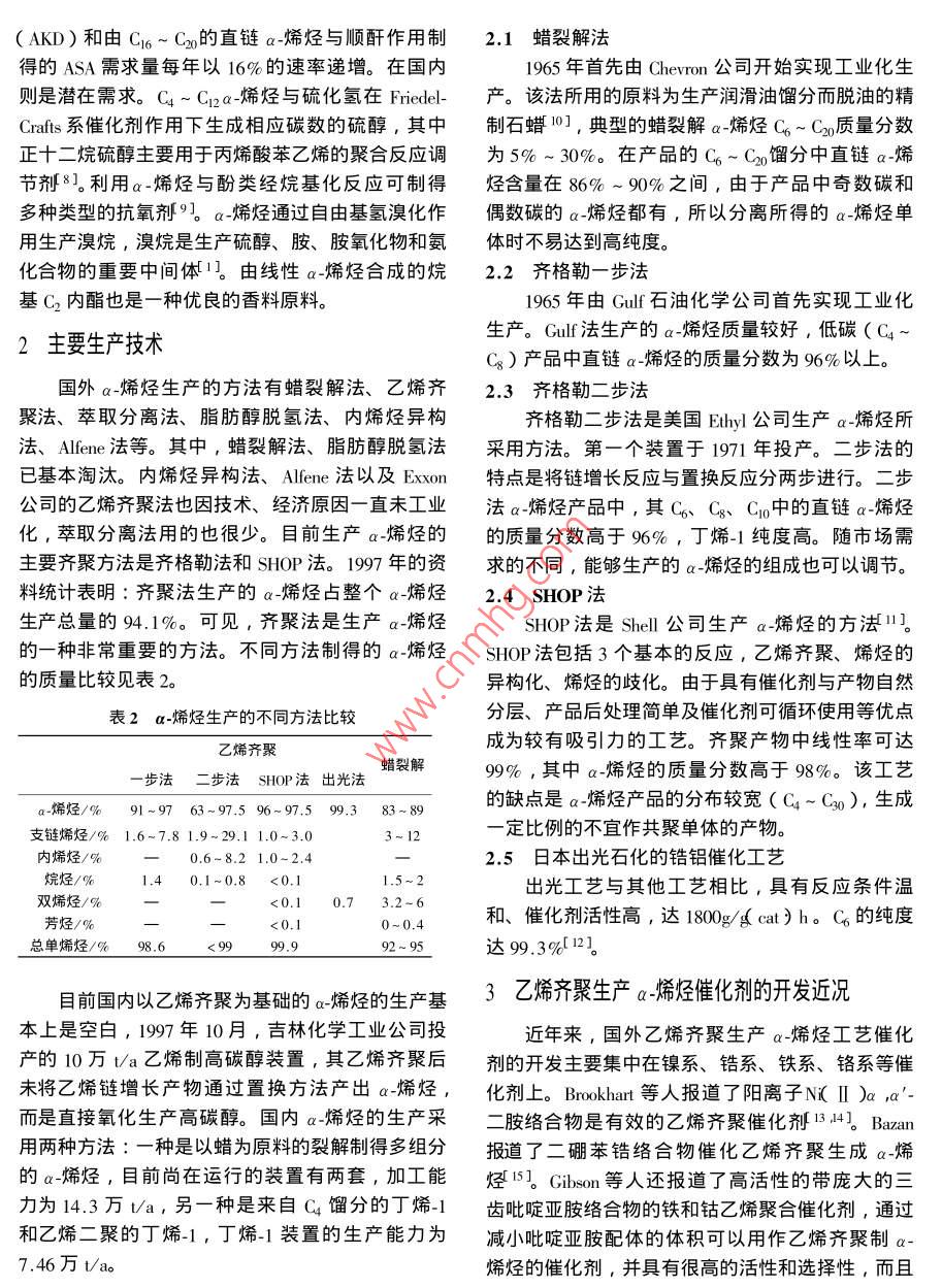 Technology Progress技術(shù)進展a.烯烴的生產(chǎn)和應(yīng)用進展姜濤閻衛(wèi)東劉立新李丹吳殿義(大慶石油學(xué)院石油化工系,安達, 151400 )提要綜述了a-烯烴作為共聚單體、表面活性劑合成中間體、增塑劑用醇、合成潤滑油和油品添加劑等領(lǐng)域應(yīng)用情況,對國內(nèi)外a-烯烴的產(chǎn)需情況、主要生產(chǎn)工藝進行了分析,對乙烯齊聚生產(chǎn)a~烯烴.的主要催化劑進行了比較。關(guān)鍵詞a-烯烴,乙烯齊聚,生產(chǎn),應(yīng)用,催化劑a-烯烴指雙鍵在分子末端的C4以,上的烯烴。石化三廠和撫順石油一廠,兩個廠的蠟總加工能力它作為共聚單體、表面活性劑合成中間體、增塑劑僅有14.3萬t/ao據(jù)預(yù)測, 2000年我國的a-烯烴需用醇、合成潤滑油和油品添加劑等廣泛應(yīng)用于許多求量將為32萬t, 2005年需求量為48萬t, 2010年領(lǐng)域,是石油化工中的一種重要原料。如Chem需求量為64萬t??梢妵鴥?nèi)a-烯烴的產(chǎn)需之間存Systems 1995年6月的一項預(yù)測,在1994~ 2005年在著很大的差距,因此研究a-烯烴的生產(chǎn)是非常a-烯烴的需求平均增長率為7.8% ,即從1994年的必要的。206.4萬t增至2005年的469.6萬t, 2010年將達.1 a-烯烴的應(yīng)用684萬t。我國雖從70年代開始以蠟裂解法生產(chǎn)a-烯烴,然而到目前為止,以乙烯齊聚為基礎(chǔ)的a-a-烯烴用途非常廣泛, a-烯烴的最終用途及分烯烴的生產(chǎn)基本.上是空白的。目前實際開工的燕山配比例見表1。表1 a-烯烴的 最終用途分配比例表美國日本全球用途數(shù)量比例/萬/%/萬:%/萬!/萬1聚乙烯共聚單體25.831.08.718.82.650.0100.048.4合成洗滌劑用醇19. 823.016.034.0.59.64.736.2增塑劑用醇8.610.03.88.2.223.1潤滑油及其添加劑14.717.012.226..9.8烷基甲胺及烷基二甲胺AOS等表面活性劑2.00.3).60.611.5脂肪酸1.7硫醇和烯基丁二酸酐10.412.05.31.55.811.9( ASA)等其他用途總計86.346.3100.0 .5.2206.4( Chem Systems, 1994年)1.1 乙烯共聚單體a-烯烴用作線型低密度聚乙烯( LLDPE)的共聚單線性低密度聚乙烯( LLDPE)是70年代出現(xiàn)體,可改善聚乙烯的機械加工性能、耐熱性、柔軟的”第三代聚乙烯”,是乙烯與a~烯烴共聚的新型性、透明性等1。目前國內(nèi)聚乙烯共聚單體全部用聚乙烯樹脂,熔體延伸性大,具有良好的抗拉強1-丁烯?,F(xiàn)有1-丁烯生產(chǎn)能力約6.4萬t/a,而每度、抗沖擊強度及耐環(huán)境應(yīng)力開裂性。Ca~ Cro年作為共聚單體所需的a-烯烴就達10萬i之多。化工進展2001 年第3期171995年國內(nèi)LLDPE 生產(chǎn)能力為56.5萬t/a,實際歐、日本等發(fā)達國家生產(chǎn)高碳增塑劑醇的技術(shù)不斷產(chǎn)量17.8萬t ,大部分設(shè)備用來生產(chǎn)HDPE.除了發(fā)展,產(chǎn)量不斷增加,高碳增塑劑醇的生產(chǎn)量都在后加工應(yīng)用未能配套外,缺乏1-己烯、1-辛烯作共幾萬t到幾十萬t左右,其消費的比例也較大。我聚單體也是重要原因之一。此外,在改善LLDPE國對直鏈醇增塑劑的需求將達到4~5萬t/a,目前抗撕裂強度和破壞強度等性能方面,1-丁烯不及1-仍以生產(chǎn)C4醇和Cg醇為主,Cg以上高碳增塑劑醇己烯和1-辛烯。在1997年以前全部需要進口。吉林化學(xué)工業(yè)公司1.2 表面活性劑合成中間體10萬t/a的高碳醇裝置提供Cg~ Cro混合直鏈偶碳以a-烯烴為原料,通過羰基化合成反應(yīng)可以醇用于高碳增塑劑的生產(chǎn),可以部分緩解高碳增塑制得醇。碳數(shù)大于11的醇主要用于合成洗滌劑2]。劑醇酯和原料醇依賴進口的局面。然而,仍然難以洗滌劑醇的原料既可用直鏈a-烯烴,也可用內(nèi)烯完全滿足多功能增塑劑品種和數(shù)量的需求5。烴。前者制得的洗滌劑醇直鏈度可高達87%,且1.4合成潤滑油和油品添加劑生物降解性好,后者制得的洗滌劑醇的直鏈度僅a-烯烴可以氧化合成脂肪酸,特別是奇碳數(shù)脂76%~80%,生物降解性能相對差-些。直接磺化肪酸,是生產(chǎn)潤滑劑的最好原料6。由1-癸烯或1-線性a-烯烴得到線性a-烯烴的磺酸鹽、異構(gòu)的烯辛烯齊聚而得聚a~烯烴( polyalphaolefin , PAO),是烴磺酸和烷烴砜的混合物,它在硬水或低濃度中是一種低粘度、低傾點、高粘度指數(shù)、化學(xué)和熱穩(wěn)定良好的洗滌劑,具有良好的生物降解性、溶解性和性好的優(yōu)質(zhì)合成潤滑油。以PAO為基礎(chǔ)油能生起泡性,是優(yōu)良的陰離子合成洗滌劑。通過苯與磺產(chǎn)出國際標(biāo)準(zhǔn)化組織( ISO)確定的各種粘度等級化線性a_烯烴的Friedel-Crafts反應(yīng)合成--種重要的的工業(yè)潤滑油。由于其粘度指數(shù)較高,可以減少聚家用洗滌劑-烷基苯磺酸鹽$3]。由Co~ Ciga-烯合物或高粘度級別礦物油的使用,這些物質(zhì)在高溫?zé)N制得的氫化脂肪胺(一種非離子表面活性劑)對時也易于降解。聚a-_烯烴合成潤滑油具有傾點低、皮膚作用柔和、泡沫穩(wěn)定性好。Co~ C,的a-烯烴低溫性能好、粘度指數(shù)高、對添加劑感受性好、高合成的Cio~ Cx脂肪酸,是生產(chǎn)陽離子表面活性劑溫下安定性好等優(yōu)點,多用于苛刻的使用環(huán)境中。和肥皂的原料6。其次,C14~ Ci6a-烯烴經(jīng)SO,磺目前國內(nèi)合成潤滑油生產(chǎn)能力約3.7~4.4萬t/ao化,再與氫氧化鈉反應(yīng)生成a烯烴磺酸鈉( AOS),由于采用蠟裂解路線,合成原料線性a-烯烴中異.是優(yōu)良的陰離子表面活性劑。由于目前環(huán)境污染問構(gòu)烯烴含量較高,因而合成潤滑油的粘度指數(shù)和溴題