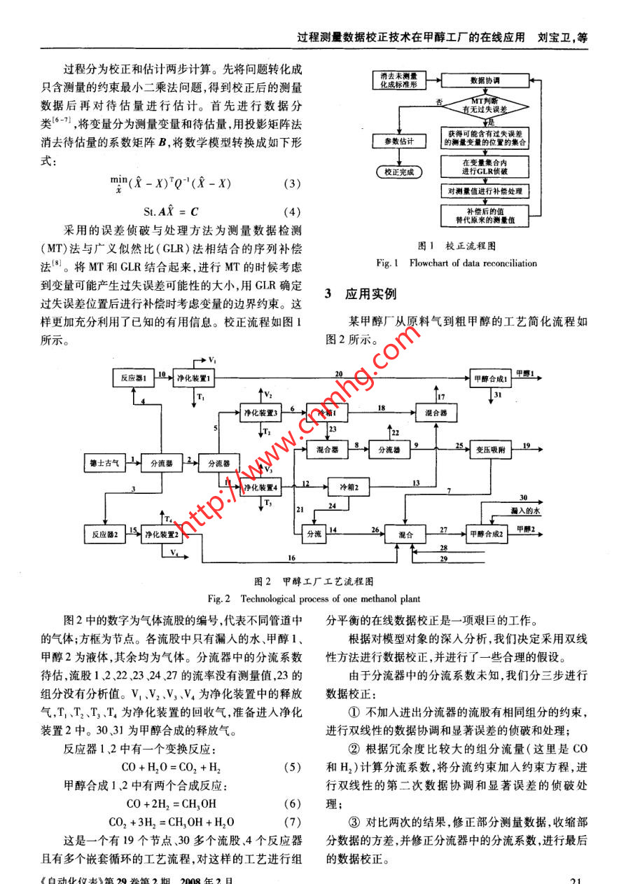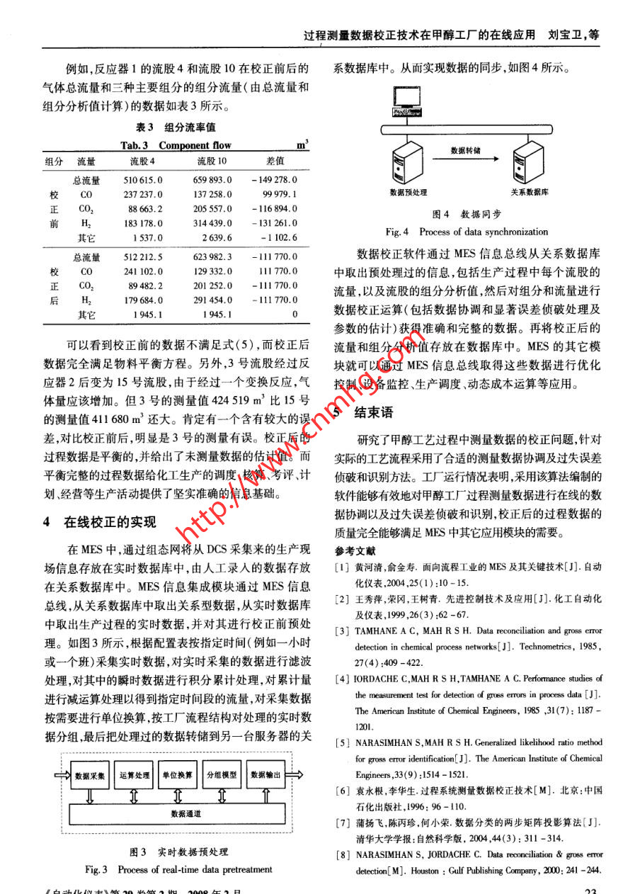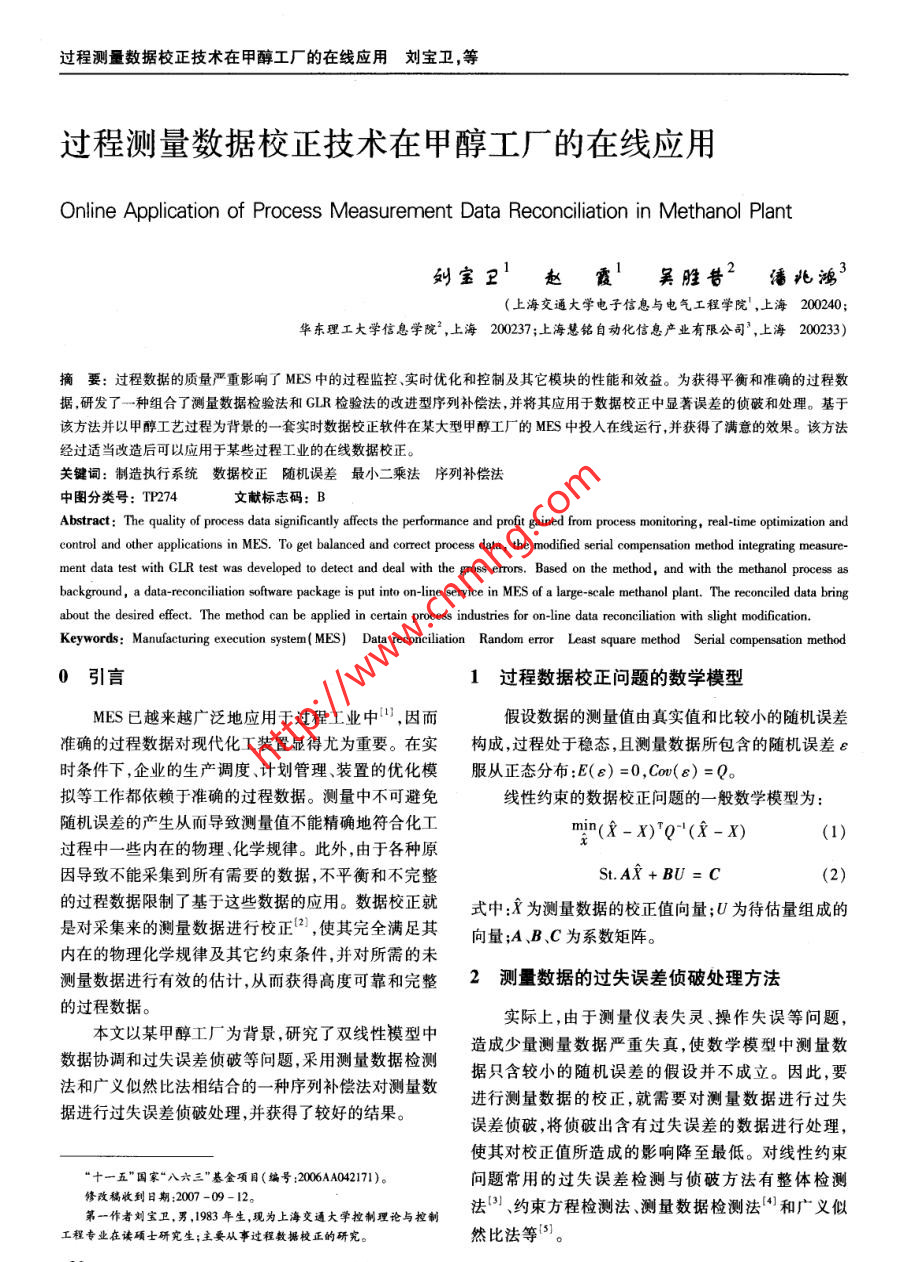 過(guò)程測(cè)量數(shù)據(jù)校正技術(shù)在甲醇工廠的在線應(yīng)用劉寶衛(wèi),等過(guò)程測(cè)量數(shù)據(jù)校正技術(shù)在甲醇工廠的在線應(yīng)用Online Application of Process Measurement Data Reconciliation in Methanol Plant劉寶衛(wèi)'趙霞'吳勝昔2潘兆鴻’(上海交通大學(xué)電子信息與電氣工程學(xué)院' ,上海200240;華東理工大學(xué)信息學(xué)院,上海200237;上海慧銘 自動(dòng)化信息產(chǎn)業(yè)有限公司’,上海20023)摘要:過(guò)程數(shù)據(jù)的質(zhì)量嚴(yán)重影響了MES中的過(guò)程監(jiān)控、實(shí)時(shí)優(yōu)化和控制及其它模塊的性能和效益。為獲得平衡和準(zhǔn)確的過(guò)程數(shù)據(jù),研發(fā)了-種組合了測(cè)量數(shù)據(jù)檢驗(yàn)法和GLR檢驗(yàn)法的改進(jìn)型序列補(bǔ)償法,并將其應(yīng)用于數(shù)據(jù)校正中顯著誤差的偵破和處理。基于該方法并以甲醇工藝過(guò)程為背景的一套實(shí)時(shí) 數(shù)據(jù)校正軟件在某大型甲醇工廠的MES中投人在線運(yùn)行,并獲得了滿意的效果。該方法經(jīng)過(guò)適當(dāng)改造后可以應(yīng)用于某些過(guò)程工業(yè)的在線數(shù)據(jù)校正。關(guān)鍵詞:制造執(zhí)行系統(tǒng)數(shù)據(jù)校正隨機(jī)誤差 最小二乘法 序列補(bǔ)償法中國(guó)分類(lèi)號(hào): TP274文獻(xiàn)標(biāo)志碼: BAbstract: The quality of process data significantly afcts the perormance and profit gained from process monitoring, real-ime optimization andcontrol and other applications in MES. To get balanced and correct process data, the modified serial compensation method integraing measure-ment data test with CLR test was developed to detect and deal with the gross errors. Based on the method, and with the methanol process asbackground , a da-reconciliation sofware package is put into on-line service in MES of a large -scale methanol plant. The reconciled data bringabout the desired efect. The method can be applied in certain process industries for on-ine data reconciliation with slight modifcation.Keywords: Manufacturing execution system( MES) Data reconciliation Random error Least square method Serial compensation method0引言1過(guò)程 數(shù)據(jù)校正問(wèn)題的數(shù)學(xué)模型MES已越來(lái)越廣泛地應(yīng)用于過(guò)程工業(yè)中川,因而假設(shè)數(shù)據(jù)的測(cè)量值由真實(shí)值和比較小的隨機(jī)誤差準(zhǔn)確的過(guò)程數(shù)據(jù)對(duì)現(xiàn)代化工裝置顯得尤為重要。在實(shí)構(gòu)成,過(guò)程處于穩(wěn)態(tài),且測(cè)量數(shù)據(jù)所包含的隨機(jī)誤差ε時(shí)條件下,企業(yè)的生產(chǎn)調(diào)度、計(jì)劃管理、裝置的優(yōu)化模服從正態(tài)分布:E(e) =0,Cov(e)=Q。擬等工作都依賴(lài)于準(zhǔn)確的過(guò)程數(shù)據(jù)。測(cè)量中不可避免線性約束的數(shù)據(jù)校正問(wèn)題的一- 般數(shù)學(xué)模型為:隨機(jī)誤差的產(chǎn)生從而導(dǎo)致測(cè)量值不能精確地符合化工min(8-x)"Q"(8-x)(1)過(guò)程中一些內(nèi)在的物理、化學(xué)規(guī)律。此外,由于各種原因?qū)е虏荒懿杉剿行枰臄?shù)據(jù),不平衡和不完整St.AX +BU= C(2)的過(guò)程數(shù)據(jù)限制了基于這些數(shù)據(jù)的應(yīng)用。數(shù)據(jù)校正就式中:x為測(cè)量數(shù)據(jù)的校正值向量;U為待估量組成的是對(duì)采集來(lái)的測(cè)量數(shù)據(jù)進(jìn)行校正(2) ,使其完全滿足其向量;A B、C為系數(shù)矩陣。內(nèi)在的物理化學(xué)規(guī)律及其它約束條件,并對(duì)所需的未測(cè)量數(shù)據(jù)進(jìn)行有效的估計(jì),從而獲得高度可靠和完整2測(cè)量 數(shù)據(jù)的過(guò)失誤差偵破處理方法的過(guò)程數(shù)據(jù)。本文以某甲醇工廠為背景,研究了雙線性模型中實(shí)際上,由于測(cè)量?jī)x表失靈、操作失誤等問(wèn)題,數(shù)據(jù)協(xié)調(diào)和過(guò)失誤差偵破等問(wèn)題,采用測(cè)量數(shù)據(jù)檢測(cè)造成少量測(cè)量數(shù)據(jù)嚴(yán)重失真,使數(shù)學(xué)模型中測(cè)量數(shù)法和廣義似然比法相結(jié)合的一-種序列補(bǔ)償法對(duì)測(cè)量數(shù)據(jù)只含較小的隨機(jī)誤差的假設(shè)并不成立。因此,要據(jù)進(jìn)行過(guò)失誤差偵破處理,并獲得了較好的結(jié)果。進(jìn)行測(cè)量數(shù)據(jù)的校正,就需要對(duì)測(cè)量數(shù)據(jù)進(jìn)行過(guò)失誤差偵破,將偵破出含有過(guò)失誤差的數(shù)據(jù)進(jìn)行處理,使其對(duì)校正值所造成的影響降至最低。對(duì)線性約束“十一五”國(guó)家“八六三”基金項(xiàng)目(編號(hào):006A042171)。問(wèn)題常用的過(guò)失誤差檢測(cè)與偵破方法有整體檢測(cè)修改稿收到日期:2007 -09-12。第一作者劉寶衛(wèi),男,1983年生,現(xiàn)為上海交通大學(xué)控制理論與控制法"、約束方程檢測(cè)法、測(cè)量數(shù)據(jù)檢測(cè)法'*和廣義似工程專(zhuān)業(yè)在讀碩士研究生;主要從事過(guò)程教據(jù)校正的研究。然比法等5]。PROCESS AUTOMATION INSTRUMENTATION Vol. 29 No.2 February 208過(guò)程測(cè)量數(shù)據(jù)校正技術(shù)在甲醇工廠的在線應(yīng)用劉寶衛(wèi),等過(guò)程分為校正和估計(jì)兩步計(jì)算。先將問(wèn)題轉(zhuǎn)化成在人未湘形]F +二數(shù)據(jù)協(xié)調(diào)只含測(cè)量的約束最小二乘法問(wèn)題,得到校正后的測(cè)量T判斷數(shù)據(jù)后再對(du