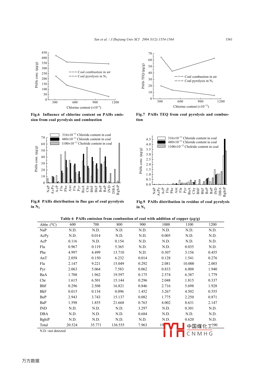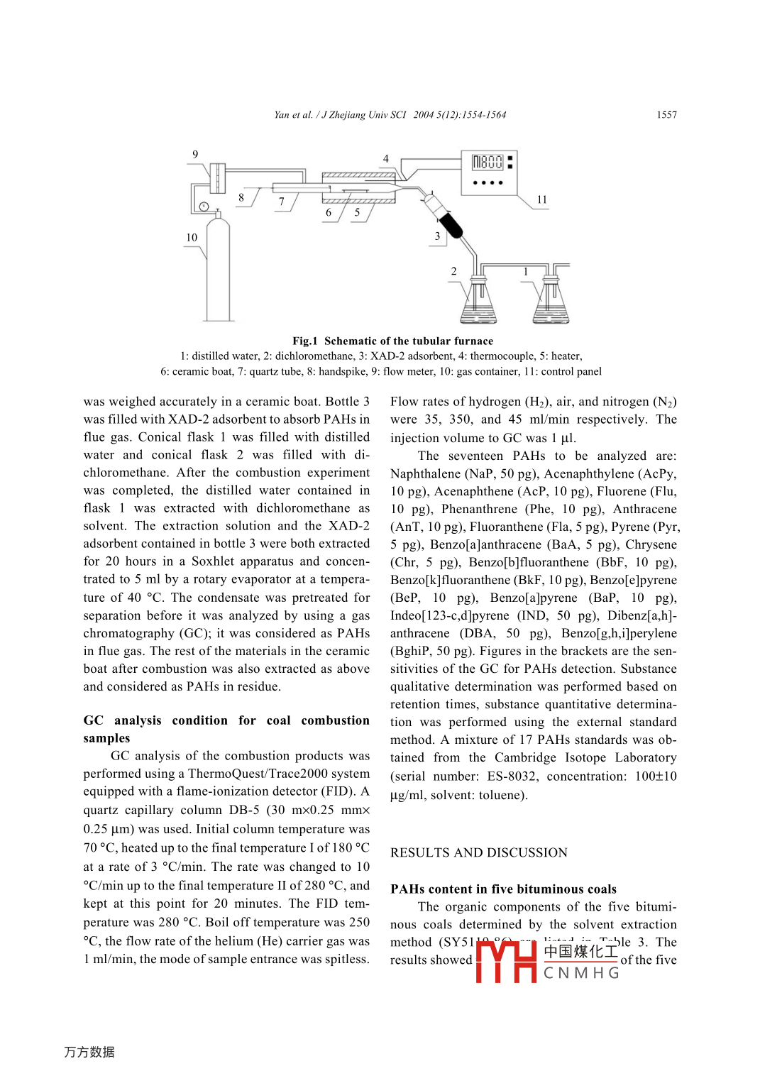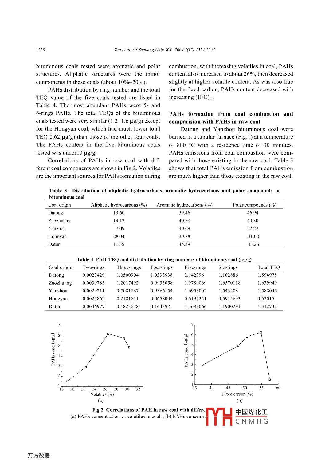 155Yan et al. /J Zhejiang Univ SCI 2004 5(12): 1554-1564Journal of Zhejiang University SCIENCEISSN1009-3095IZUPerformance of pahs emission from bituminous coal combustionYan Jian-hua(嚴建華), YOU Xiao-fang(尤孝方, LI Xiao-dong(李曉東),NI Ming- Jlang(倪明江), YIN Xue-feng(尹雪峰, ceN Ke-fa(岑可法)(National Key Lab of MOE Clean Energy and Environmental Engineering, Zhejiang University, Hangzhou 310027, China)TE-mail:yanjh@cmeezju.edu.cnReceived Sept 4, 2003; revision accepted May 26, 2004Abstract: Carcinogenic and mutagenic polycyclic aromatic hydrocarbons(PAHs) generated in coal combustion havecaused great environmental health concern. Seventeen PAHs (16 high priority PAHs recommended by USEPA plusBenzo[e]pyrene) present in five raw bituminous coals and released during bituminous coal combustion were studied. Theffects of combustion temperature, gas atmosphere, and chlorine content of raw coal on PAHs formation were investigatedTwo additives(copper and cupric oxide) were added when the coal was burned. The results indicated that significantquantities of PAHs were produced from incomplete combustion of coal pyrolysis products at high temperature, and thattemperature is an important causative factor of PAHs formation. PAHS concentrations decrease with the increase of chlorinecontent in oxygen or in nitrogen atmosphere. Copper and cupric oxide additives can promote PaHs formation(especially themulti-ring PAHs) during coal combustionKey words: Polycyclic aromatic hydrocarbons(PAHs), Organic pollutants, Bituminous coal, Combustiondoi:10.1631/jzus.2004.1554Document code: ACLC number: X511INTRODUCTIONgeneration, road transportation, and incinerationare the major PAHs emission sources. Some PahsPolycyclic aromatic hydrocarbons (PAHs) indicators of different processes have been identi-have caused great environmental health concern fied. Chrysene and benzo(k)fluoranthene are indi-because of their carcinogenic and mutagenic char- cators of coal combustion, and pyrene andacteristics, although the amounts of the organic fluoranthene are associated with incineration ThePAHs pollutants emitted into the environment are most toxic PAHs, benzo(a)pyrene(BaP), emittedlower than those of the inorganic pollutants suchfrom boilers accounts for 51. 6% of the total baPSO2, NOx, and CO. PAHs may be formed during emissions in the world (Sai, 1995)nefficient combustion of fossil fuels(petroleumCoal is mainly composed of a wide variety ofcoal and so on), wood, paper, and tobacco that organic structures such as aromatic clusters, alicontain carbon and hydrogen, or produced during phatic bridges and rings, side chains, and oxygenpyrolytic process. Usually, anthropogenic and in- functional groups(Solomon et al., 1988).Upondustrial processes such as home heating, power heating, coal structures undergo major physical andchemical changes and release volatile organiProject supported by the National Natural Science Foundationcompounds. CO and Cha are also produced becauseof China(Nos. N59836210, N1986259878047), and the National of the rupture of the function groups in coalBasic Reaearch Program (973)of China(No. G1999022211)Weaker bonds中國煤化工 ings breakCNMHGYan et al. /J Zhejiang Univ SC/ 2004 5(12): 1554-1564up first, then the aromatic structures, resulting in from 900oC to 1000C. Another study showedmore aromatic hydrocarbons produced in the increase of P AHs yields resulted from the pyrolysisproductsof a coal with increasing temperature at about 600PAHs formation during coal combustion C(Ledesma et al, 2000)process may occur through complex pathwaysThe external influences of combustion tem-There are two important factors influencing PAHs perature, excess air, and coal rank on PAHs emisemission in coal combustion:(1)the unburned sion from fluidized bed combustion had beenc ganic materials because of the poor combustion studied(Mastral et al., 1998a;1998b; 1999; 2000onditions(Mastral et al., 1998a; 2000), and(2)the2000: Liu et al. 2001: Yan etinitial stage of pyrolysis process in the combustion al. 1996resultssuggestedthat pahs(Astral et al., 1998b). PAHs emission from energy emission increased first and then decreased withgeneration has been reviewed, including emission increasing temperature. When the residence timesources,sampling, extraction and measurement increased, the total PAHs emission decreased(Liutechniques, and the influences of the fuel and et al., 2001). There is a specific PAHs emissioncombustor type (automobile engines, domestic trend that follows the combustion temperaturecombustors, industrial stokers and fluidized bed PAHs in the gas phase are higher than those in thecombustors)on PAHs emission. Pyrolysis and py- solid phase. The higher the percentage of excess air,rosynthesis are the two main PAHs formation the lower the total PAHs emitted. Lower percentagemechanisms(Mastral and Callen, 2000; Ni et al., of excess air could favor the deposition of PAHs on2003)the more stable particulate matters, while the higherAlthough the influence of coal structure on percentage of excess air could favor the shift ofPAHs emissions from coal combustion is not well PAHs to the gas phase. There will be a sluggingunderstood, the other factors that influence PAHs regime at higher flows causing PAHs yields toemissions had been studied (Liu et al, 2001; Li et increase(Mastral et al., 1998a; 1999)al, 2003). The influences of chlorine and sulfurThe effects of adding desulfurizcontents in coal on PAHs emission had also been coal combustion on pahs emission had beenexamined. They included the different influences of studied experimentally(liu et al. 2001: Astral etorganic chlorine and inorganic chlorine on the dis- aL, 2001a). Their results showed that more PAHstribution of PAHs in the gas phase and solid phase tended to concentrate on the solid phase whenemission (liu et al, 2001)limestone was added to the reactorTotal PAHs emission depends mainly on theMetal additives have little influence on lowpyr