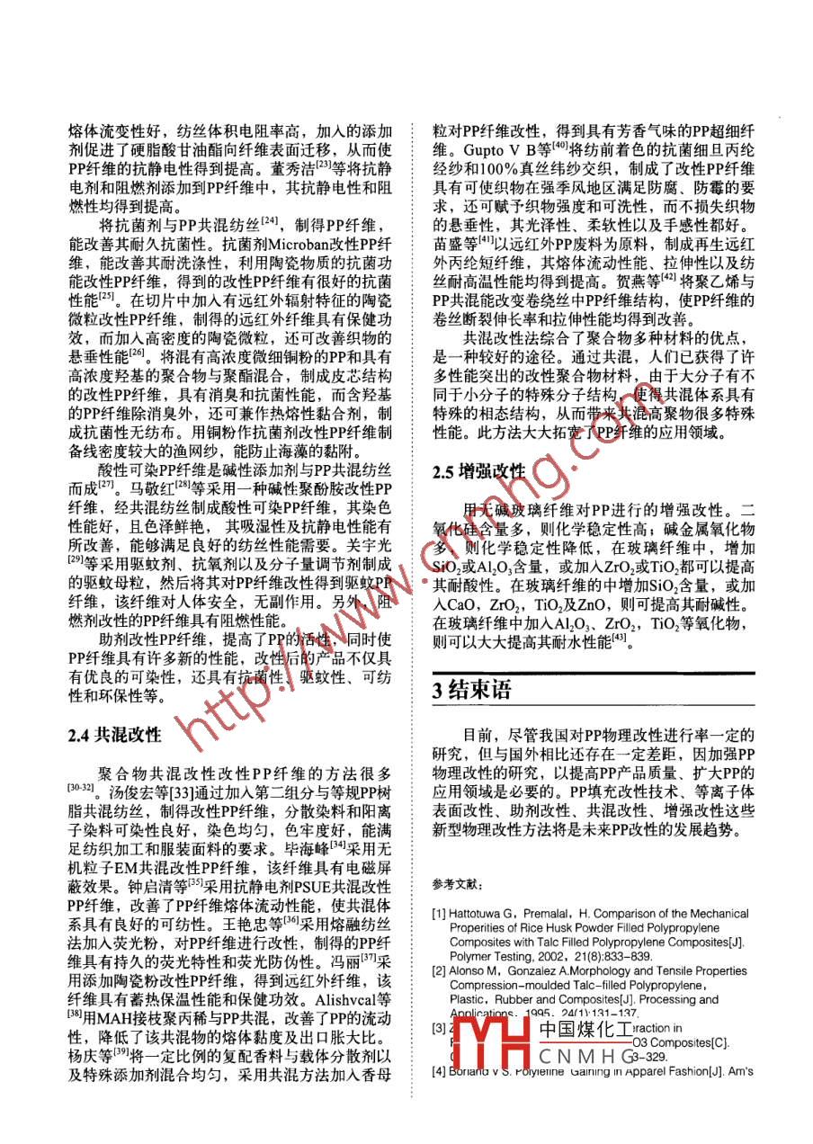 文章編號(hào):1005-360(2007)040080-04聚丙烯物理改性研究進(jìn)展Progress in the Research of Physical Modification ofPolypropylene曾舟華,李付亞2,傅和青2 Zeng Zhouhua, Li Fuya, Fu Heqing1.黃岡師范學(xué)院化學(xué)系,湖北黃岡4380002華南理工大學(xué)化工與能源學(xué)院,廣東廣州5106401. Department of Chemistry, Huangang Normal College, Huanggang 438000, china2. Chemical and Energy Engineering, South China University of Technology, Guangzhou 510640, China介紹了聚丙烯的物理改性及其研究進(jìn)展,并指出PP填充改性、等高子體改性、助劑改性、共混改性強(qiáng)改性是未來(lái)發(fā)展的方向Abstract: Physical modification is a good method for PP to be modified, the present situation of PPtrend of PP modification are of using filler, plasma, additive, blend and reinforcement, etc, ntphysical modification and its importance are summarized, it pointed out that the develop聚丙烯;物理改性;進(jìn)展中圖分類號(hào):TQ32567文獻(xiàn)標(biāo)識(shí)碼:BKey words: Poplypropylene; Physical modification; ProgressPP是當(dāng)今最具發(fā)展前途的熱塑性高分子材2.1PP填充改性技術(shù)料之一,與其他通用熱塑性塑料相比,其屈服強(qiáng)度、拉伸強(qiáng)度、表面強(qiáng)度等力學(xué)性能均較優(yōu)異PP填充改性技術(shù)越來(lái)越受到關(guān)注?;厶钅蛻?yīng)力開(kāi)裂性和耐磨性突出,化學(xué)穩(wěn)定性好,成充PP分為兩類,一類是填充量為30%40%,對(duì)型加工容易,絕緣性和介電率良好,應(yīng)用范圍廣PP改性以后可提高熱變形溫度和柔曲模量;另一泛。此外,PP原料來(lái)源豐富,價(jià)格低廉,并且隨類是填充量為10%~20%,可提高PP的表面光潔著新型高效催化劑的出現(xiàn),生產(chǎn)工藝不斷簡(jiǎn)化度。采用活化滑石粉填充改性PP后提高了材料成型加工容易、可用注塑、擠出和中空成型等的剛性,克服了波輪的翹曲變形,同時(shí)加入了增多種方法高效率地成型各種制品,廣泛應(yīng)用于化:韌劑及滑石粉,使P球晶變小,尺寸穩(wěn)定性好。工、電器、汽車、建筑、包裝等行業(yè),并正向其Hattotuwa G.B等發(fā)現(xiàn)滑石粉改性PP,可提高其他熱塑性塑料、工程塑料及金屬等材料的應(yīng)用領(lǐng)楊氏模量、彈性模量和沖擊性能,增加牢固性、域擴(kuò)展減小收縮性。 M.Alonso等研究發(fā)現(xiàn)滑石粉對(duì)PP但是,由于P是非極性結(jié)品型聚合物,表面改性以后,由于滑石粉填料力學(xué)特性和平面結(jié)構(gòu)活性低,因此,難以進(jìn)行染色、表面印刷、涂裝:對(duì)PP的晶形排列有很大影響,稍微增加一點(diǎn)滑石和用膠黏劑黏接,也難以與其他聚合物或填料共粉的量,就會(huì)改變PP的晶形狀態(tài),PP的晶形改混,此外,PP的熔點(diǎn)較低、熱變形溫度低、耐蠕氵變是引起宏觀效應(yīng)的主要原因。在滑石粉中加入變性差、尺寸穩(wěn)定性不好及低溫脆性大等缺點(diǎn)限氵3%~5%的加工助劑,注射壓力降低30%,成型溫制了其進(jìn)一步推廣應(yīng)用。為此,必須對(duì)PP進(jìn)行改度降低20~30℃性。改性方法較多,主要包括化學(xué)改性法和物理碳酸鈣填充改性PP以后,剛性、黏度及耐熱改性法。本文主要綜述了PP的物理改性進(jìn)展。性得到提高,模塑產(chǎn)品韌性、模量得到提高熱變形溫度降低。 Zoltan Demjen等研究表明2PP物理改性碳中國(guó)煤化工淂到滿意效果,量CNMHG度等隨著碳酸鈣收稿日霜:20061294作者簡(jiǎn)介:曾舟華1960-),男,士,副教授,主要從事精細(xì)化工和節(jié)能等領(lǐng)域的研究通訊聯(lián)系人:傅和青電話020-87110949,Email:fuha@scut.edu.cn量的增加而降低;低于10%時(shí),不能明顯地提高PP纖維不含極性基團(tuán),與親水基團(tuán)結(jié)合困PP的力學(xué)性能,一般來(lái)說(shuō),碳酸鈣的填充量在:難,為了提高表面的浸潤(rùn)和黏附性,通常需要進(jìn)0%~40%時(shí)比較好。 BorlandⅤS"使用含有CaCO3:行表面活性處理,等離子體表面改性效果較好,填料改性PP,通過(guò)調(diào)整填料的含量可以對(duì)制品的有關(guān)等離子表面改性研究也較多。金郡潮等在性能加以控制,從而得到滿足性能要求的產(chǎn)品。固定條件下,改變氣氛(氧氣或氮?dú)?對(duì)P纖維B M Sole and A Bal等研究不同填料對(duì)PP改:薄膜進(jìn)行等離子體改性,發(fā)現(xiàn)空氣或氮?dú)獾入x子性的影響,發(fā)現(xiàn)滑石粉、BaSO、CaCO和草木灰體處理都能引入極性基團(tuán),形成新的表面結(jié)構(gòu),對(duì)PP的張力影響不一樣,總的趨勢(shì)是隨著填充材提高了聚合物表面活性,吸濕性、酸性和活性染料的增加,PP的張力逐漸減小。隨著填料質(zhì)量比料在PP纖維上的染色性以及纖維的著色性均得到和磨損粒子的大小增加,PP的磨損率也增加,在提高。另外,也能提高PP纖維的親水性,減小溫和磨損阻力下,滑石粉效果最好,各向異性的:其接觸角。氬是一種惰性氣體,在氬等離子體處滑石粉填料提高了PP的力學(xué)強(qiáng)度。理PP后,由于氬等離子體釋放UV光子有足夠的李蘭等利用硅灰石/EPDM對(duì)PP進(jìn)行填充改能量,可打開(kāi)C-C鍵和C—H鍵,從而形成自由性,通過(guò)掃描電鏡和沖擊試驗(yàn)等研究了該復(fù)合組基,自由基能夠重新組合,產(chǎn)生不飽和物或交聯(lián)分變化和形態(tài)結(jié)構(gòu)對(duì)其力學(xué)性能、特別是沖擊韌物,或改變PP的化學(xué)結(jié)構(gòu)使等離子體能更快進(jìn)入性的影響,硅灰石