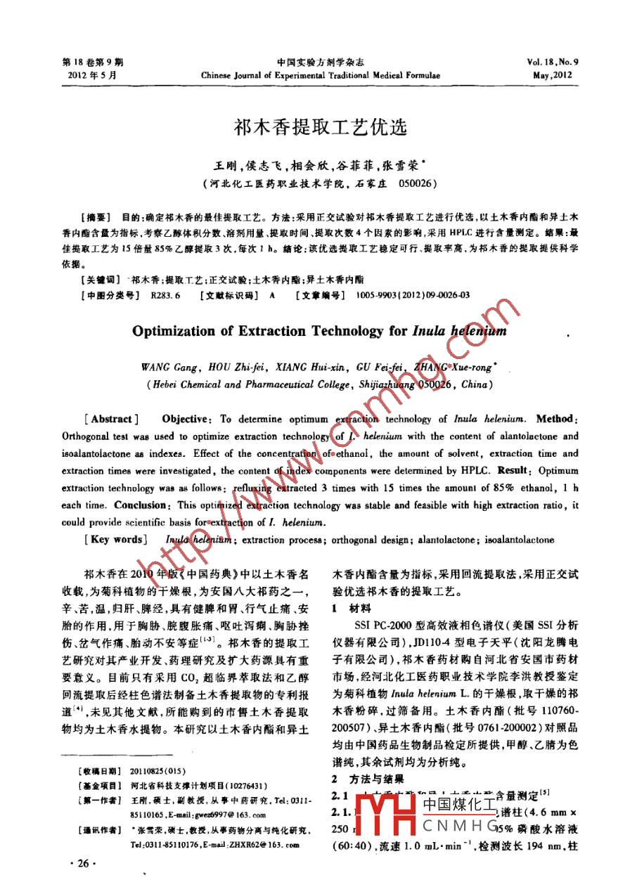 第18卷第9期中國(guó)實(shí)驗(yàn)方劑學(xué)雜志Vol 18, No 92012年5月Chinese Journal of Experimental Traditional Medical FormulaeMay,2012祁木香提取工藝優(yōu)選王剛,侯志飛,相會(huì)欣,谷菲菲,張雪榮(河北化工醫(yī)藥職業(yè)技術(shù)學(xué)院,石家莊050026)摘要]目的確定祁木香的最佳提取工藝。方法:采用正交試驗(yàn)對(duì)祁木香提取工藝進(jìn)行優(yōu)選,以土木香內(nèi)酯和異土木香內(nèi)酯含量為指標(biāo),考察乙醇體積分?jǐn)?shù)、溶劑用量提取時(shí)間、提取次數(shù)4個(gè)因素的影響,采用HPLC進(jìn)行含量測(cè)定。結(jié)果:最佳提取工藝為15倍量85%乙醇提取3次,每次Ih。結(jié)論;該優(yōu)選提取工藝穩(wěn)定可行、提取率高,為祁木香的提取提供科學(xué)依據(jù)關(guān)鍵詞]祁木香;提取T藝;正交試驗(yàn);土木香內(nèi)酯;異土木香內(nèi)酯【中圖分類(lèi)號(hào)]R283.6【文獻(xiàn)標(biāo)識(shí)碼]A[文章編號(hào)]1005-9903(2012)09002603Optimization of Extraction Technology for Inula heleniumWANG Gang, HOU Zhi-fei, XIANG Hui-xin, GU Fei-fei, ZHANG XHebei Chemical and Pharmaceutical College, Shijiazhuang 050026Abstract] Objective: To determine optimum extraction technology of inulaOrthogonal test was used to optimize extraction technology of I. helenium with the content of alantolactone andisoalantolactone as indexes. Effect of the concentration of ethanol. the amount of solvent extraction time andextraction times were investigated, the content of index components were determined by HPLC. Result: Optimumextraction technology was as follows: refluxing extraeted 3 times with 15 times the amount of 85% ethanol, 1 heach time. Conclusion: This optimized extraction technalogy was stable and feasible with high extraction ratio, itcould provide scientifie basis for extraction of I. heleniumKey words] Inula helenium; extraction process; orthogonal design; alantolactone: isoalantolactone祁木香在2010年版《中國(guó)藥典》中以土木香名木香內(nèi)酯含量為指標(biāo),采用回流提取法,采用正交試收載,為菊科植物的干燥根,為安國(guó)八大祁藥之一,驗(yàn)優(yōu)選祁木香的提取工藝。辛、苦,溫,歸肝、脾經(jīng),具有健脾和胃、行氣止痛、安1材料胎的作用,用于胸脅、脘腹脹痛、嘔吐瀉瘌、胸脅挫SSI PC2000型高效液相色譜儀(美國(guó)SSI分析傷、岔氣作痛、胎動(dòng)不安等癥3。祁木香的提取工儀器有限公司),JD104型電子天平(沈陽(yáng)龍騰電藝研究對(duì)其產(chǎn)業(yè)開(kāi)發(fā)、藥理研究及擴(kuò)大藥源具有重子有限公司),祁木香藥材購(gòu)自河北省安國(guó)市藥材要意義。目前只有采用CO2超臨界萃取法和乙醇市場(chǎng)經(jīng)河北化工醫(yī)藥職業(yè)技術(shù)學(xué)院李洪教授鑒定回流提取后經(jīng)柱色譜法制備土木香提取物的專(zhuān)利報(bào)為菊科植物 Inula helenium l.的干燥根,取干燥的祁道“,未見(jiàn)其他文獻(xiàn),所能購(gòu)到的市售土木香提取木香粉碎,過(guò)篩備用。土木香內(nèi)酯(批號(hào)110760物均為土木香水提物。本研究以土木香內(nèi)酯和異土200507)、異土木香內(nèi)酯(批號(hào)076120002)對(duì)照品均由中國(guó)藥品生物制品檢定所提供,甲醇、乙腈為色譜純,其余試劑均為分析純。收稿日期]20110825(015)[金項(xiàng)目】河北省科技支撐計(jì)劃項(xiàng)目(10276431)2方法與結(jié)果一】王剛土碳從事中研究Mm:21忙中國(guó)煤忙含量測(cè)定851o165,E-mhil:we697@163.cm譜柱(4.6mmx[通訊作者]·張雪榮碩士,教授從事藥物分離與純化研究,250CNMHG5%碳酸水溶液T:03185116, E-mai: ZHXR62e163.cm(60:40),流速1.0mL·min,檢測(cè)波長(zhǎng)194mm,柱王剛,等:祁木香提取工藝優(yōu)選溫30℃,進(jìn)樣量20μL40mL,定量轉(zhuǎn)移至50mL量瓶中,加乙醇至刻度,搖2.1.2對(duì)照品溶液制備精密稱(chēng)取干燥至恒重的勻,濾過(guò)精密量取濾液25mL,濃縮至近干,殘?jiān)赢愅聊鞠銉?nèi)酯和土木香內(nèi)酯對(duì)照品適量,加甲醇分甲醇溶解轉(zhuǎn)移至25mL量瓶中,甲醇稀釋至刻度別配制成475,380mg·L"的對(duì)照品溶液。精密吸搖勻,濾過(guò),取續(xù)濾液1mL,甲醇稀釋至10mL,搖取對(duì)照品儲(chǔ)備液2m,甲醇定容至10mL,播勻,得勻,濾過(guò),取續(xù)濾液按21,1色譜條件進(jìn)行測(cè)定,分質(zhì)量濃度分別為95,76mgL的混合對(duì)照品液。別吸取對(duì)照品溶液、供試品溶液各20μL,進(jìn)樣,記2.L.3標(biāo)準(zhǔn)曲線繪制精密吸取對(duì)照品儲(chǔ)備液5錄色譜圖見(jiàn)圖1。正交試驗(yàn)結(jié)果見(jiàn)表2,方差分析見(jiàn)mL,采用倍比稀釋法制得系列混合對(duì)照品溶液,分表3別進(jìn)樣20μ,測(cè)定其峰面積,得異土木香內(nèi)酯和土木香內(nèi)酯的標(biāo)準(zhǔn)曲線方程和相關(guān)系數(shù)分別為Y=82464X-10°(r=0.9992),在0.475~475叫線性關(guān)系良好;Y=110438X-859049(r=0.9993),在0.38-3.8gg線性關(guān)系良好2.2提取工藝正交試驗(yàn)根據(jù)預(yù)試驗(yàn)結(jié)果,以乙醇體積分?jǐn)?shù)溶劑用量提取時(shí)間和提取次數(shù)為考察因素每個(gè)因素設(shè)計(jì)3個(gè)水平,按L(3)正交表設(shè)計(jì)正交試驗(yàn)(表1)分別取祁木香藥材4g,按正交因素表中各因素水平進(jìn)行回流提取,濾過(guò),合并濾液,減壓濃縮至約豪1祁木香提取工藝正交試驗(yàn)因素水平乙醇體積分?jǐn)?shù)/%溶劑用量/倍提取時(shí)間/h提取次數(shù)A.對(duì)照品;B.供試品;1.異土木香內(nèi)酯;2.土木香內(nèi)酯1祁木香HPLC