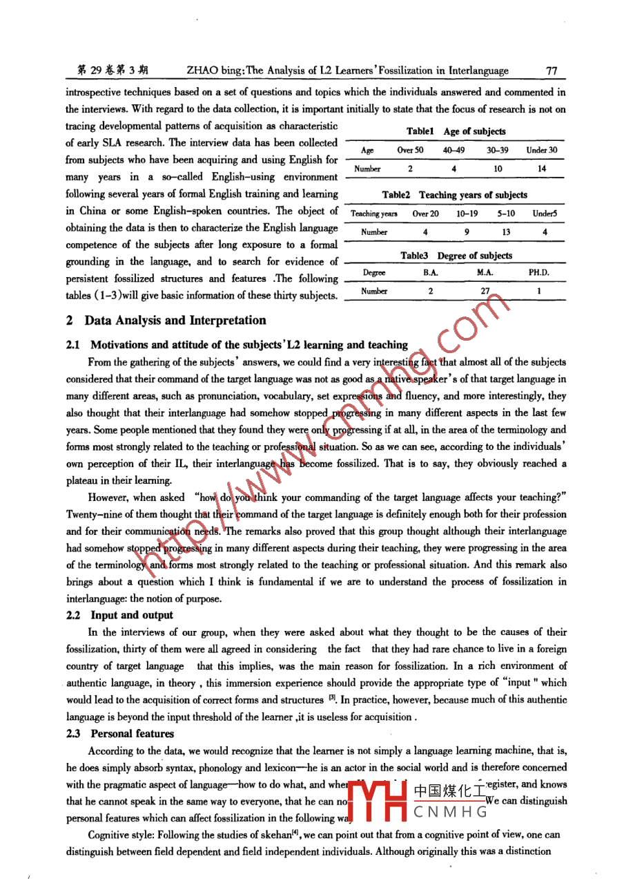 第29卷第3期江西理工大學(xué)學(xué)報(bào)Vol.29,No.32008年6月JOURNALOF JIANGXI UNIVERSITY OF SCIENCE ANDTECHNOLOGYJun . 2008文章編號(hào):1007-1229(2008 )03 -0076-03The Analysis of L2 Learners’Fossilizationin Interlanguage*廣東外語(yǔ)外貿(mào)大學(xué)碩士研究生:趙冰指導(dǎo)教師:余衛(wèi)華研究方向:英語(yǔ)語(yǔ)言學(xué)及應(yīng)用語(yǔ)言學(xué)論文答辯時(shí)間:2007年1月Abstract: The author designed a questionnaire, emailed and interviewed thirty advanced L2 learners who work asL2 lecturers in a university to get a survey on the processing of fssiliation in their foreign language leaming andteaching from the causes of purpose of learming, teaching tasks and other factors involved. All of the subjectsthought that their command of the target language was not as good as a native speaker s of target language in manyaspects. That is ,there existed fosilization among them. However, most of them agreed that their command of thetarget language was adequate for their professional and communication needs. Results also suggest that fosilizationcan be conscious to this group of L2 learners; it is deeply related with the L2 learners’motivations; it can beaffected by personal features such as ages, leamning styles and teaching tasks; it is changeable and unpredictable;and it is difficult to eradicate.Key words: interlanguage;fossilization;L2 learners; motivation; input ;outputCLC number:H31Article character:AIntroduction(1 )Background of the study.Most L2 learmers and lecturers find that after they reached a certain stage ofdevelopment, they can not achieve L2 proficiency further. American linguist, Selinker'noted that many L2 learmers(perhaps as many as 95 percent) fail to reach target language competence. They stop learning when theirinter-language contains at least some rules different from those of the target language system. An importantcharacteritic that can be observed in the study of the interlanguage of second and foreign language learners is thefact that some language features that are part of the learmers ’interlanguage and differ from the correct or moreadequate target language form do not seem to follow any kind of progression towards proficiency in the targetlanguage but quite the opposite網(wǎng)These interlanguage forms seem to be used by language learners in spite of theirtheoretical capacity (both linguistic and intellectual) to include the right target language form in their interlanguagerepertoire.This phenomenon of certain linguistic features becoming fixed in some or , most learners' interlanguage hasbeen referred to in the literature , after Selinker as fsslization.(2)Research questions.The phenomenon mentioned above leads us to consider the reason why majority of theL2 learners (advanced learners included) stop progressing in their acquisition of the target language and why somekinds of errors tend to persist in their interlanguage , and what are the traces of their fosilization processing.Language teachers in colleges are considered as advanced L2 language learmers, with good command of foreignlanguages. They have double identity-- advanced English learmers and English teachers. Does the phenomenonalso exist among them ?In what way?1 Design of InterviewsThe author selected a group of 30 L2 lecturers in a university中國(guó)煤化Iage teachers fromdiferent language backgrounds and sharing the common featurlYHCNM H Gee in the foreignlanguage and a need of the foreign language in their profession. Information was gathered through the use of此文為刪節(jié)稿,原論文約2萬(wàn)字.第29卷第3期ZHAO bing:The Analysis of L2 Learners' Fossilization in Interlanguage77introspective techniques based on a set of questions and topics which the individuals answered and commented inthe interviews. With regard to the data collection, it is important initially to state that the focus of research is not ontracing developmental patterms of acquisition as characteristicTable1 Age of subjectsof early SLA research. The interview data has been collectedOver50 40- 4930-39Under 30from subjects who have been acquiring and using English forNumber214many years in a s0- called English-using environmentfollowing several years of formal English training and leamingTable2 Teaching years of subjectsin China or some English- -spoken countries. The object ofTeachingyears Over 2010-195-10obtaining the data is then to characterize the English language914competence of the subjects after long exposure to a formalTable3 Degree of subjectsgrounding in the language, and to search for evidence (DegreePH.D.persistent fossilized structures and features .The followingtables (1-3 )will give basic information of these thirty subjects.2 Data Analysis and Interpretation2.1 Motivations and attitude of the subjects'L2 learning and teachingFrom the gathering of the subjects' answers, we could find a very interesting fact that almost all of the subjectsconsidered that their command of the target language was not as good as a native speaker s of that target language inmany different areas, such as pronunciation, vocabulary, set expressions and fluency, and more interestingly, theyalso thought that their interlanguage had somehow stopped progressing in many different aspects in the last fewyears. Some people mentioned that they found they were only progressing if at all, in the area of the terminology andforms most strongly related to the teaching or professional situation. So as we can see, according to the individuals’own perception of their IL, their interlanguage has become fossilized. That is to say, they obviously reached aplateau in their learming.However, when asked“how do you think your commanding of the target language afects your teaching?"Twenty- -nine of them thought that their command of the target language is definitely enough both for their professionand for their communication needs. The remarks also pr