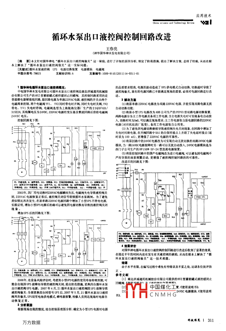 應(yīng)用技術(shù)Chin scice eand Tcholeoly Reviev wl循環(huán)水泵出口液控閥控制回路改進(jìn)王春亮(神華國華神木發(fā)電有限公司)[摘要] 本文針對國華神電“循環(huán)水泵出口液控閥偷關(guān)”這一缺陷, 進(jìn)行了詳細(xì)的原因分析,制定了防范措施,提出了解決方案,總結(jié)了經(jīng)驗(yàn),從而在根本上解決了“循環(huán)水泵出口液控閥偷關(guān)"這一實(shí)際問題。[關(guān)鍵詞]循環(huán)水泵液控閥UPS 電源切換裝置 電源模塊 電磁閥中圖分類號:TM621文獻(xiàn)標(biāo)識碼:A文章編號: 109-914X(2011)14-0311-011國華神電循環(huán)水泵出口液控閥概況:的品質(zhì)要求較高,電源的波動(dòng)造成了uPS供電模式自動(dòng)切換,切換超時(shí)導(dǎo)致了中電國華神木發(fā)電有限公司循環(huán)水泵出口液控閥是湖北洪城通用機(jī)械股液控閥偷關(guān),原有的電源回路已不能滿足現(xiàn)場的需嬰,必須對電源回路進(jìn)行改份有限公司生產(chǎn)的HYZ型幕能罐式液控緩閉止回蝶閥,其控制回路 采用的是進(jìn)普通繼電器硬接線回路,原回路電源為單路220VAC電源,液控閥的開關(guān)由兩個(gè)3解決方案電磁閥來控制,兩個(gè)電磁閥YV1、YV2 同時(shí)帶電時(shí)開閥,同時(shí)失電時(shí)關(guān)閥, YV2(1)將原單路220VAC電源改為雙路220VAC電源,并能實(shí)現(xiàn)雙路電源無擾帶電、YV1失電時(shí)停閥,電磁閥選型為上海航海儀器廠生產(chǎn)的23QDF6B/自動(dòng)切換功能:315E24, 其線圈電壓為24VDC, 220VAC電源經(jīng)變壓器及整流回路后供給電磁閥(2)將原小型uPS電源改為ABB公司生產(chǎn)的PEPO3型雙路電源切換裝置.24VDC電壓。兩路電源分為主工作電源及備用工作電源,當(dāng)主電源失電時(shí)可實(shí)現(xiàn)備電自動(dòng)投控制回路見下圖:入,切換時(shí)間為5mS,可以滿足現(xiàn)場需求;主工作電源取自原電源回路的220VAC電源(對應(yīng)機(jī)組的廠低變),備用工作電源取自公用變.3)為了避免因電源切換繼縷導(dǎo)致液控閥失電關(guān)閉現(xiàn)象,在回路中增加了m風(fēng)失電時(shí)間繼電器,在開閥回路中KA1的自保持接點(diǎn)上井聯(lián)了失電延時(shí)接點(diǎn)(延u中中中(4)將原回路中的24VDC電源改為可實(shí)現(xiàn)自動(dòng)無擾切換的雙路24VDC電源電a、0模塊,當(dāng)一路24VDC電源故障時(shí)另-路可以無擾自動(dòng)投入,24VDC電源模塊選為中m ]西門子公司生產(chǎn)的HF150W- SF-24型直流電源裝置。(5)將原控制回路中的國產(chǎn)電磁閥改為進(jìn)口電磁閥,可以避免因電磁閥不中嚴(yán)而導(dǎo)致的油泵頻警啟動(dòng),更增強(qiáng)了液控閥控制回路的的可靠性。5U改進(jìn)后的回路見下圖:中|向中m24VDC_[ 限:熱繼電器:則:抽票電機(jī):期:培馨路: PU2: 鹽制團(tuán)陳熔斷器S03控制開美: 2故障指示打,2003年,因廠用電切換時(shí)220VAC電源瞬間失壓,電磁閥失電導(dǎo)致液控閥關(guān)r中中中3、陽閉,220VAC電源恢復(fù)正常后,液控閥關(guān)閉信號聯(lián)鎖循環(huán)水泵跳閘,為了避免小J類似情況再次發(fā)生,在原單路220VAC電源回路中增加了小型UPS不停電電源,實(shí)踐證明,增加小型UPS電源后的確可以避免因電源切換而導(dǎo)致的液控閥關(guān)閉增加UPS后的回路見下圖:“222文四中|用55718 Nm、T 300向mm0中中中aEJJJC]l 載開關(guān),H2:美費(fèi)位推賴,費(fèi)化有動(dòng) A,關(guān)國化中國電KAI開建化中電電 m,4效果評價(jià)化神電環(huán)水泵出口液控閥控制回路進(jìn)行改進(jìn)后收到了顯著的效果,門空空在接近半年的時(shí)間內(nèi)沒有發(fā)生有關(guān)液控閥的缺陷,從而在根本上解決了“循三中環(huán)水泵出口液控閥偷關(guān)"這一技術(shù)難題●結(jié)語由于水平有限在編寫過程中難免有些錯(cuò)誤及不妥之處還請各位批評指正參考文獻(xiàn)2006年,在設(shè)備風(fēng)險(xiǎn)評估時(shí),考慮到小型UPS電源的使用壽命即將到期,可[1] 湖北洪城通用機(jī)械股份有限公司提供的HYZ型蕎能罐式液控緩閉止能會(huì)出現(xiàn)因UPS故障而導(dǎo)致的液控閥關(guān)閉,提出防范措施,更換四臺(tái)循環(huán)水泵回蝶佃出口液控閥UPS電源。2007 年4月, 21循環(huán)水泵出口液控閥因UPS故障導(dǎo)致中國煤化工置.《使用說明書》液控閥偷關(guān):全部更換四臺(tái)同型號UPS后,2007年5月, 21循環(huán)水泵出口液控24VDC電源模塊. <使用說明閥再次偷關(guān), UPS切至電池供電模式,蜂鳴器報(bào)警,檢修人員到達(dá)現(xiàn)場時(shí)電源自書》.MHCNMHG動(dòng)恢復(fù)正常。2分析票因根據(jù)現(xiàn)場出現(xiàn)的情況,結(jié)合控制原理圖分析:確定為小型UPS電源對電源科技博覽1 311
