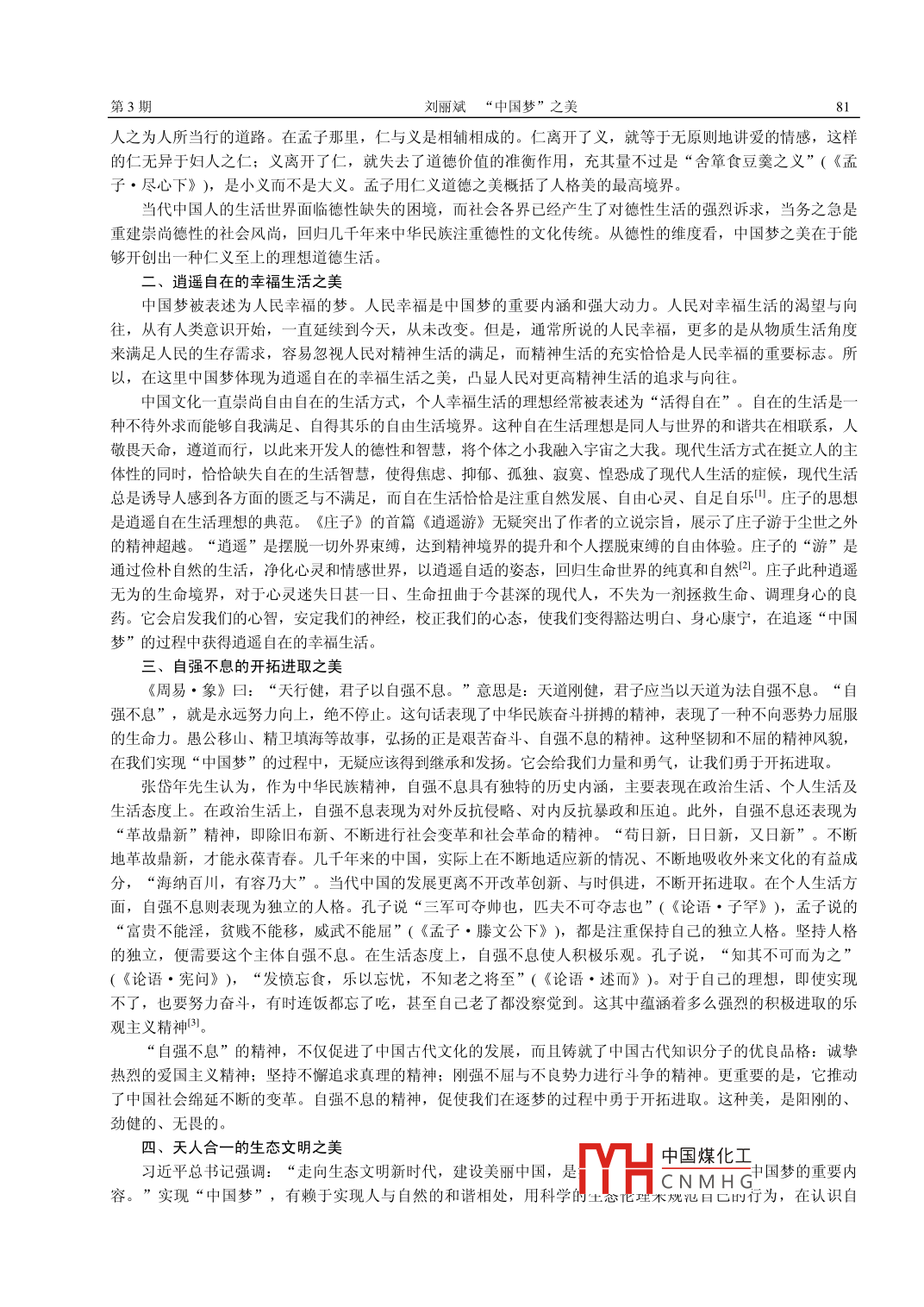 第17卷第3期衡水學(xué)院學(xué)報Vol. 17. No. 32015年6月Journal of Hengshui UniversityJun.2015DOI:10.3969/issa.1673-2065.2015.03.019“中國夢”之美劉麗斌(河北大學(xué)政法學(xué)院,河北保定071002)要:實現(xiàn)中國夢必須弘揚(yáng)中華民族五千年來悠久文明孕育的中國精神。夢想是美好的,中國夢的美主要在于中國精神所體現(xiàn)的美的意蘊(yùn),即仁義至上的理想人格之美、逍遙自在的幸福生活之美、自強(qiáng)不息的開拓進(jìn)取精神之美、天人合一的生態(tài)文明之美及和而不同的世界和平之美關(guān)鍵詞:“中國夢”;中國精神;理想;幸福中圖分類號:A849文獻(xiàn)標(biāo)識碼:A文章編號:1673-2065(2015)03-008003黨的十八大以后,習(xí)近平總書記在一系列講話中,從不同角度對中國夢進(jìn)行了系統(tǒng)全面的闡述,指出了中國夢的豐富內(nèi)涵和精神實質(zhì)?!爸袊鴫艟褪菄腋粡?qiáng)、民族振興、人民幸福。它也是合作、發(fā)展、和平、共贏的夢”“實現(xiàn)中華民族偉大復(fù)興,就是中華民族近代以來最偉大的夢想夢想,寄托著人們對未來的期盼和對美好生活的向往,體現(xiàn)著人們對自身前途的堅定信念。中國夢固然包含著中國人期望實現(xiàn)且尚未實現(xiàn)的愿望和目標(biāo),但這些愿望和目標(biāo)又不能簡化為簡單、具體的物化和量化指標(biāo)。我們所憧憬、追求的中國夢,事實上是我們所期望的一種生存狀態(tài)、一種生存方式、一種生存境界,是我們?yōu)槭澜?、為未來所提供的新的生存方式選項。中國夢的真正魅力,在于其所展現(xiàn)的獨(dú)特生存方式所蘊(yùn)含的中國人的精神追求,即中國精神。中國精神是中華民族五千年來悠久文明的精粹。中國夢之美,美在何處?、仁義至上的理想人格之美中國傳統(tǒng)文化極其重視個人的道德修養(yǎng),儒家以仁義為最高價值。個人的道德修養(yǎng)在我們逐夢的過程中作用巨大,培養(yǎng)國民健全的人格特質(zhì),提升個人修養(yǎng)和品質(zhì),具有相當(dāng)正面的現(xiàn)實意義。儒家強(qiáng)調(diào)仁義道德之美。人格美以道德充實為轉(zhuǎn)移,藝術(shù)美以象徳載道為標(biāo)準(zhǔn),自然美亦以“比德”為依據(jù)。美是道德的象征??鬃诱f“禮之用,和為貴,先王之道斯為美”(《論語·學(xué)而》),孟子指出道德“充實之謂美”(《孟子·盡心下》),“故理義之悅我心,猶芻豢之悅我口”(《孟子·告子上》),奠定了儒家的道德之美的傳統(tǒng)?!墩撜Z·八佾》載:“子謂韶,‘盡美矣,又盡善也?!^武,‘盡美矣,未盡善也?!敝祆洹端臅戮浼ⅰ方忉尶鬃訉Α渡亍贰段洹芬魳返牟煌u價時指岀:“美者,聲容之盛;善者,美之實也?!边@“善者,美之實也”一句,確是孔子關(guān)于美的精辟概括?!叭省笔强鬃铀枷氲暮诵姆懂?它體現(xiàn)了孔子學(xué)說的根本精神?!墩撜Z·里仁》中,孔子將“仁”與“美”等同起來:“里仁為美?!敝祆渥⒃?“里有仁厚之俗為美。”孔子還指出,“禮”“樂”如果僅僅停留在形式美的層面上,而不充實、不包含仁義道德內(nèi)容,這種美就不可取,所謂“人而不仁,如禮何?人而不仁,如樂何?”(《論語·八佾》)“仁”是對于自己同類相愛的感情,是發(fā)自內(nèi)心的一種德性。具體地說,此種愛的情感主要表現(xiàn)為“忠”與“恕”兩個方面?!爸摇笔潜M心竭力,盡己之心以愛人;而“恕”是推已及人,將心比心以愛人。故孔子說:“夫仁者,己欲立而立人,己欲達(dá)而達(dá)人。能近取譬,可謂仁之方也已?!薄墩撜Z·雍也》)在孔子思想體系中,代表美的“仁”又是通過一些具體的道德原則和行為規(guī)范表現(xiàn)出來的《論語·陽貨》載:子張問仁于孔子??鬃釉?“能行五者于天下為仁矣。”“請問之恭、寬、信敏、惠。恭則不侮,寬則得眾,信則人任焉,敏則有功,惠則足以使人?!惫?、寬、信、敏、惠,便是仁的五種具體德目。孟子把孔子提出的諸多倫理規(guī)范濃縮為仁義?!叭?人心也;義,人路也。”(《孟子·告子上》)“仁,人之安宅也;義,人之正路也。”(《孟子·離婁上》)孟子認(rèn)為之為人所當(dāng)右的精神,義是中國煤化工CNMHG收稿日期:201407-27作者簡介:劉麗斌(1981-)河北保定人,河北大學(xué)政法學(xué)院在讀博士劉麗斌“中國夢”之人之為人所當(dāng)行的道路。在孟子那里,仁與義是相輔相成的。仁離開了義,就等于無原則地講愛的情感,這樣的仁無異于婦人之仁;義離開了仁,就失去了道德價值的準(zhǔn)衡作用,充其量不過是“舍簞食豆羹之義”(《孟子·盡心下》),是小義而不是大義。孟子用仁義道德之美概括了人格美的最高境界當(dāng)代中國人的生活世界面臨德性缺失的困境,而社會各界已經(jīng)產(chǎn)生了對德性生活的強(qiáng)烈訴求,當(dāng)務(wù)之急是重建崇尚德性的社會風(fēng)尚,回歸幾千年來中華民族注重德性的文化傳統(tǒng)。從德性的維度看,中國夢之美在于能夠開創(chuàng)出一種仁義至上的理想道德生活二、逍遙自在的幸福生活之美中國夢被表述為人民幸福的夢。人民幸福是中國夢的重要內(nèi)涵和強(qiáng)大動力。人民對幸福生活的渴望與向往,從有人類意識開始,一直延續(xù)到今天,從未改變。但是,通常所說的人民幸福,更多的是從物質(zhì)生活角度來滿足人民的生存需求,容易忽視人民對精神生活的滿足,而精神生活的充實恰恰是人民幸福的重要