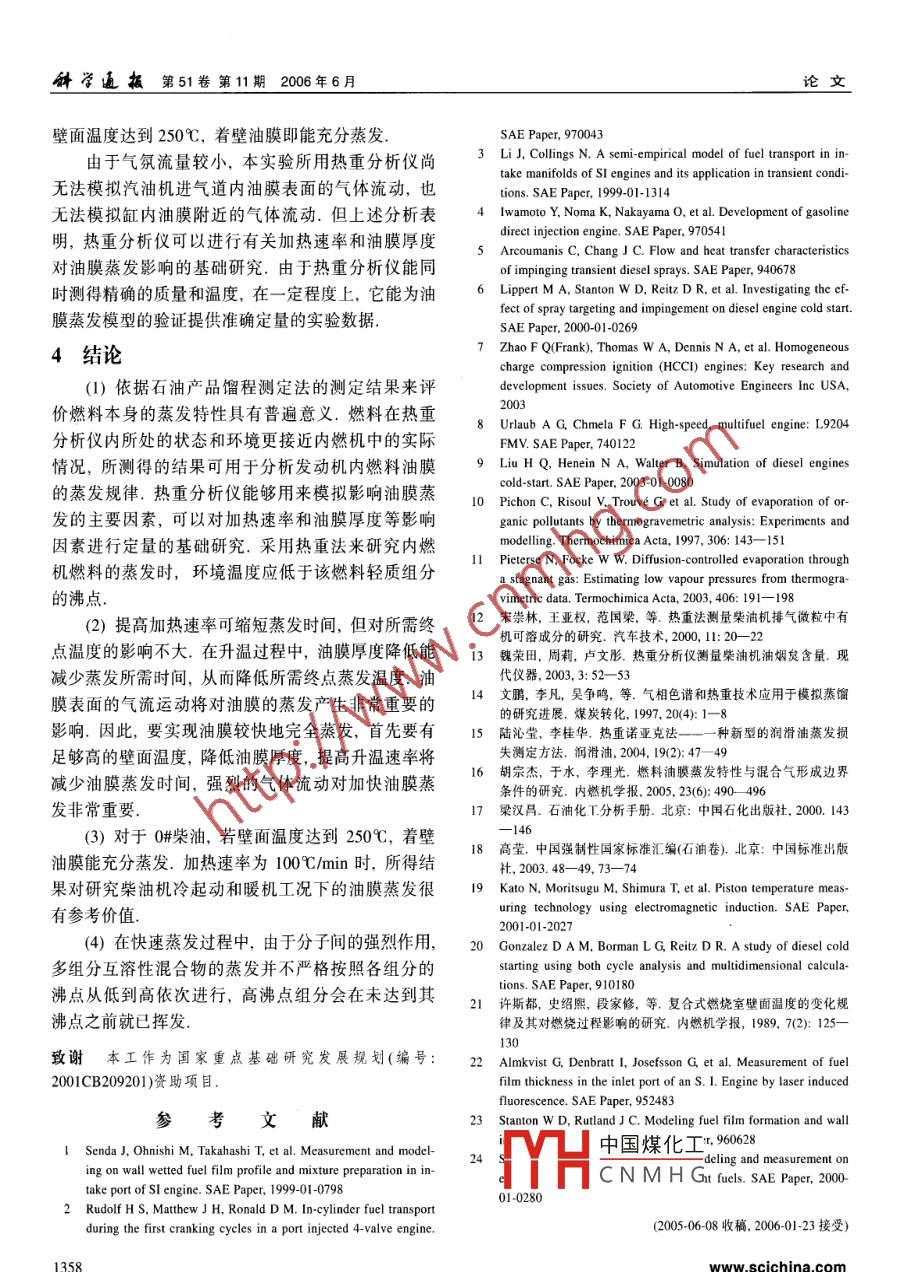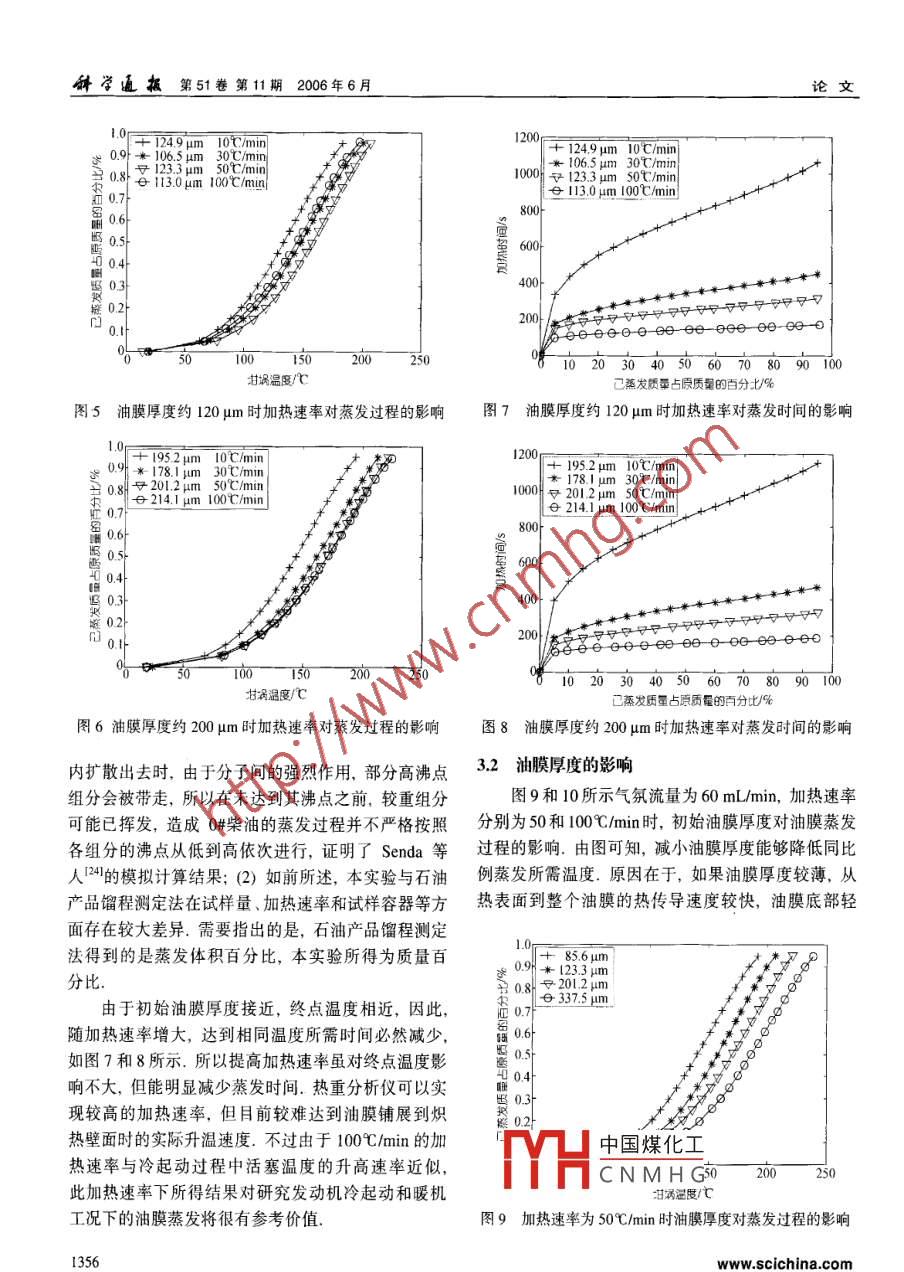 第51卷第11期2006年6月學(xué)通扳燃料油膜蒸發(fā)的熱重分析法硏究胡宗杰①李理光于水①①上海交通大學(xué)動力機械與工程教育部重點實驗室,上海2000②同濟(jì)大學(xué)汽車學(xué)院,上海201804E-mail:zongjie-hu@sjtu.edu.cn)摘要為深入理解不同壁面溫度下的燃料油膜蒸發(fā)特性,對熱重分析法和石油產(chǎn)品餾程測定法進(jìn)行了比較.采用熱重分析法在不同氣氛流量和不同升溫速率下,研究了不同初始厚度的90#汽油、93#汽油和O排#柴油油膜的蒸發(fā)特性,分析了加熱速率、油膜厚度和氣氛流量等對油膜蒸發(fā)的影響.結(jié)果表明,燃料在熱重分析儀中所處的狀態(tài)和環(huán)境接近內(nèi)燃機中油膜的實際情況,所得結(jié)果可用于分析發(fā)動機內(nèi)燃料油膜的蒸發(fā)規(guī)律;熱重分析儀能用來模擬影響油膜蒸發(fā)的主要因素,可以對加熱速率和油膜厚度等影喲因素進(jìn)行定量的基礎(chǔ)研究;要實現(xiàn)油膜較快地完全蒸發(fā),首先要有足夠高的壁面溫度;提高升溫速率和減小油膜厚度將縮短油膜蒸發(fā)時間;強烈的氣流運動對加快油膜蒸發(fā)非常重要.加熱速率為100℃/min時所得的結(jié)果,對研究柴油機冷起動和暖機工況下的油膜蒸發(fā)很有參考價值;在快速蒸發(fā)過程中,分子間強烈的相互作用使多組分互溶性混合物的蒸發(fā)并不嚴(yán)格按照各組分的沸點從低到高依次進(jìn)行,高沸點組分會在未達(dá)到其沸點之前就已禪發(fā);對0辯柴油,若壁面溫度達(dá)到250℃,著壁油膜即能充分蒸發(fā)關(guān)鍵詞熱重分析法油膜蒸發(fā)壁面溫度由于油束或混合氣與壁面的相互作用,通常內(nèi)優(yōu)點.然而,均質(zhì)壓燃發(fā)動機對混合氣的均質(zhì)程度要燃機里都存在壁面燃料油膜.對于進(jìn)氣道噴射汽油求較高,釆用液體燃料時,如何制備均質(zhì)混合氣和減機,油束會撞擊進(jìn)氣道壁面和進(jìn)氣閥背面形成油少濕壁是主要難點之一膜口2,造成進(jìn)入缸內(nèi)的混合氣不均勻,燃油輸運滯多數(shù)情況下,設(shè)計人員盡量減少燃油碰壁的發(fā)后和空燃比的瞬態(tài)漂移等例.研究證明液態(tài)油膜的存生,也有學(xué)者嘗試?yán)糜褪霰诂F(xiàn)象來改善燃油分在是造成進(jìn)氣道噴射汽油機未燃碳?xì)渑欧诺闹匾技芭c空氣的混合無論采取何種技術(shù)路線,都需因之一,在冷起動和暖機工況下,油膜對有害排放的要深入研究燃料油膜蒸發(fā)的規(guī)律和特性.如前所述影響將更加突出2.與進(jìn)氣道噴射汽油機相比,直進(jìn)氣道、進(jìn)氣閥、活塞頂和缸套等表面都可能出現(xiàn)油噴汽油杋可提高約10%的轉(zhuǎn)矩并降低約20%的油耗,膜,而不同濕壁位置的壁面溫度相差甚大,油膜表面但直噴汽油機將產(chǎn)生更多的總碳?xì)浜皖w粒物排放.的氣流擾動各不相同,且壁面溫度和氣流擾動隨時研究表明,在推遲噴射模式下運行時,活塞頂上存在間變化明顯.因此,內(nèi)燃機內(nèi)燃料油膜的蒸發(fā)環(huán)境復(fù)油膜是總碳?xì)渑欧鸥叩闹饕?排氣閥下方缸套雜多變,對其進(jìn)行模擬實驗研究是非常困難的.根據(jù)和活塞頂上的油膜將成為提前噴射模式下總碳?xì)渑艧釋W(xué)原理,建立油膜蒸發(fā)的數(shù)學(xué)模型是人們分析燃放高的主要原因;油膜的存在也被認(rèn)為是顆粒物排料油膜蒸發(fā)規(guī)律和特性的有效途徑之一,但模型驗放增加的主要原因.對小缸徑直噴柴油機,油束碰證往往缺乏直接可靠的實驗數(shù)據(jù).在中央噴射和進(jìn)壁是常見現(xiàn)象,在燃燒室表面,尤其在活塞頂凹坑內(nèi),氣道噴射汽油機中,廣泛采用τⅩ經(jīng)驗?zāi)P蛠砻枋鋈己苋菀仔纬捎湍?當(dāng)負(fù)荷提高、供油量增加時,油束油分布,其中τ與油膜蒸發(fā)有關(guān),對每種型號的產(chǎn)品碰壁現(xiàn)象更是不可避免.而研究表明缸內(nèi)油膜是未發(fā)動機,τ值都需按發(fā)動機轉(zhuǎn)速和冷卻水溫度進(jìn)行標(biāo)燃碳?xì)浜吞紵煹闹匾獊碓?在冷起動工況下,缸內(nèi)定積聚的液態(tài)燃油被認(rèn)為是造成白煙的主要原因.均中國煤化工續(xù)的質(zhì)量時間曲線質(zhì)壓燃燃燒可以同時降低氮氧化合物和顆粒物排放,溫度CNMHG人員已經(jīng)嘗試采用并提高發(fā)動機的熱效率,還具有燃燒多種燃料的能熱重分析法來確定易揮發(fā)物質(zhì)的蒸氣壓,并顯示出力,在一定程度上,它綜合了傳統(tǒng)汽油機和柴油機的這種方法的優(yōu)越性.熱重分析法也被用來測量顆www.scichina.com1353通報第51卷第11期月2006年6月論文粒物排放中可溶性有機物的比例12,測量柴油機潤氮氣精密稱更滑油中的碳煙含量13熱重分析法的原理還被用來模擬燃油、原油和煤液化產(chǎn)品的蒸餾過程4.采用熱重分析法原理的熱重諾亞克法已顯示出其在測定潤滑油蒸發(fā)損失應(yīng)用中的優(yōu)勢.作者曾嘗試采用熱重分析法來分析燃料油膜的蒸發(fā)特性6,本文采用ooooo該方法對內(nèi)燃機內(nèi)的燃料油膜蒸發(fā)開展進(jìn)一步研究,熱電偶1熱重分析法與石油產(chǎn)品餾程測定法比較燃料通常,依據(jù)其蒸餾溫度值分析內(nèi)燃機內(nèi)燃料的蒸發(fā)情況。根據(jù)國家標(biāo)準(zhǔn),內(nèi)燃機燃料蒸餾溫度的測定按石油產(chǎn)品餾程測定法進(jìn)行,測定裝置如圖1所鉑堝示.該方法要求試樣量為100mL,注入蒸餾燒瓶