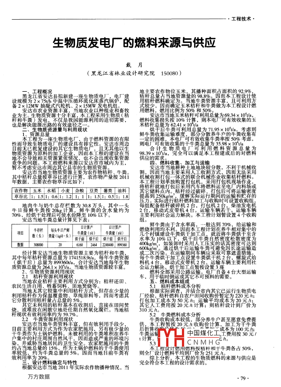 工程技術(shù)生物質(zhì)發(fā)電廠的燃料來源與供應(yīng)戴月黑龍江省林業(yè)設(shè)計研究院150080)一、工程概況農(nóng)作物位玉其播種面積占面積的929%江省安達(dá)物質(zhì)電廠,電廠地資源量的988%。因而本工程設(shè)計使設(shè)規(guī)模為2×75u/h中溫化床蒸汽鍋爐地牛糞資源豐富備2×12MW抽玉米秸稈和牛糞做為本工程達(dá)市農(nóng)業(yè)資源豐高:當(dāng)?shù)剞r(nóng)業(yè)以種植業(yè)和備源量1、資源總資源量與利用現(xiàn)狀鮮牛糞收集運(yùn)輸難度可利用總量為y*到本工程為一座生物質(zhì)電廠,由于燃料資源的有限定的困難可有效收集牛糞率按50%考慮,性而導(dǎo)致生物質(zhì)電建設(shè)具有邊則電廠可有效收集的為3598×10tu復(fù)建設(shè)的其它生物質(zhì)電物質(zhì)資源為原料的加因而本工程的建設(shè)在93計生以里糌建窚身懋不背備1攻影太金注將全供的收、加工與暫不考慮安達(dá)市周邊烺較耪分墜:否衙無蘩觜物產(chǎn)量按業(yè)收集農(nóng)作物草谷比如下劃單獨(dú)購置打機(jī)現(xiàn)農(nóng)作物玉米「水稻小麥雜糧豆類「薯類「油料]料點(diǎn)內(nèi)草谷比:151:061:121:11:51:0s51:18提高到250k將運(yùn)輸秸稈燃肉牛與奶??偞鏅跀?shù)為308萬頭頭每組配備秸稈破碎機(jī)2牛日排鮮牛糞按牛糞的含水量約為270%,經(jīng)烘干處理后索0主要利用社會運(yùn)力解決口本程計劃暫設(shè)置4個收購安達(dá)當(dāng)?shù)嘏<S總量牛存欄每頭牛日產(chǎn)鮮日計算產(chǎn)糞由于含水率高,一般達(dá)到70%,給運(yùn)輸和燒數(shù)(頭)黃星(頭)子們于后于前武于五為10%以下匚數(shù)據(jù)30806604249489440kg600kg輸牛糞奇避茵長途運(yùn)輸造經(jīng)計客讀當(dāng)?shù)馗嫖镔|(zhì)資源主要為植桿和襲運(yùn)輸期間車輛應(yīng)采取可靠遮蓋措其中每年確金羚警果翻4臺大型運(yùn)輸馬地用方式分別為:秸稈還五燃料咸苯組成料的需要。農(nóng)民生燃料成本分析少擇地*售務(wù)技合合省內(nèi)其它已運(yùn)行生物質(zhì)電220元/t;包加工成秸稈基本在收割在田間焚工費(fèi)用按20元則秸稈設(shè)計到廠價為稈現(xiàn)狀有效甭擎娉約任期自然氧化爛。當(dāng)?shù)亟?10252牛糞燃料成本分析資源和用現(xiàn)狀費(fèi)提安達(dá)市當(dāng)?shù)嘏<S資料豐富,但有效利用手段少朱聾物接杰:收時養(yǎng)什拿歪里旁華前主要利用方式為作為農(nóng)另有極少量鍋爐燃料。未被利中國煤化工工費(fèi)用按30元/t計算CNMHG°地易單總量的鋼需絲艙舉君則全個設(shè)樣科傘均程橋王牛類各占50%「程的生物質(zhì)燃料的來源與供應(yīng)是根據(jù)達(dá)潛縋賣與線際農(nóng)作物播種情況,當(dāng)完