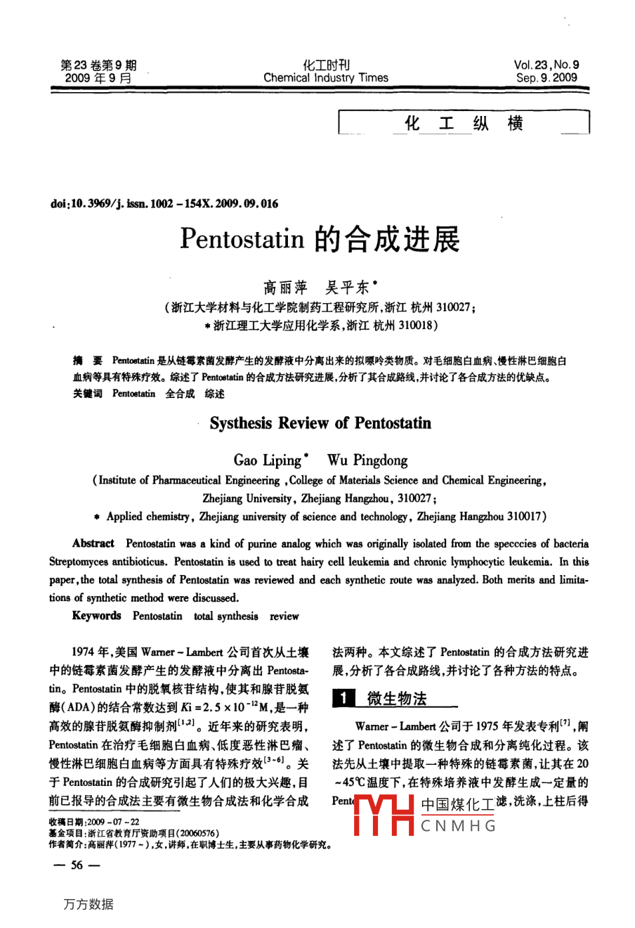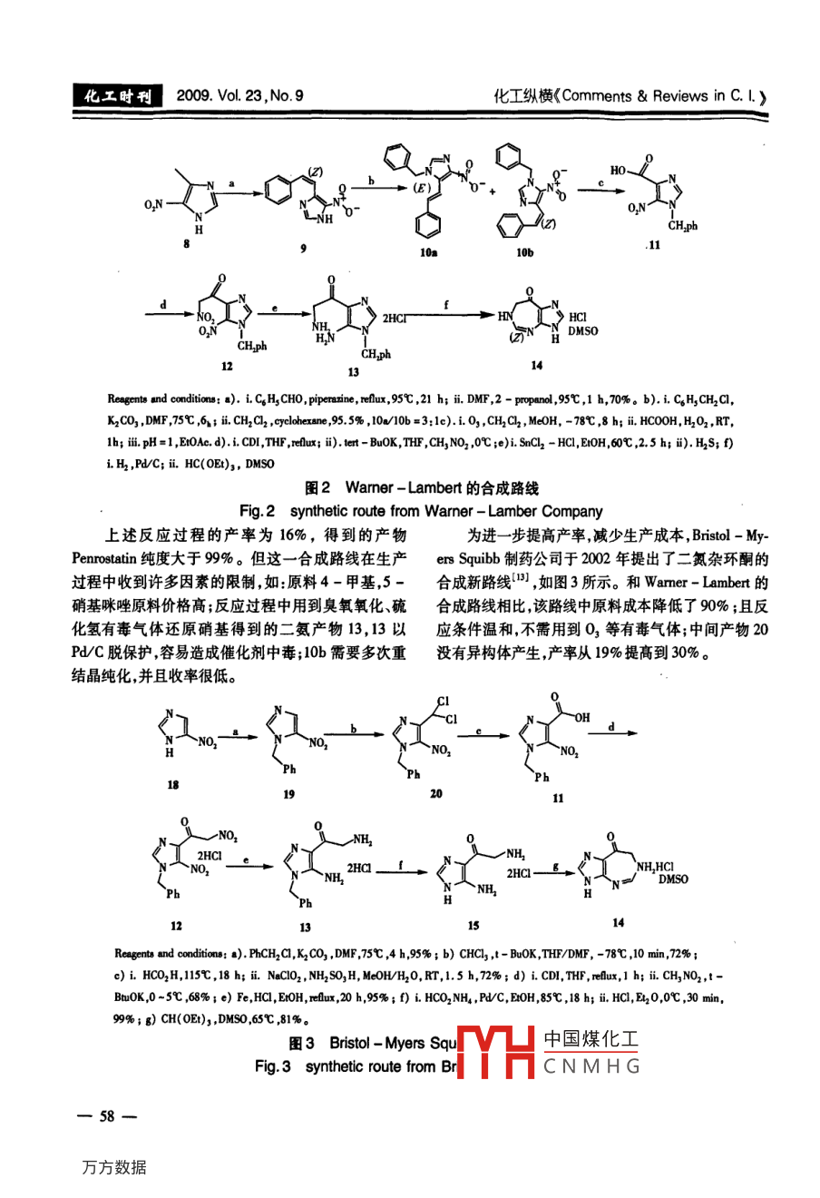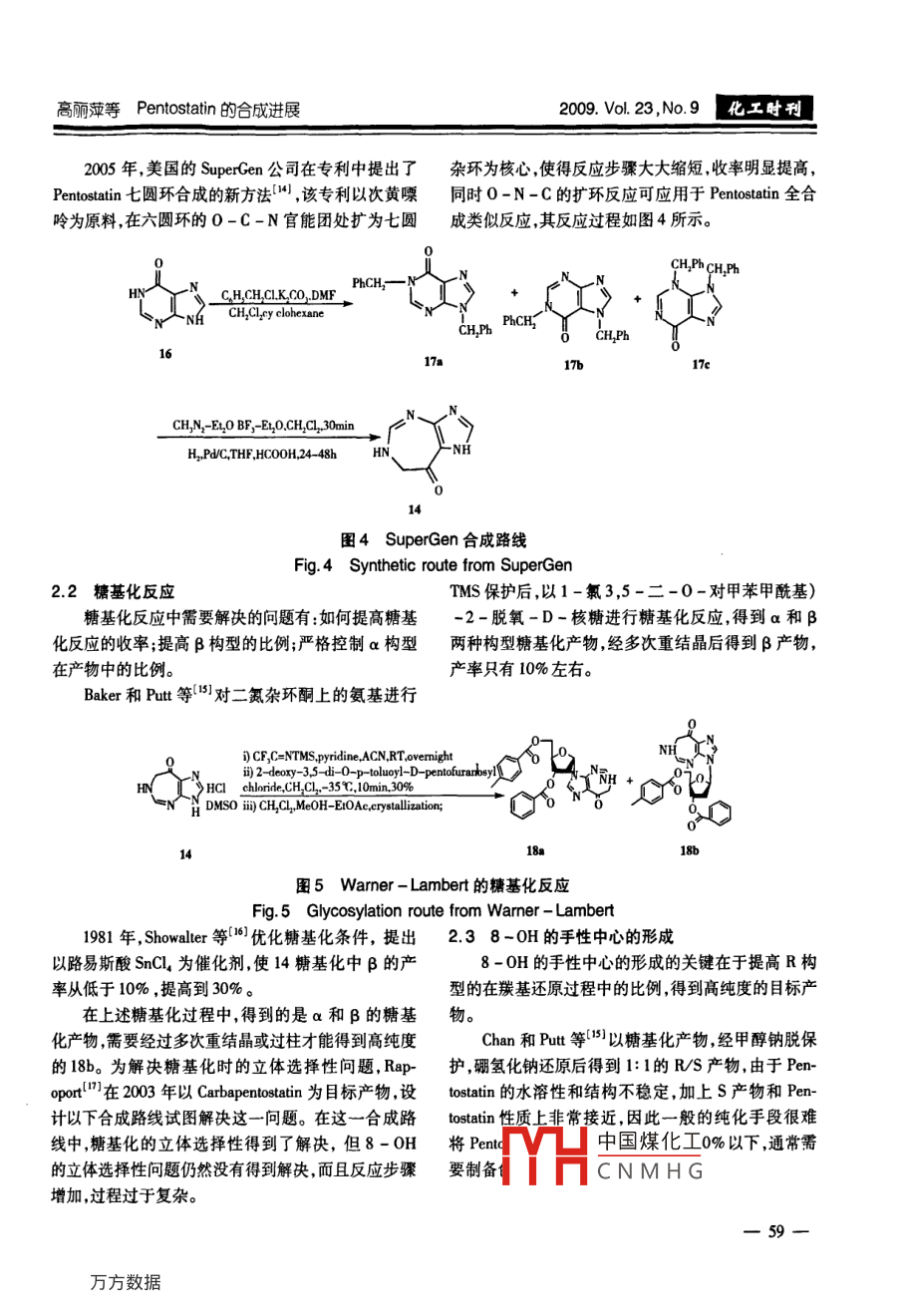 第23卷第9期化工時(shí)刊Vol. 23 ,No.92009年9月Chemical Industry TimesSep. 9. 2009化工縱橫doi:10. 3969/j. isn. 1002 -154X. 2009. 09.016Pentostatin的合成進(jìn)展高麗萍吳平東*(浙江大學(xué)材料與化工學(xué)院制藥工程研究所,浙江杭州310027;*浙江理工大學(xué)應(yīng)用化學(xué)系,浙江杭州310018)摘要Pentotatin 是從鏈霉素菌發(fā)酵產(chǎn)生的發(fā)酵液中分離出來的擬嘌呤類物質(zhì)。對(duì)毛細(xì)胞白血病慢性淋巴細(xì)胞白血病等具有特殊療效。綜述了Pentostatin的合成方法研究進(jìn)展,分析了其合成路線,并討論了各合成方法的優(yōu)缺點(diǎn)。關(guān)鍵詞Pentotain 全合成綜述Systhesis Review of PentostatinGao Liping° Wu Pingdong(Insitute of Pharmaceutical Engineering ,College of Materials Science and Chemical Engineering,Zhejiang University , Zhejiang Hangzhou, 310027;* Applied chemistry , Zhejiang university of science and technology , Zhejiang Hangzhou 310017)Abstract Pentostatin was a kind of purine analog which was originally isolated from the speccies of bacteriaStreptomyces antibioticus. Pentostatin is used to treat hairy cell leukemia and chronic lymphocytic leukemia. In thispaper , the total synthesis of Pentostatin was reviewed and each synthetic route was analyzed. Both merits and limita-tions of synthetic method were discussed.Keywords Pentostatin total synthesis review1974年,美國(guó)Warmer - Lambert公司首次從土壤法兩種。本文綜述了Pentostatin 的合成方法研究進(jìn)中的鏈霉素菌發(fā)酵產(chǎn)生的發(fā)酵液中分離出Pentosta-展,分析了各合成路線,并討論了各種方法的特點(diǎn)。tin。Pentostatin 中的脫氧核苷結(jié)構(gòu),使其和腺苷脫氨1微生物法酶(ADA)的結(jié)合常數(shù)達(dá)到Ki=2.5x10-12M,是一種高效的腺苷脫氨酶抑制劑[1。近年來的研究表明,Warmer - Lambert公司于1975年發(fā)表專利”),闡Pentostatin 在治療毛細(xì)胞白血病、低度惡性淋巴瘤、述了Pentostatin的微生物合成和分離純化過程。該慢性淋巴細(xì)胞白血病等方面具有特殊療效[-6]。關(guān)法先從土壤中提取一種特殊的鏈霉素菌,讓其在20于Pentostatin的合成研究引起了人們的極大興趣,目~45C溫度下 ,在特殊培養(yǎng)液中發(fā)酵生成- - -定量的前已報(bào)導(dǎo)的合成法主要有微生物合成法和化學(xué)合成Pent中國(guó)煤化工濾,洗滌,上柱后得收稿日期:2009 -07-22,"TYHCNMHG基金項(xiàng)目:浙江省教育廳資助項(xiàng)目(20060576)作者簡(jiǎn)介:高麗萍( 1977-) ,女,講師,在職博士生,主要從事藥物化學(xué)研究。一56-高麗萍等Pentostatin 的合成進(jìn)展2009. Vol. 23 ,No.9化工時(shí)刊到高純度的Pentostatin。 1995 年Warmer - Lambert結(jié)晶得到648.5 g純度為99. 7%的pentostain。Company在專利中(),進(jìn)-步優(yōu)化分離純化過程,得J C Hanvey等(9-10)對(duì)上述微生物合成提出了如到較大量的產(chǎn)品。在該專利的工藝過程描述中提到:下機(jī)理(圖1)。在圖1中,5中的1,3-二氮雜環(huán)是50 000 L的發(fā)酵啤酒經(jīng)硅藻土過濾后,濾液經(jīng)過一一個(gè)由腺嘌呤核苷中腺嘌呤擴(kuò)環(huán)后形成的,Pentostatin中5 000 L的離子交換柱,分別以不同濃度的氨水洗脫。8 - 0H由6中的羰基選擇性還原后得到。盡管從合洗脫液在低于50C下濃縮,加2 500L乙醇和1250 L成機(jī)理 上看微生物合成的路徑非常有效,但是微生物丙酮靜置沉淀后過濾,濃縮,濃縮液經(jīng)兩個(gè)離子交換合成收率低,生產(chǎn)成本高,工業(yè)化生產(chǎn)很難實(shí)施。柱純化后,得到約60%的Pentostatin粗品。再多次重00一Hray,0HHofH00RO-yH20HQINH0. f0HNH0HORO一ka出[H]一RORRR0-R7oH~oF的R R5圖1 Pentostatin 的生物合成機(jī)理Fig. 1 Pentostatin Biosyntheric route過去30 a的研究過程中也都是圍繞著上述3個(gè)關(guān)鍵2化學(xué)合成法問題而展開的。自Warmer - Lambert公司生物合成Pentostatin2.1 七圓雜環(huán)的合成(A)后,化學(xué)家們開始對(duì)其全合成進(jìn)行了深人的研究。主1978年Warmer - lambert公司首先開始對(duì)Pen-要解決3個(gè)主要問題:- -是合成七圓雜環(huán)以及解決七tostatin 化學(xué)全合成研究并發(fā)表合成專利“"。1979圓雜環(huán)的不穩(wěn)定性問題( A) ;二是糖基化時(shí)如何提高年 Baker和Putt報(bào)道了以4-甲基,5 -硝基咪唑?yàn)樵Ⅲw選擇性,得到較高比例的β(B);三是提高8-料 ,進(jìn)行Penlostain的合成.其中重點(diǎn)闌述了二氮雜0H的立體選擇性,得到高純度的目標(biāo)產(chǎn)物(C)。在環(huán)酮的中國(guó)煤化工MYHCNMHG一57一化工時(shí)刊2009. Vol. 23 ,No.9化工縱橫(《Comments & Reviews in C. .>a,Ho-k0~ +ON-O,NHCH.pb10a0b9→HNHClNHN⑦)N日DMSOCH,ph124K_CO,DMF ,75C ,6%; i, CH2Cl2 ,colobexane ,95.5% ,10v/10b =3:1e). i. 0, ,CH2Ch , MeOH, -78C ,8 h; i. HCOOH,H2O2,RT,1h; il. pH=1,El0Ae. d). i, CDI,THr ,elux; i). tet - BuOK,THr ,CH,NO2 ,0C ;e)i. SnCl2 - HCI,EIOH,60C,2.5 h; i). H2S; )i. H2 ,PdC; i. HC(OEt)s, DMSO圖2 Wamer -Lambert的合成路線Fig.2 synthetic route from Warner - Lamber Company上述反應(yīng)過程的產(chǎn)率為16%,得到的產(chǎn)物為進(jìn)- 步提高產(chǎn)率,減少生產(chǎn)成本, Bristol - My-Penrostatin純度大于99%。但這-一合成路線在生產(chǎn)ers Squibb制藥公司于2002年提出了二氮雜環(huán)酮的過程中收到許多因素的限制,如:原料4-甲基,5-合成新路線11 ,如圖3所示。和Wamner - Lambert的硝基咪唑原料價(jià)格高;反應(yīng)過程中用到臭氧氧化、硫合成路線相比,該路線中原料成本降低了90% ;且反化氫有毒氣體還原硝基得到的二