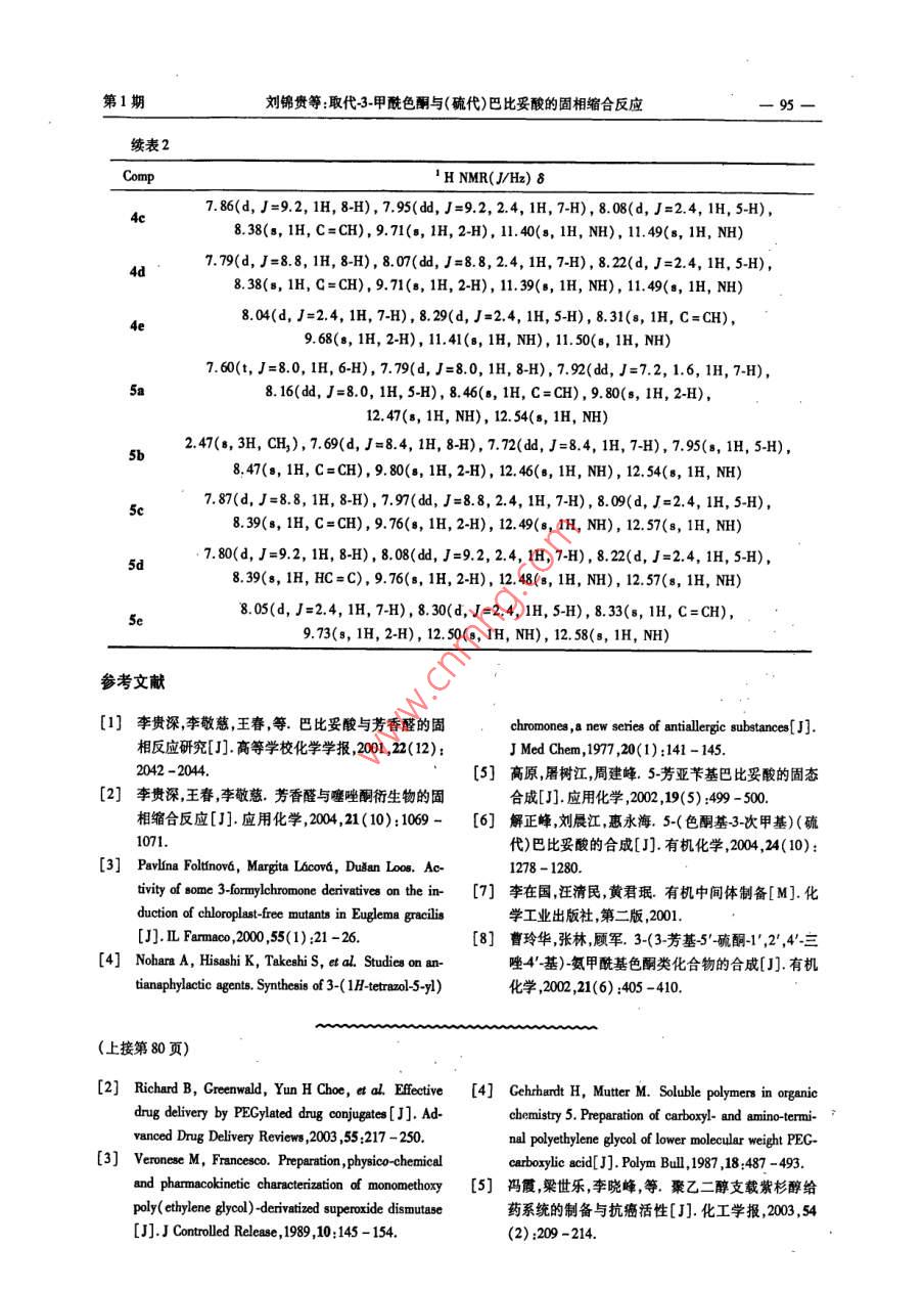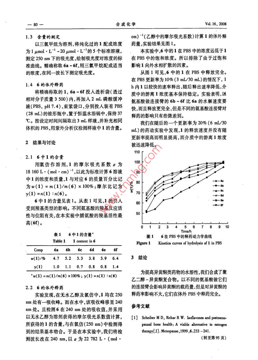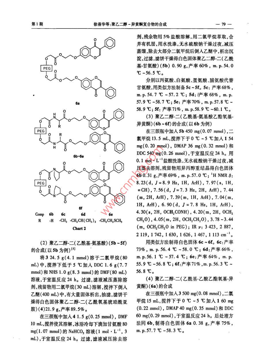 2008年第16卷合成化學(xué)vol.16,2008第1期,77-80Chinese Journal of Synthetic ChemistryNo1,77~80·快遞論文·聚乙二醇-異黃酮復(fù)合物的合成徐蓓華,周惠燕,沃聯(lián)群(浙江醫(yī)藥高等??茖W(xué)校浙江寧波315100)摘要:用聚乙二醇(PEG)修飾異黃酮類化合物(1)的側(cè)鏈并采用不同氨基酸做連接臂,合成了聚乙二醇-異黃酮復(fù)合物—聚乙二醇-異黃酮酯前藥(6),其結(jié)構(gòu)經(jīng)HNMR和R表征。在磷酸緩沖溶液中1能在10h內(nèi)釋放完全;6的載藥量有待進(jìn)一步提高。關(guān)鍵詞:異黃酮;聚乙二醇;前藥;合成中圖分類號(hào):06254;R914.5文獻(xiàn)標(biāo)識(shí)碼:A文章編號(hào):1005-1511(2008)01007704Synthesis of Poly ( ethylene glycol)-Isoflavone Ester ProdrugsXU Bei-hua, ZHOU Hui-yan, wo Lian-qunZhejiang Pharmaceutical College, Ningbo 315100, China)Abstract: Poly(ethylene glycol )-isoflavone complexes, poly (ethylene glycol)-isoflavone esterprodrugs(6), were synthesized by modifying side chain radical of isoflavone(1)with PEG using dif-ferent amino acids as the join-arm between 1 and PEG. The structures of 6 were confirmedH NMR and IR. The results showed that 1 was released completely from 6 in 10 h in phosphonicacid buffer solution. The loading amout of 1 on 6, which was comparatively lower, need to be furtherKeywords: isoflavone; poly (ethylene glycol); prodrug; synthesis眾所周知,異黃酮類化合物廣泛存在于眾多中植物中具有廣泛的生理活性。依普黃酮1自1992年上市以來,至今在治療骨質(zhì)疏松癥的市場(chǎng)HO-O上仍占有一席之地。為進(jìn)一步研究異黃酮類化合物的抗骨質(zhì)疏松Chart 1生物活性,我們合成了幾個(gè)異黃酮衍生物并初步檢測(cè)了體外抗骨質(zhì)疏松的活性,其中3苯基7羥由于聚乙二醇(PEG)本身優(yōu)良的性能,利用乙氧基異黃酮(1, Chart1)顯示出較好的活性。其修飾藥物提高藥物的水溶性,延長體內(nèi)半衰但由于1的水溶性較差給體內(nèi)外檢測(cè)及療效的期改善生物利用度已成為重要的藥物設(shè)計(jì)思想發(fā)揮帶來了困難本文期待通過適當(dāng)?shù)幕瘜W(xué)修飾和策略。用低分子量的PEG修飾藥物反而會(huì)加解決這一問題。速藥物從腎臟的排泄。PEG分子量越高,被修飾收稿日期:20070605;修訂日期:2007-706基金項(xiàng)目:浙江省醫(yī)藥衛(wèi)生科學(xué)研究基金資助項(xiàng)目(2004BO24)作者簡介:徐蓓華(197-),女漢族浙江寧波人碩土講師主要從事藥物合成的研究通訊聯(lián)系人:沃聯(lián)群,教授,T057148903247,E-mail:wlq5606@163.com78合成化學(xué)vol.16,2008藥物在體內(nèi)的半衰期越長2。但是分子量過高,會(huì)給合成帶來困難端基活化不完全,藥物攜帶量少,質(zhì)量百分比更少。因此本文選擇PEC6000修飾1。在二環(huán)己基碳二亞胺(DDC)和二甲氨基吡啶(DMAP)的催化下末端是羧基LPGPEG的PEG與1的側(cè)鏈羥基形成酯鍵。PEG末端羧基化的方法有兩種:(1)PEG與丁二酸酐縮合,一步得到含有酯鍵的末端羧基[PEG(O2CCH2CH2CO2H)2]。缺點(diǎn)是DOC, DMAP這類活化形式的PEG與藥物結(jié)合后,連接處有兩個(gè)酯鍵給考察藥物的解離度帶來困難。(2)PEG與溴代乙酸乙酯形成末端酯鍵,然后水解可得末端羧基CO?HPEG(OCH2CO2H)2]。CO2H本文采用方法(2)獲得未端羧基化[PEG的PEC600,并且用不同的氨基酸作1co和PEG6000之間的連接臂,合成了釋藥速度不同的聚乙二醇-異黃酮復(fù)合物,即聚乙二醇-異黃酮酯前藥(6a6f, Scheme 1和 Chart2),其結(jié)構(gòu)經(jīng)DDC DMAPHN、CO2HHNMR和IR表征。1實(shí)驗(yàn)部分