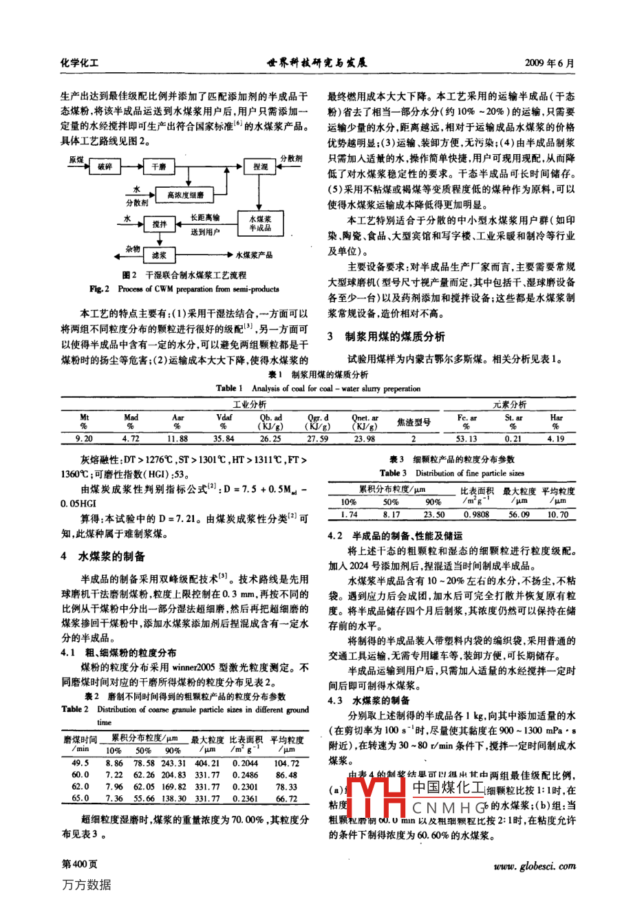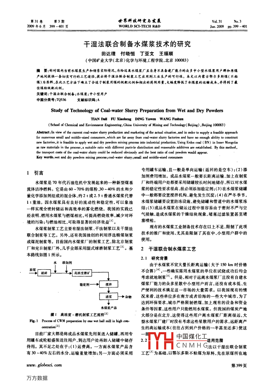 第31卷第3期世界科技研完與發(fā)展Vol, 31No. 32000年6月399-401頁(yè)WORLD SCI-TECH R&DJumn.2009p.399-401干濕法聯(lián)合制備水煤漿技術(shù)的研究田達(dá)理付曉恒丁亞文王福順(中國(guó)礦業(yè)大學(xué)(北京)化學(xué)與環(huán)境廠程學(xué)院,北京10003)摘要:針對(duì)國(guó)內(nèi)當(dāng)前水煤漿生產(chǎn)和銷售實(shí)際情況,為給遠(yuǎn)離水煤漿廠且自身不具備建廠能力的眾多中小型水煤漿用戶群和原煤產(chǎn)地間提供一條切實(shí)可行的工藝途徑,提出將干濕法聯(lián)合制漿工藝應(yīng)用到工業(yè)生產(chǎn)的可行性。本文以內(nèi)蒙古鄂爾多斯煤(不粘煤)為原料,在此工藝方法下確立了合適于制漿用煤的級(jí)配比例和相應(yīng)的藥劑用量,大幅度降低了水煤漿的運(yùn)輸成本,并得到了最佳煤粉級(jí)配比例關(guān)鍵詞:千濕法聯(lián)合制備;水煤漿;中小型用戶中圖分類號(hào):TQ36文獻(xiàn)標(biāo)識(shí)碼:AStudy of Technology of Coal-water Slurry Preparation from Wet and Dry PowdersTIAN DaH Fu Xiaoheng DING Yawen WANG Fushun(School of Chemical and Environment Engineering, China University of Mining and Technology Beijing), Beijing 100083)Abstract: In view of the current coal-water slurry production and marketing of the actual situation and in order to supply a feasible approachfor numerous small and middle-sized consumers, which are far away from coal-water slurry factories and have no enough ability to constructnew factories, it is feasible to apply wet and dry powders mixing process into industrial production Using Erdos coal BN) in Inner Mongoliaas raw materials in the process, a suitable ratio with different particle distribution and reasonable additives are established. By this methodthe transport costs of the coal-water slurry could be reduced obviously and the best ratio of coal powders would appearKey words: wet and dry powders mixing process; coal-water slurry; small and middle-sized cor專用罐車運(yùn)輸,且一般是單向運(yùn)輸(返回的是空車);(2)添加劑費(fèi)用增加。成品水煤漿一般要長(zhǎng)距離運(yùn)輸,加上在制漿水煤漿是η0年代石油危機(jī)中發(fā)展起來(lái)的一種新型煤基廠和終端用戶處都要采用儲(chǔ)罐較長(zhǎng)時(shí)間地儲(chǔ)存,所以對(duì)水煤流體潔凈燃料。它是由60~0%的煤粉、30~40%的水和少漿的穩(wěn)定性要求很高故必須添加穩(wěn)定劑;(3)在水煤漿儲(chǔ)罐量化學(xué)添加劑組成的混合體,約2t或2.5t普通水煤漿代替中一般都要設(shè)置攪拌機(jī)構(gòu)避免發(fā)生沉淀;(4)在嚴(yán)冬季節(jié),1t重油。因水煤漿具有良好的流動(dòng)性和穩(wěn)定性,可以象油水煤漿儲(chǔ)罐要設(shè)置防凍設(shè)施,避免儲(chǔ)罐和管道中的水煤漿凍一樣實(shí)現(xiàn)全密封儲(chǔ)運(yùn)和高效率的霧化燃燒。我國(guó)的實(shí)踐已結(jié):(5)成品水煤漿在儲(chǔ)運(yùn)過(guò)程中很容易由于密封不嚴(yán)與經(jīng)表明燃用水煤漿與燃煤相比,可提高燃燒效率,減少對(duì)環(huán)氣接觸造成水煤漿的于燥結(jié)塊現(xiàn)象,堵塞過(guò)濾裝置甚至堵境的污染;與燃油相比,可取得顯著的經(jīng)濟(jì)效益。塞噴槍水煤漿制漿工藝主要有濕法制漿、干法制漿以及干濕法現(xiàn)有的水煤漿工業(yè)制備技術(shù)存在以上不足,限制了此項(xiàng)聯(lián)合制漿等工藝。另外,還有我國(guó)獨(dú)創(chuàng)的利用浮選精煤制漿技術(shù)的推廣和使用,尤其是限制了其在中、小型用戶群中的或煤泥制漿等。目前國(guó)內(nèi)水煤漿廠的制漿工藝除北京制漿使用。廠和兗日制漿廠外幾乎全部釆用濕式球磨制漿工藝2?;?干濕聯(lián)合制水煤漿工藝本路線如圖1所示。2.1研究背景↓由于水煤漿不宜大量長(zhǎng)距離運(yùn)輸(大于150km時(shí)價(jià)格高濃度磨礦不合算)“,一些確實(shí)需用水煤漿的單位在試燒成功后均會(huì)考慮就地制漿。但是,相對(duì)于遠(yuǎn)離水煤漿廠且沒(méi)有自建水穩(wěn)定劑煤漿廠能力的眾多星散中小型用戶而言,還沒(méi)有成本低、生產(chǎn)便利的技術(shù)滿足這一市場(chǎng)的大量需求。以我國(guó)現(xiàn)有的情濾漿→雜物況來(lái)看這些單位多在南方或者沿海的一些大中城市為了達(dá)到環(huán)保要求,城市嚴(yán)格限制燃煤,加上現(xiàn)有的設(shè)備和資金水煤漿產(chǎn)品條件等因素,這些用戶只能燃用水煤漿。但我國(guó)的煤炭產(chǎn)地高濃度-唐機(jī)制漿工藝流程2大部分是在北方這使得這些用戶離水煤漿廠距離很遠(yuǎn),大g. 1 Process of CWM preparation by one wet ball mill in hi∞m型水煤漿廠建廠時(shí)沒(méi)有考慮這些星散用戶的需求遠(yuǎn)距離產(chǎn)生的高運(yùn)輸成本(往往占到到戶價(jià)格的一半甚至還多)使這目前廠家大都是將成品水煤漿先用泵送入儲(chǔ)罐,再用專用罐車或輪船盛裝送往用戶,到達(dá)用戶處再卸入儲(chǔ)罐中儲(chǔ)存22中國(guó)煤化工適用范圍待用。其不足之處在于:(1)運(yùn)費(fèi)高。一方面水煤漿產(chǎn)品含CNMHG法以干濕法聯(lián)合制漿有30~40%左右的水分,運(yùn)輸重量增加:另一方面必須采用工藝為基礎(chǔ)以鄂爾多斯不粘煤為原料先在原煤所在地woww. globesci. com第399頁(yè)化學(xué)化工界科軾研究與發(fā)屐2009年6月生產(chǎn)出達(dá)到最佳級(jí)配比例并添加了匹配添加劑的半成品干最終燃用成本大大下降。本工藝采用的運(yùn)輸半成品(干態(tài)態(tài)煤粉將該半